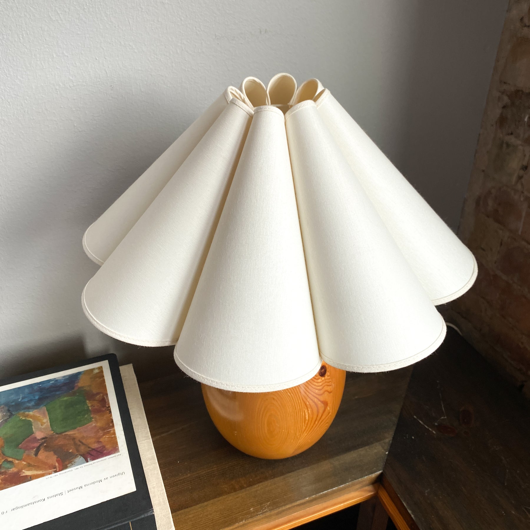 Bordslampa i massiv furu med vågig skärm. Vit sladd med platt eurokontakt.
