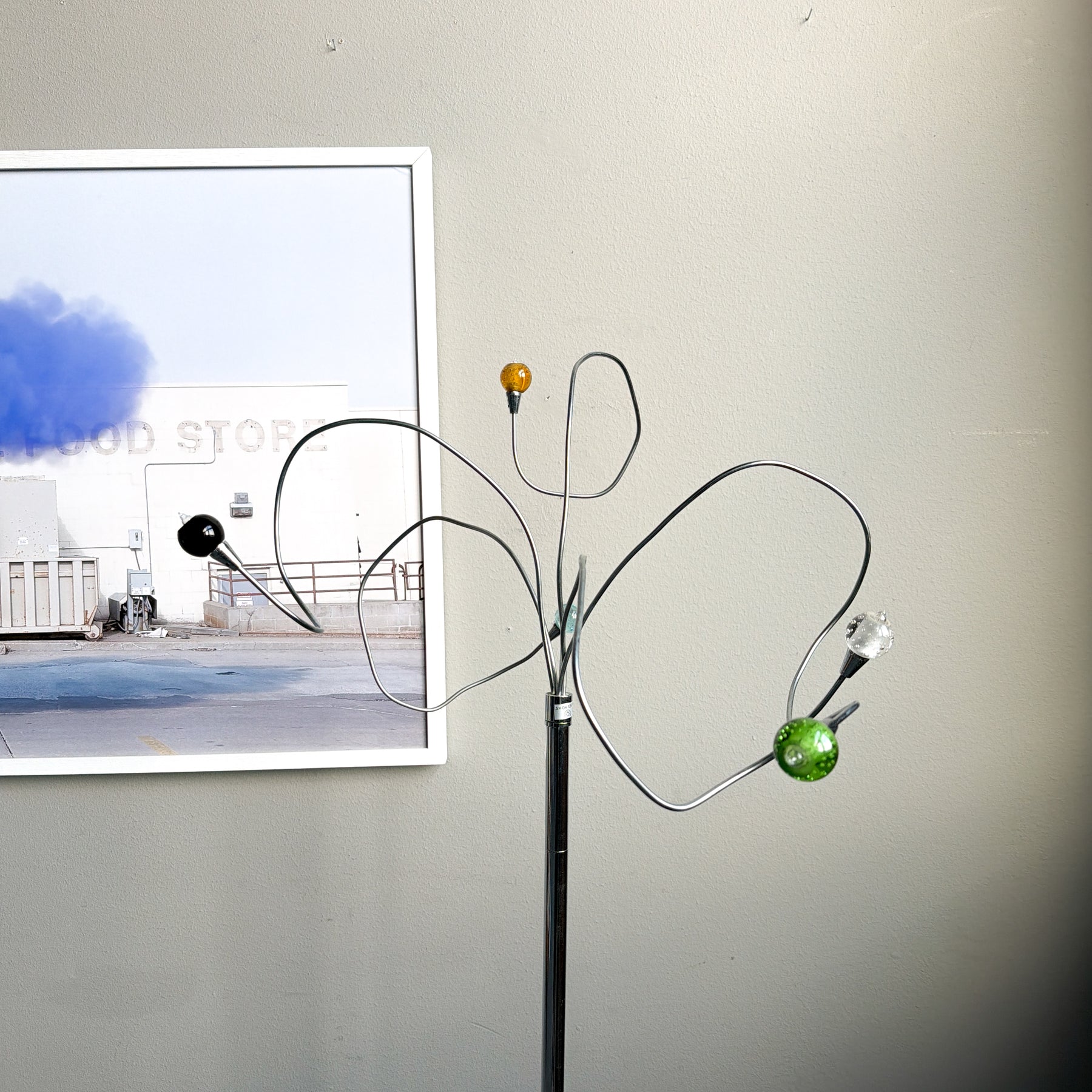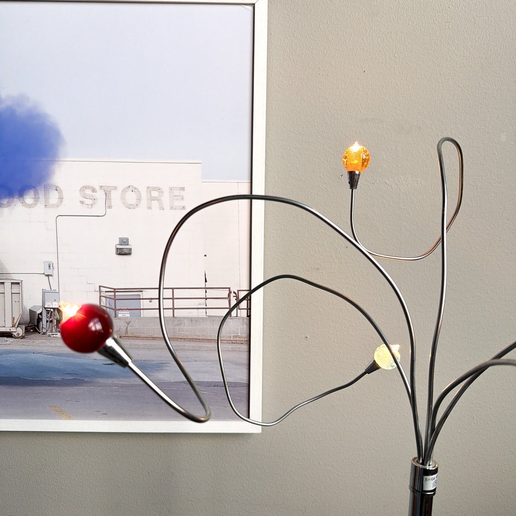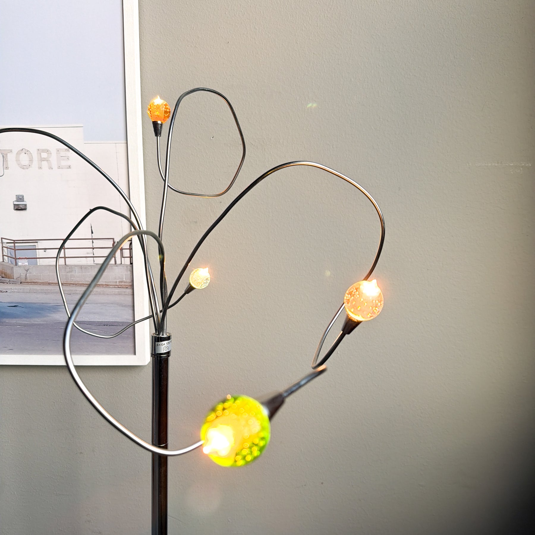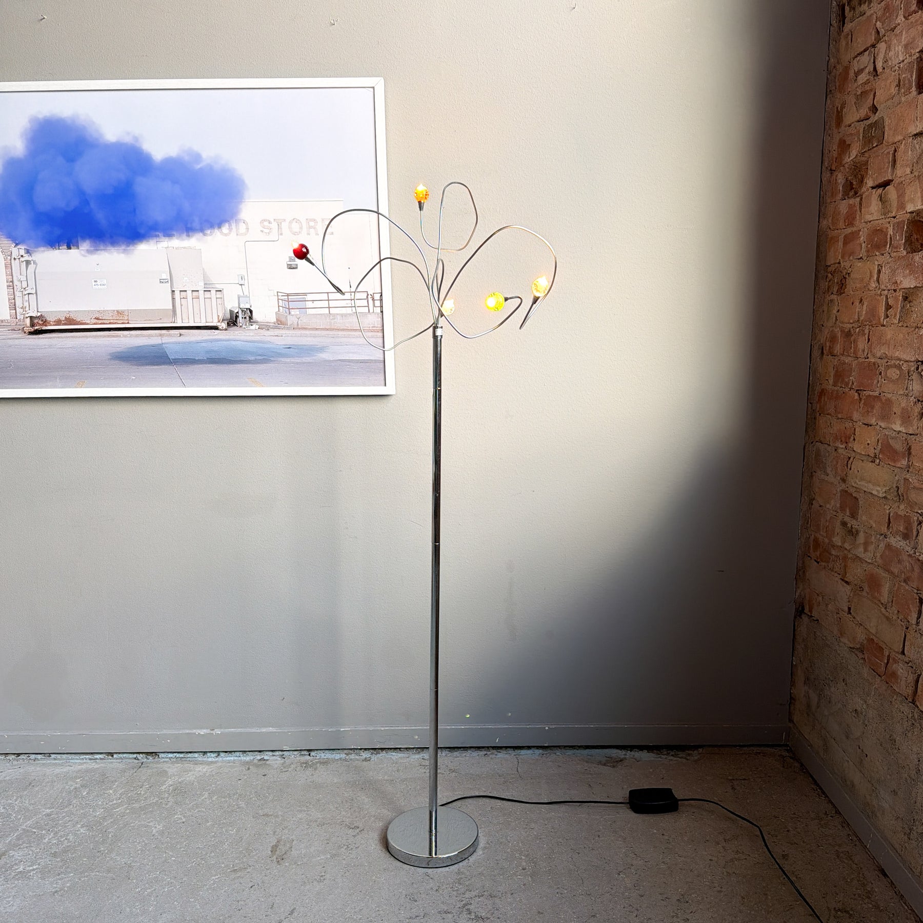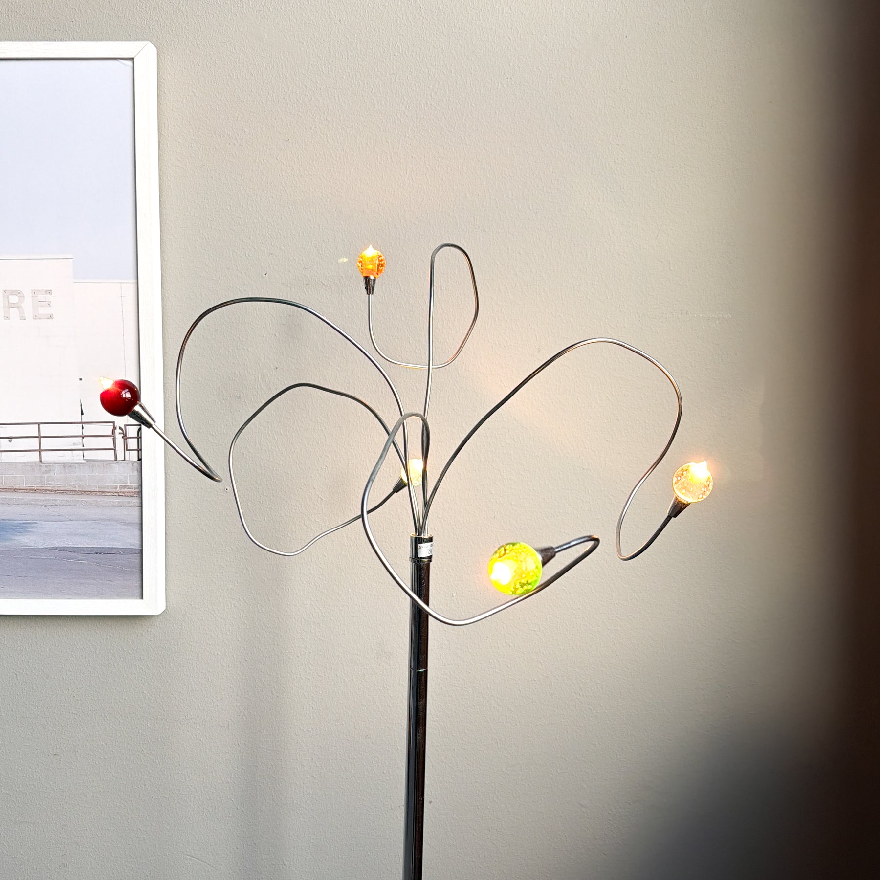 Golvlampa i krom med 5 böjda armar med färgade glaskulor och små ledbelysningar. Svart sladd med golvtändknapp som är dimbar. Platt eurokontakt.