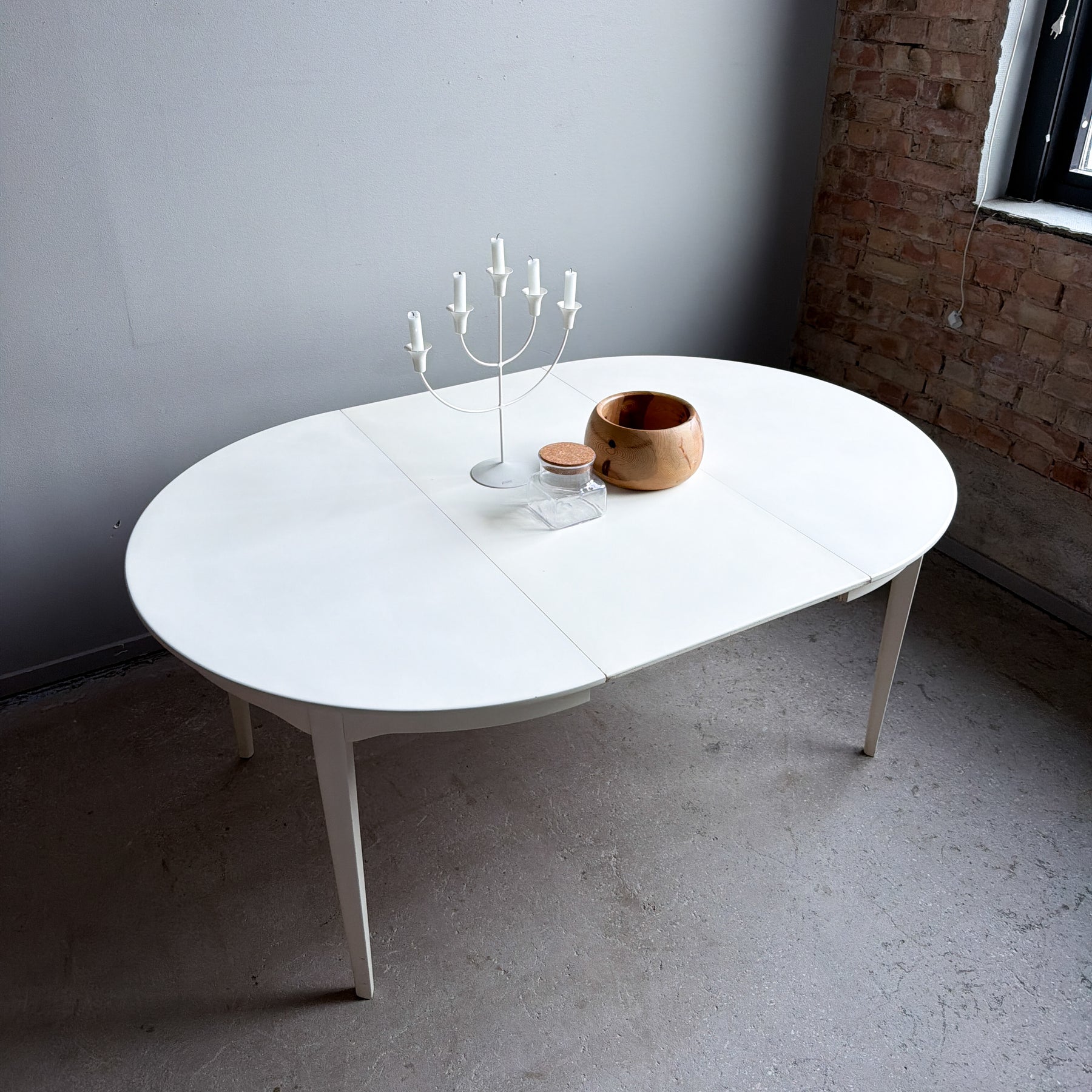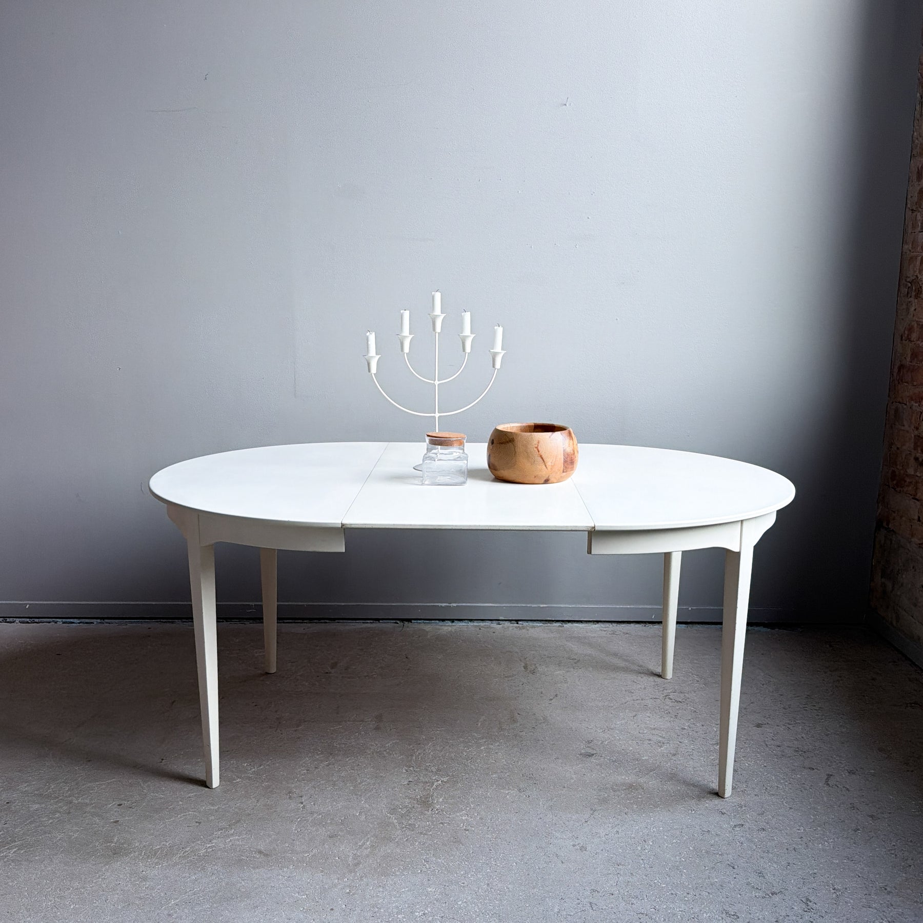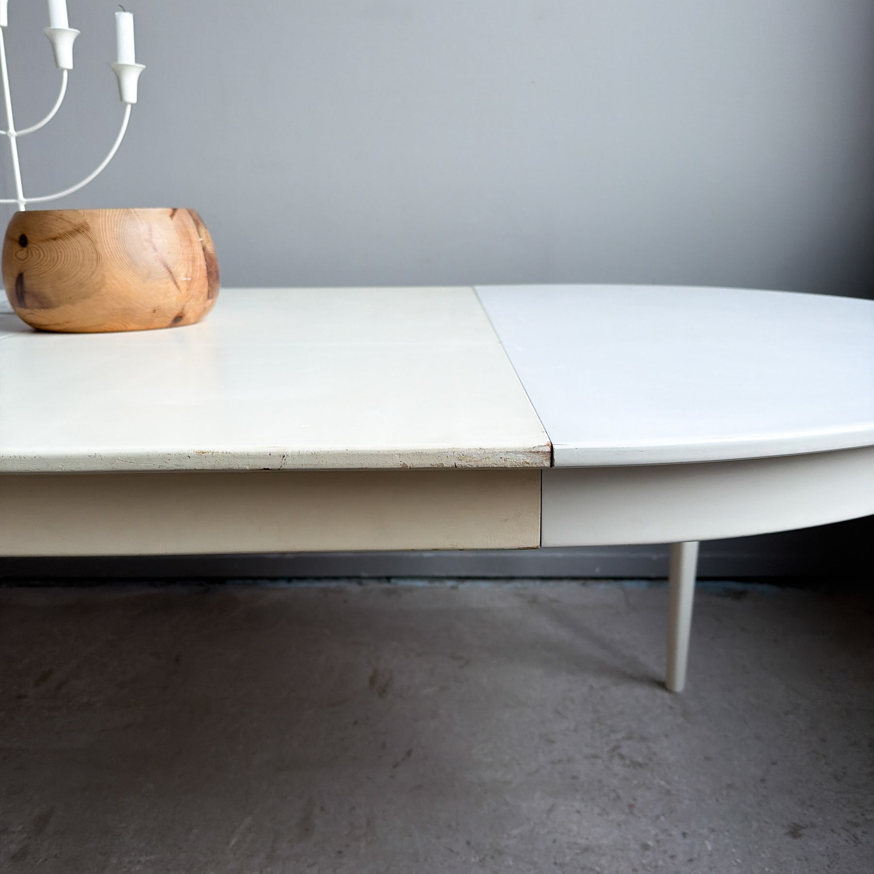 Vitlackerat runt matbord med 2 iläggsskivor, 60-tal