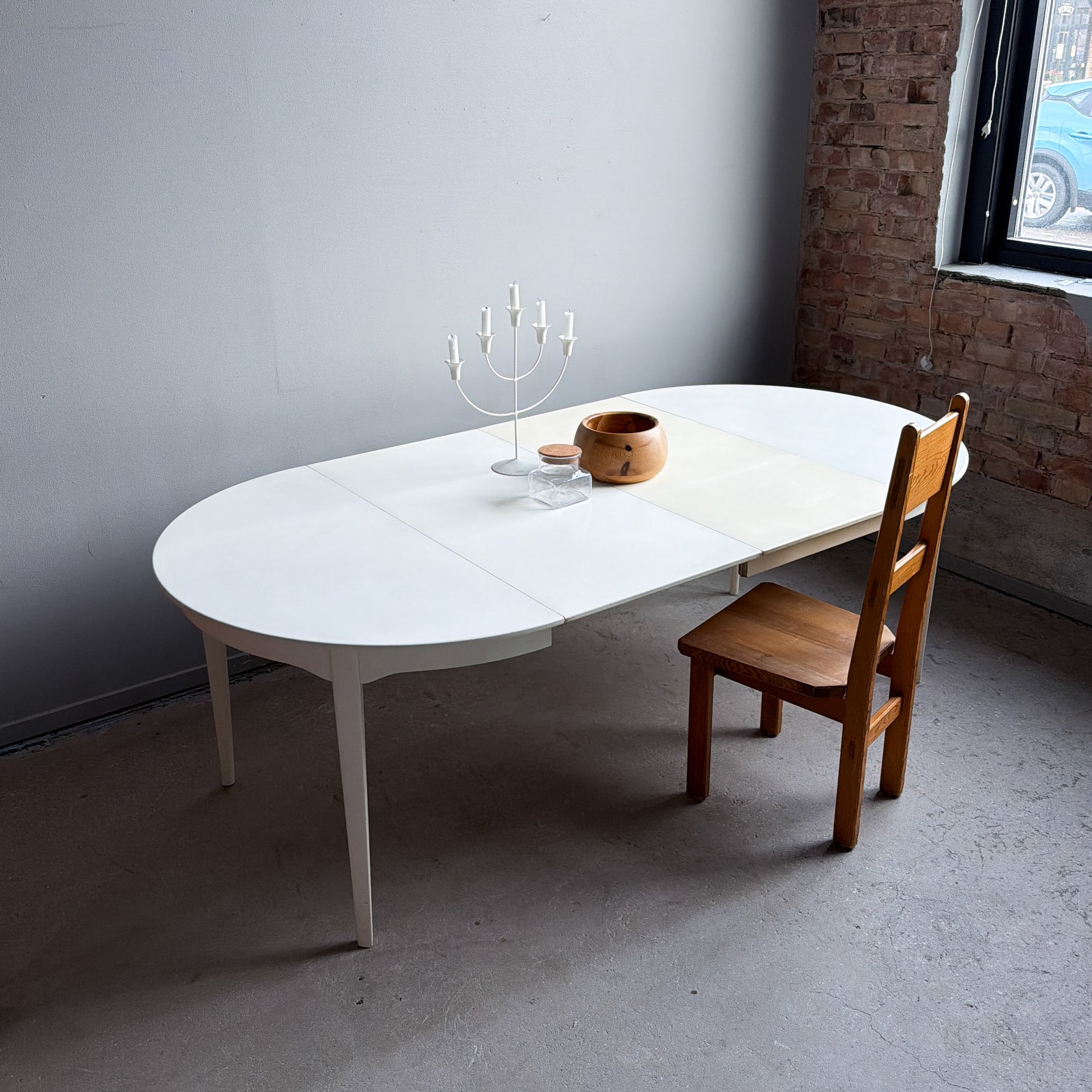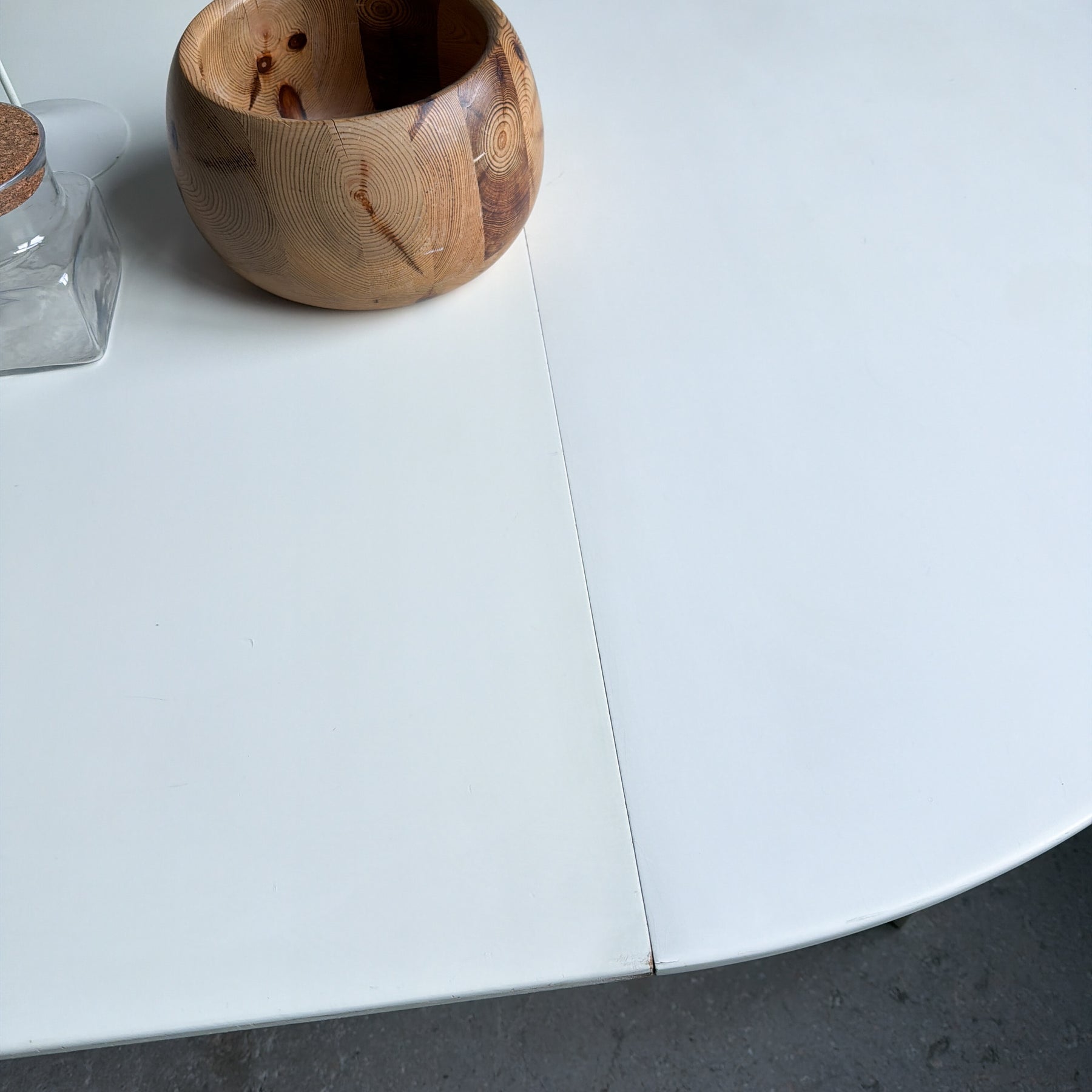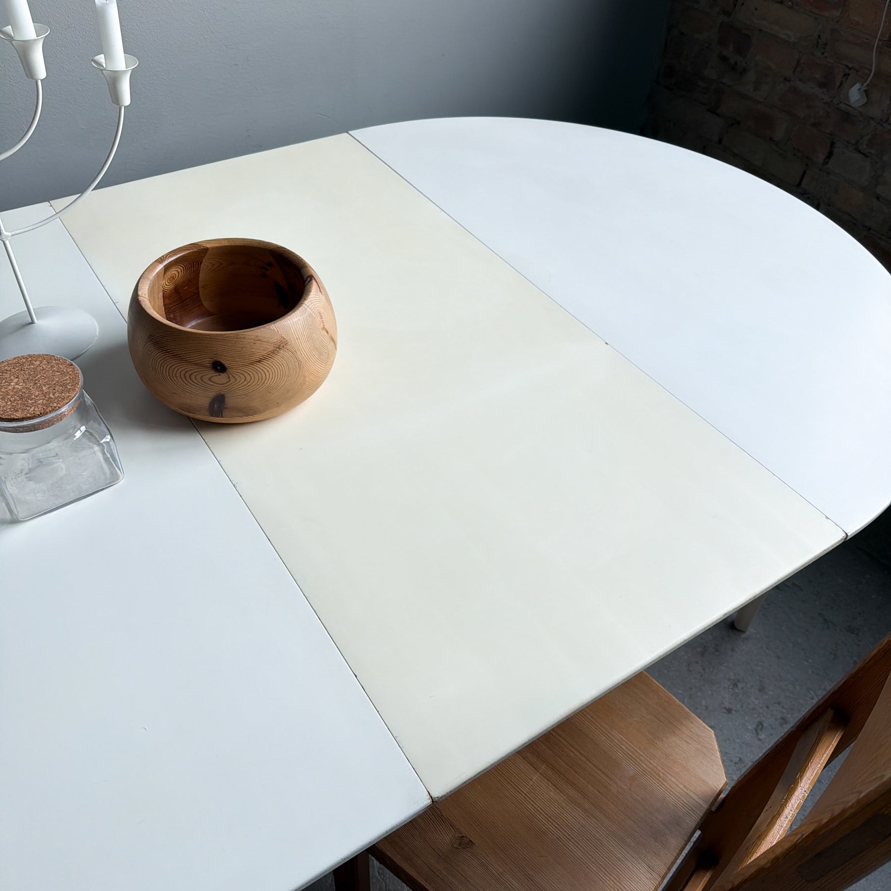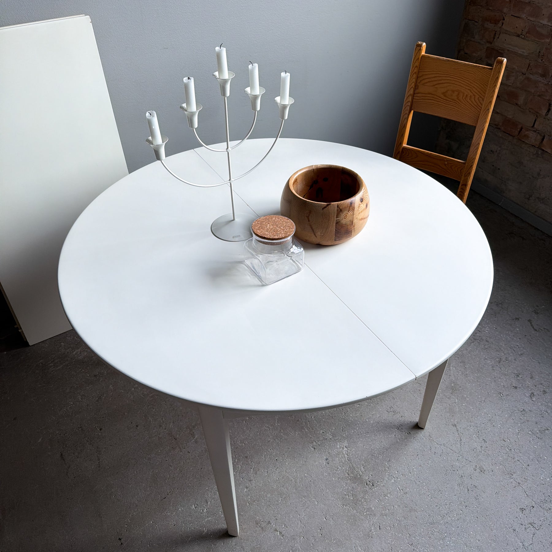 Vitlackerat runt matbord med 2 iläggsskivor, 60-tal