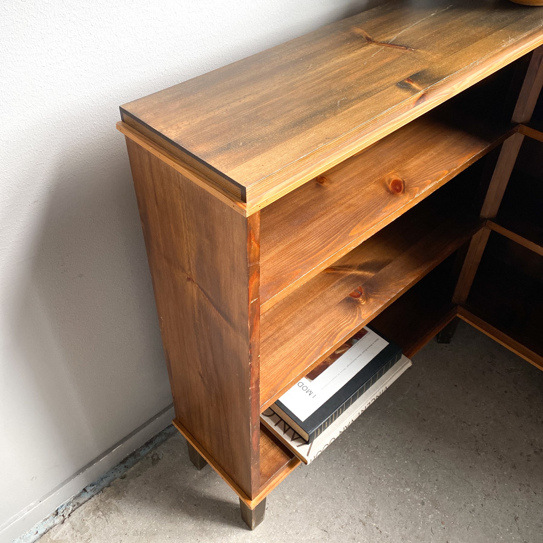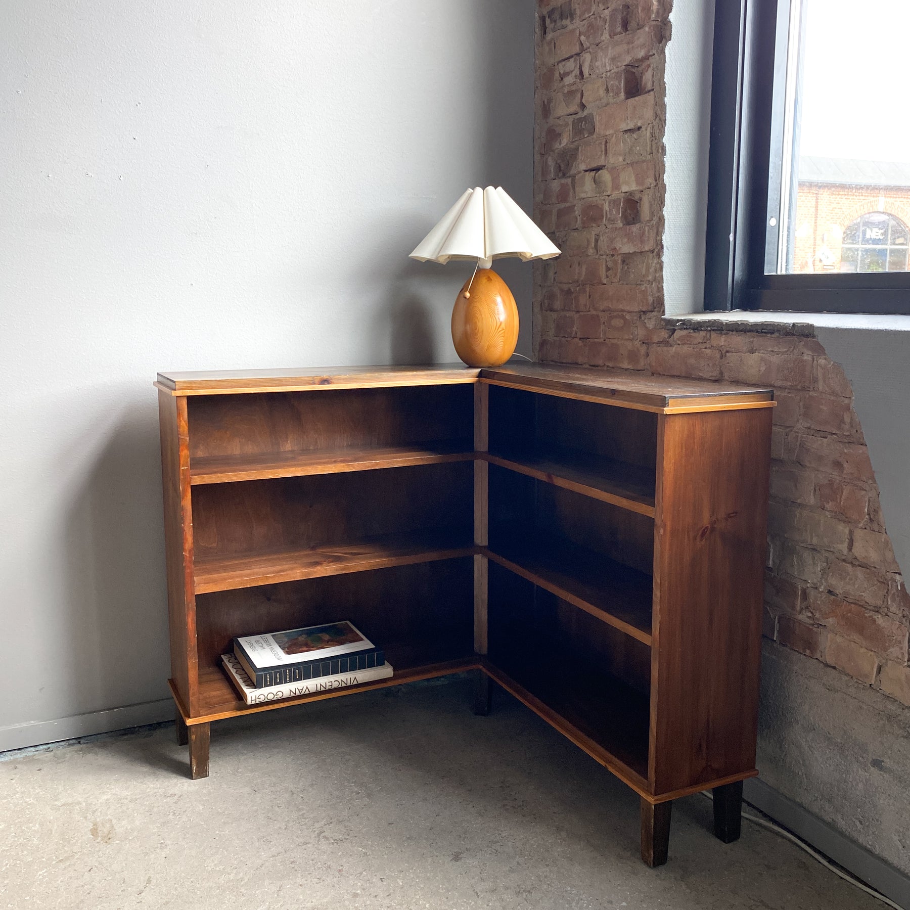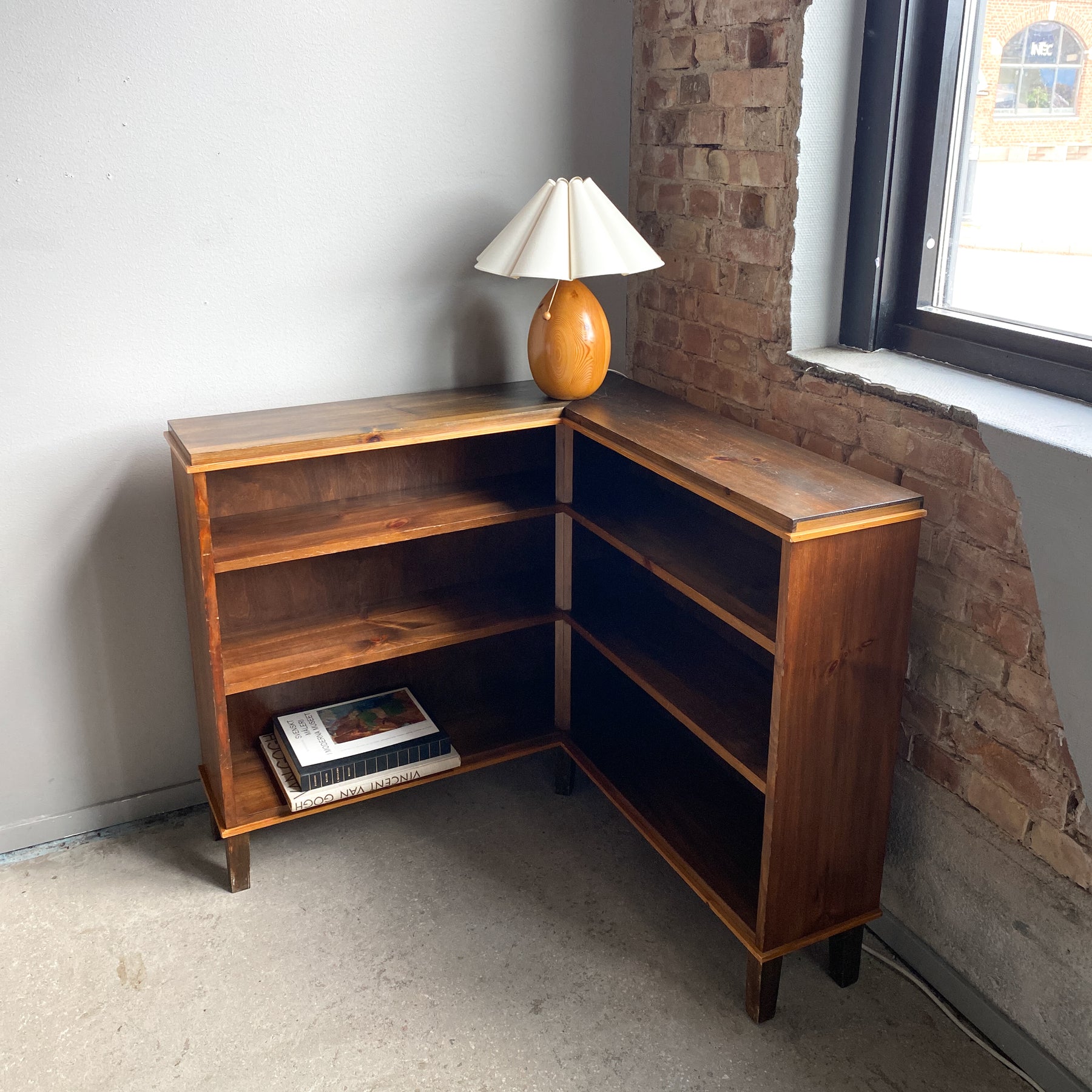 Låg hörnbokhylla i betsad furu, 30/40-tal.