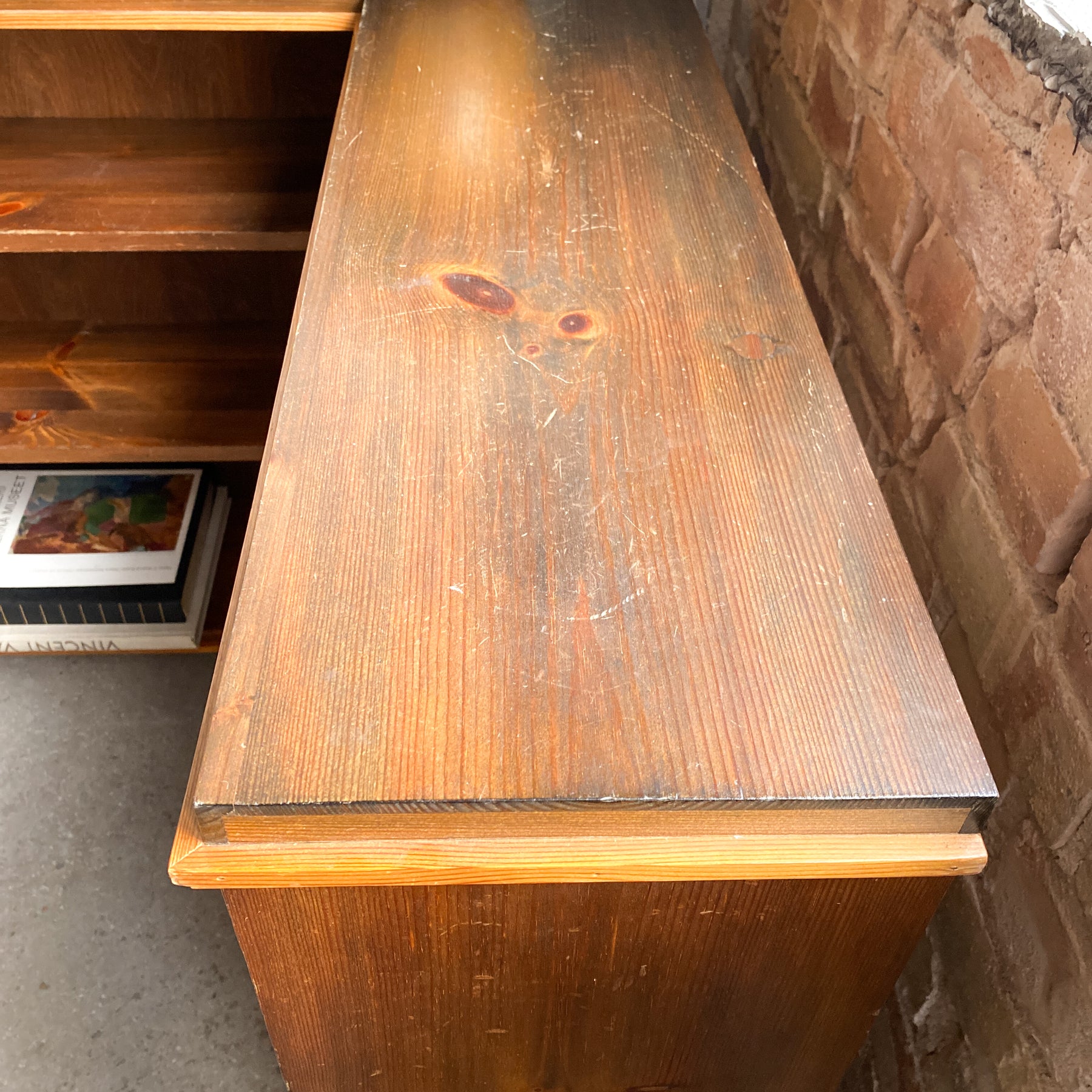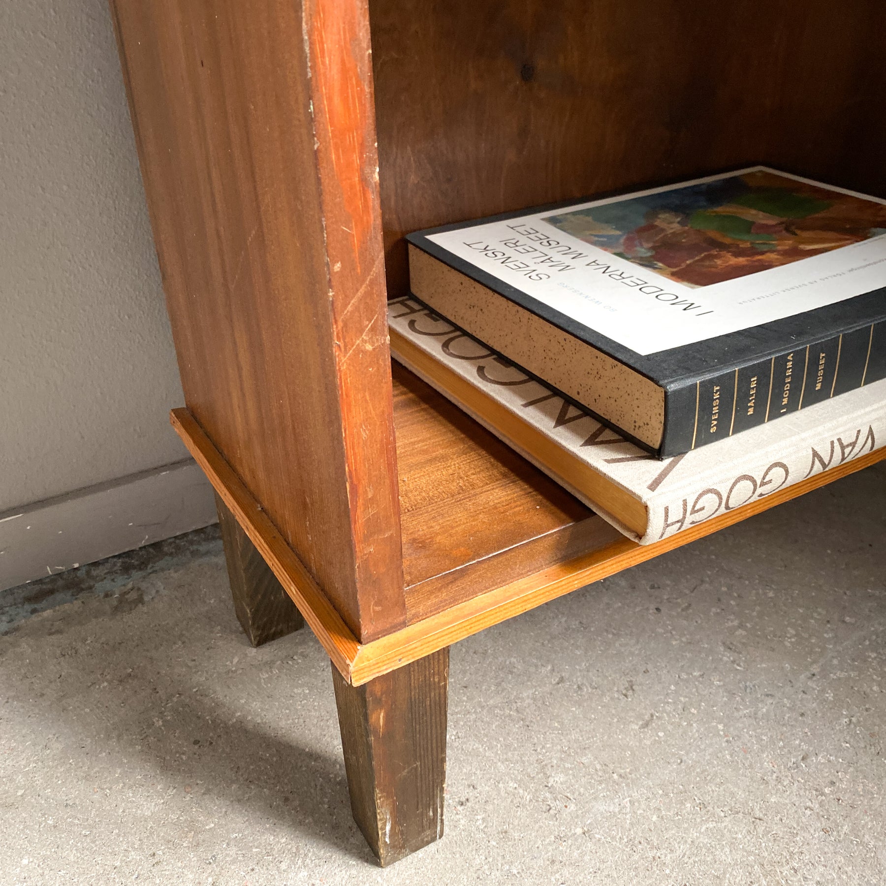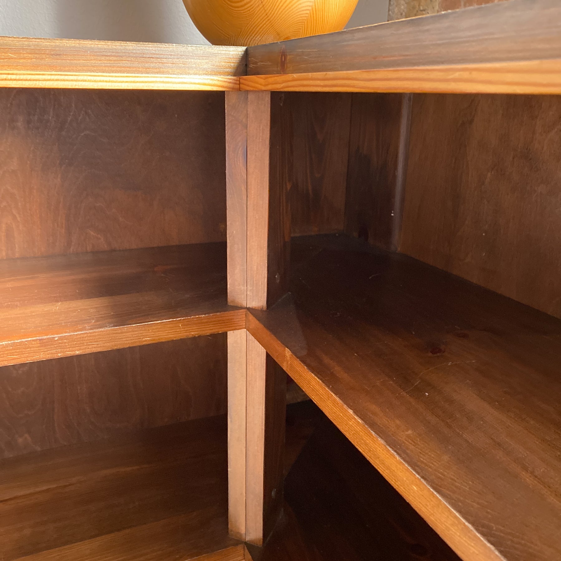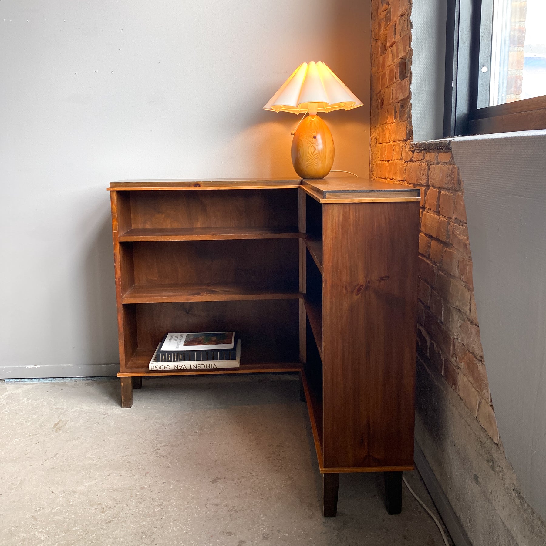 Låg hörnbokhylla i betsad furu, 30/40-tal.