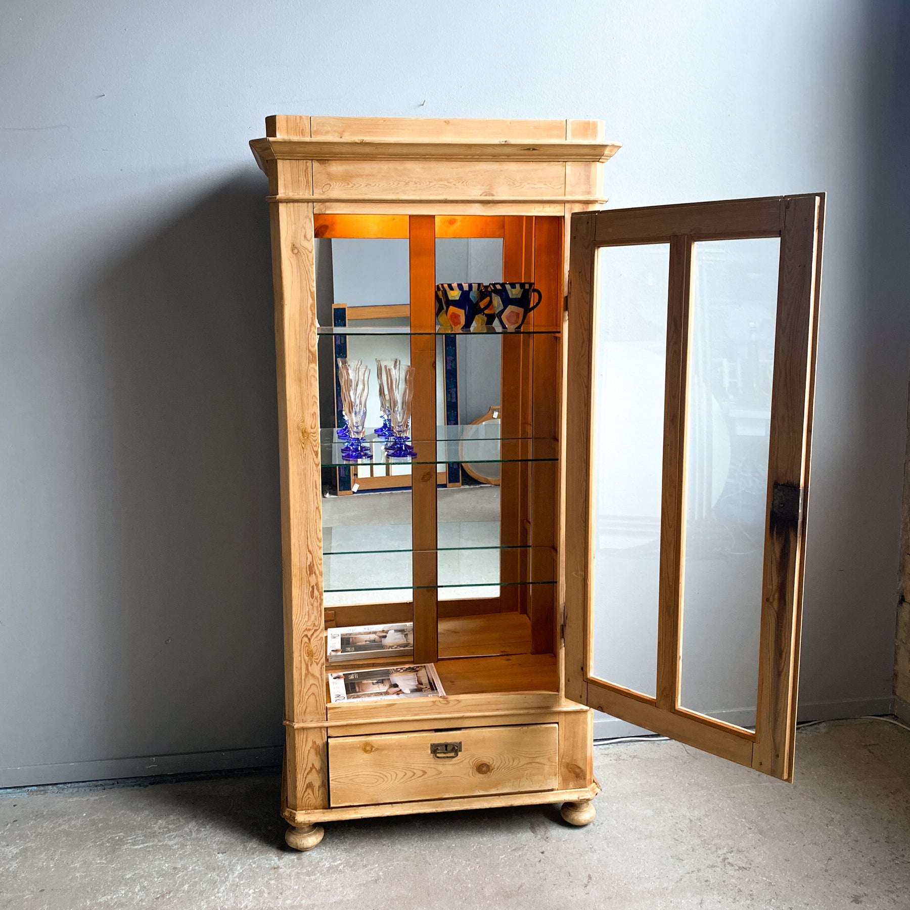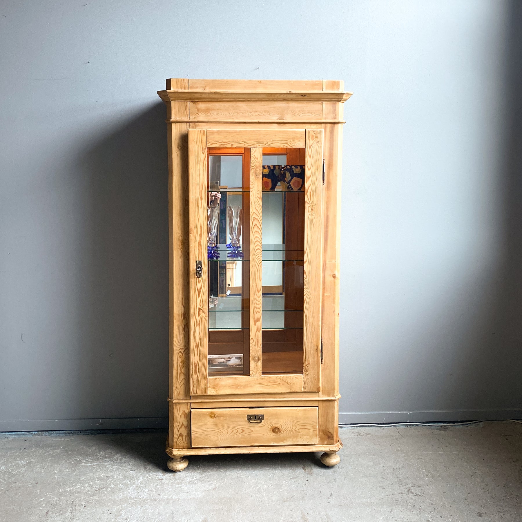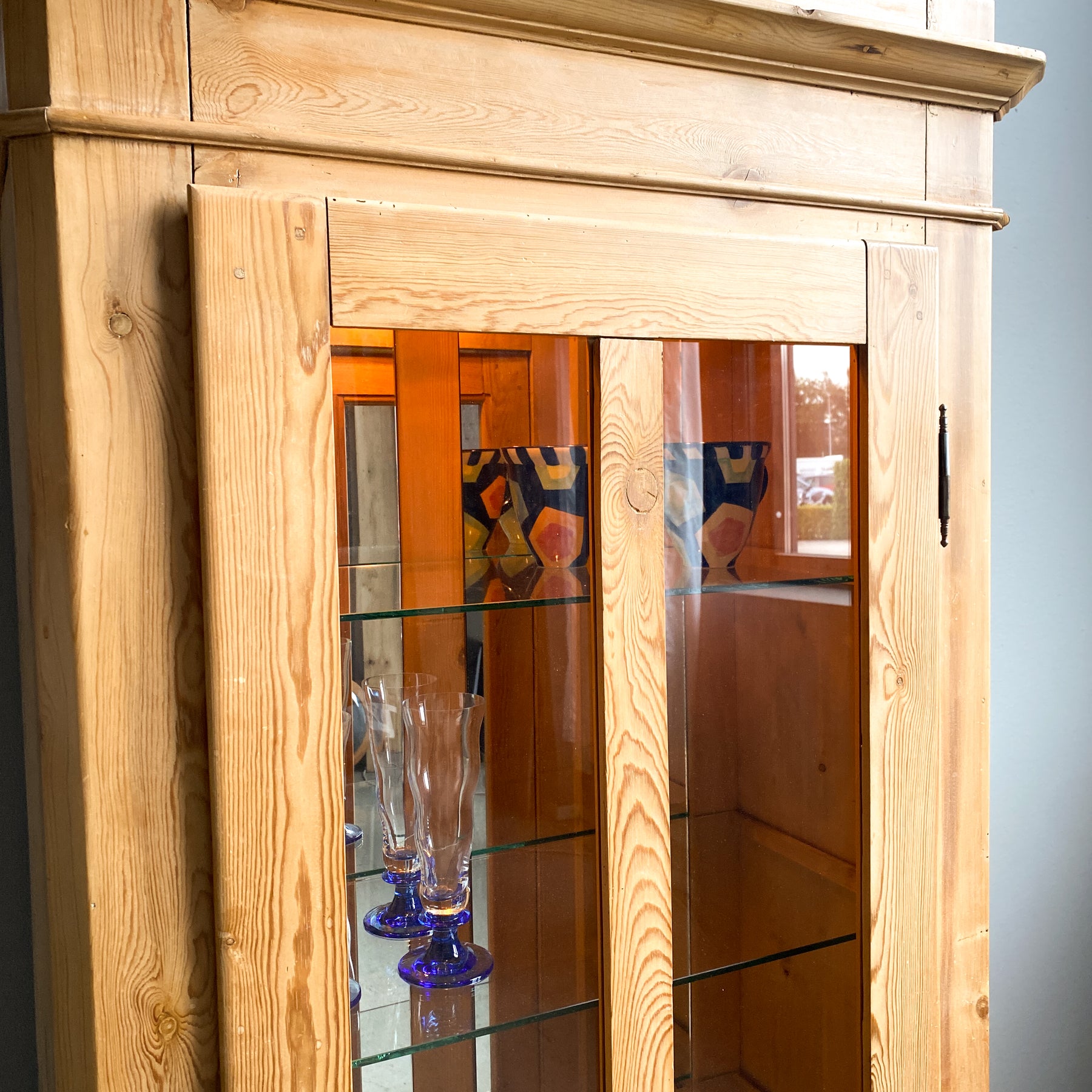 Vitrinskåp Jugend sekelskiftet 1900. Avlutat furu. Glasdörr med hyllplan i glas och spegel baktill. Dessa är senare insatta. Belysning med 2 ljuskällor.