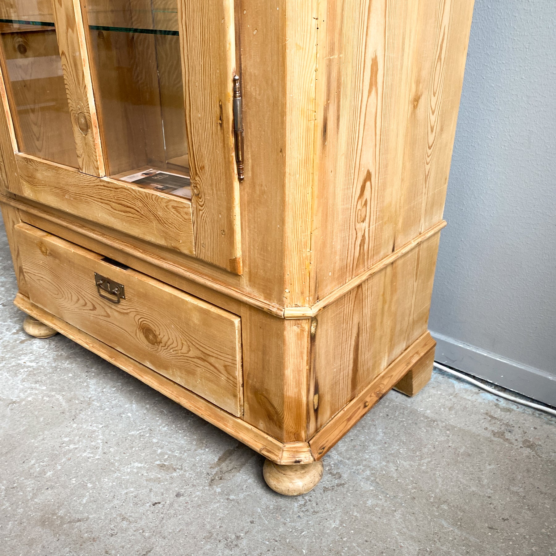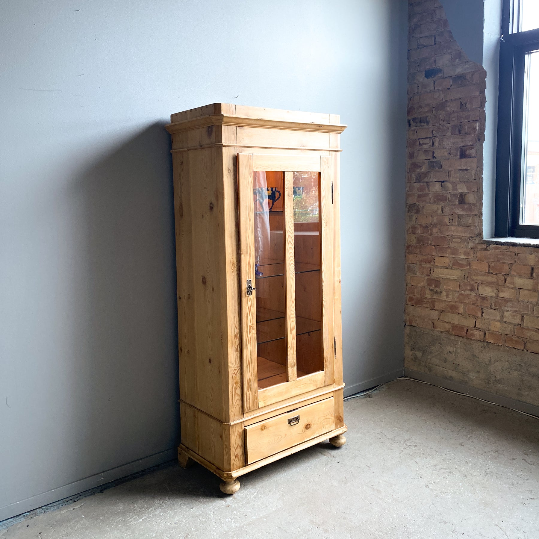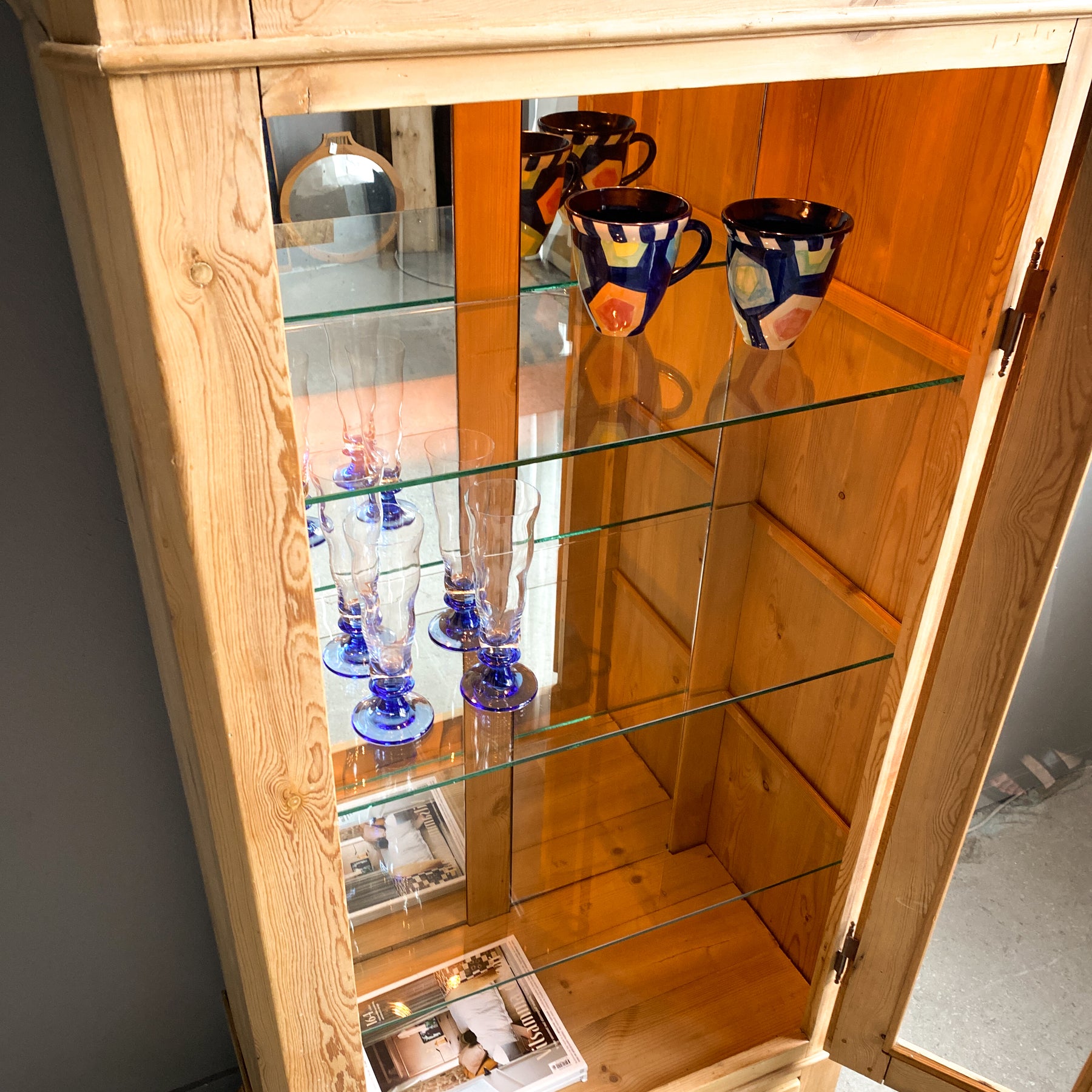 Vitrinskåp Jugend sekelskiftet 1900. Avlutat furu. Glasdörr med hyllplan i glas och spegel baktill. Dessa är senare insatta. Belysning med 2 ljuskällor.