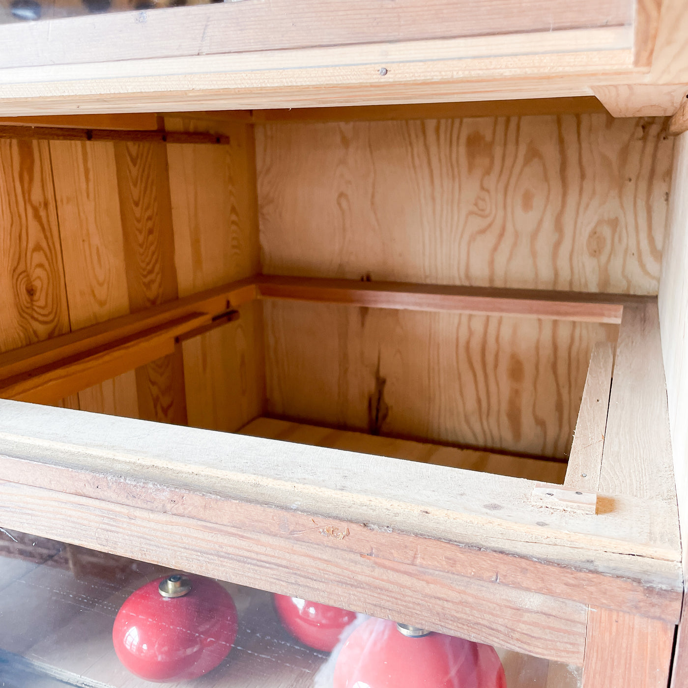 Skick: Bruksspår, avslag och märken. Ett glas i en lucka saknas och ett glas har spruckit men man kan enkelt att sätta in nytt. 2 hyllplan saknas. Utsågat hål på baksidan.