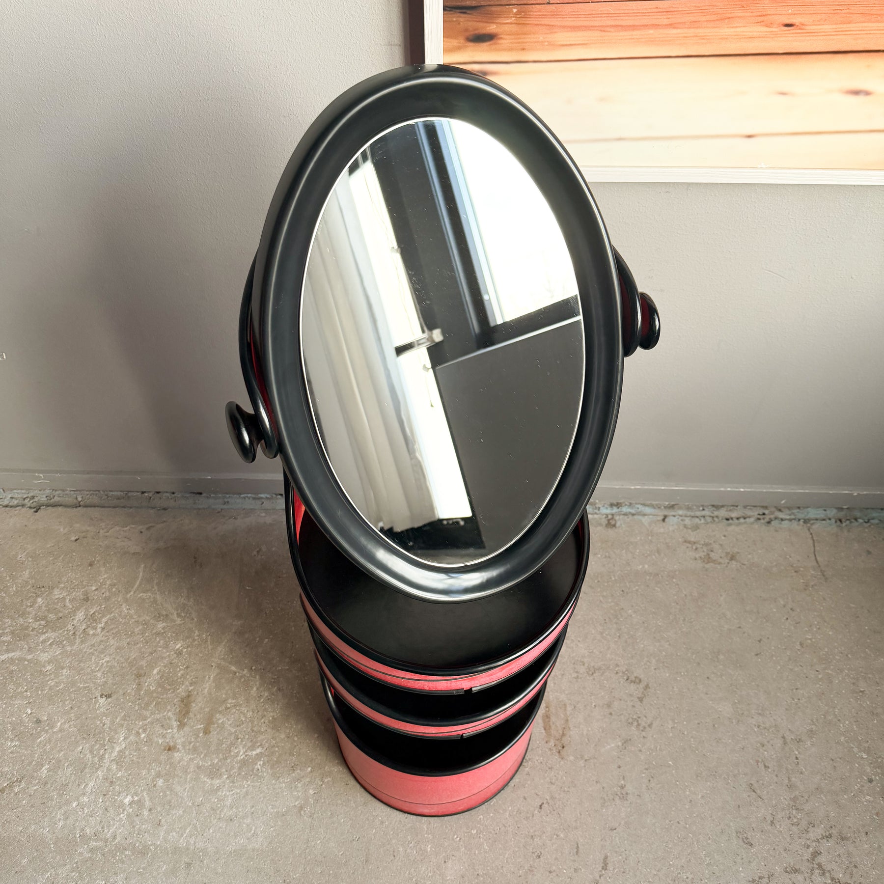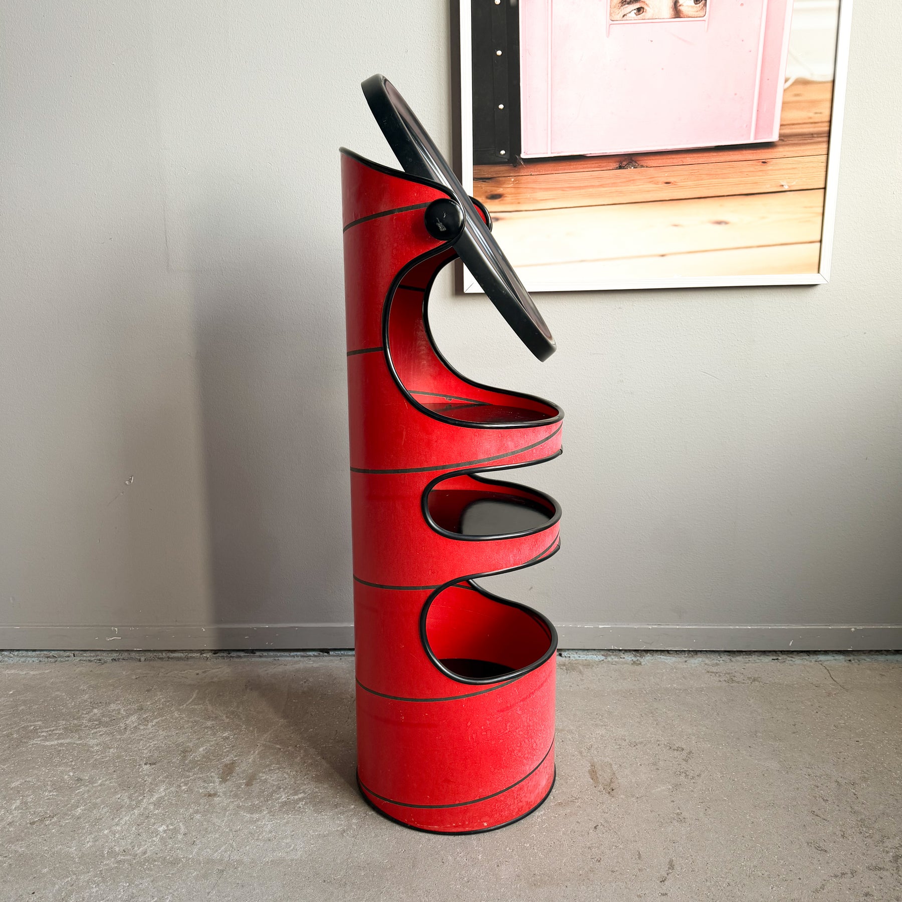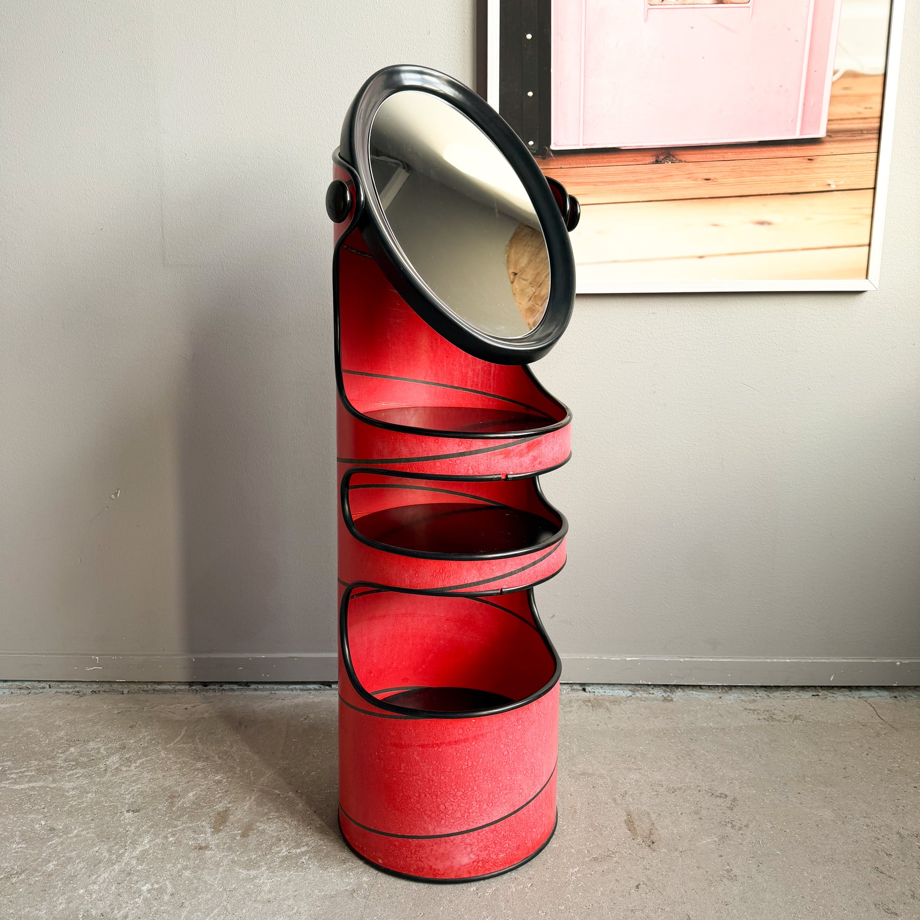 Sminkbord med spegel i rödlackerad hårdpapp. Svarta detaljer. Spegeln går att vrida. 3 svarta hyllplan.