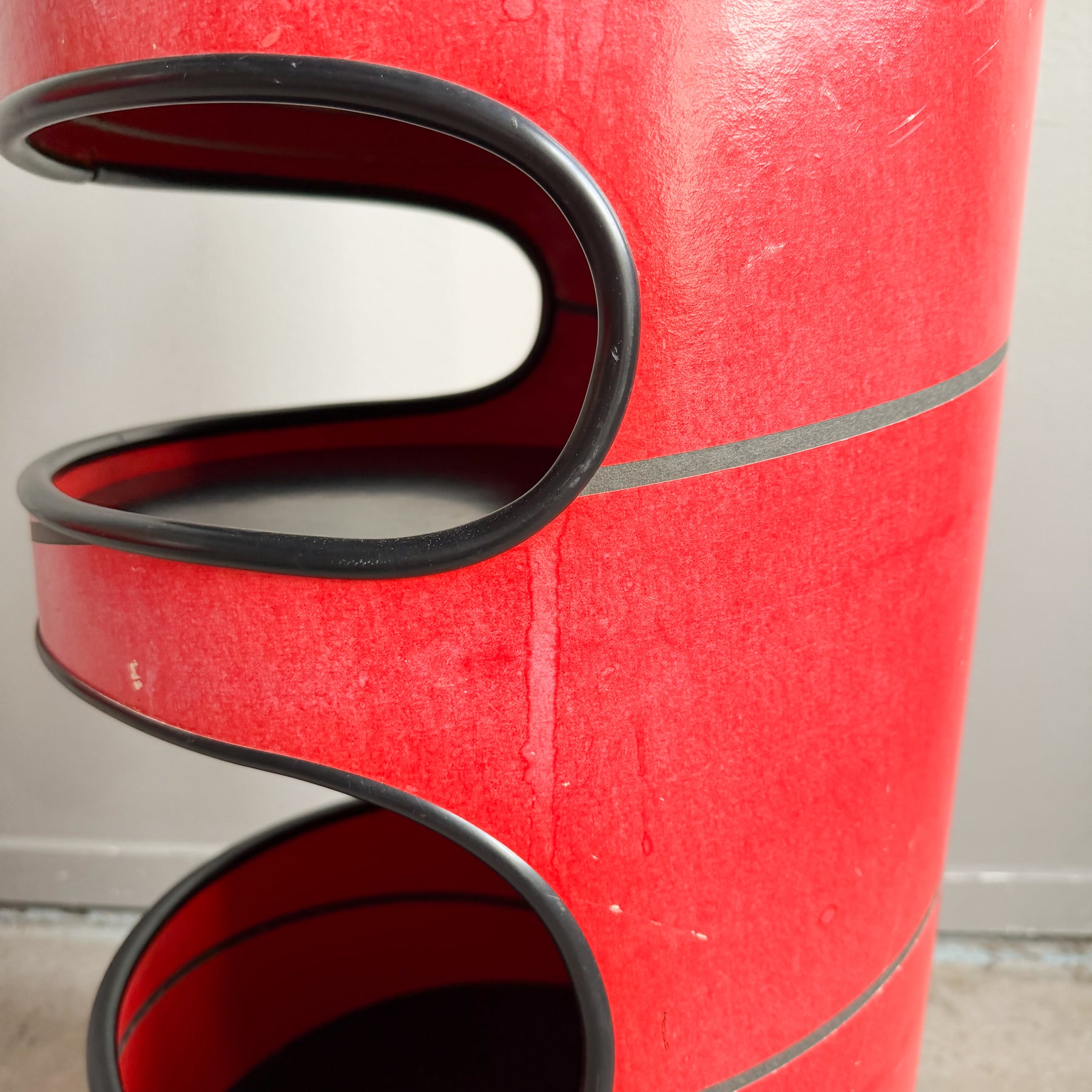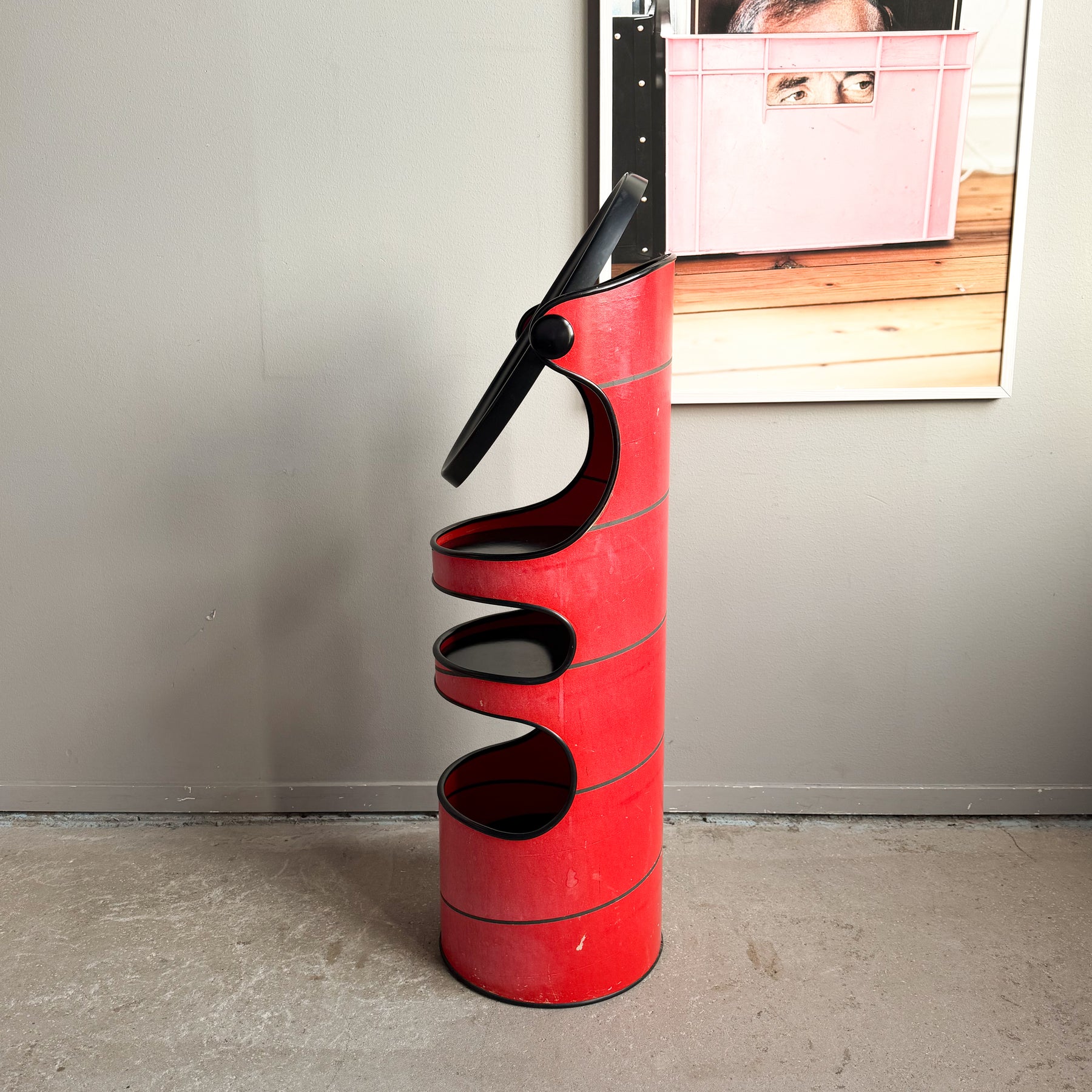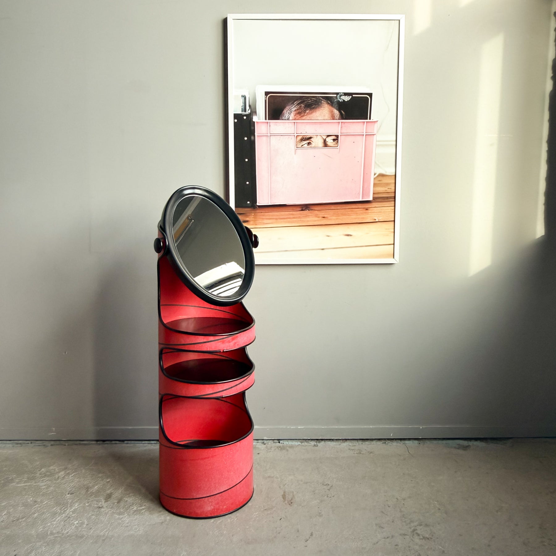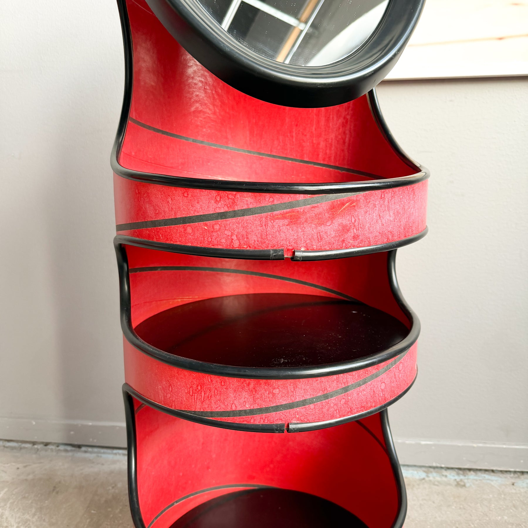 Sminkbord med spegel i rödlackerad hårdpapp. Svarta detaljer. Spegeln går att vrida. 3 svarta hyllplan.