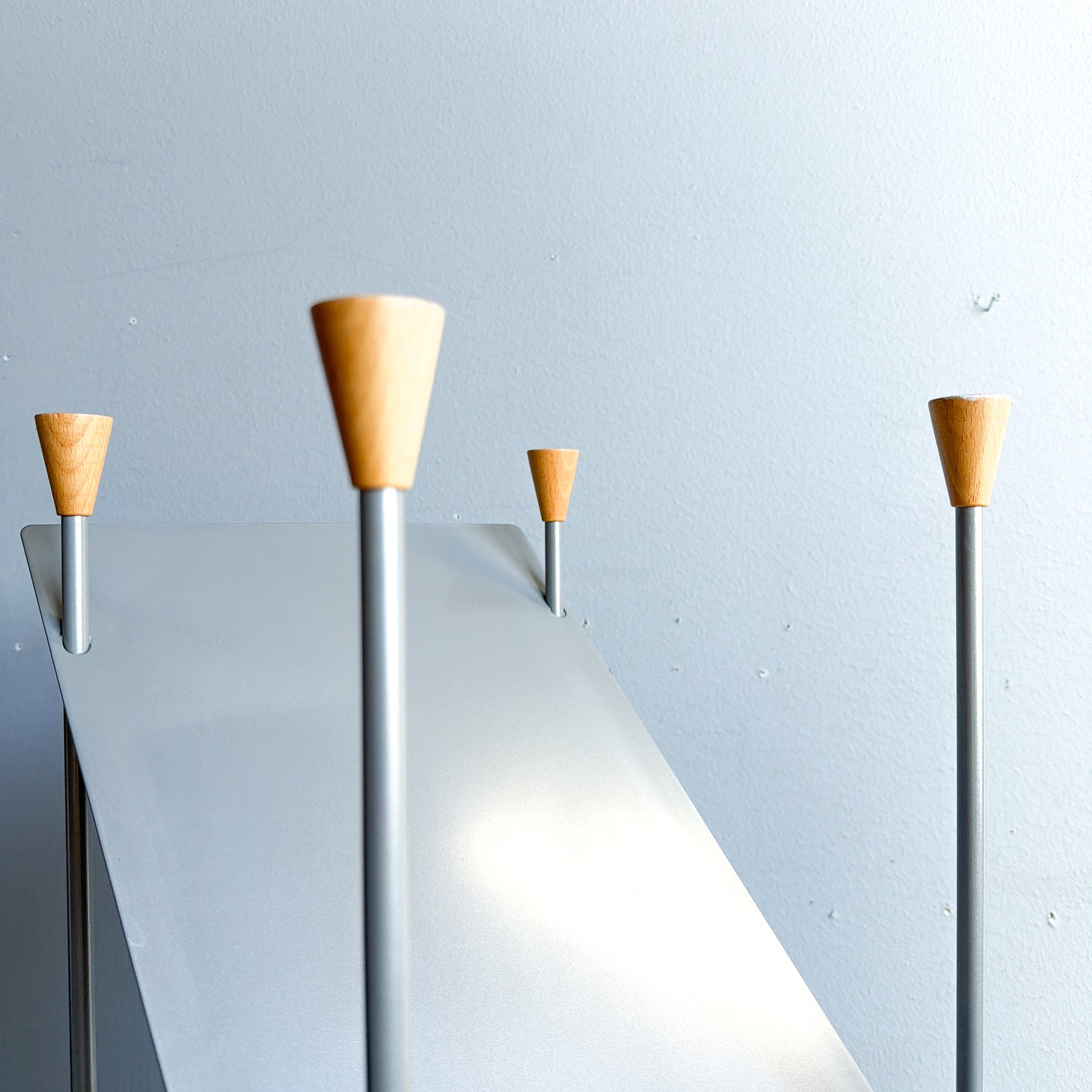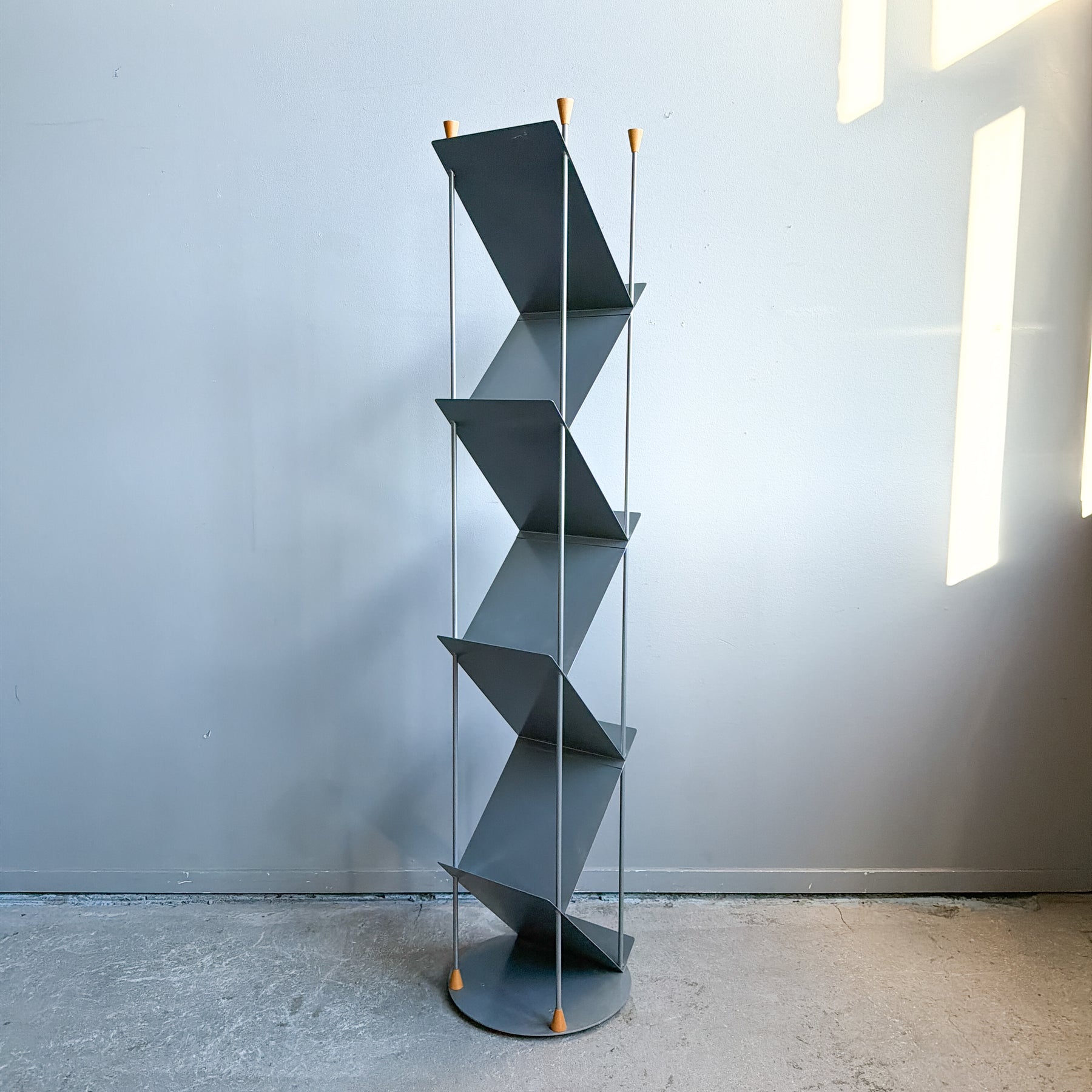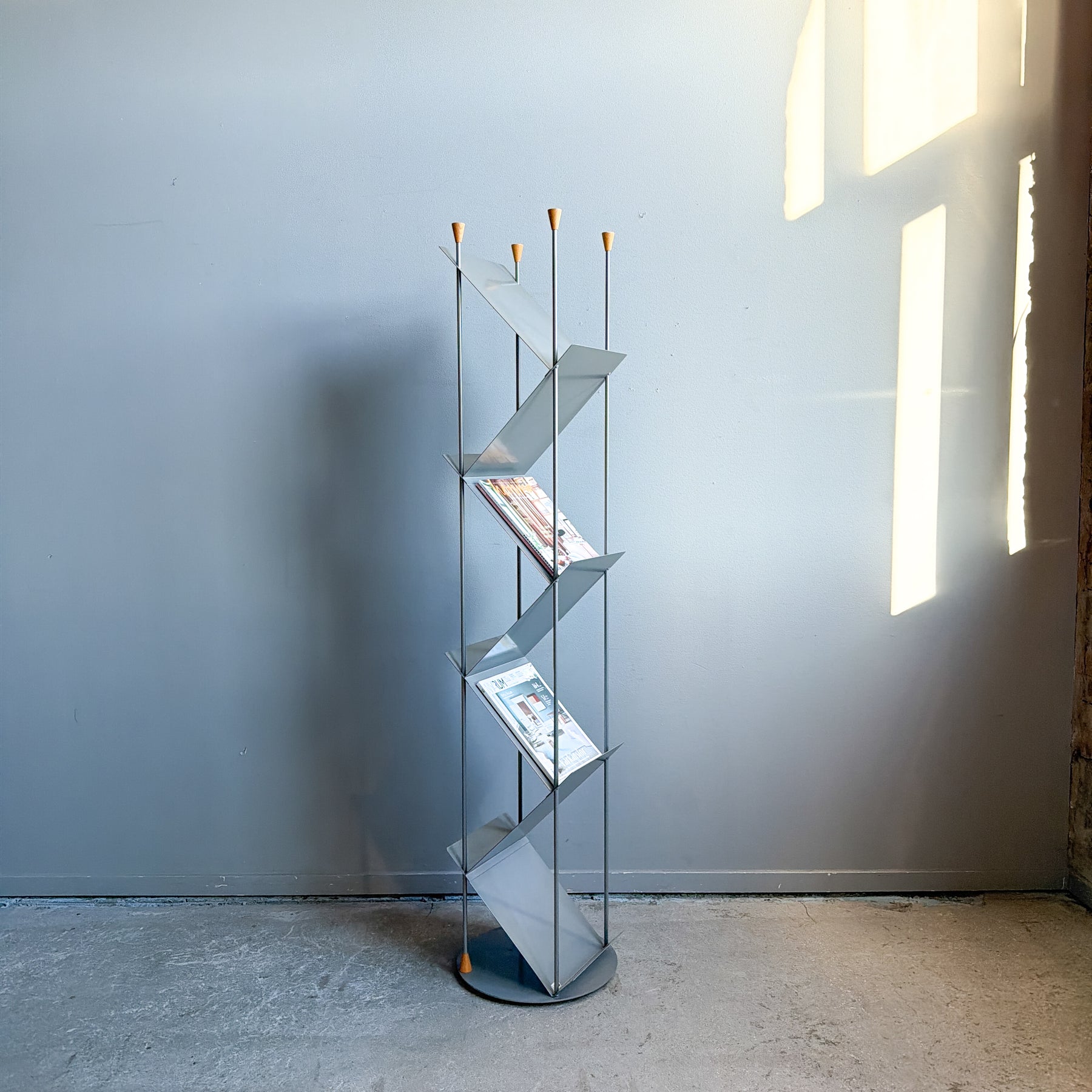 Tidningshylla i metall, Lourens Fisher, 90-tal. Snurrbart och tungt.