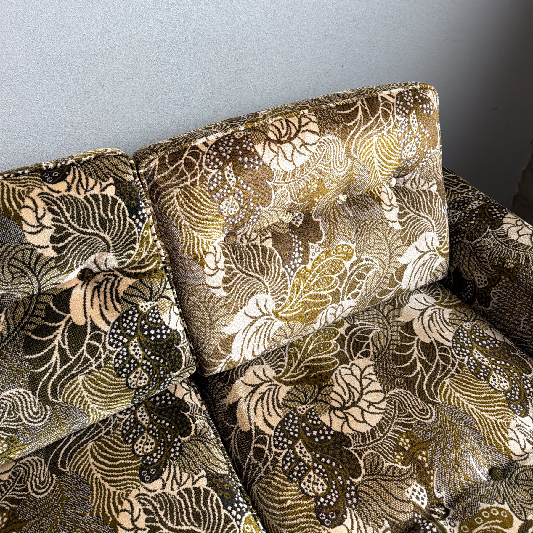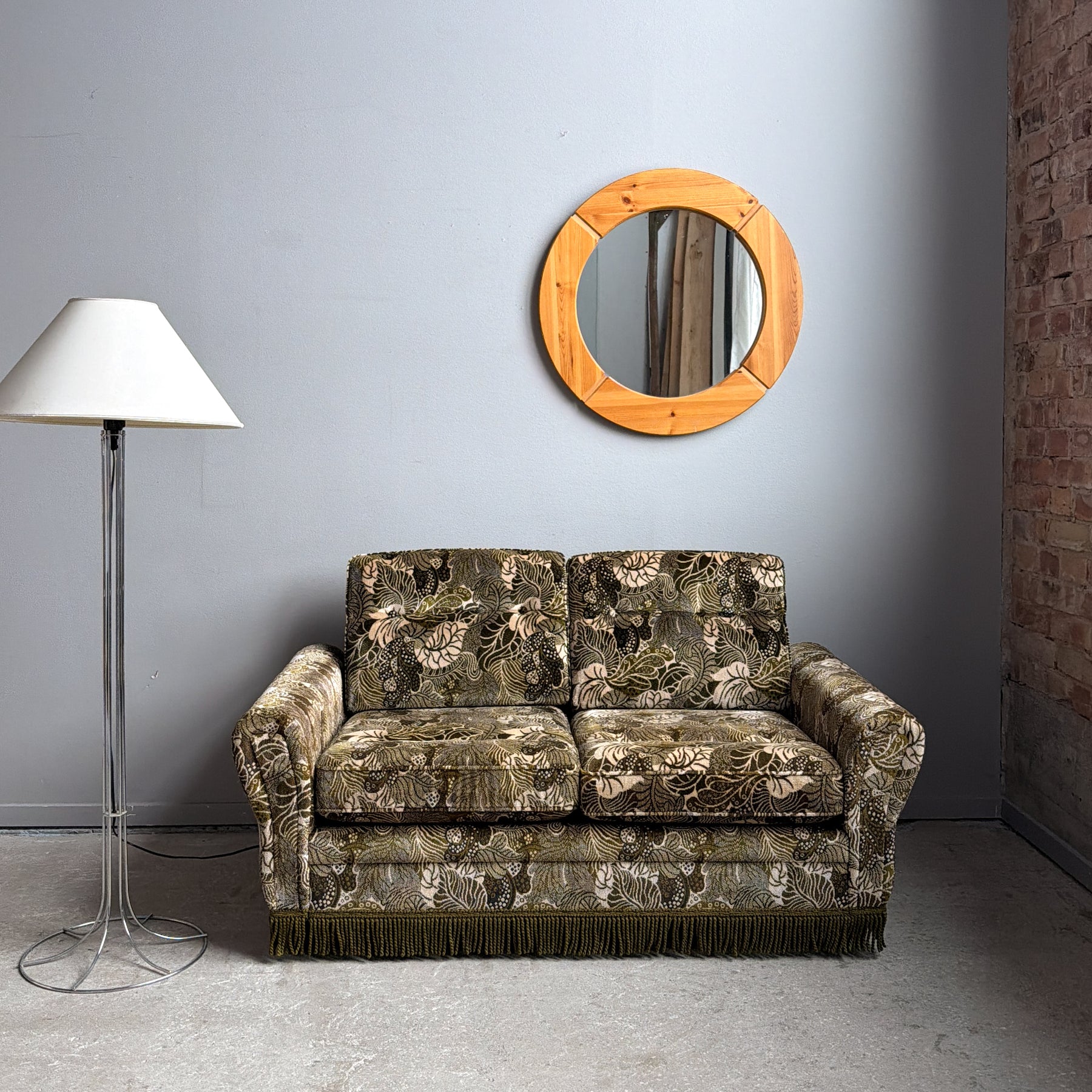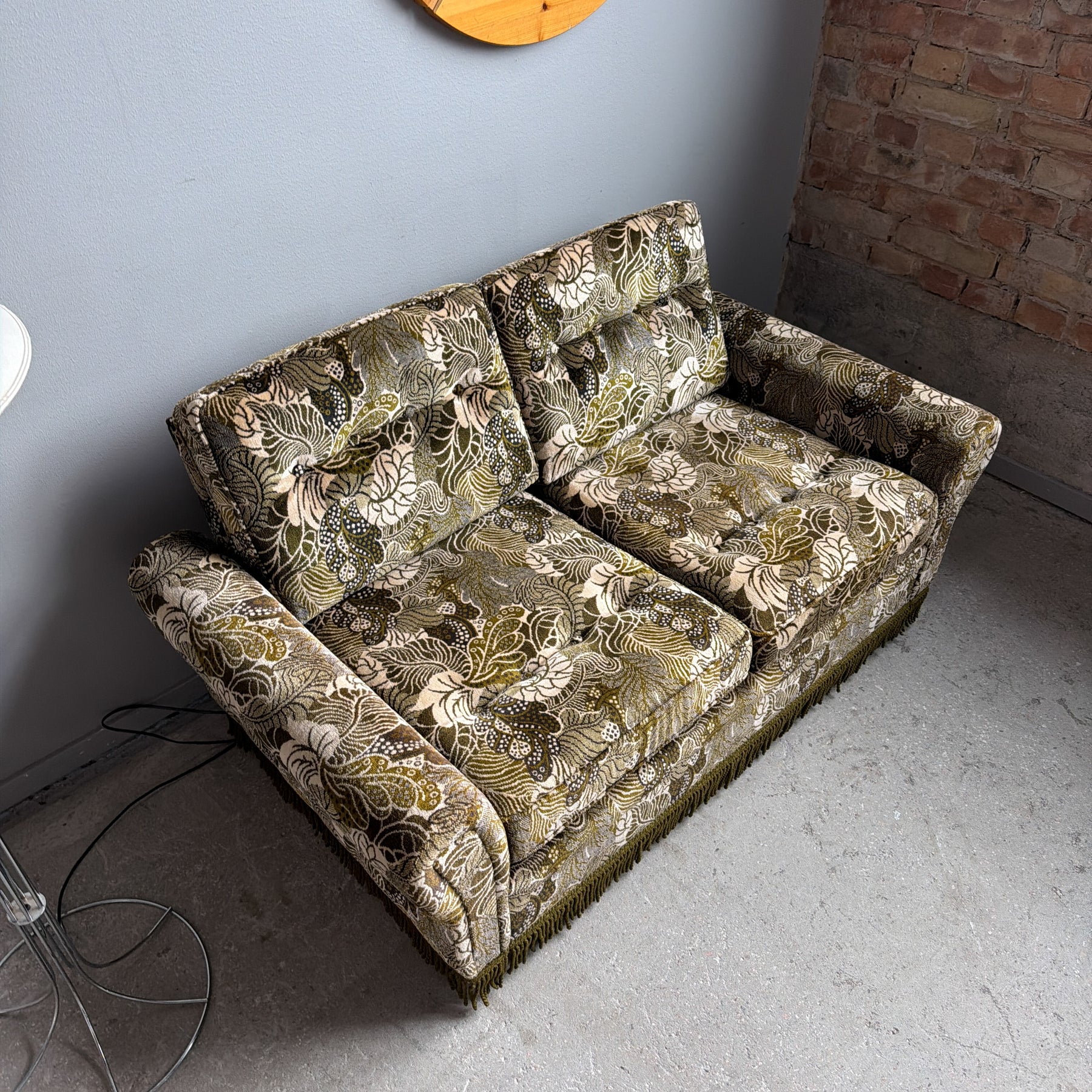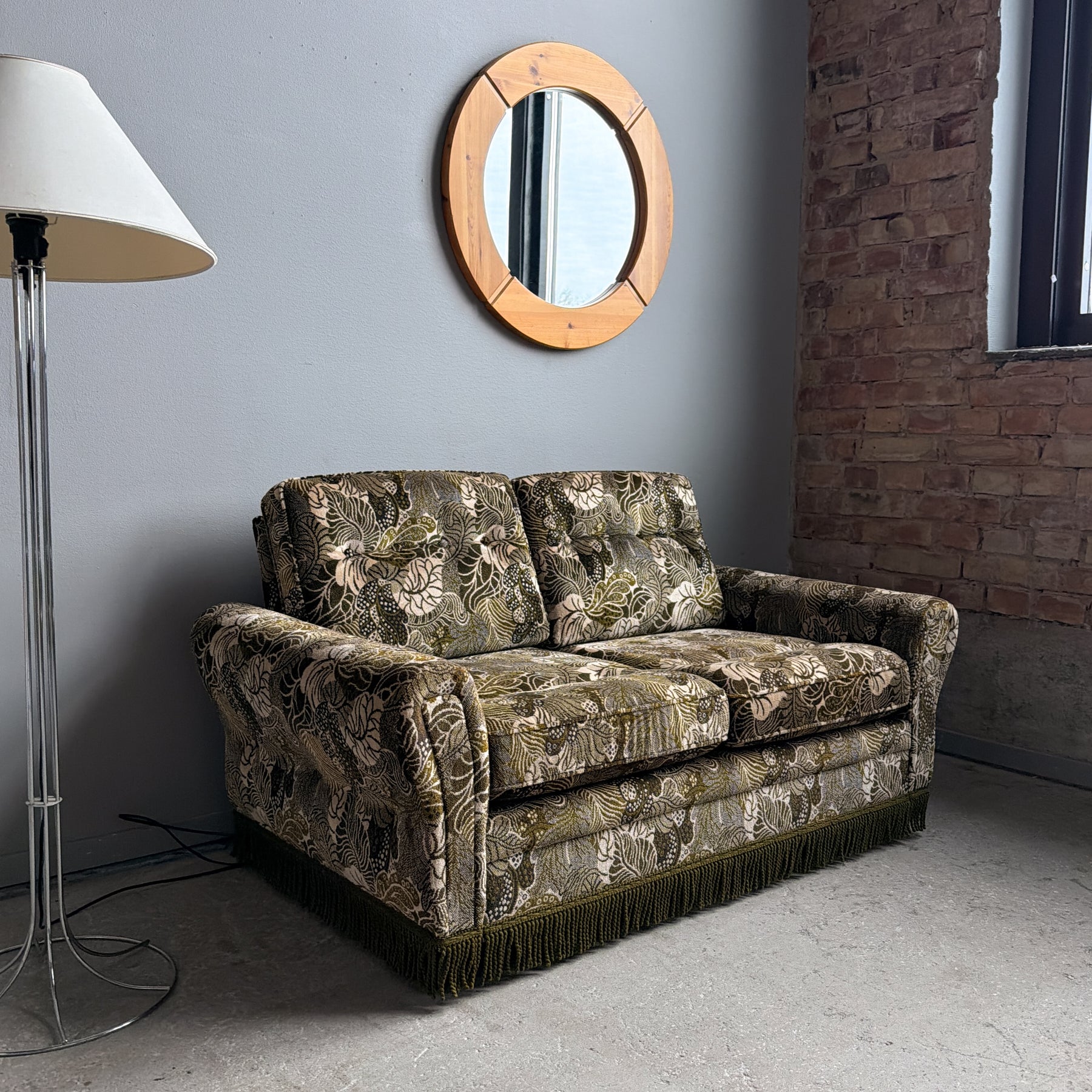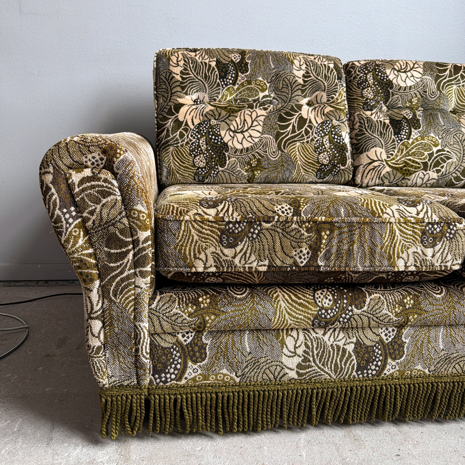 2-sits soffa i plysch, 70-tal. Grön och beige blommig/blad mönstrad med fransar nertill i grönt.