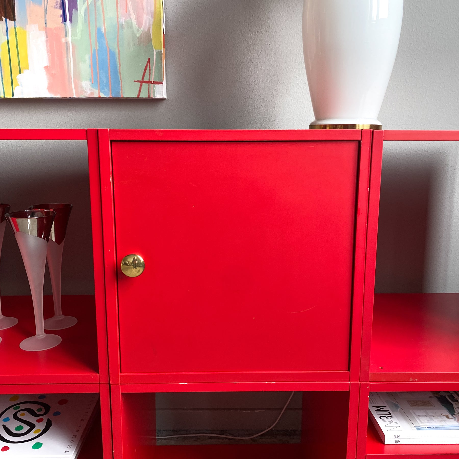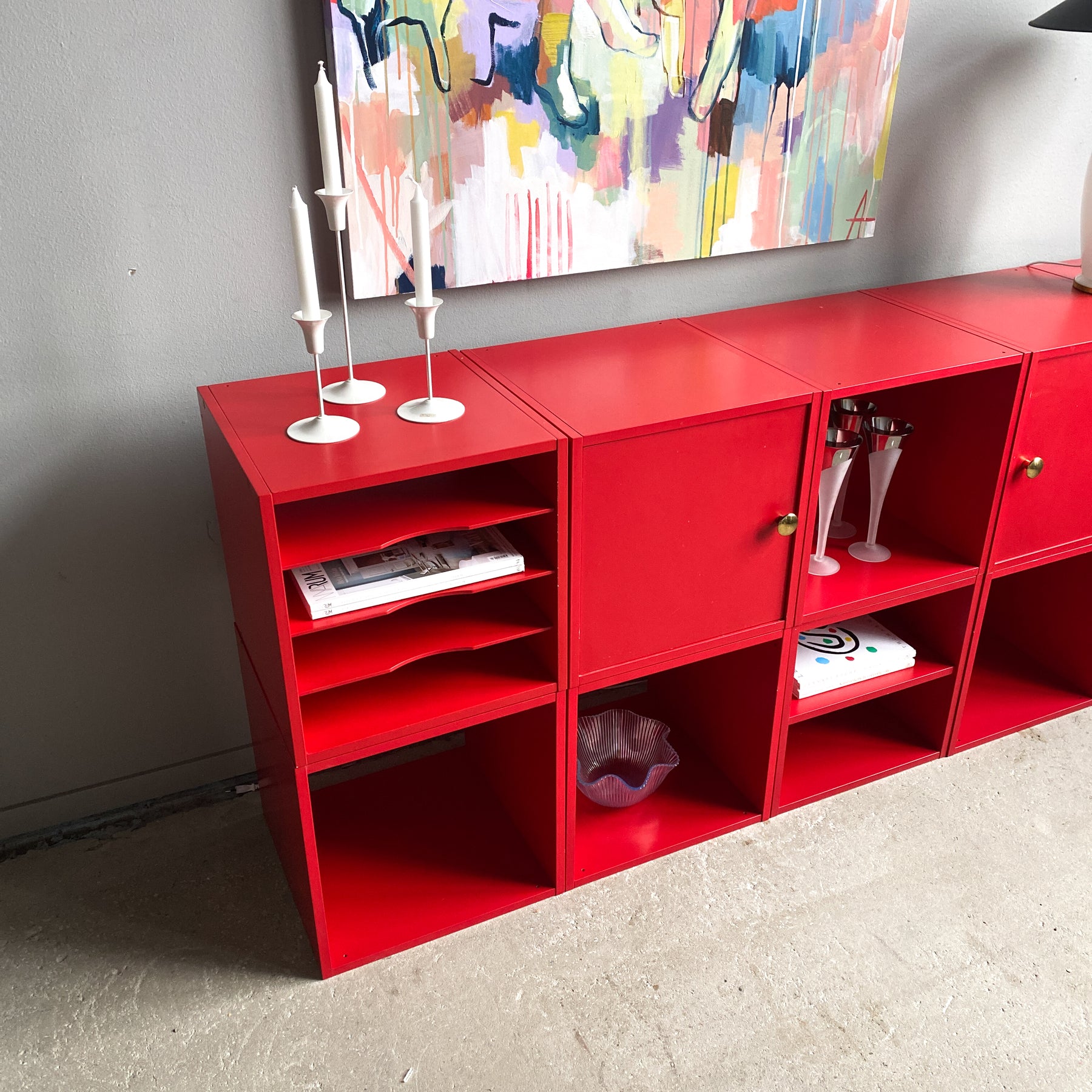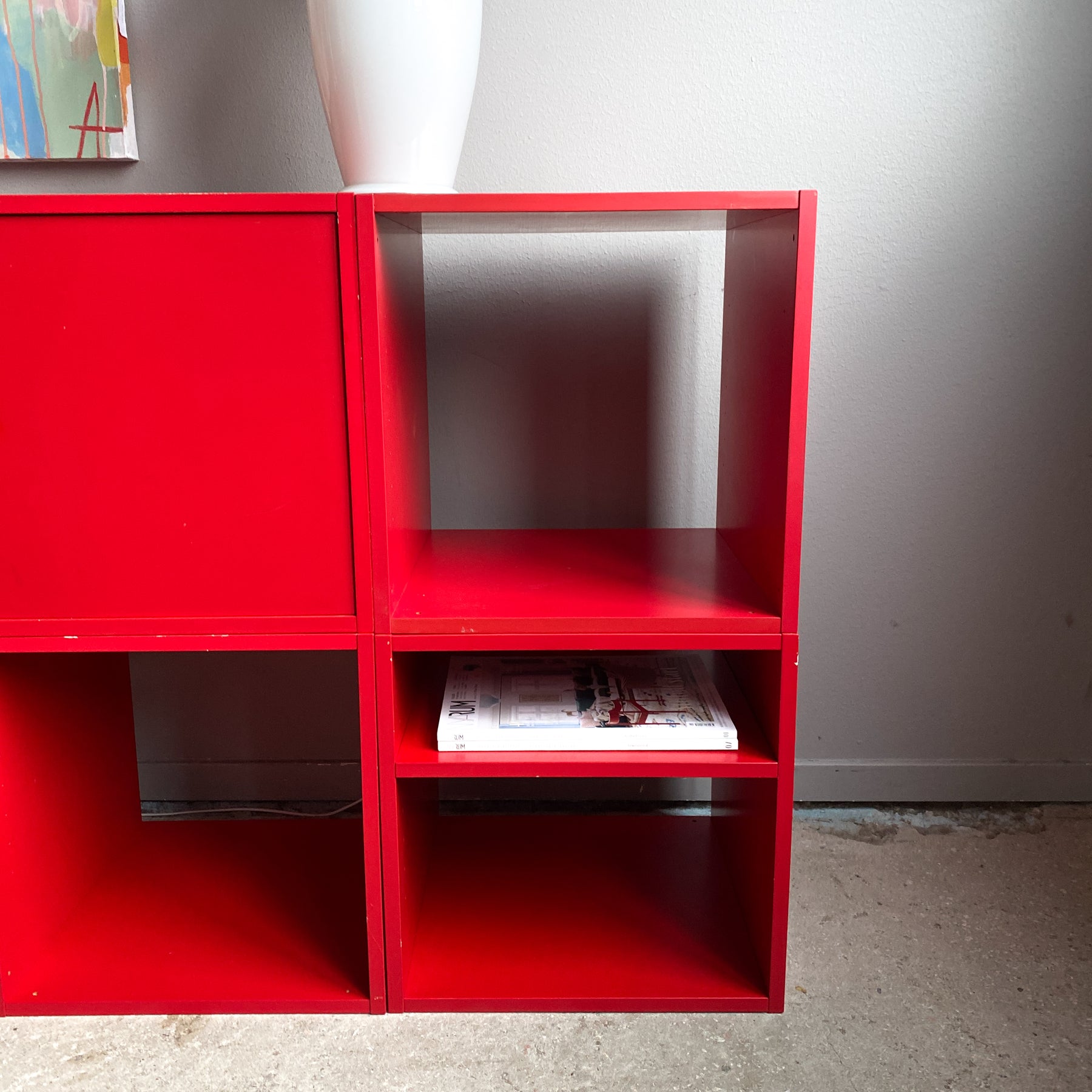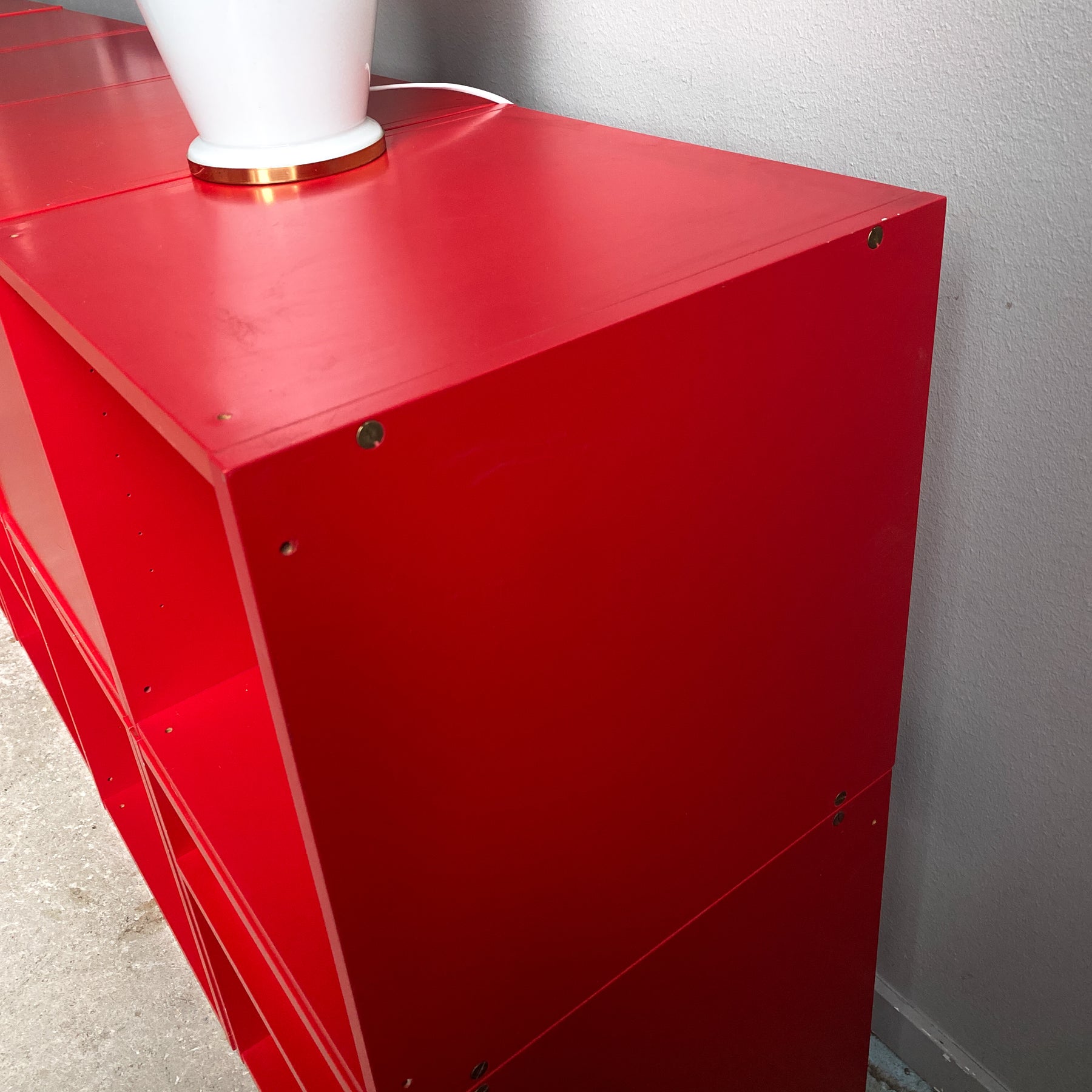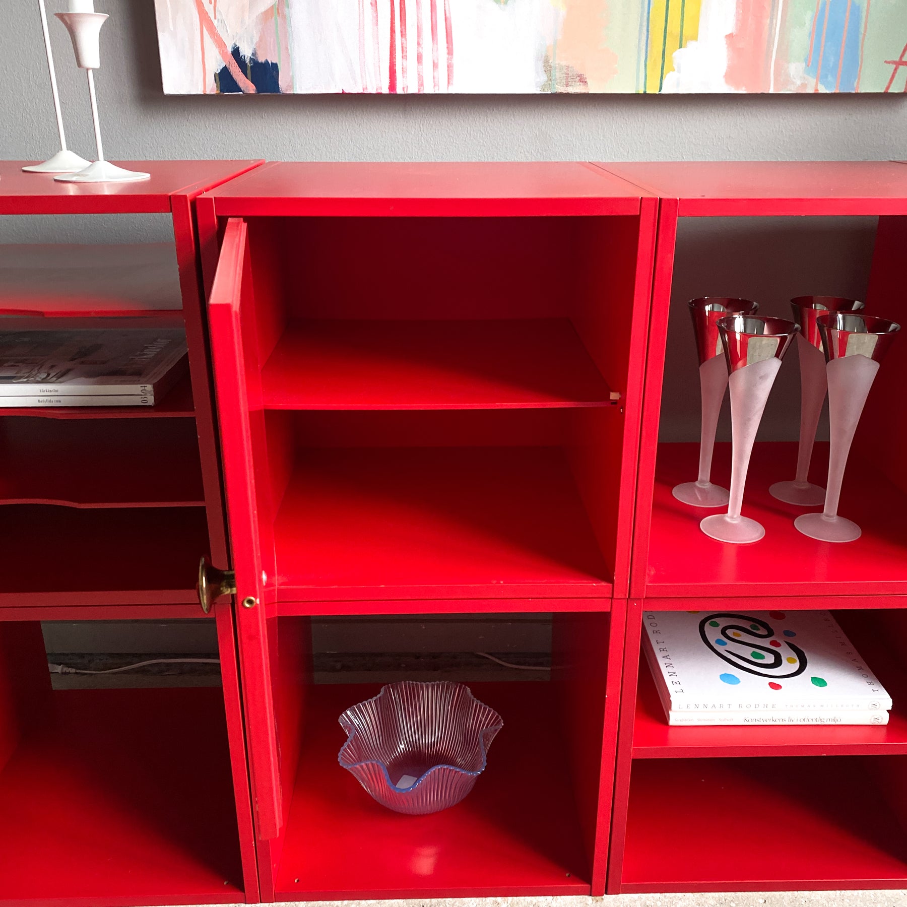 10 st röda byggbara kuber ur MER serien, design Gillis Lundgren för IKEA 1970. Knoppar i mässing.