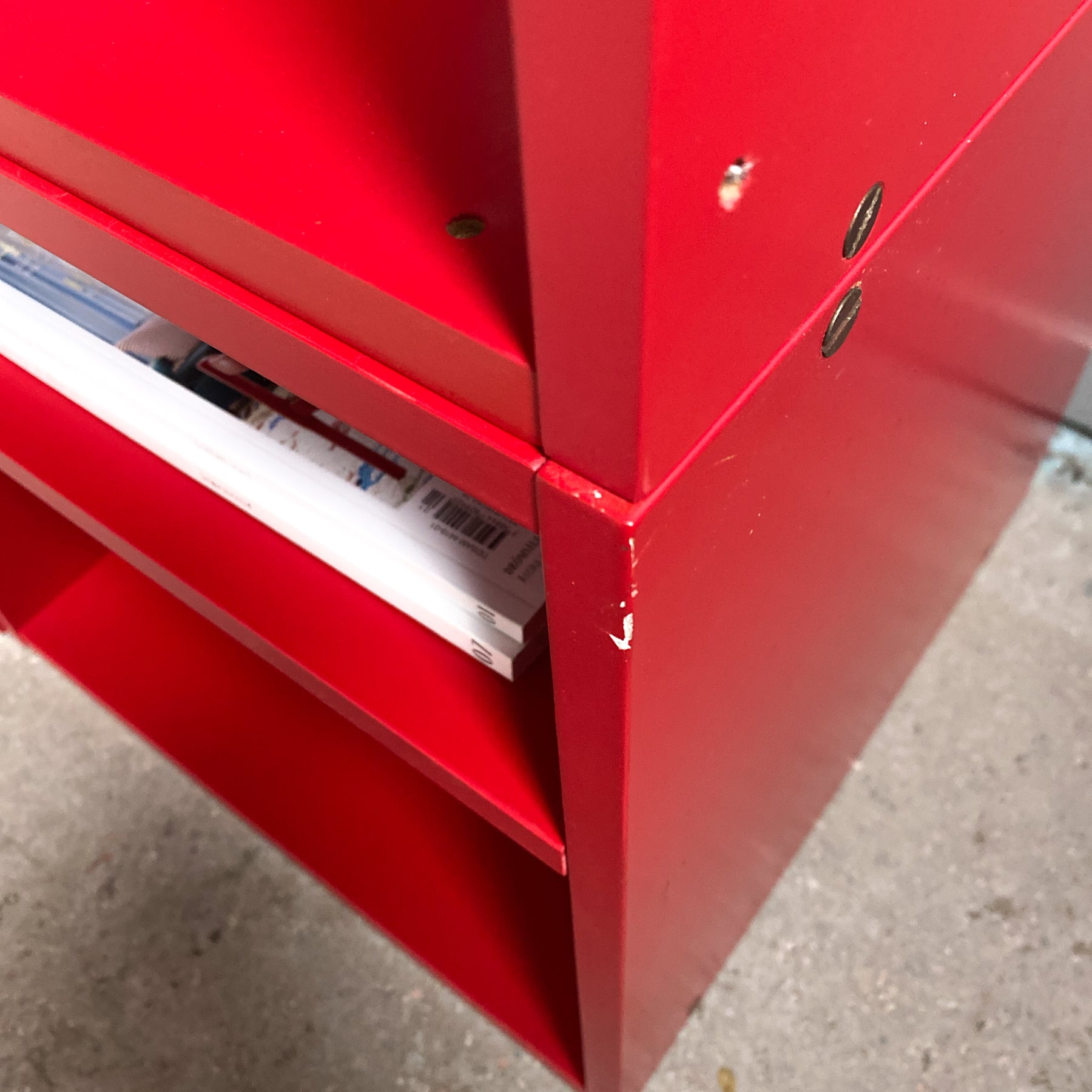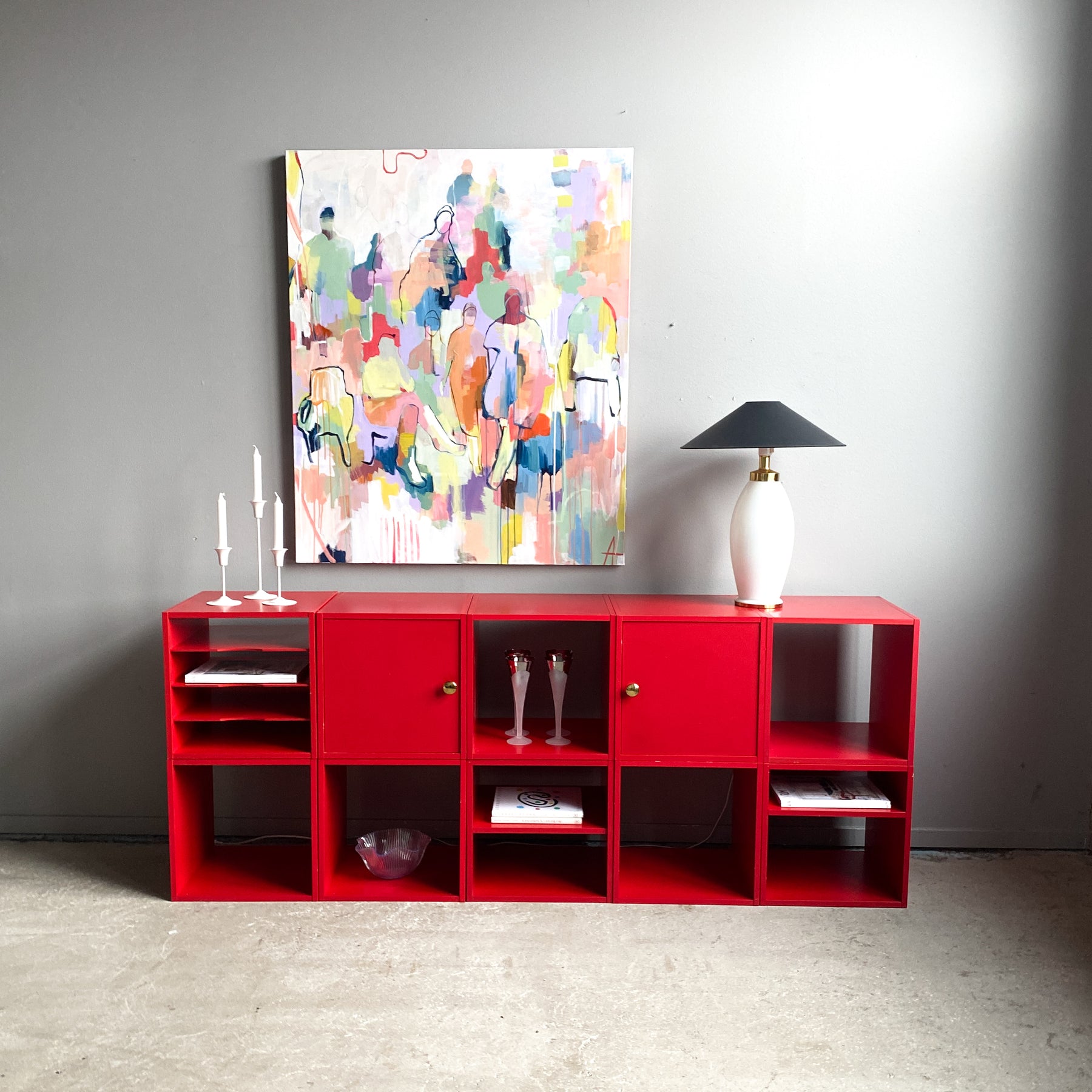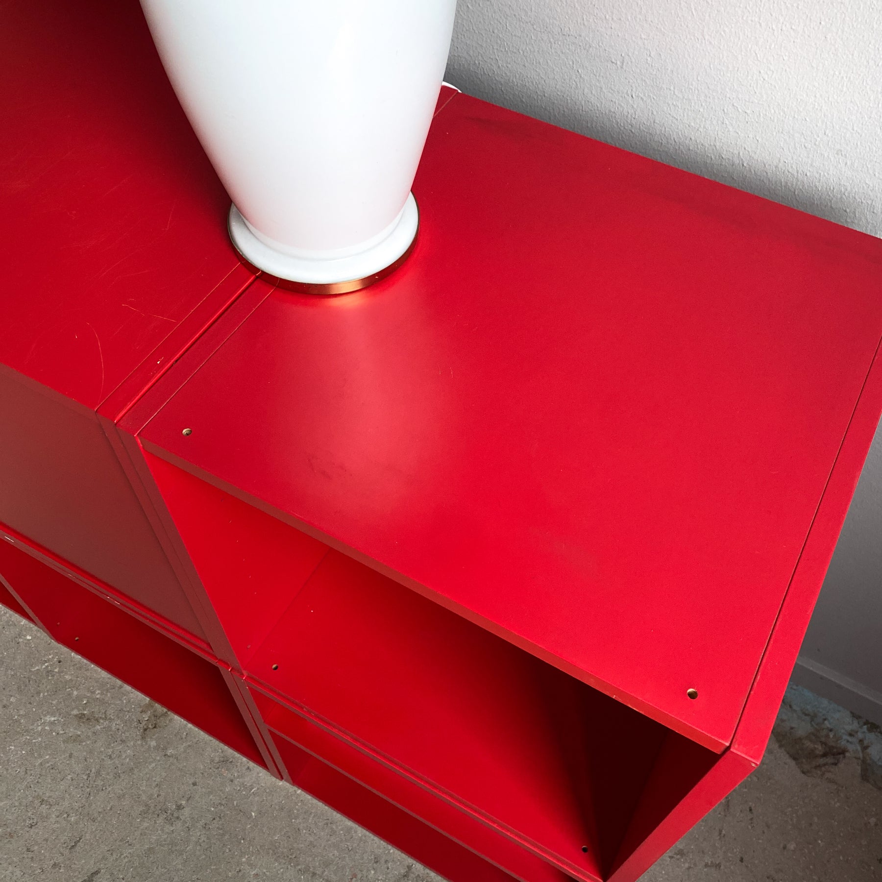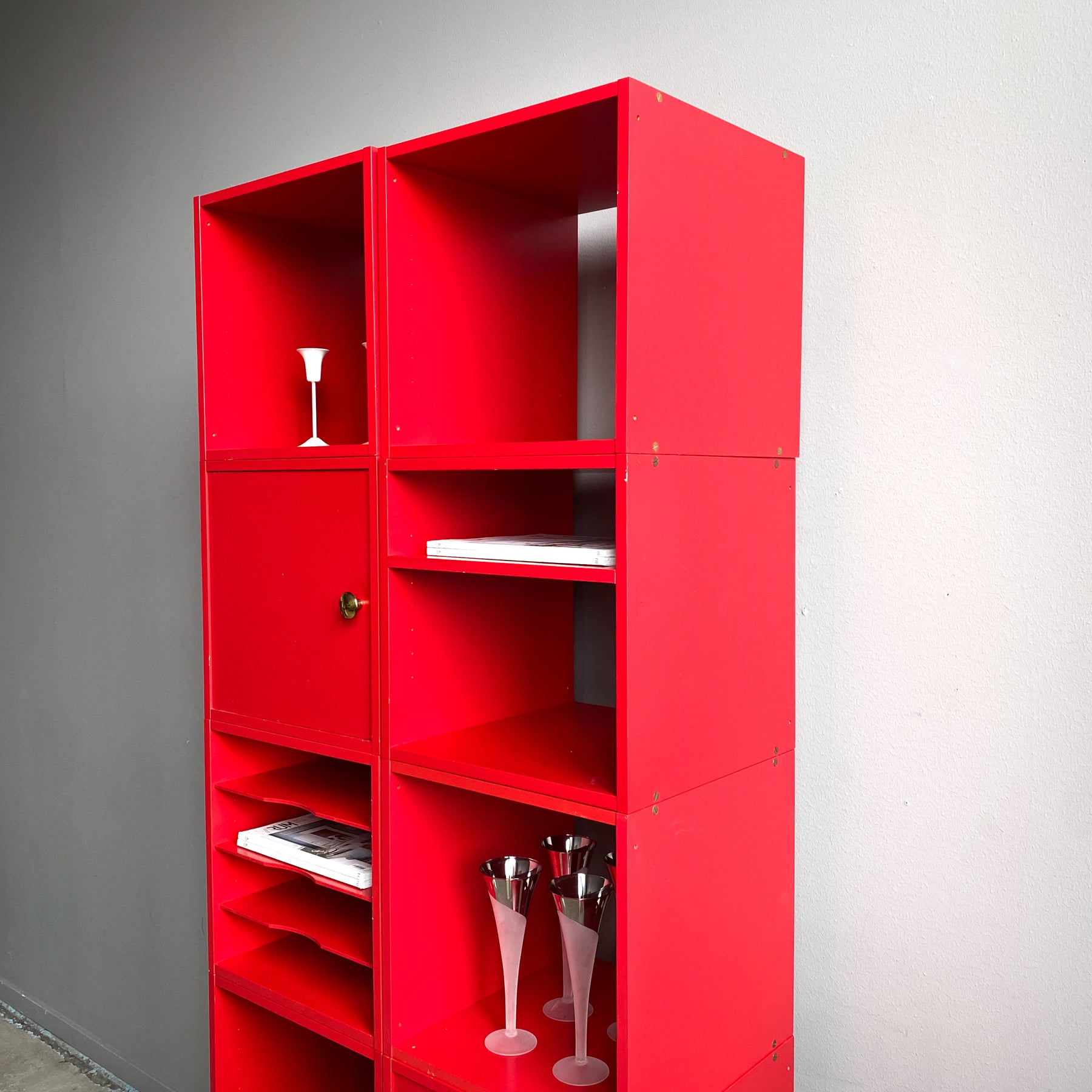 10 st röda byggbara kuber ur MER serien, design Gillis Lundgren för IKEA 1970. Knoppar i mässing.