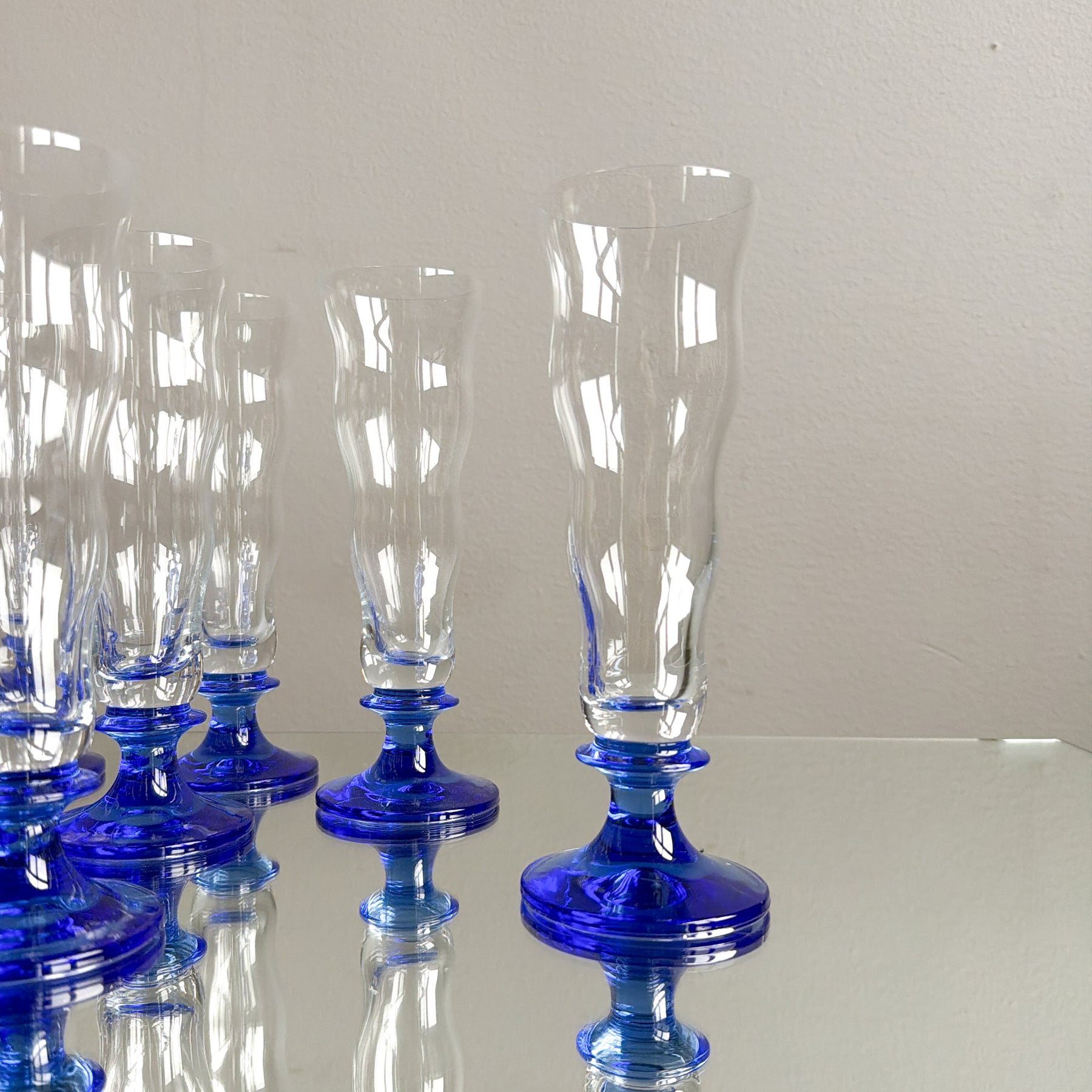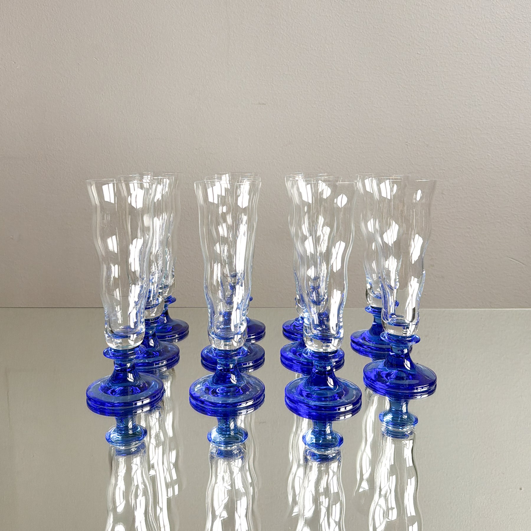 11 st ölglas ur serien Jazz design Jackie Lynd, 90-tal. Vågig form med blå fot.