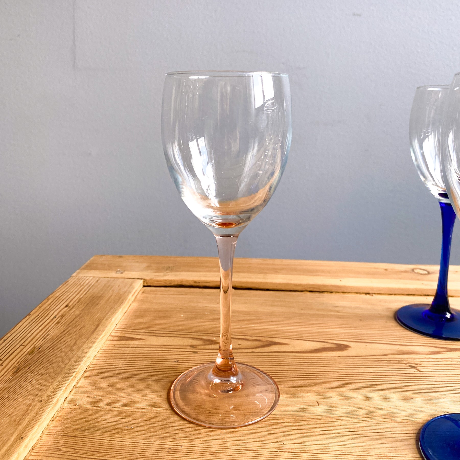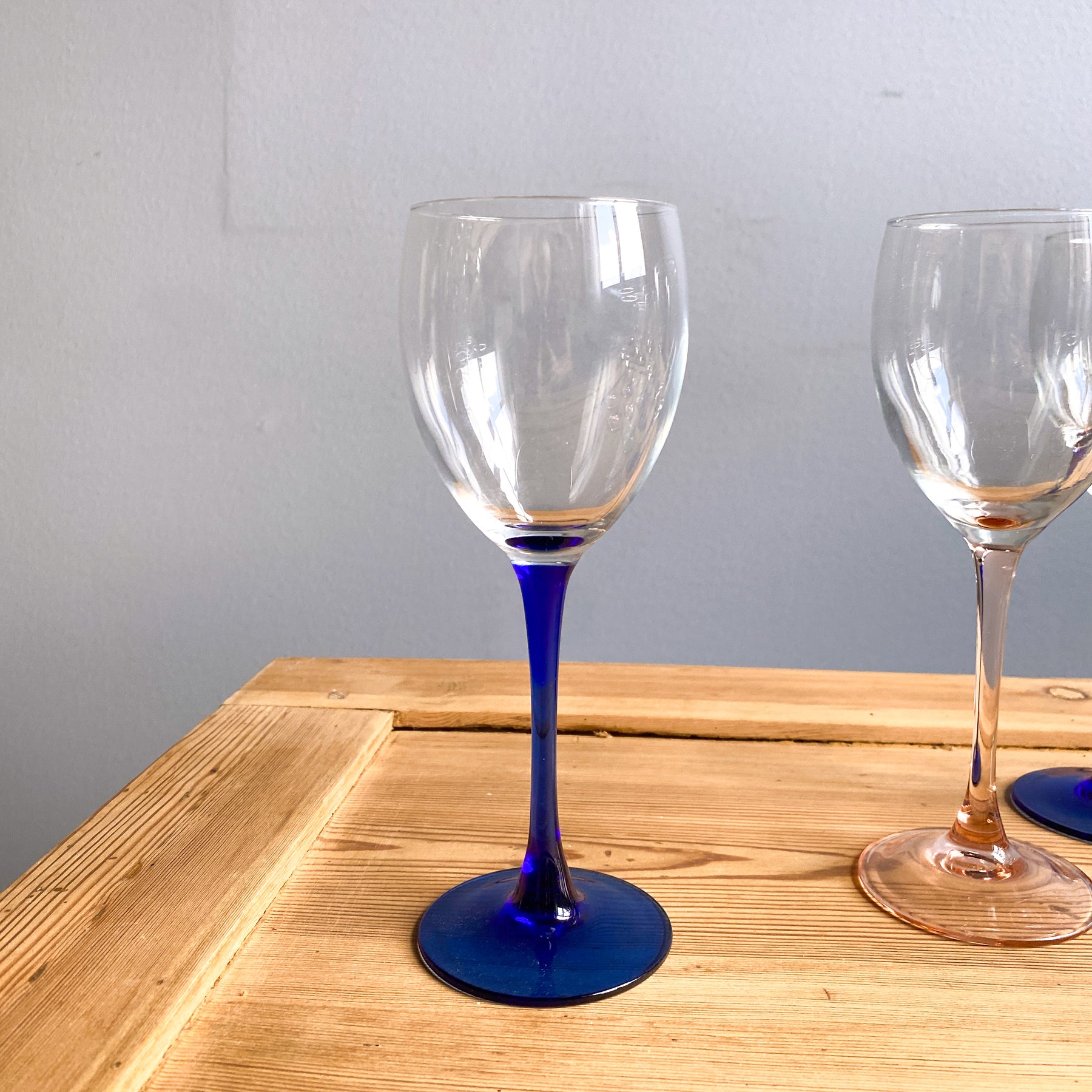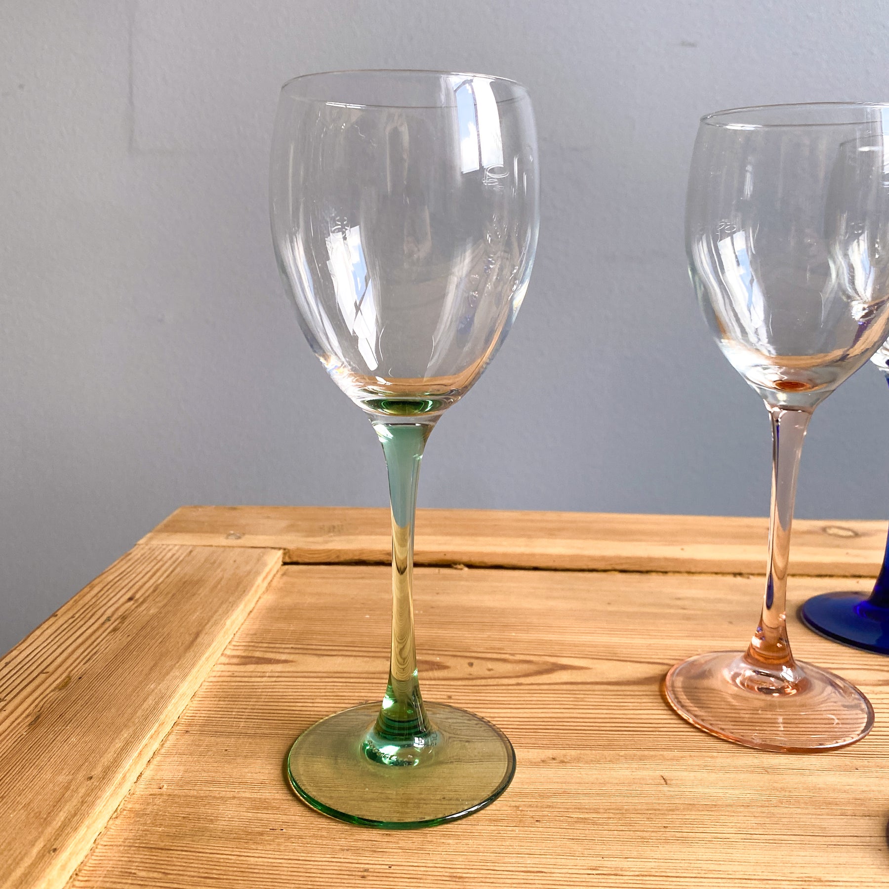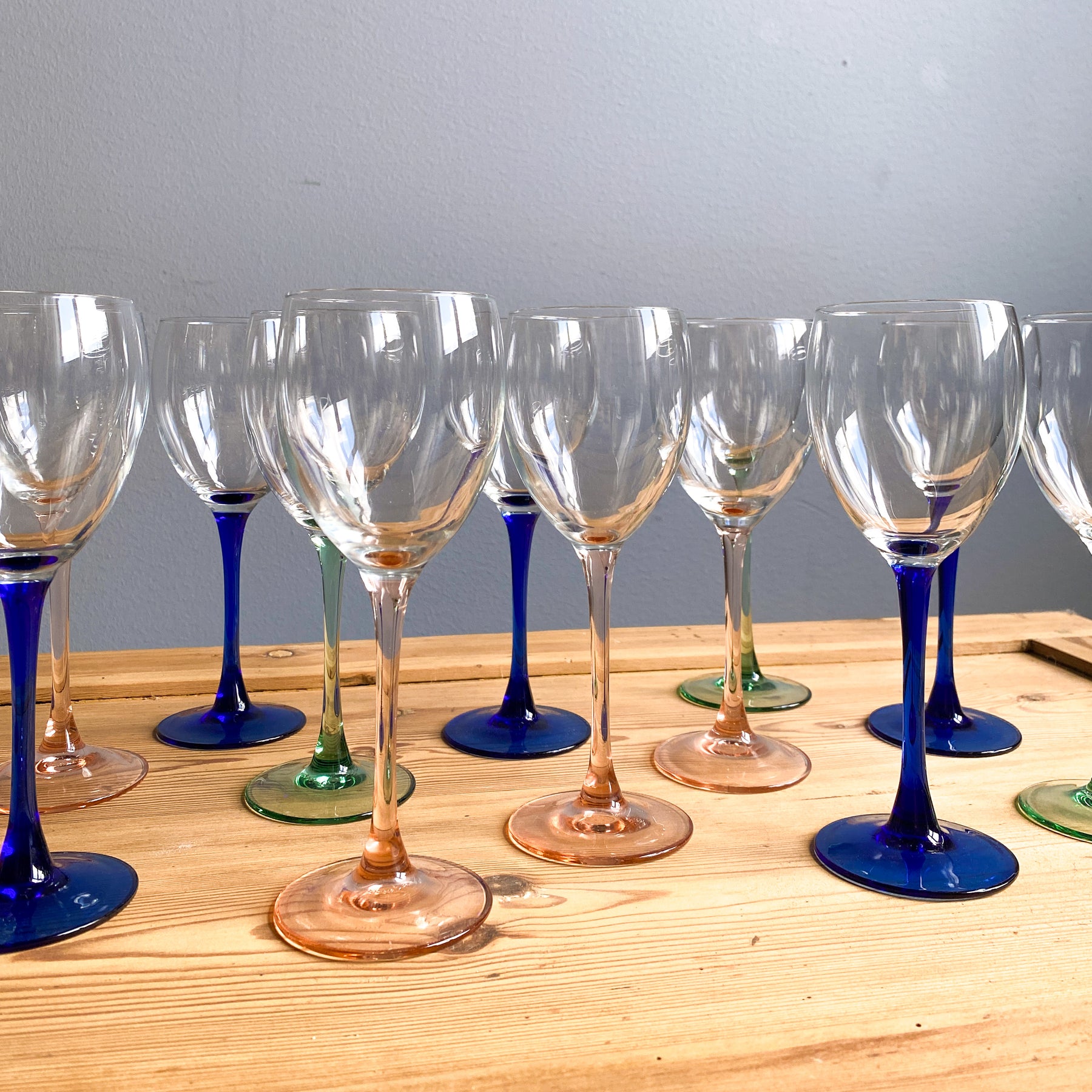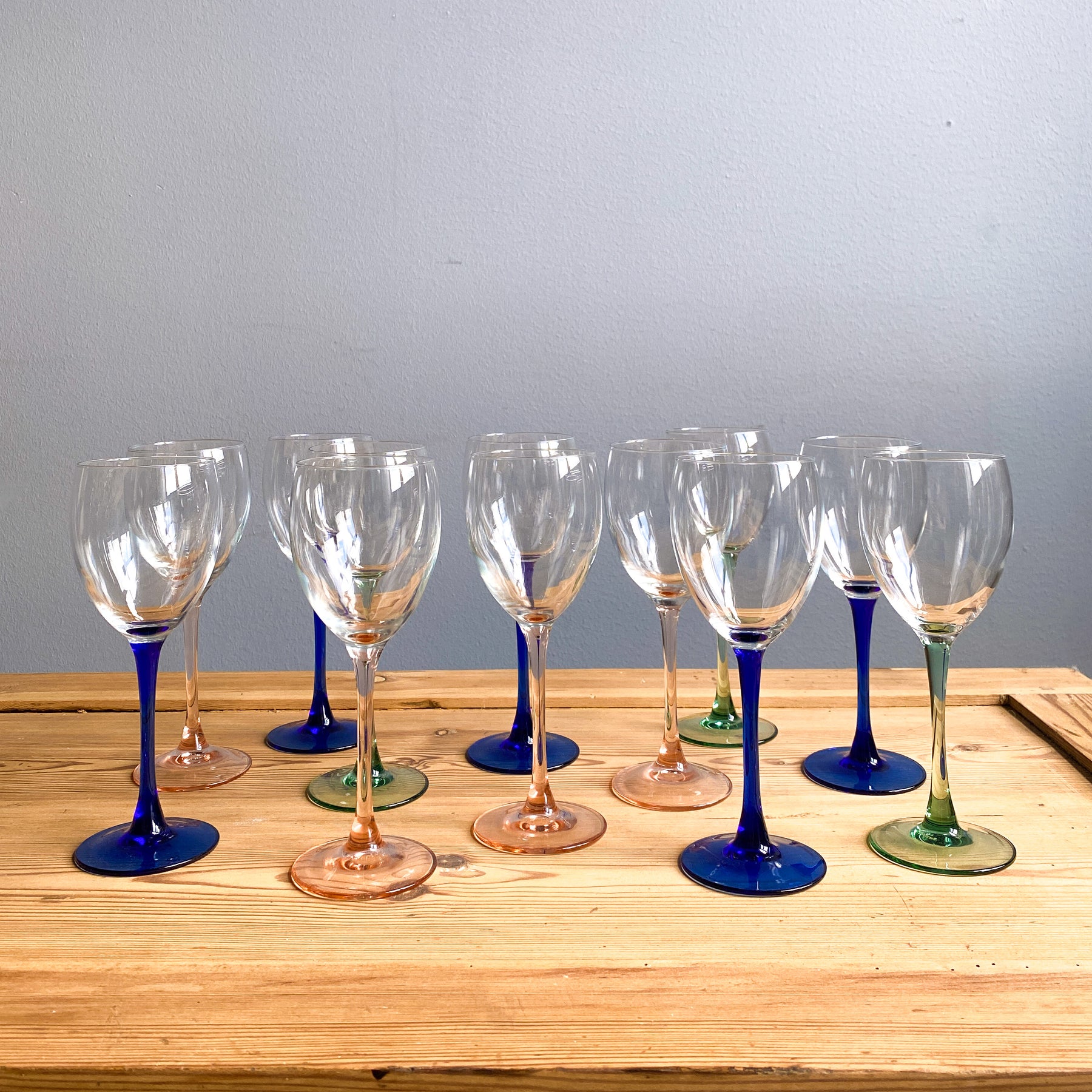 12 st vinglas från Luminarc, Frankrike. 5 blå, 4 rosa, 3 gröna.