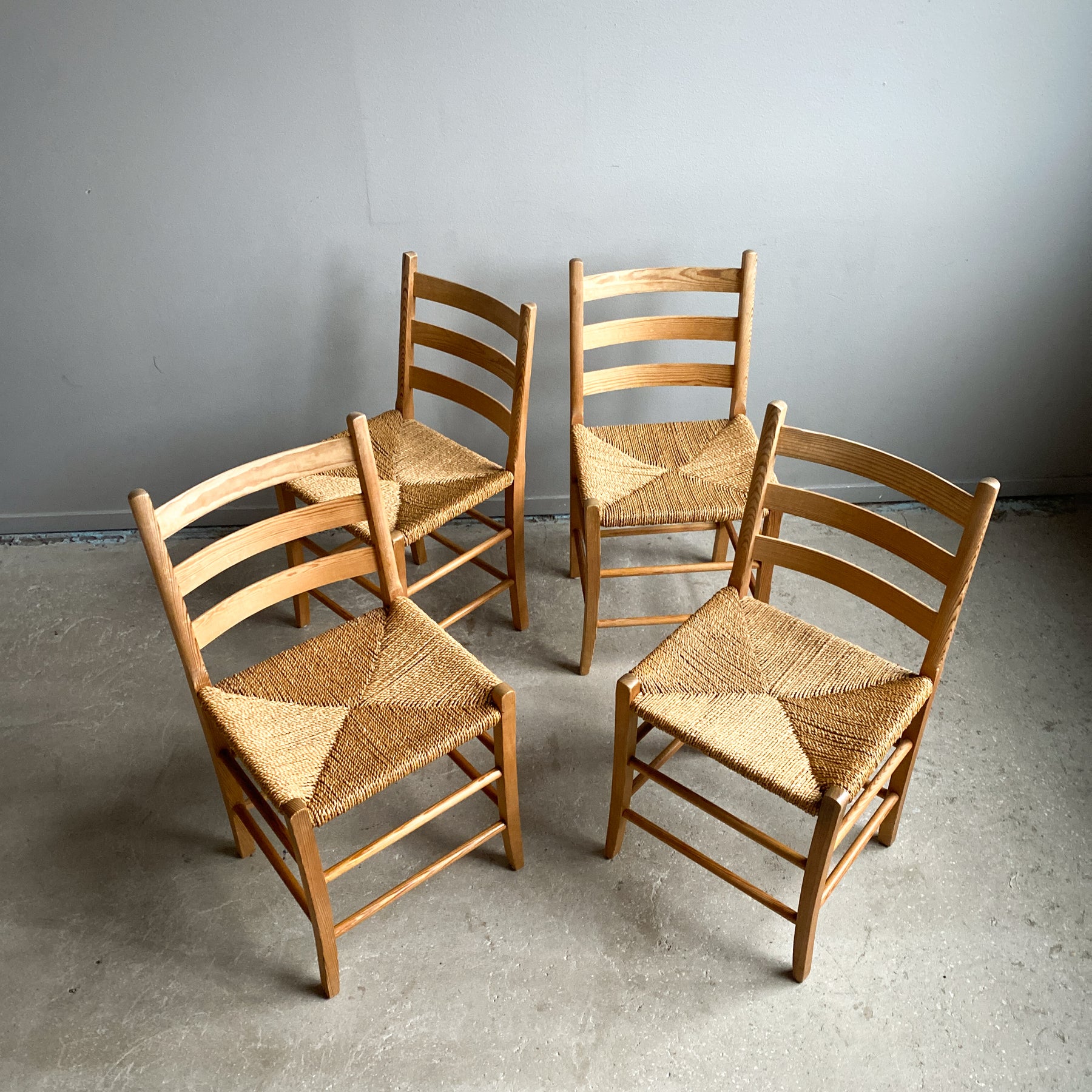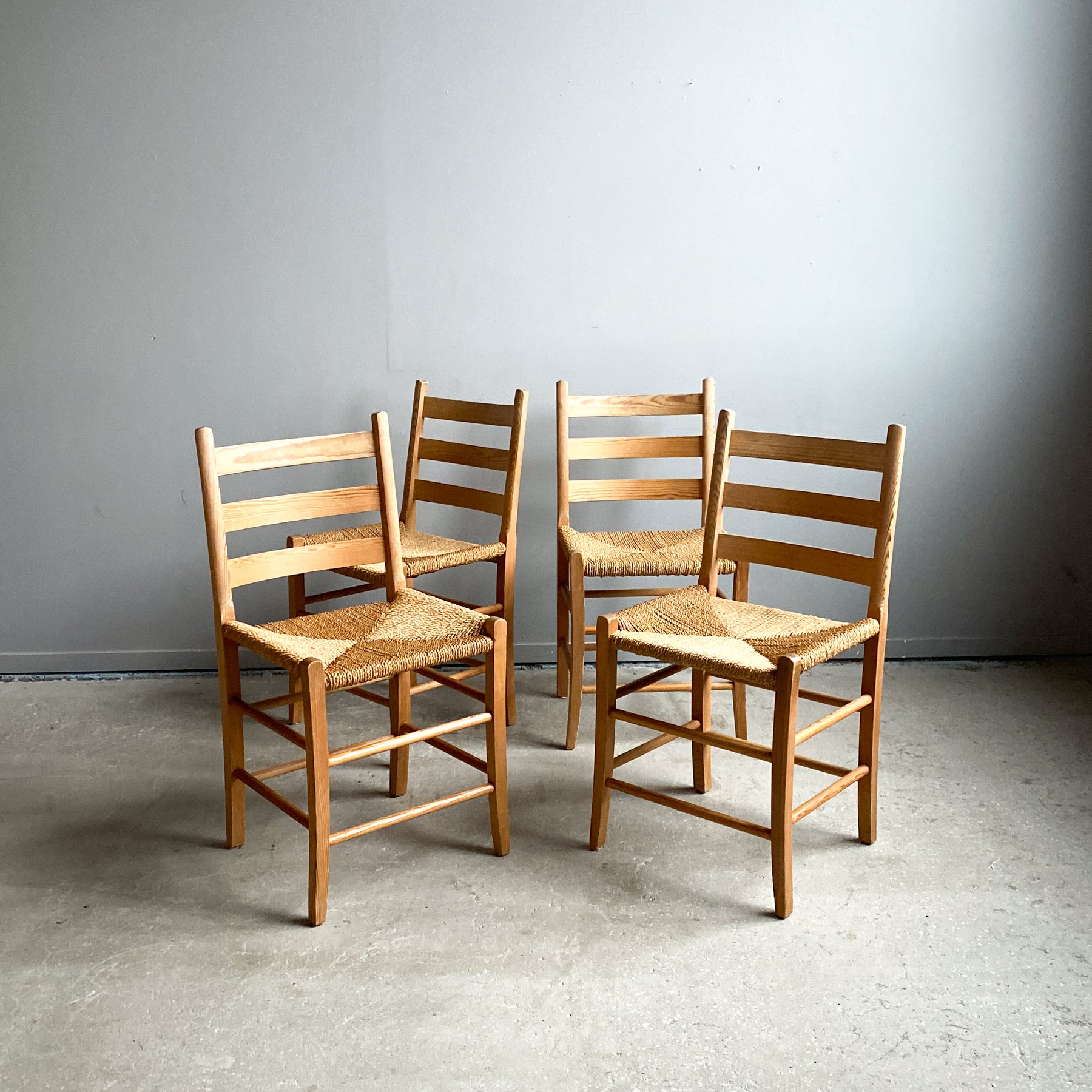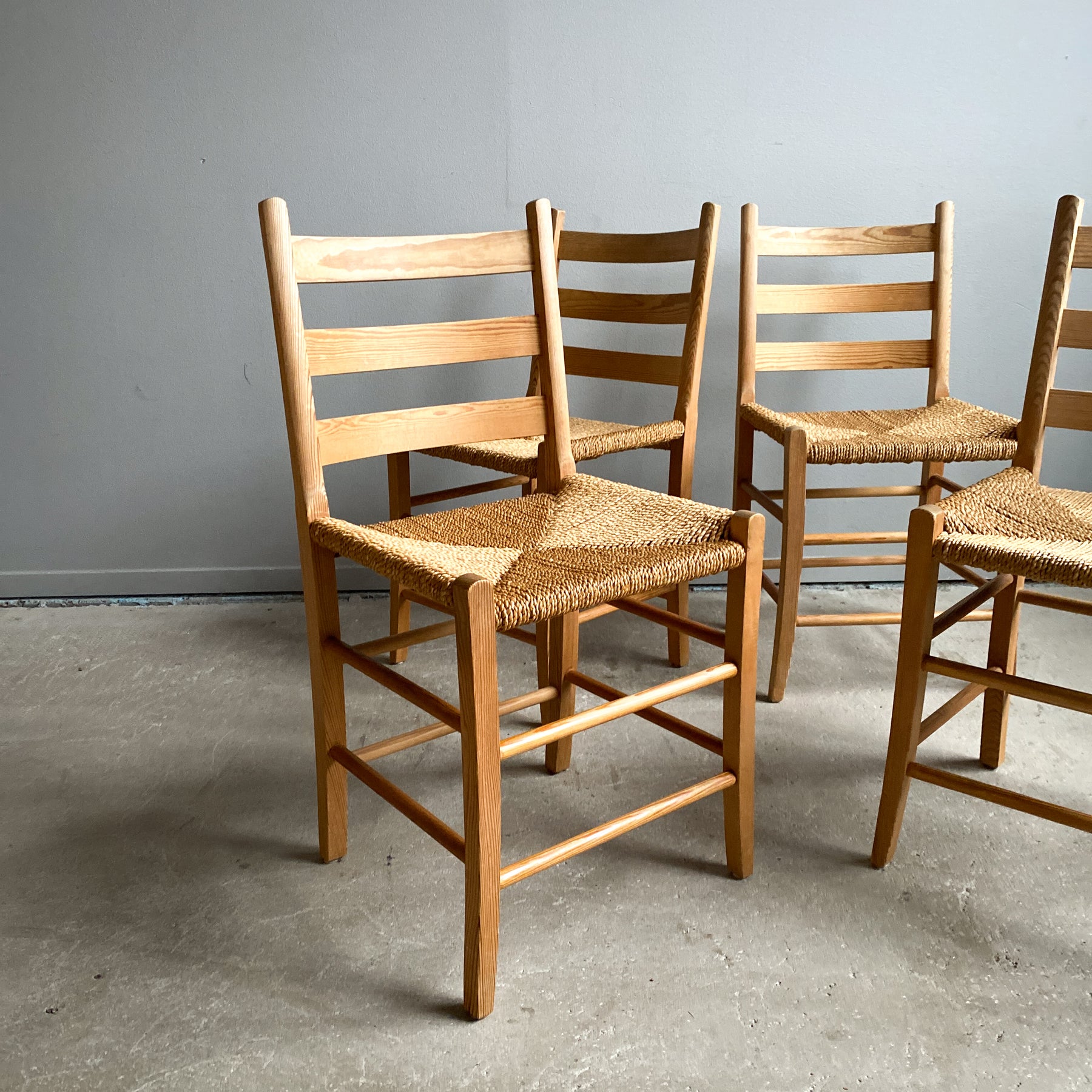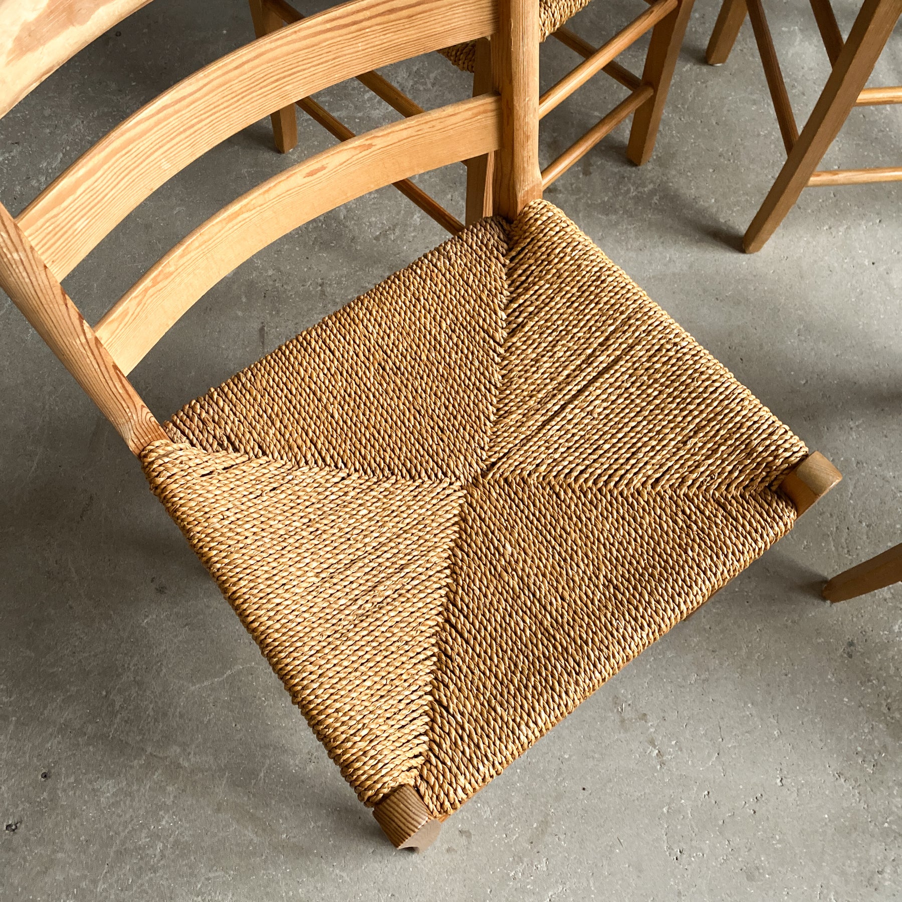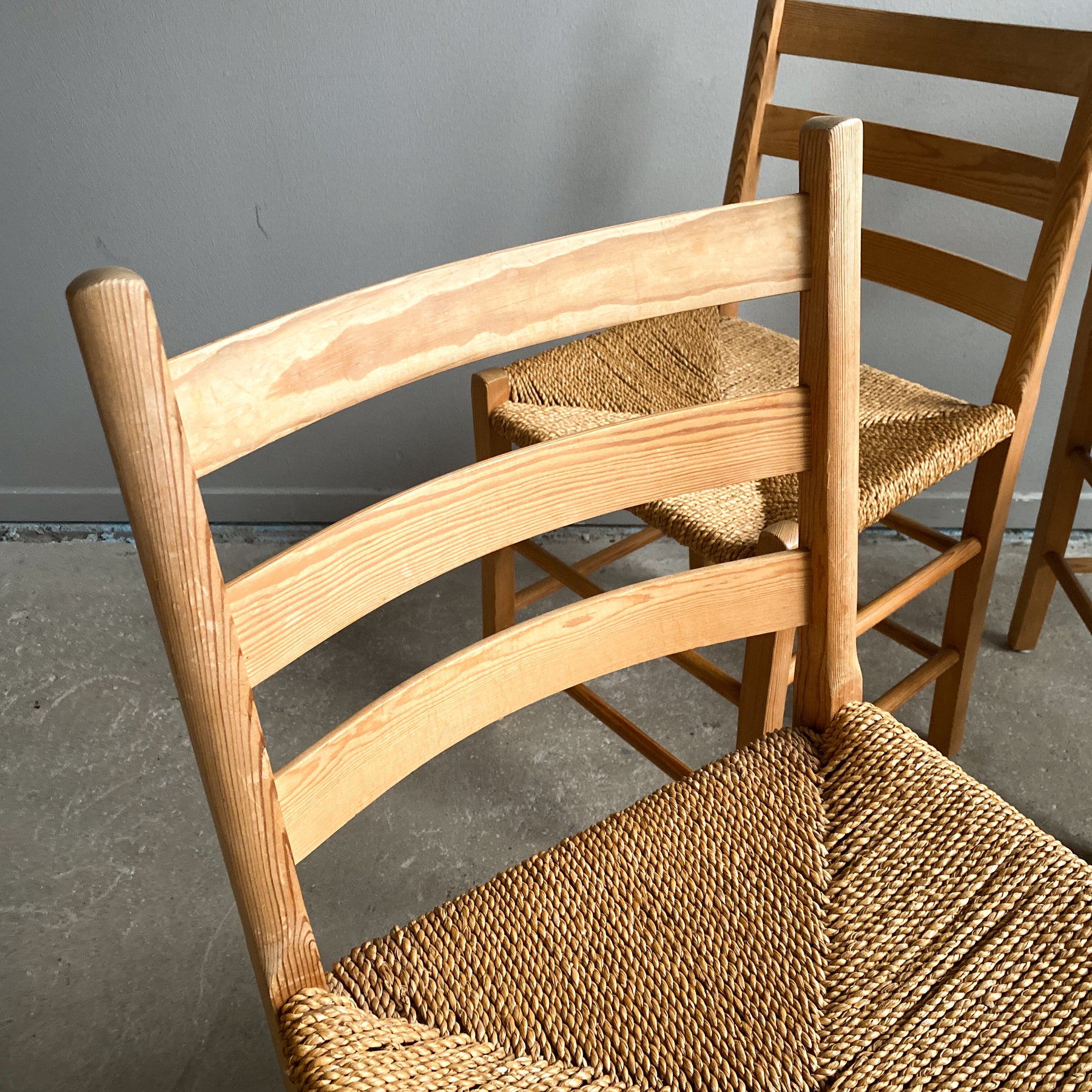 4 stolar i furu, Jærstolen Aksel, design Aksel L. Hansson 1938. Snörad sits i sjögräs.