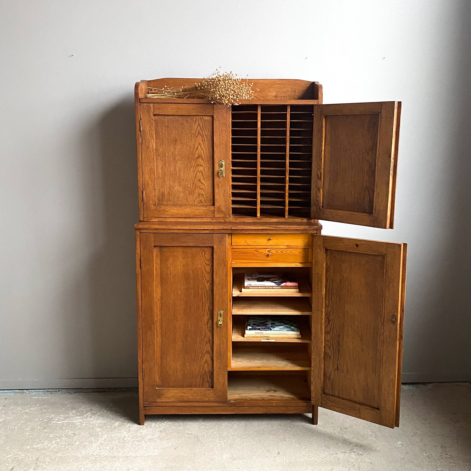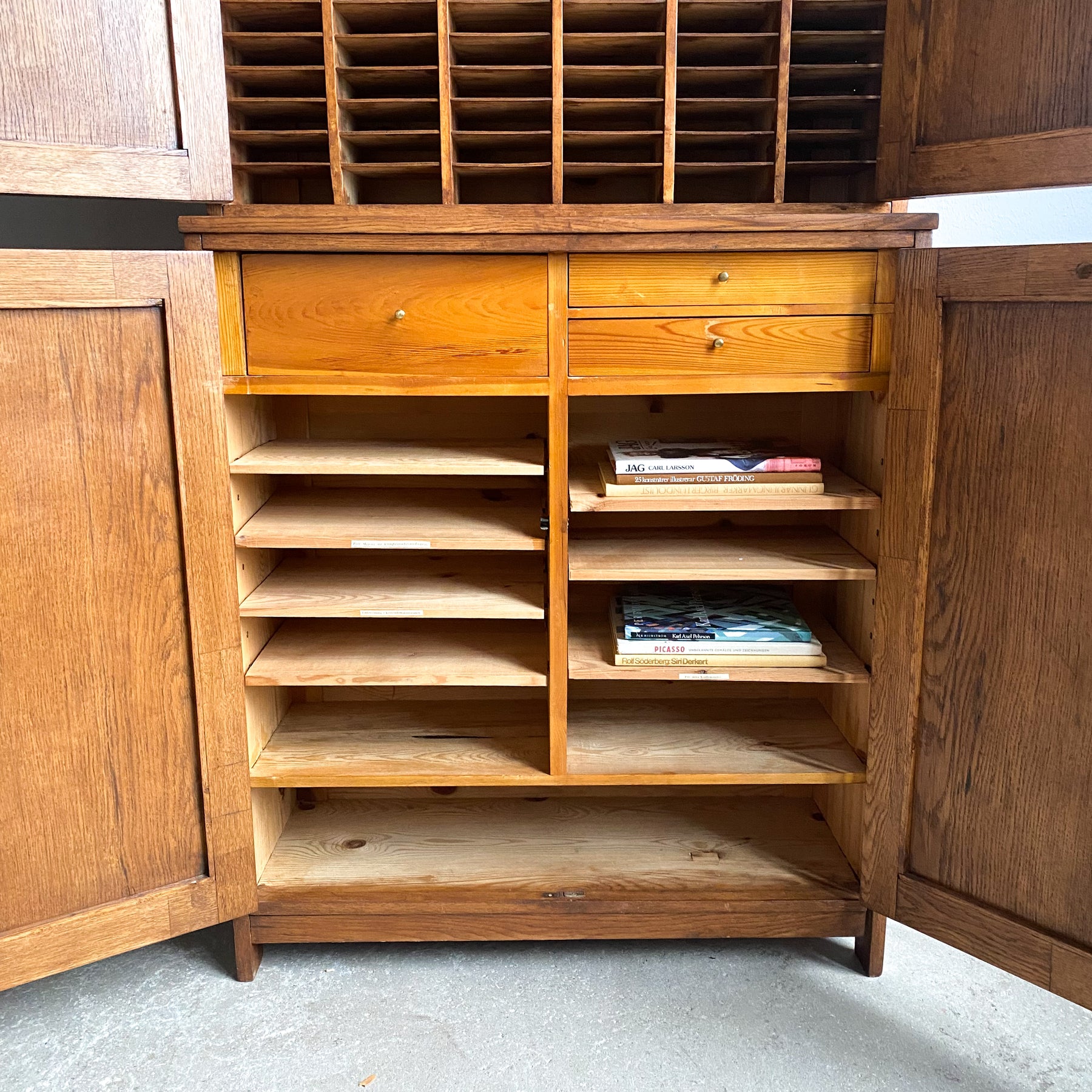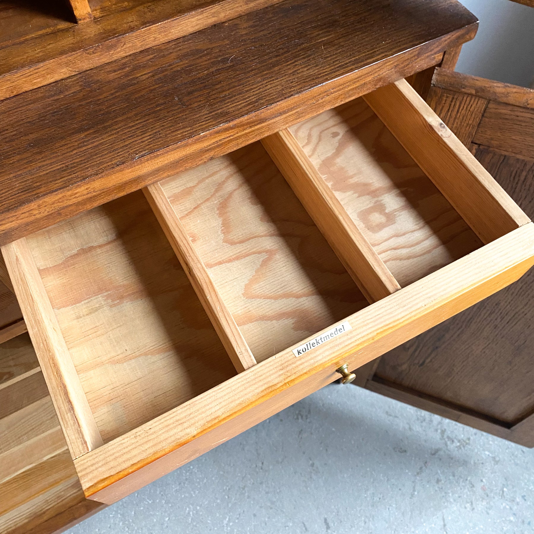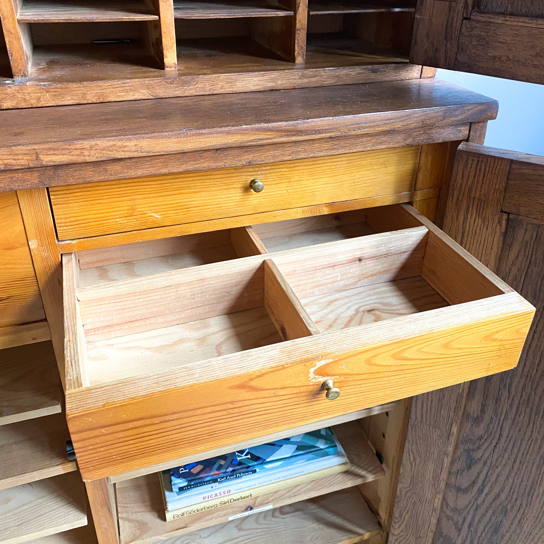 Fantastiskt arkivskåp i ek, tidigt 1900-tal i Jugendstil. Skåpet har stått på en prästgård och i översta skåpet låg alla predikningar för hela året på handskrivna lappar i varje fack. Nederdelen har 3 lådor med fack och flyttbara hyllplan. Skåpet är 2 delat.