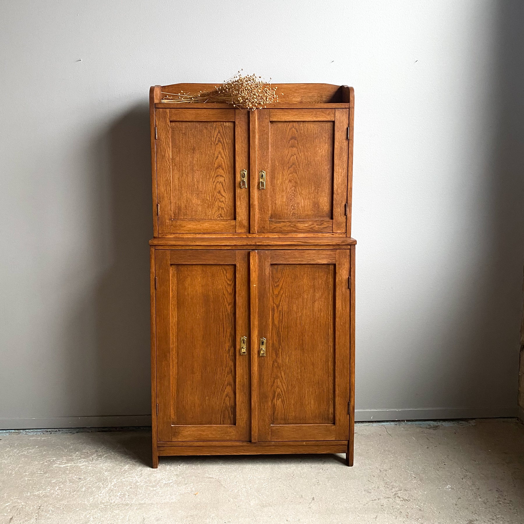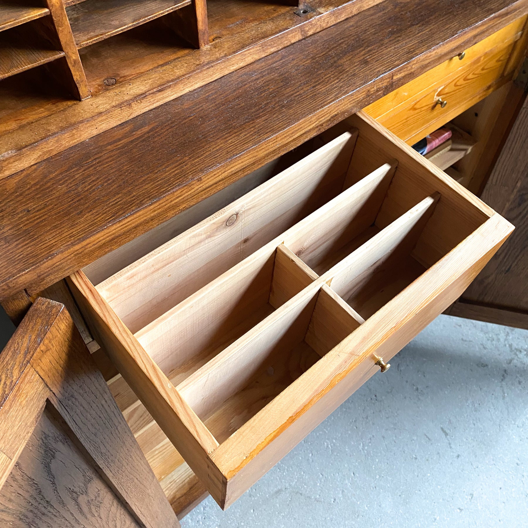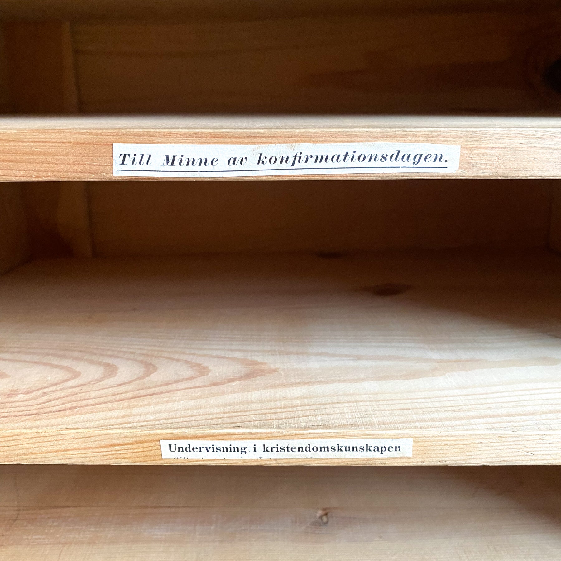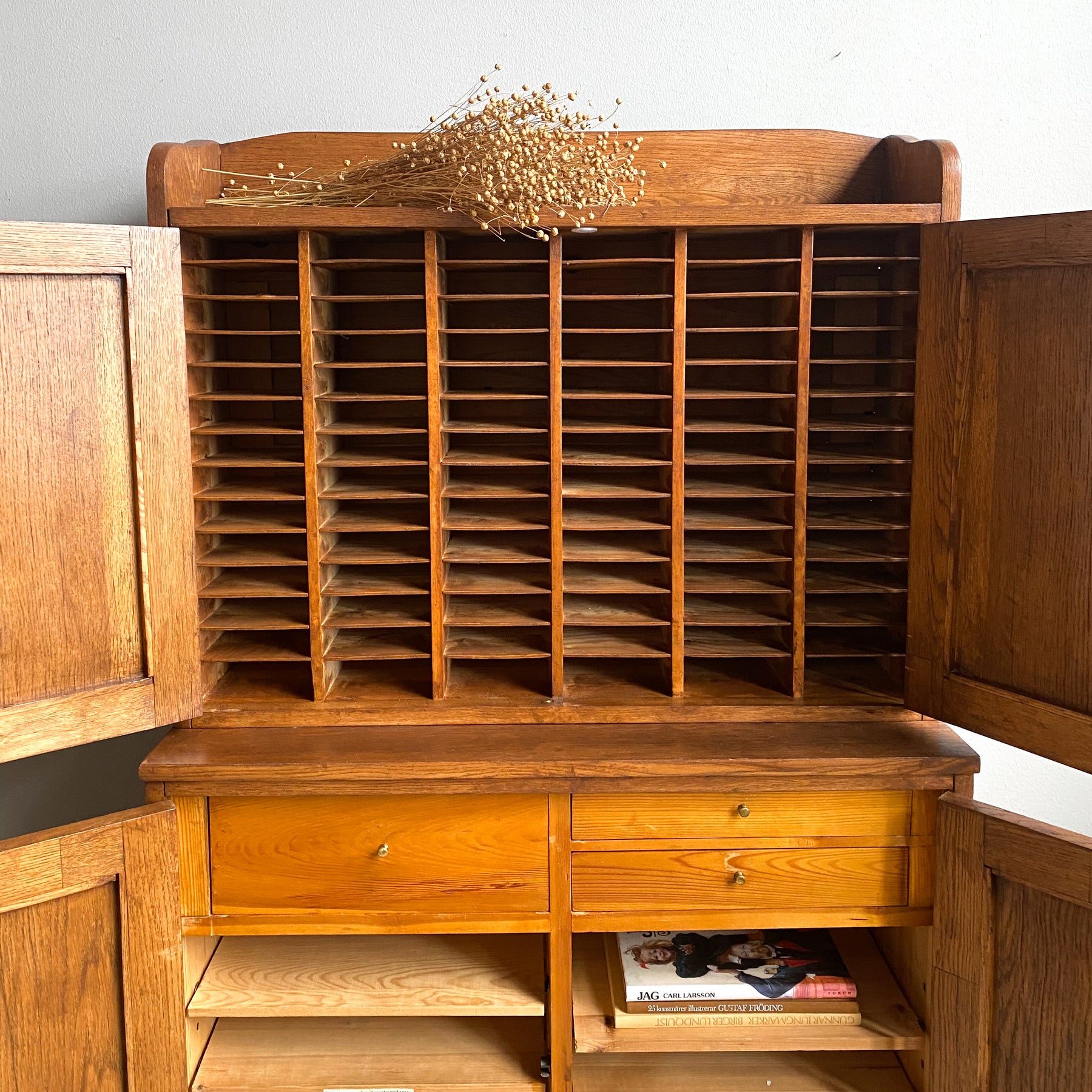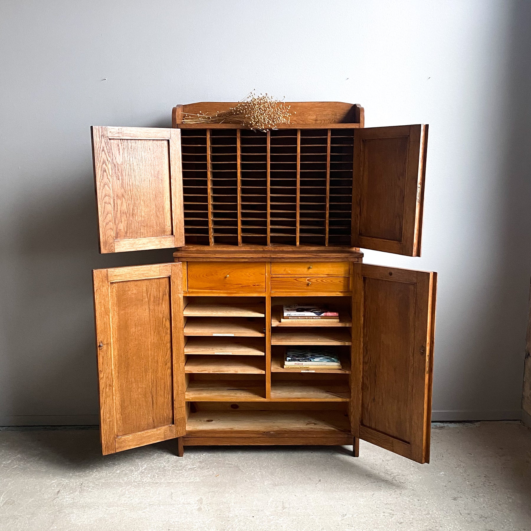 Fantastiskt arkivskåp i ek, tidigt 1900-tal i Jugendstil. Skåpet har stått på en prästgård och i översta skåpet låg alla predikningar för hela året på handskrivna lappar i varje fack. Nederdelen har 3 lådor med fack och flyttbara hyllplan. Skåpet är 2 delat.