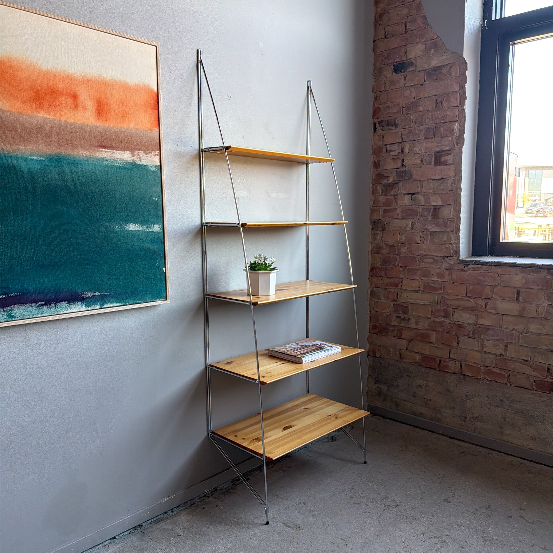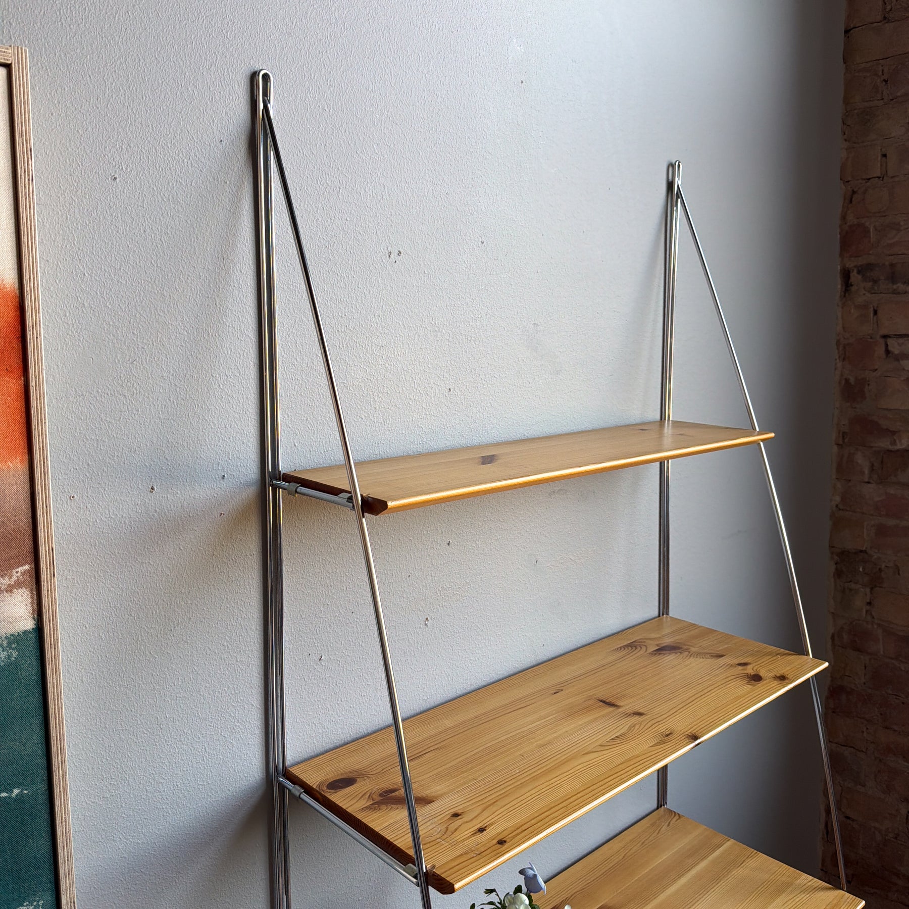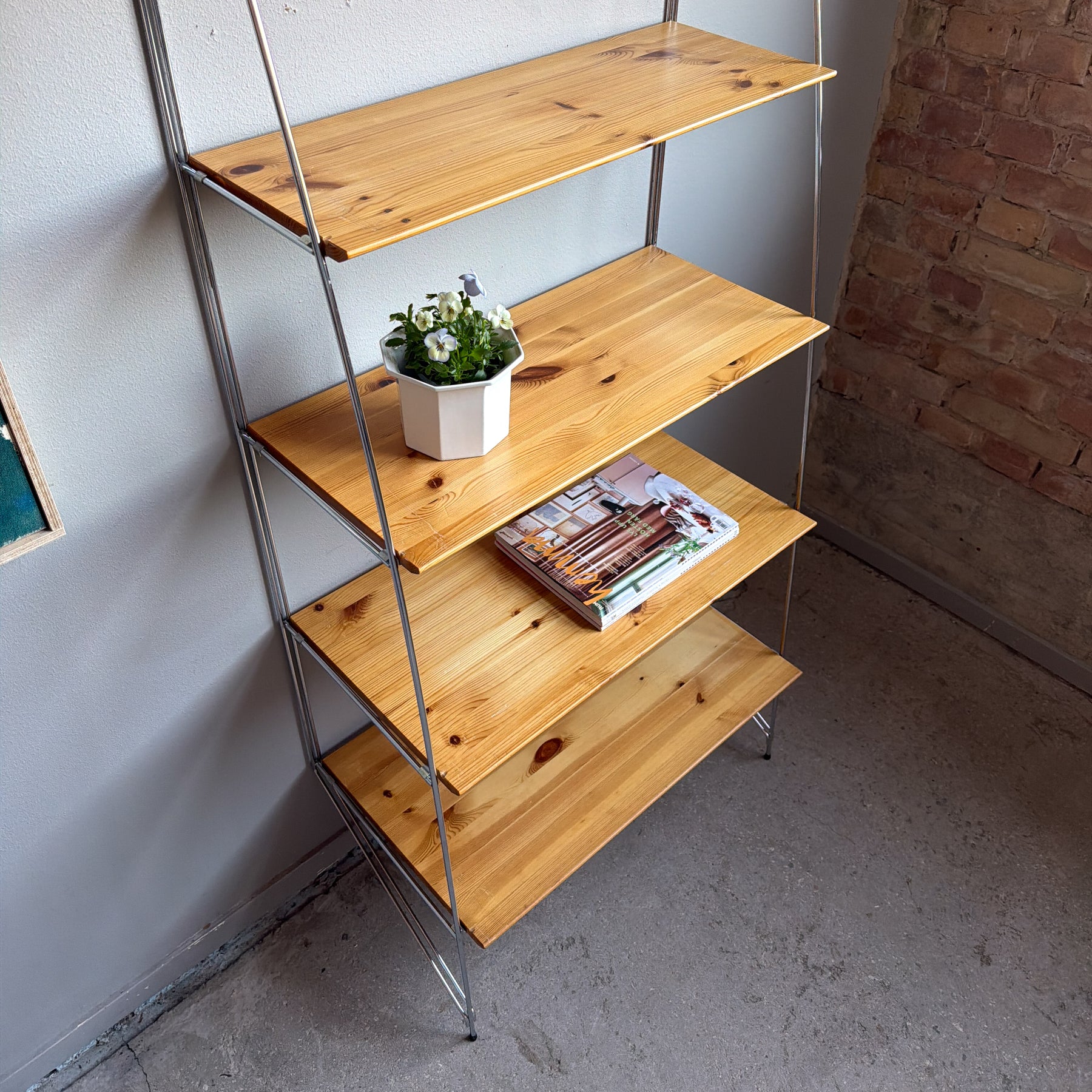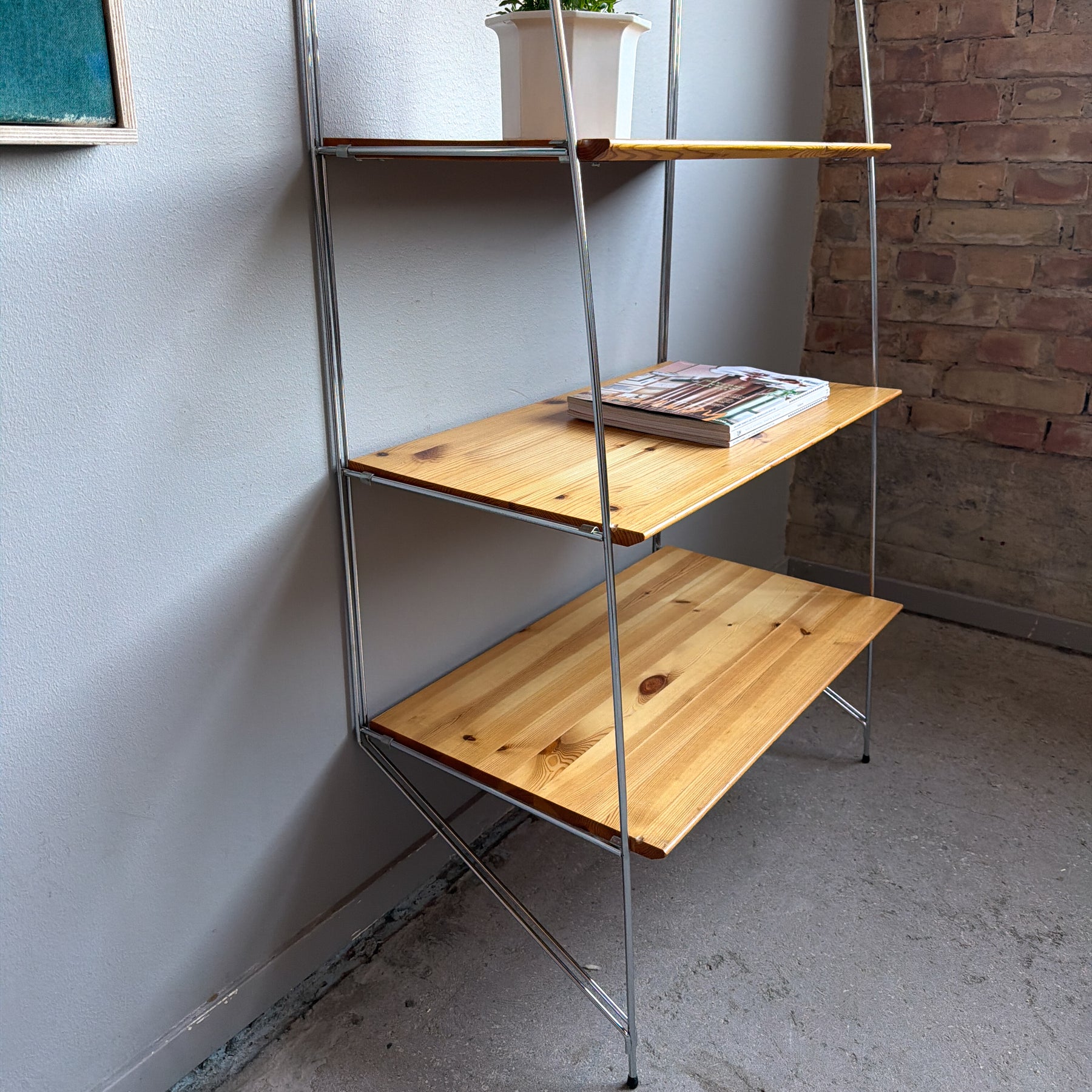 Hylla ”Artist” i design av Tord Björklund för IKEA tidigt 90-tal. Två gavlar i förkromad metall och fem hyllplan i furu. Fästs i väggen och står på golvet med två punkter.