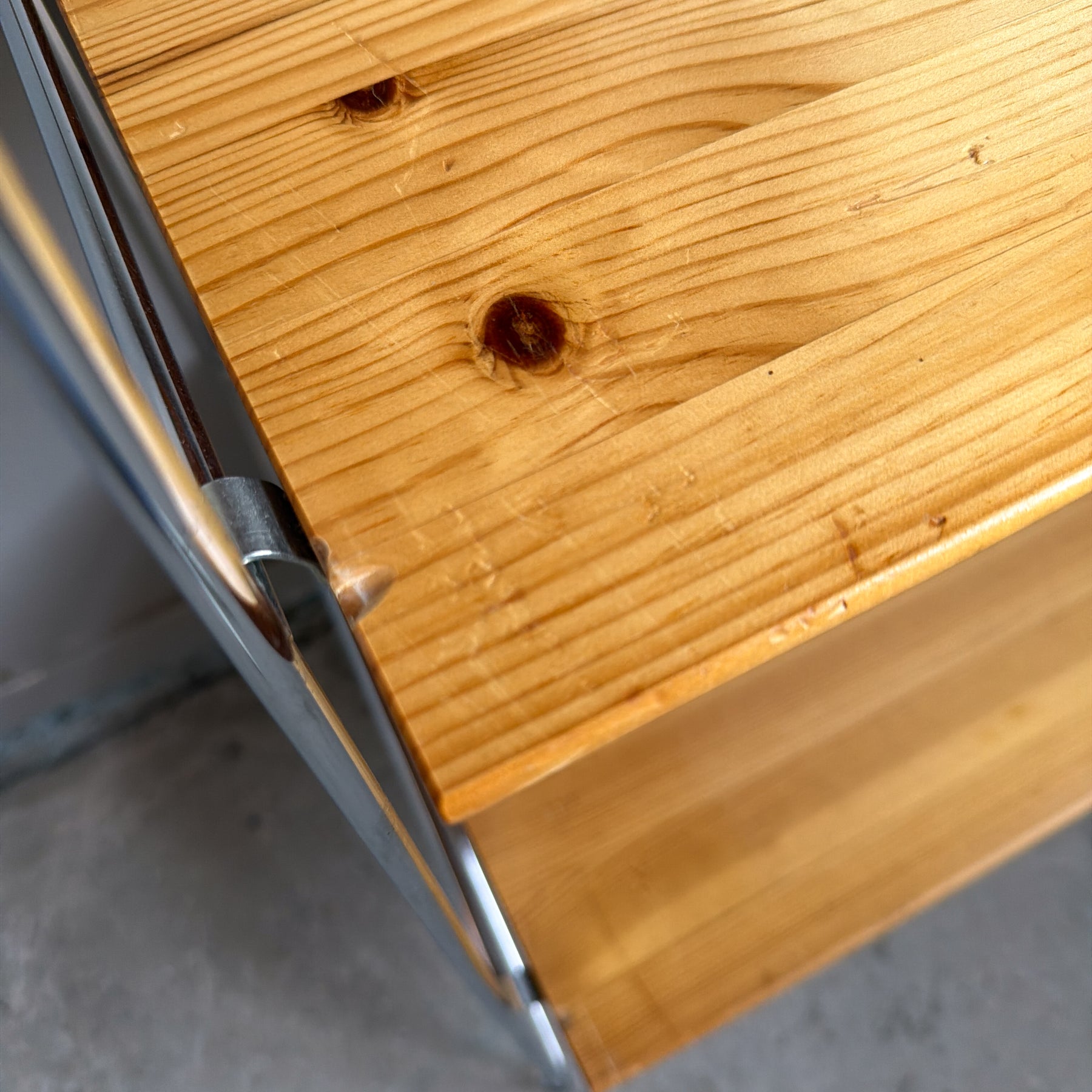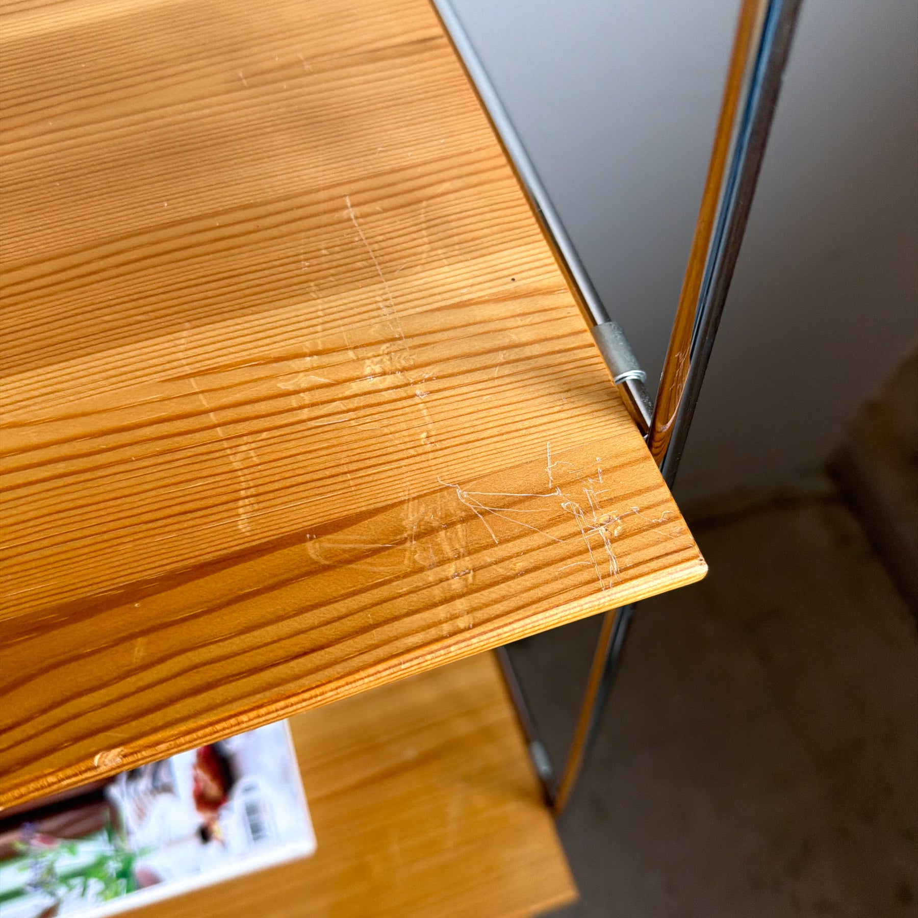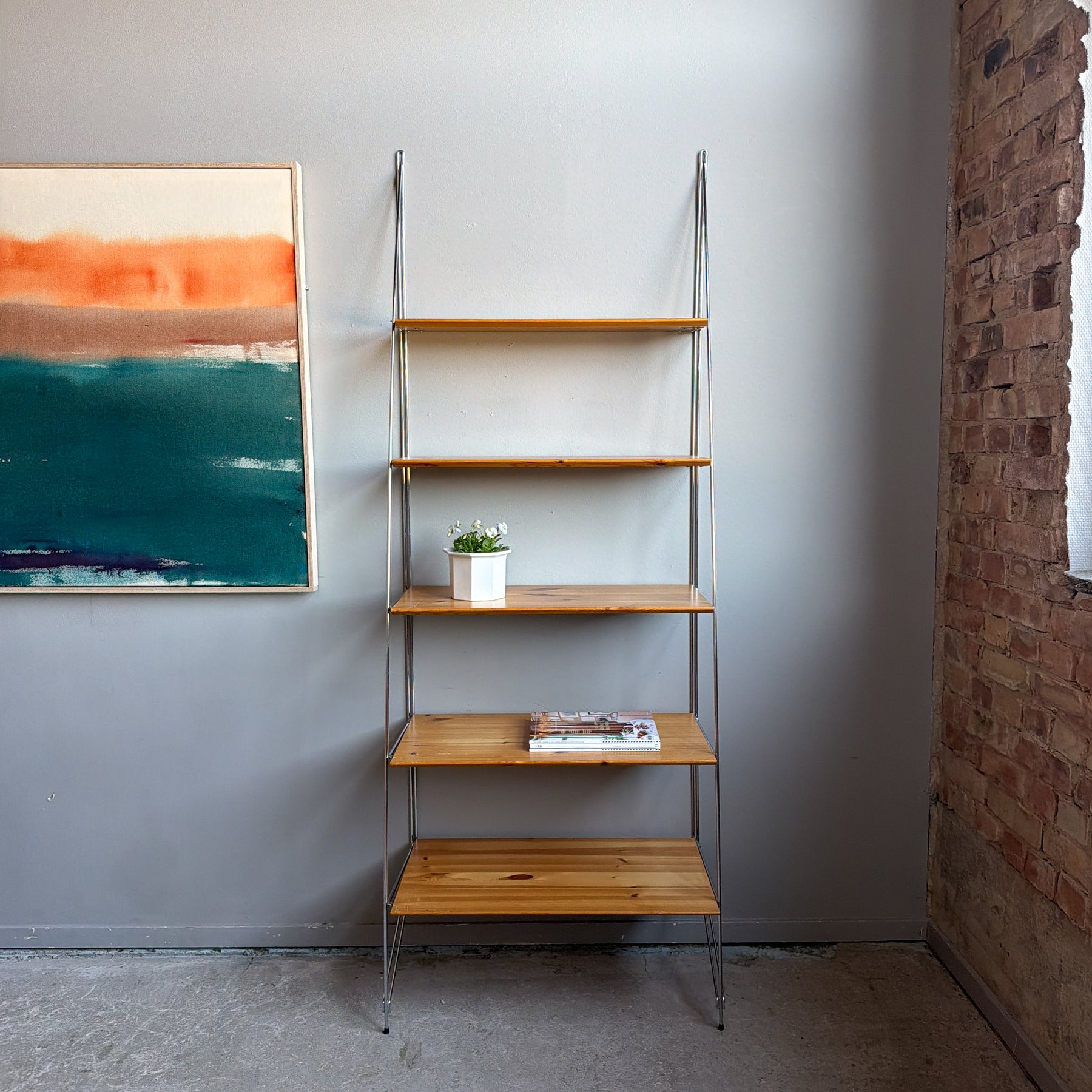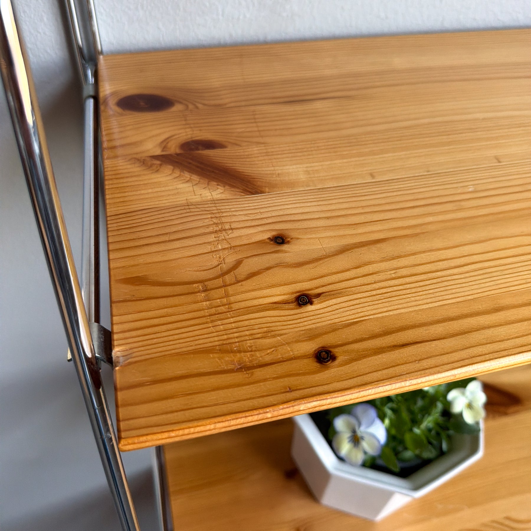 Hylla ”Artist” i design av Tord Björklund för IKEA tidigt 90-tal. Två gavlar i förkromad metall och fem hyllplan i furu. Fästs i väggen och står på golvet med två punkter.