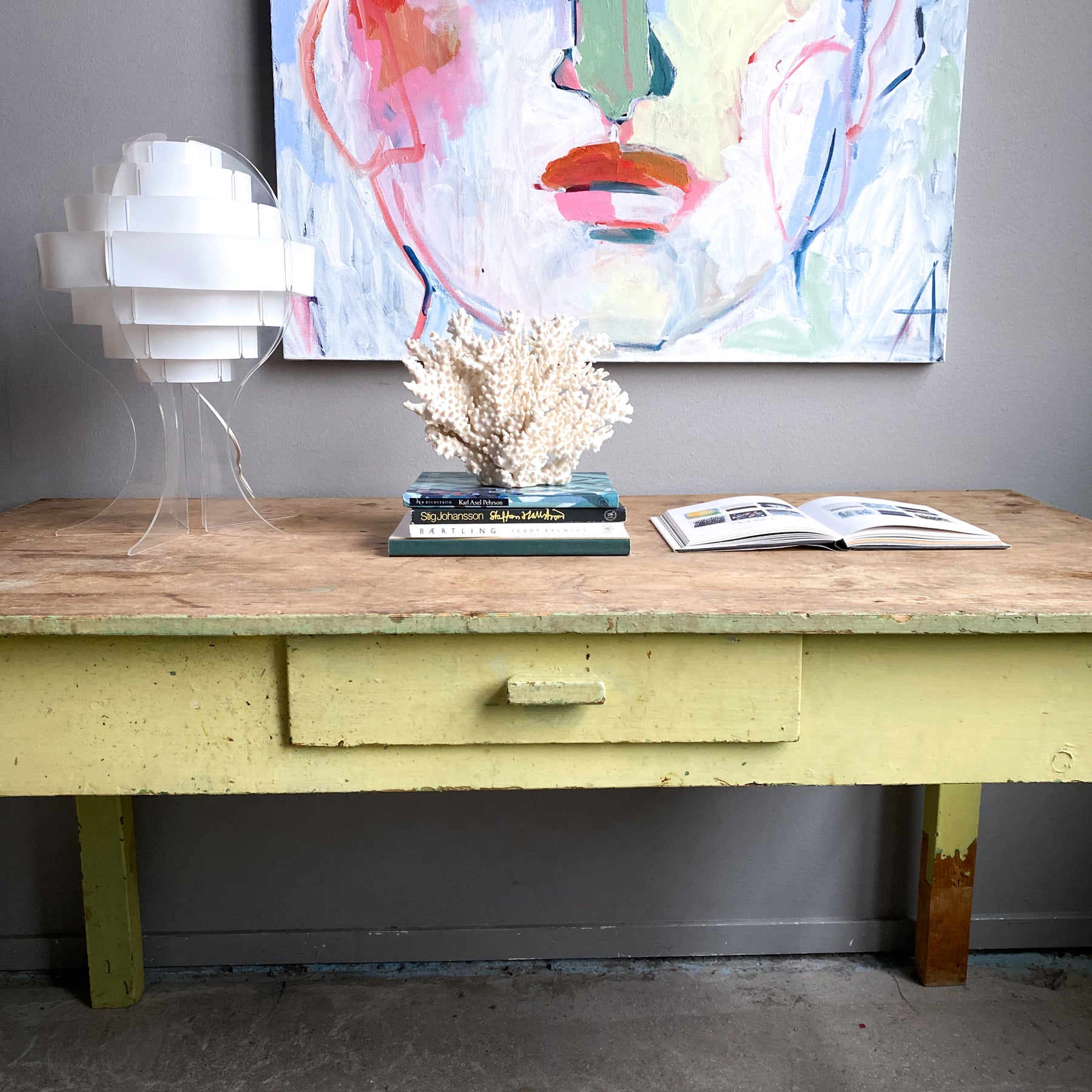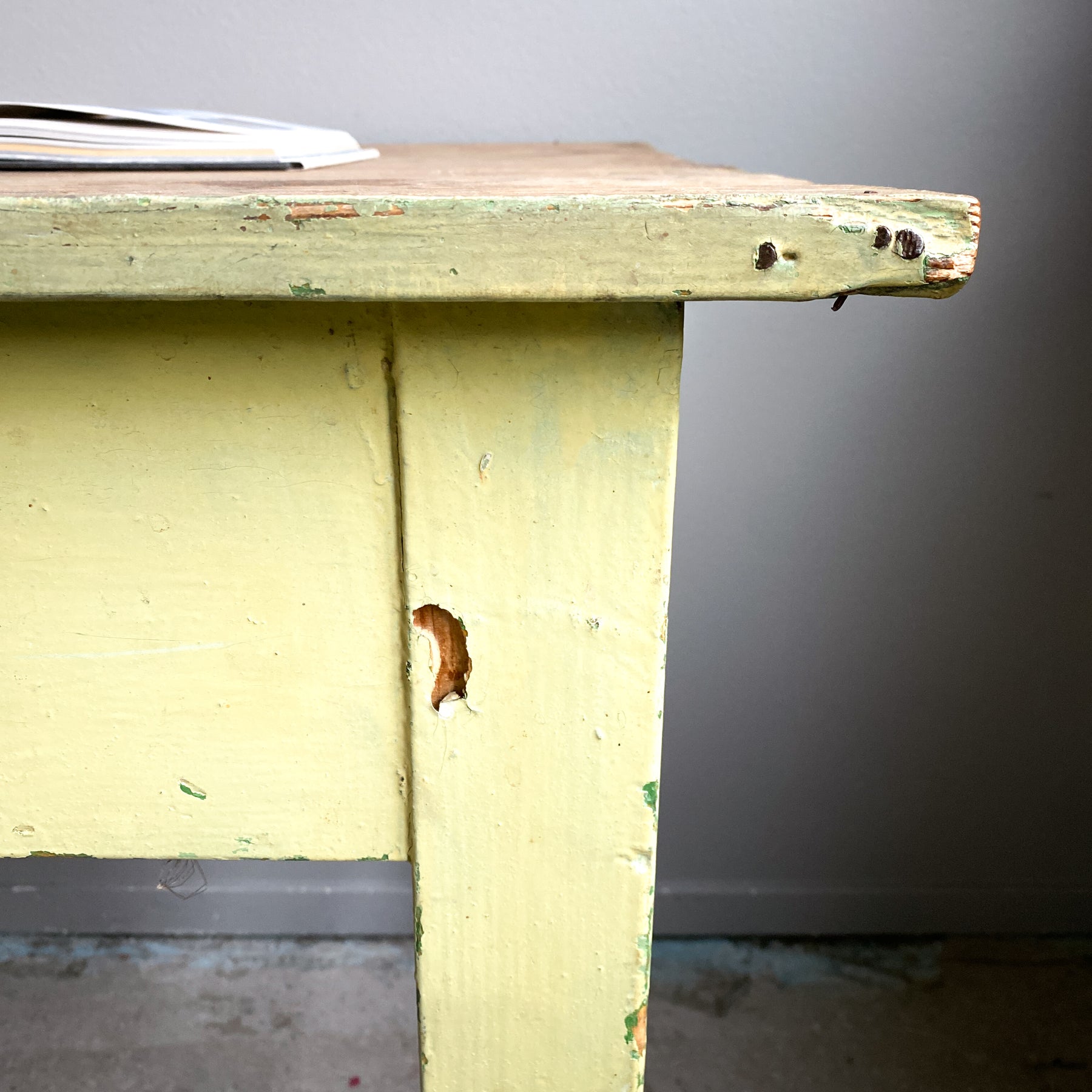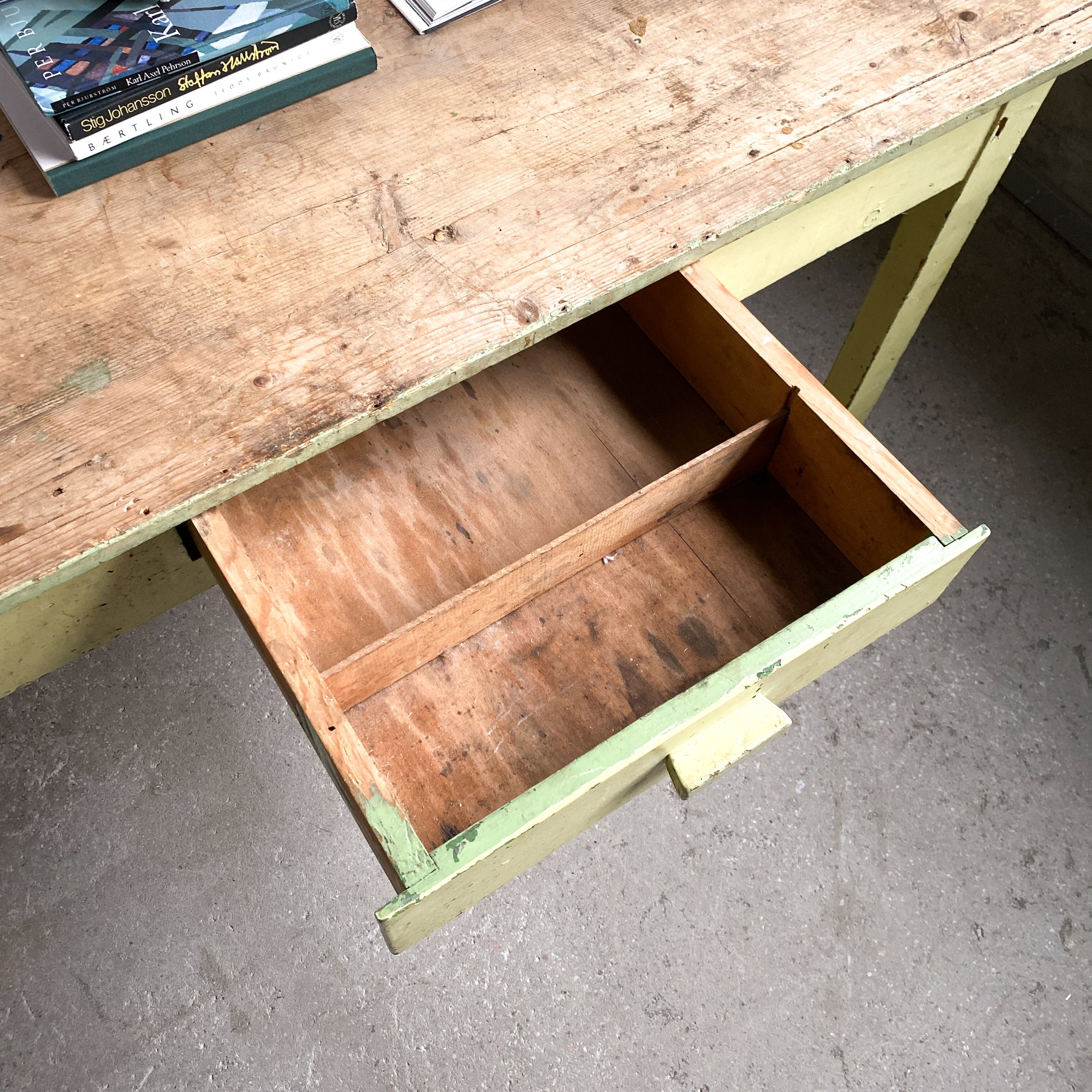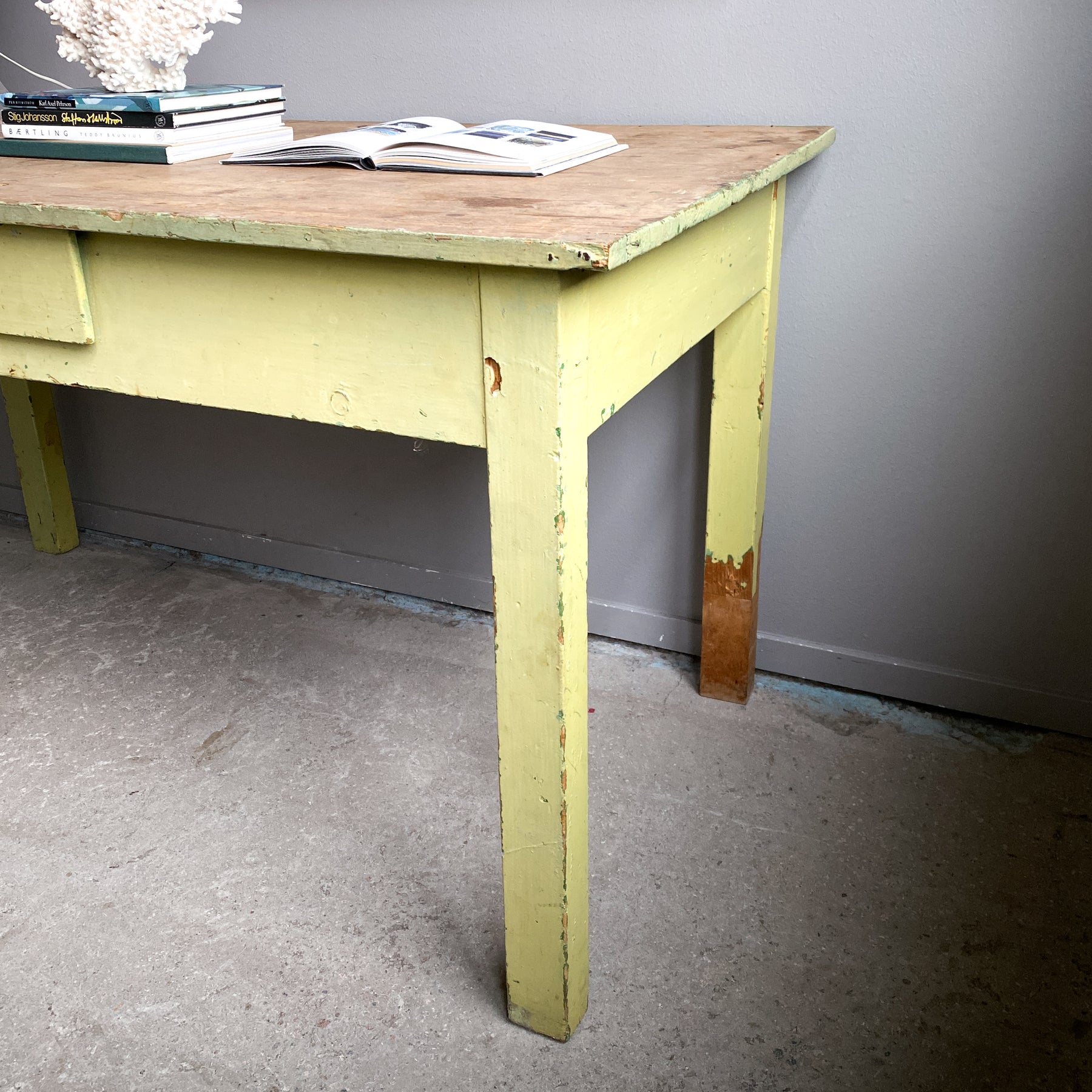 Avlastningsbord eller sidobord, allmoge 1800-tal. Ljusgrönmålad benställning. Låda framtill.