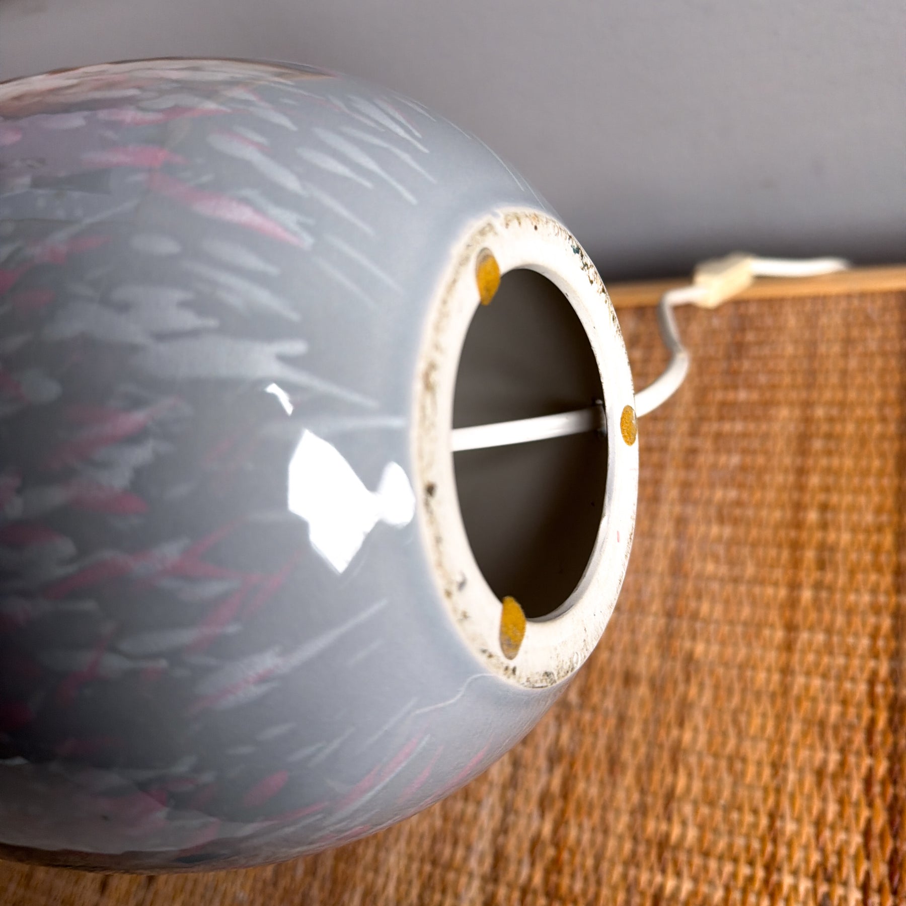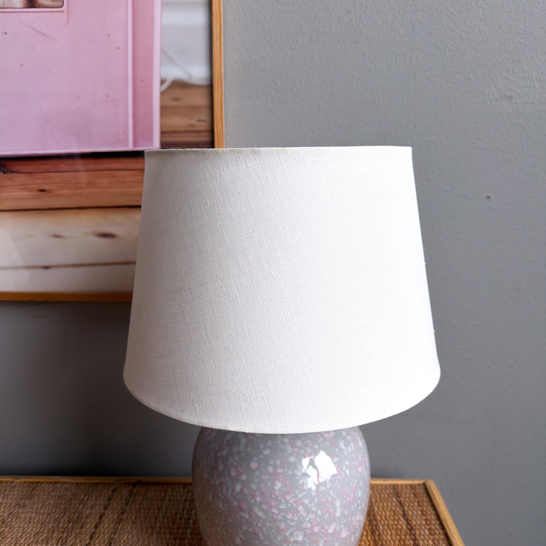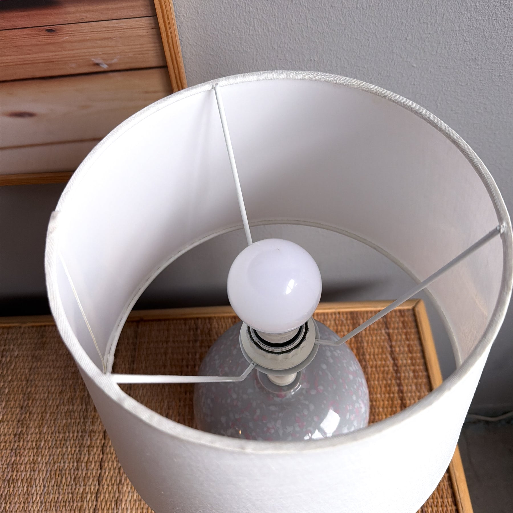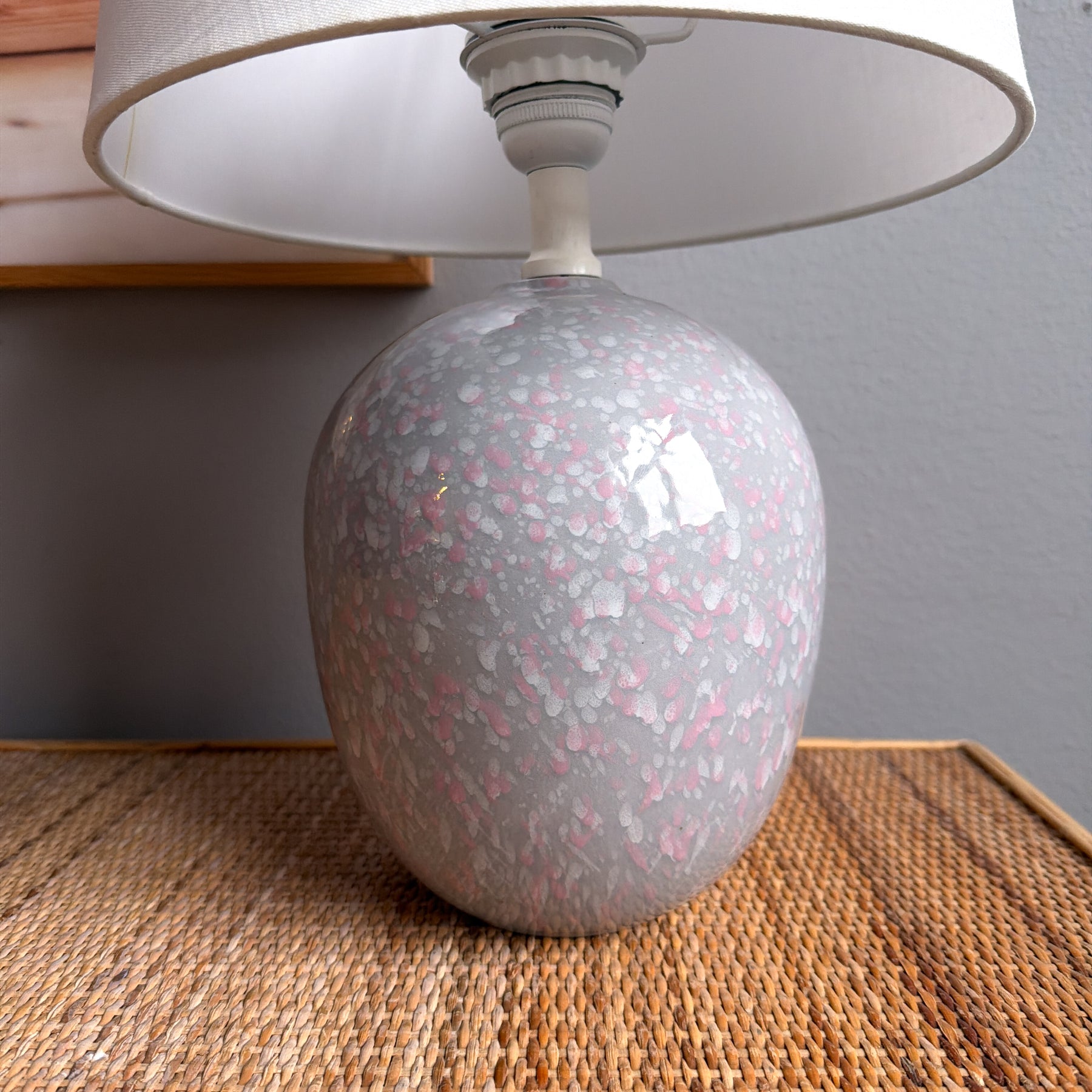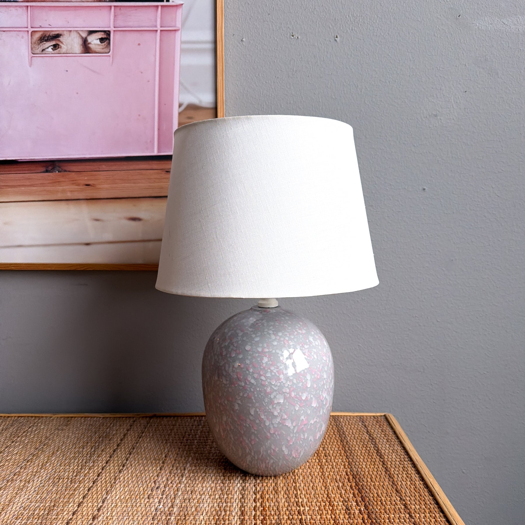 Lampa med grå och rosa spräcklig keramik fot och vit skärm.