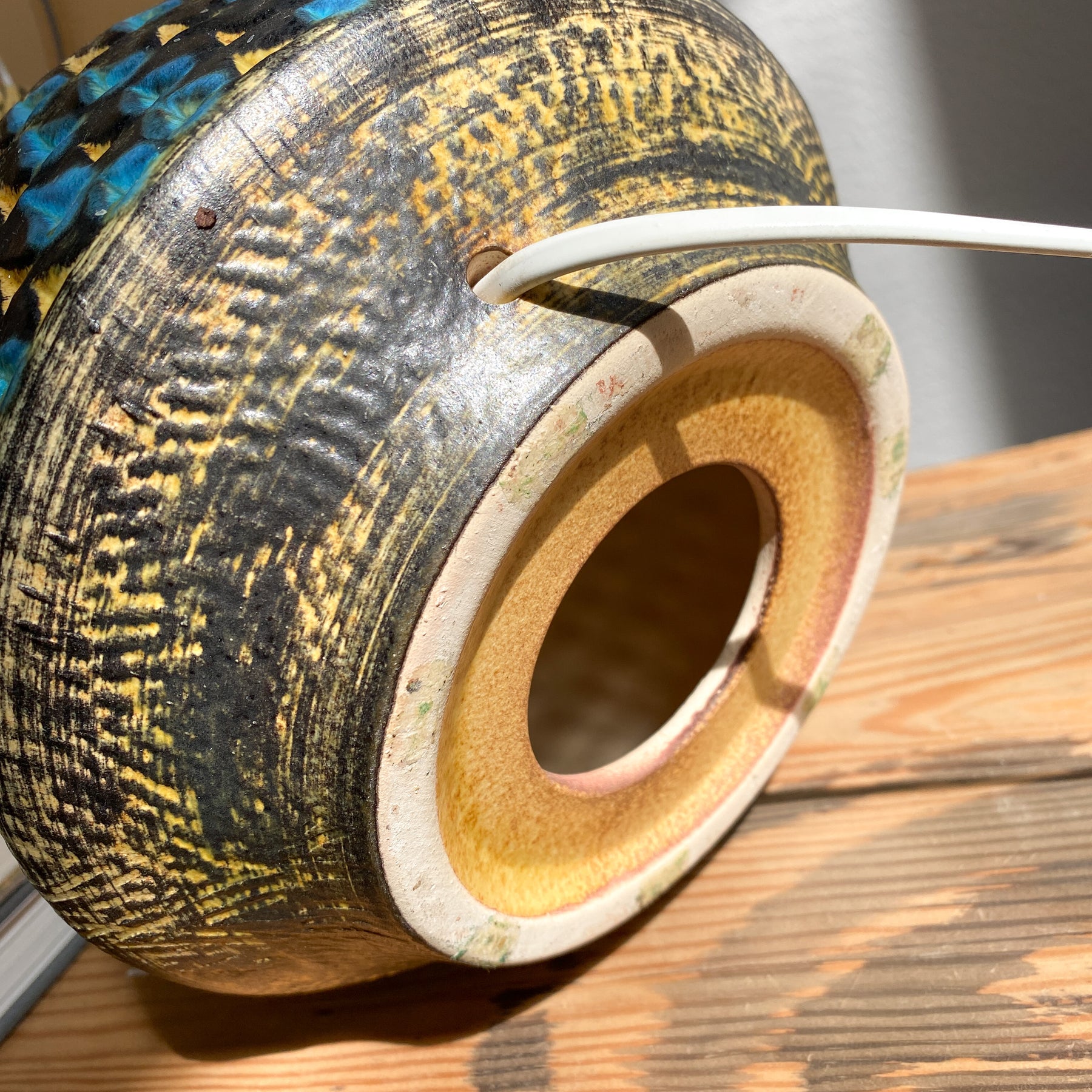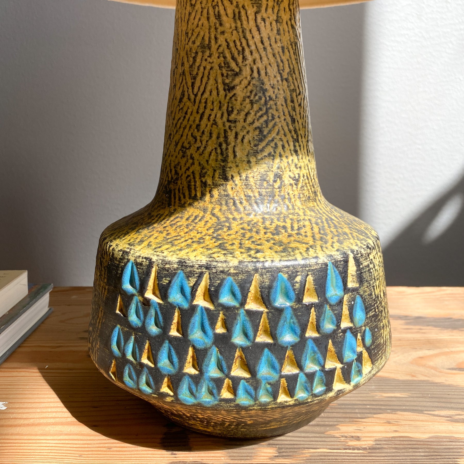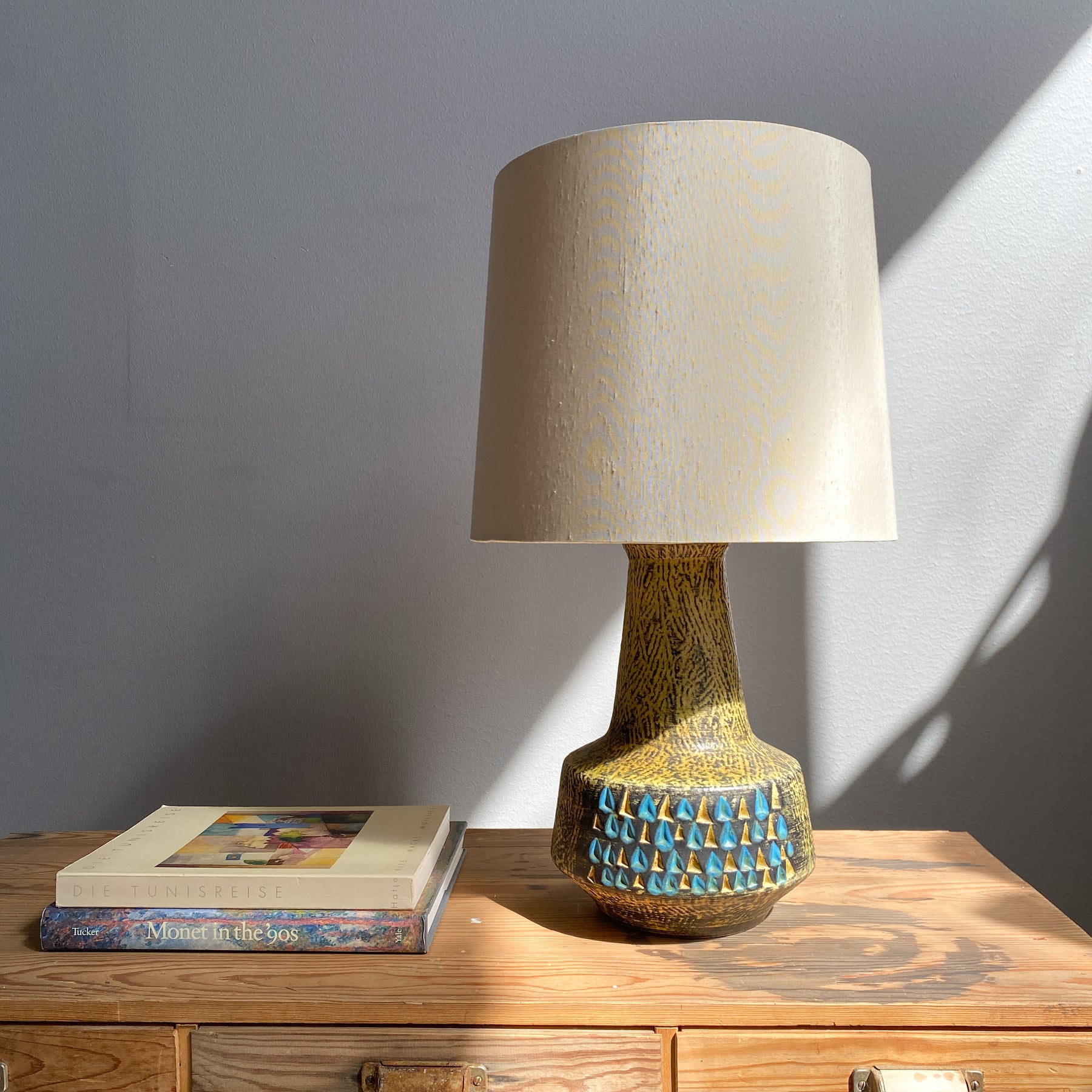 Bordslampa med keramikfot, troligtvis Dumler & Breiden Tyskland 60/70-tal. Original skärm i beige siden med topplock. Ny vit sladd med platt eurokontakt. E 27 glödlampa.