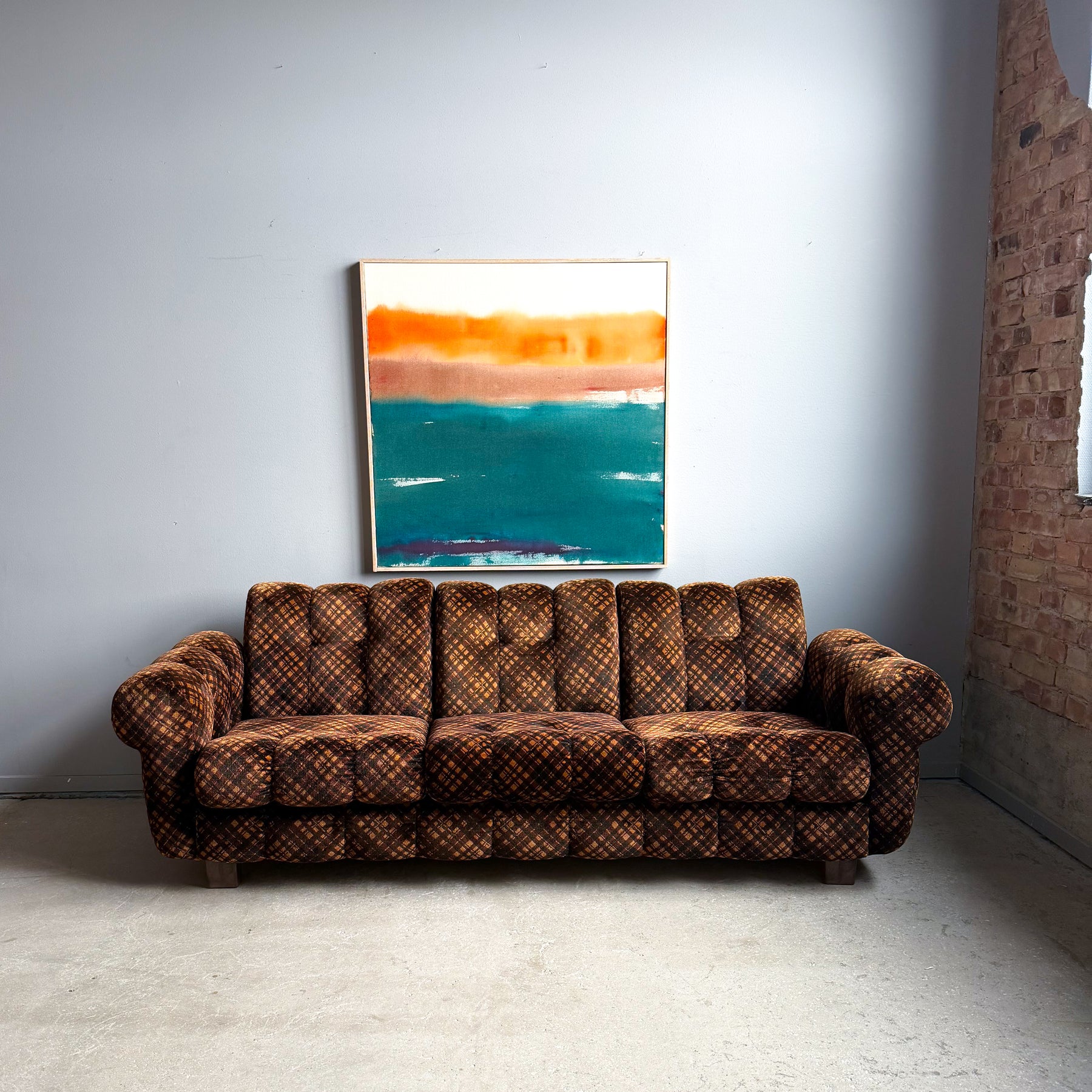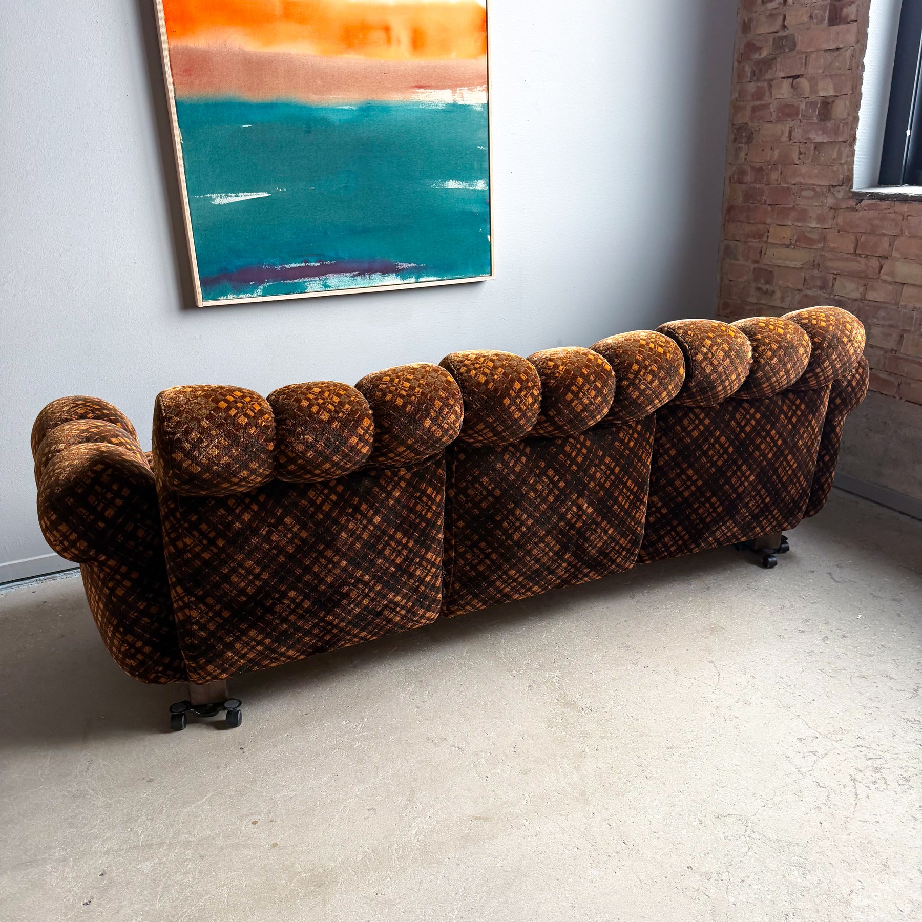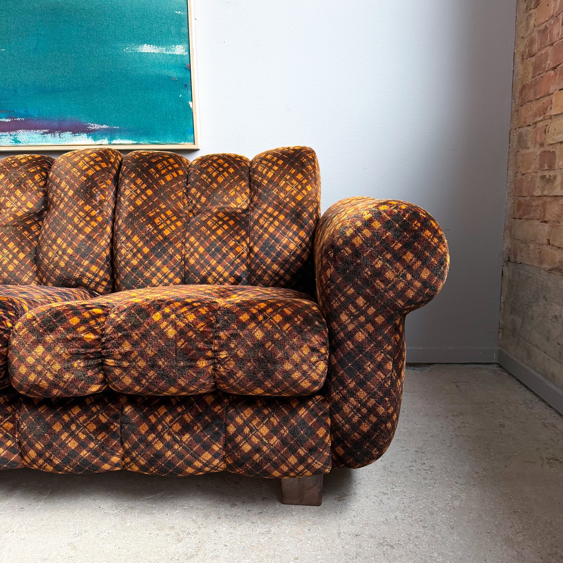 Rutig soffa i plysch 70-tal. Underbar och bullig modell. Fötter i brun plast. Märkt undertill ”Humlan”.