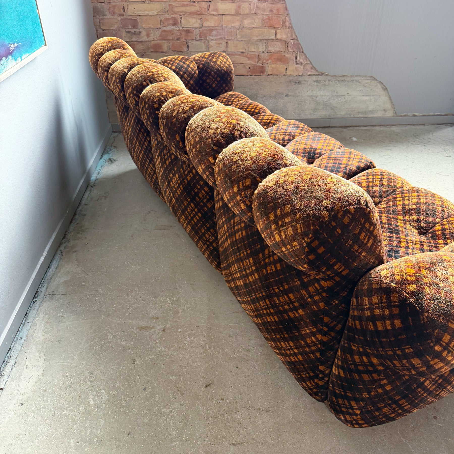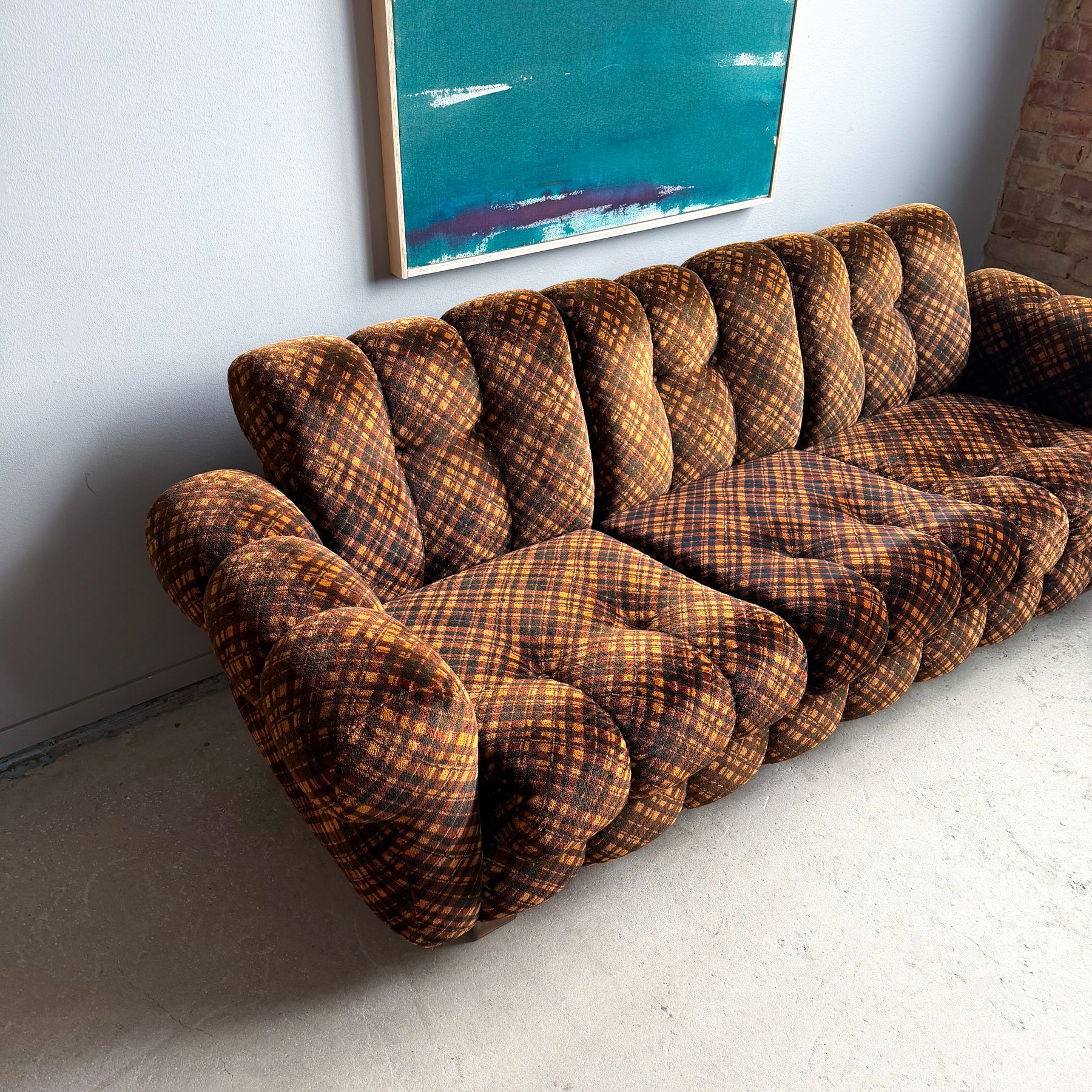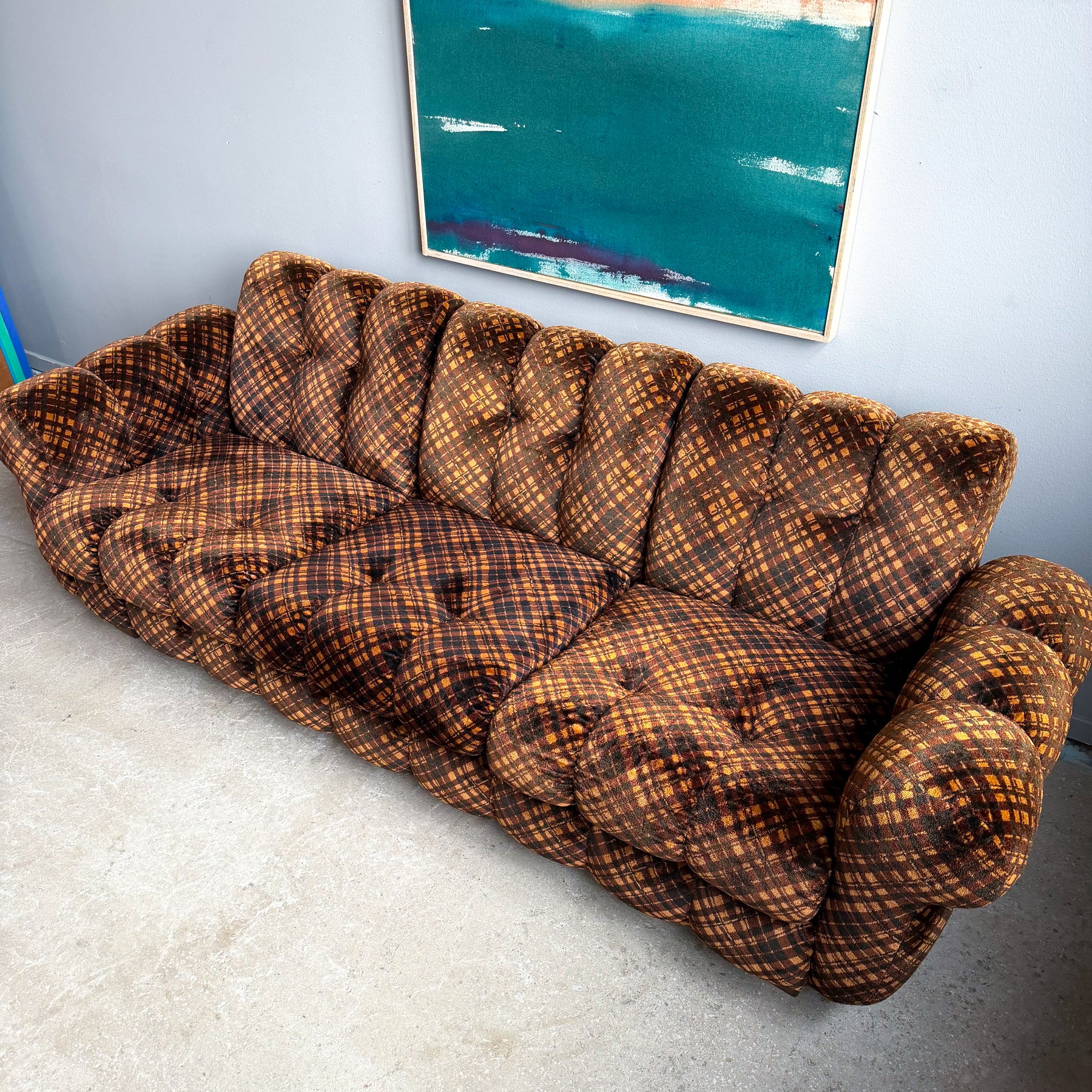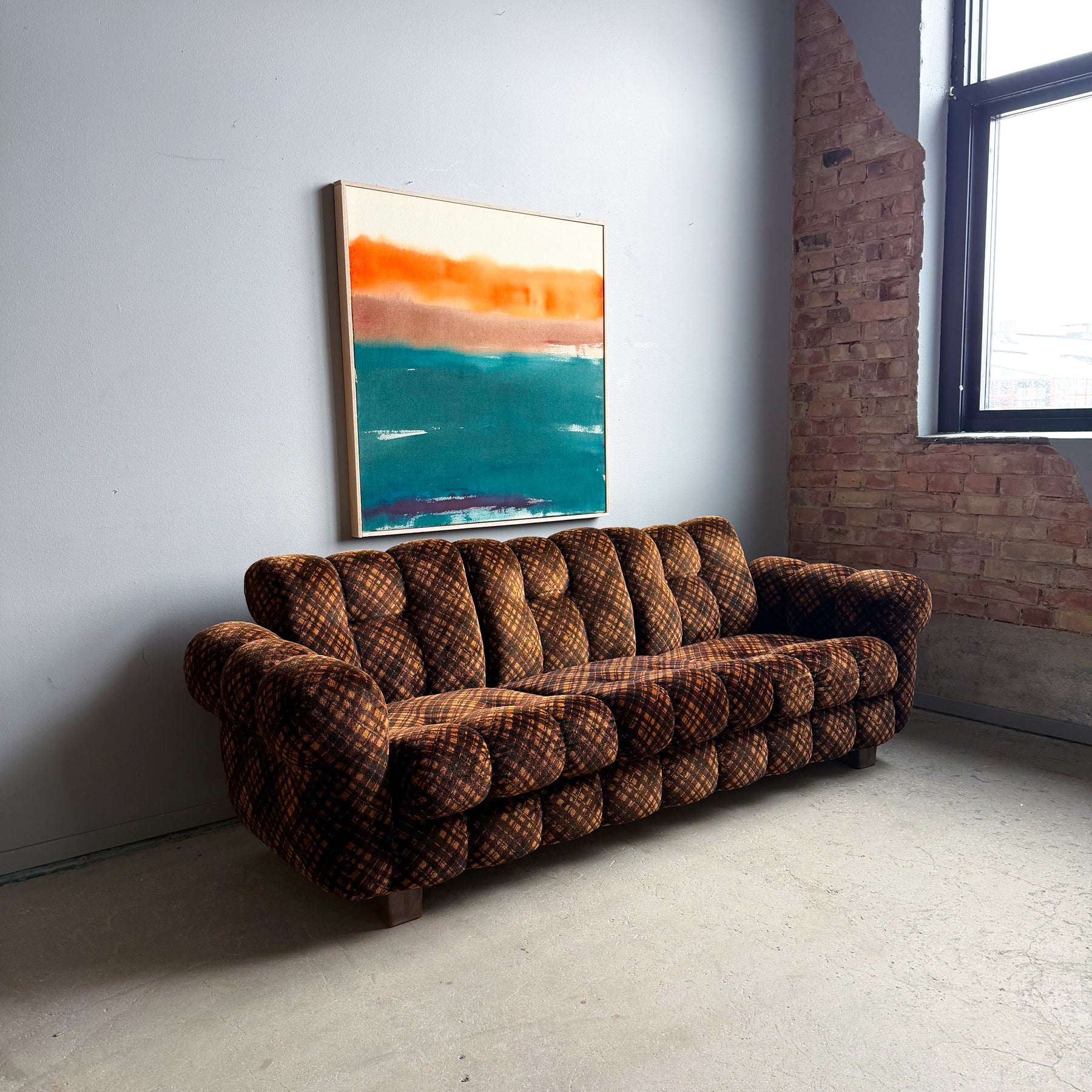 Rutig soffa i plysch 70-tal. Underbar och bullig modell. Fötter i brun plast. Märkt undertill ”Humlan”.