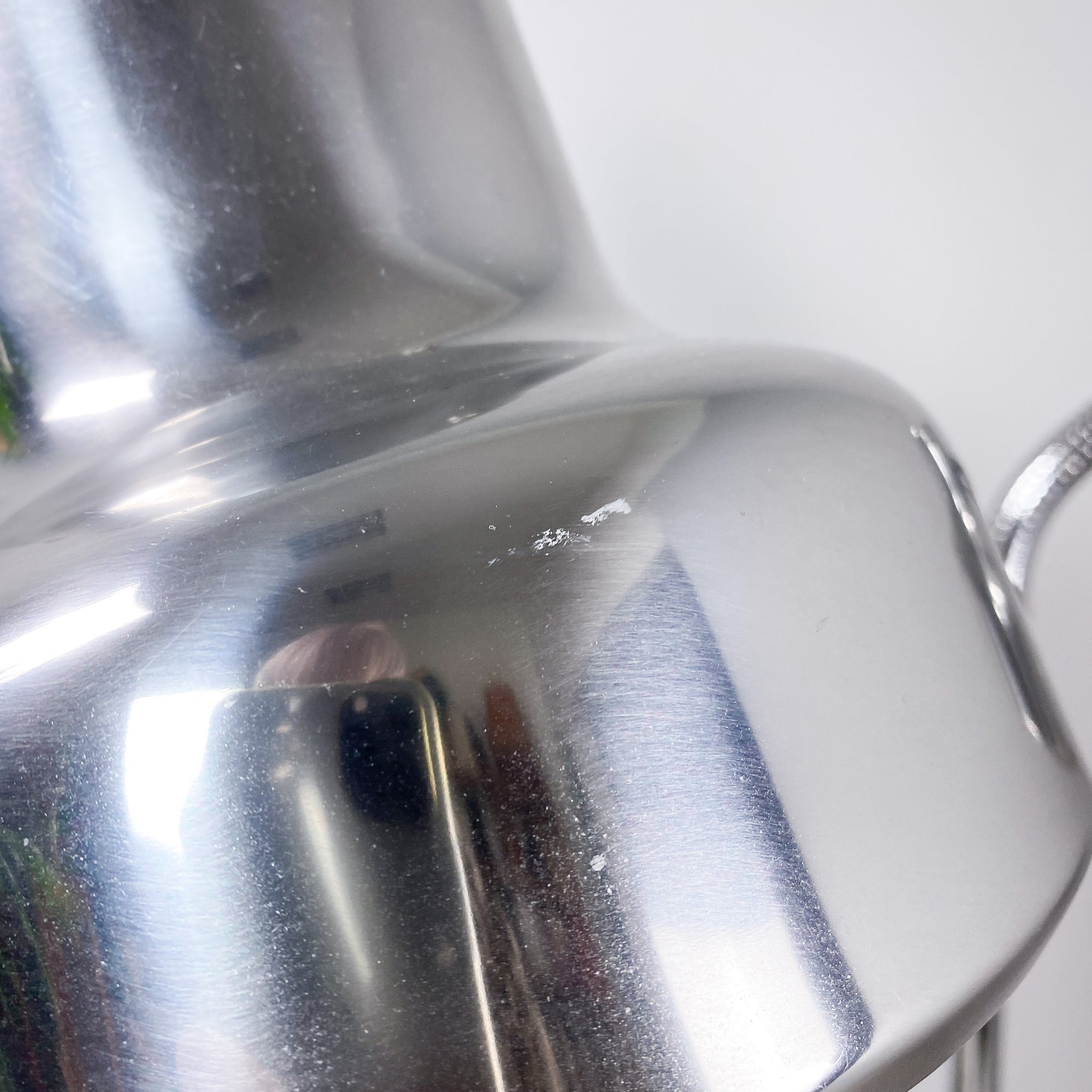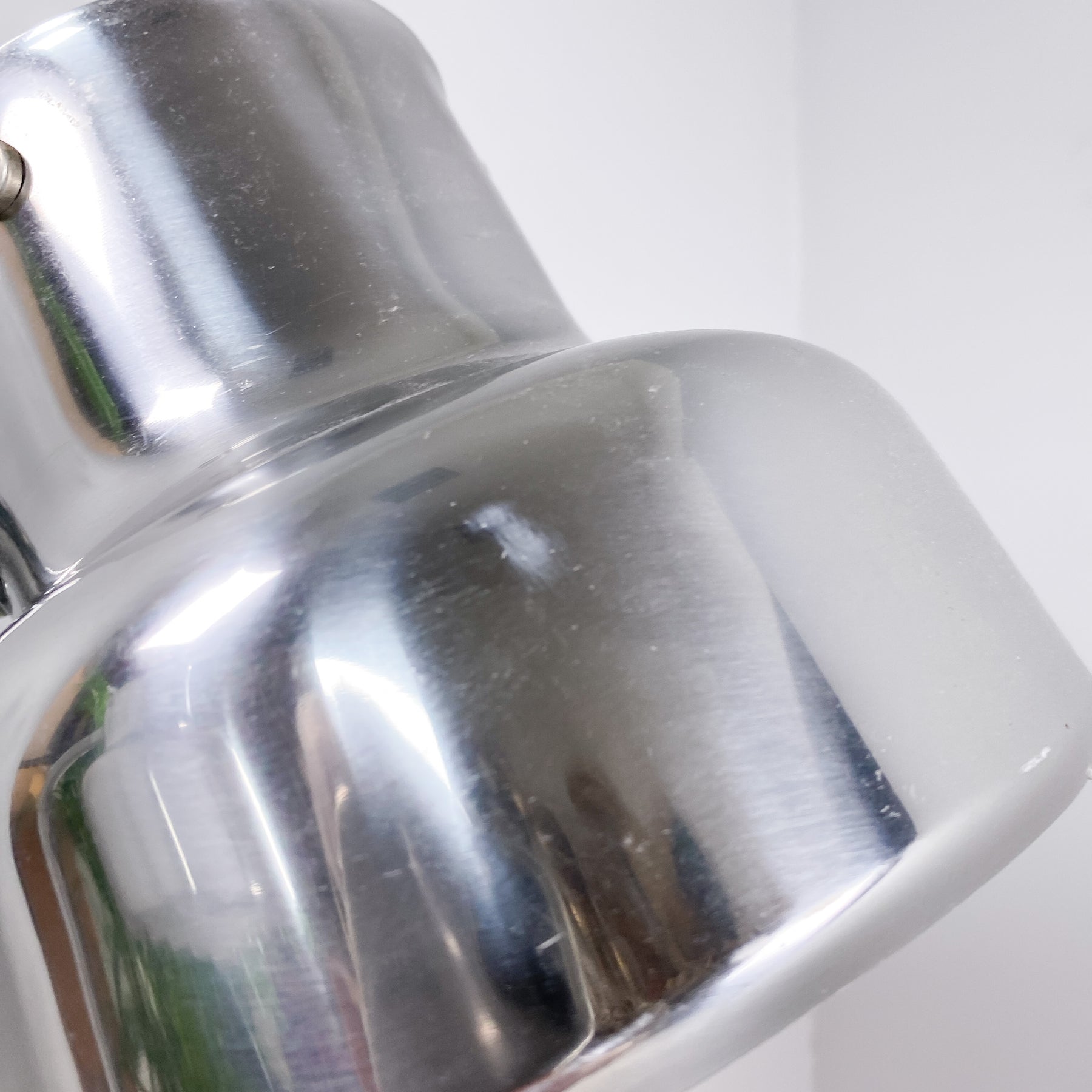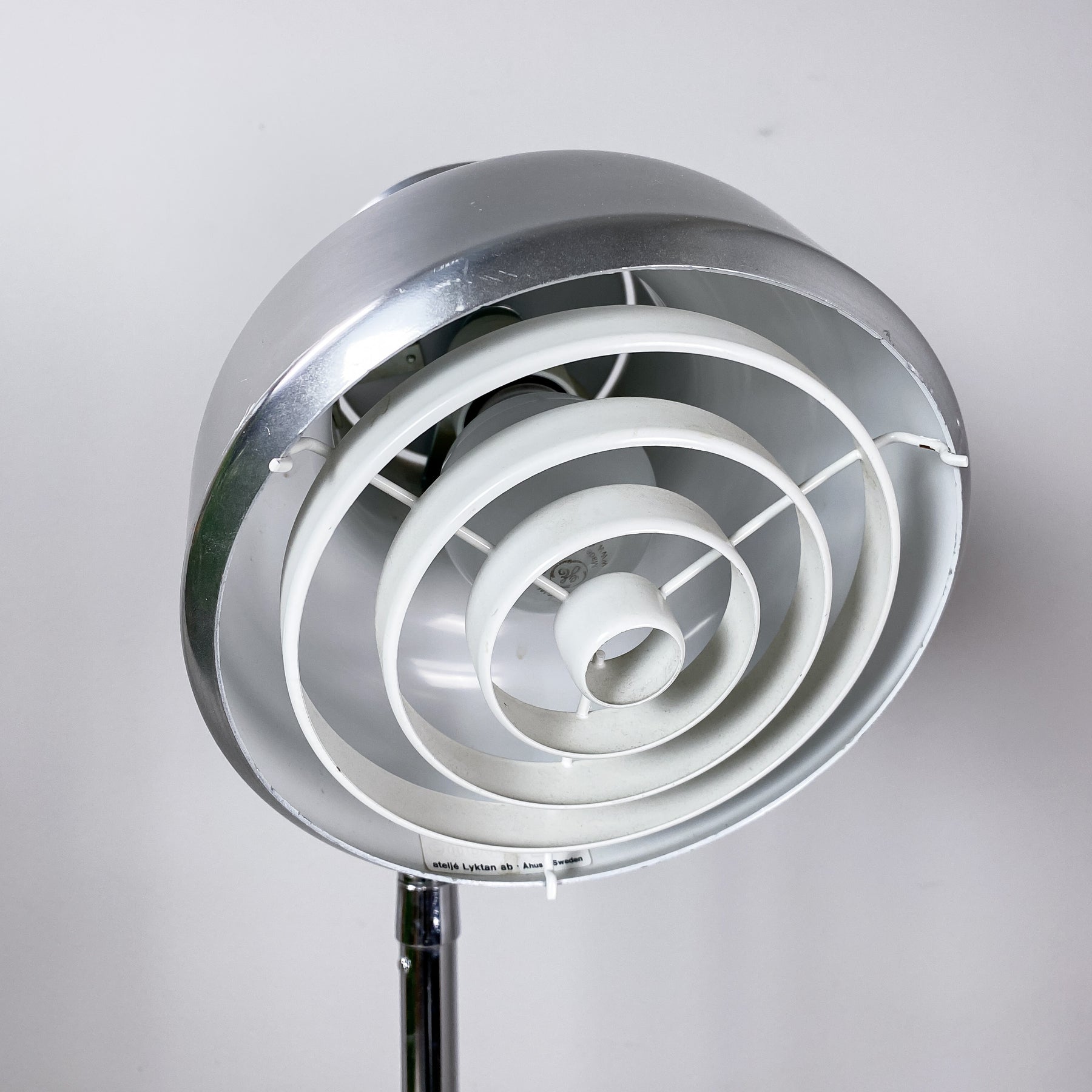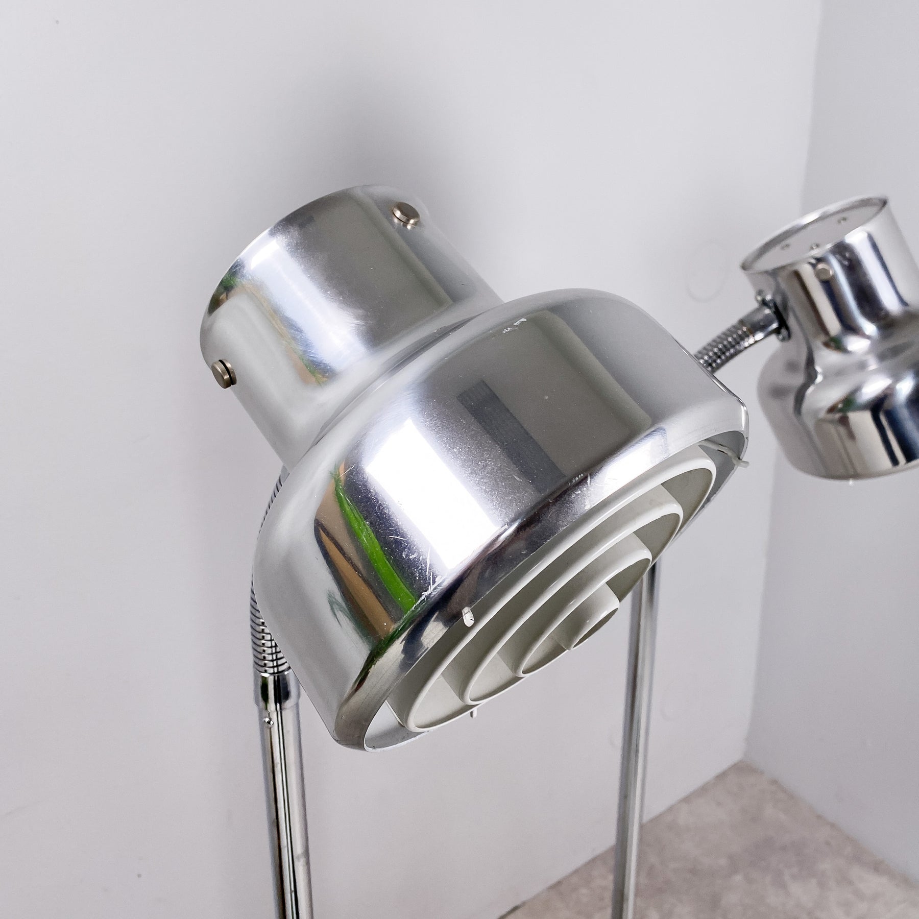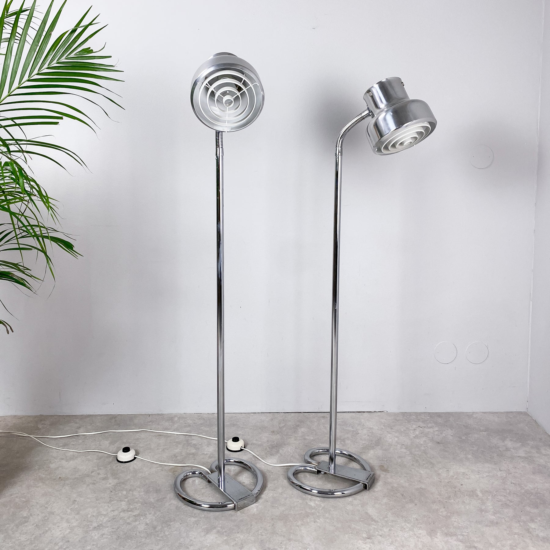 Ett par bumlinglampor i golvmodell. Designen är från 1968 med en trycksvarvad skärm i ren aluminium och ringraster som bländskydd. Den klassiska flexarmen gör att skärmen lätt kan justeras till önskad vinkel. Raster i plåt. Strömbrytare på sladden. E27 glödlampa.