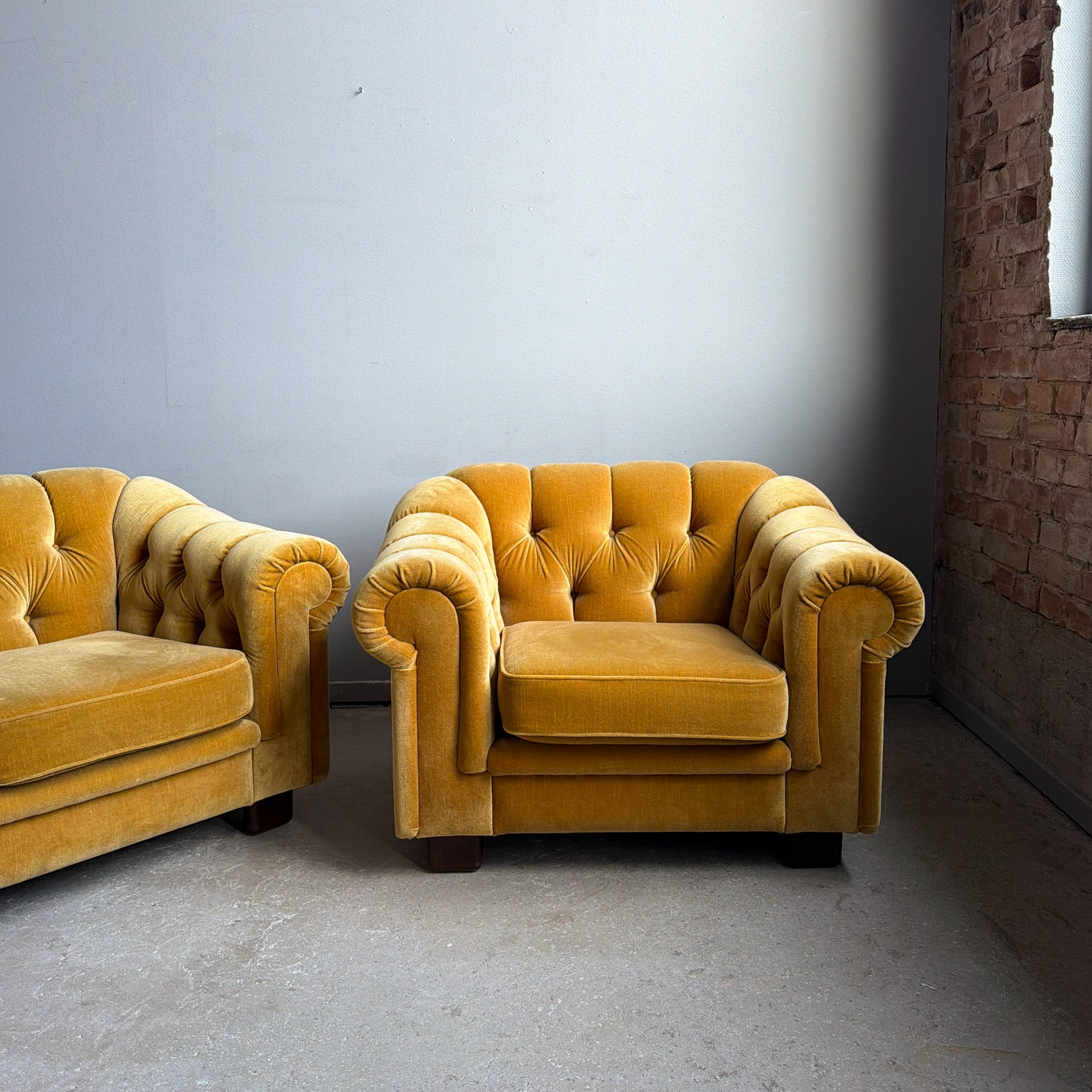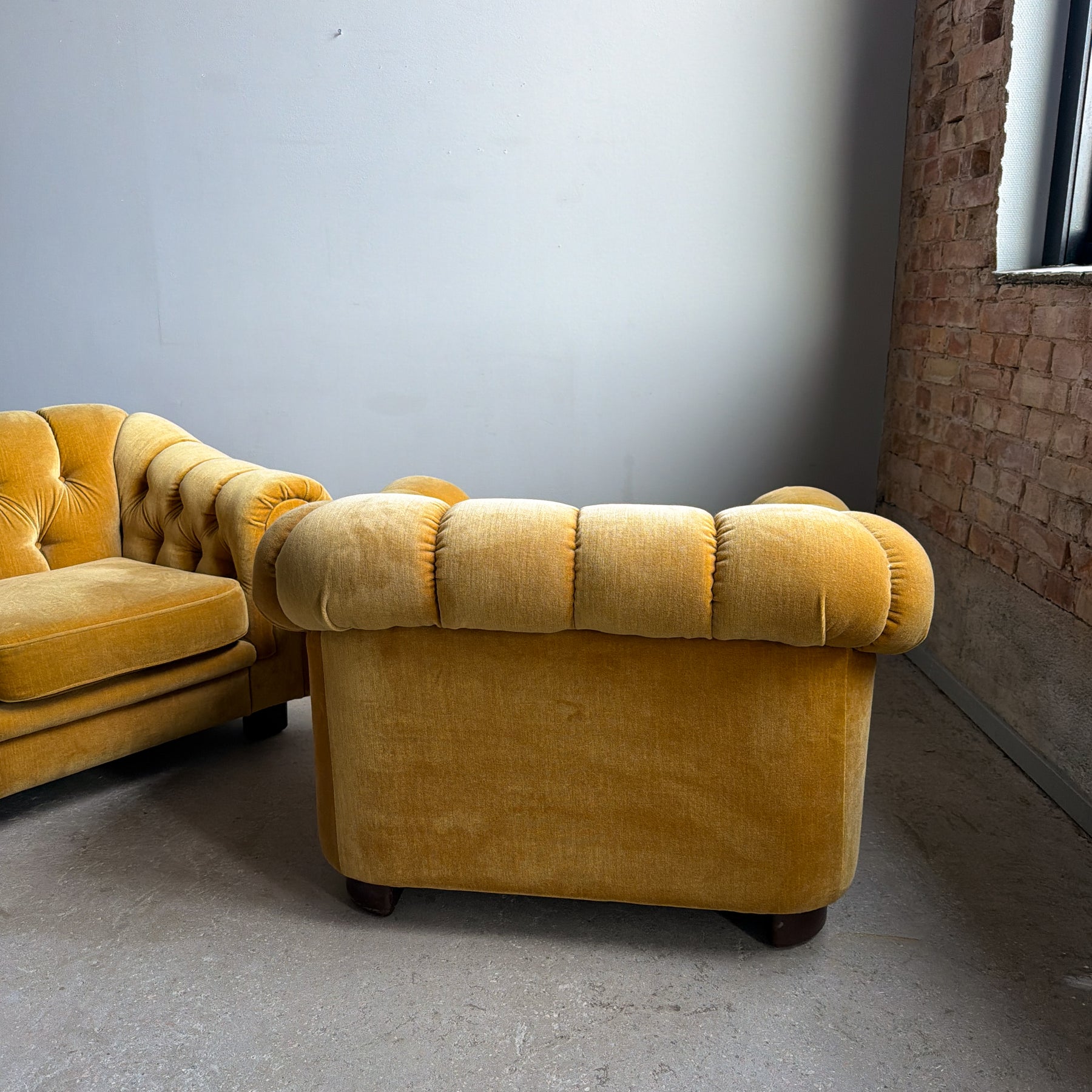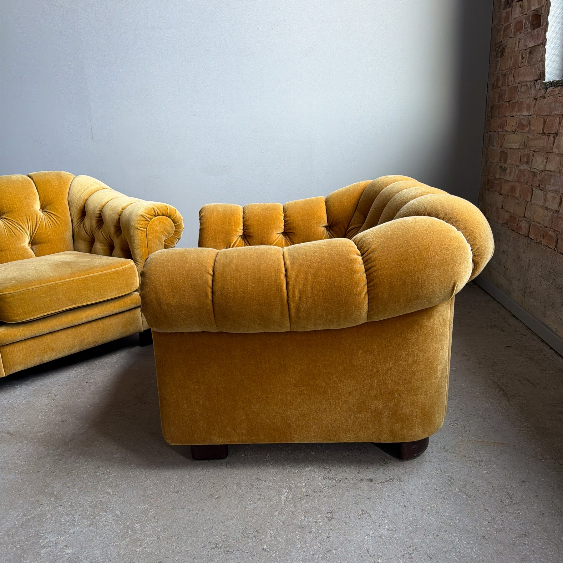 Fåtölj i chesterfieldmodell, 70-tal. Lejongul/senapsgul plysch. Fötter i brun plast.
