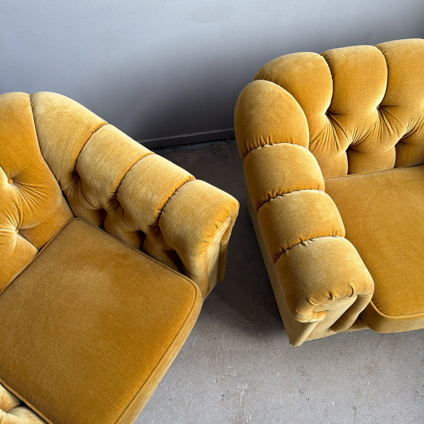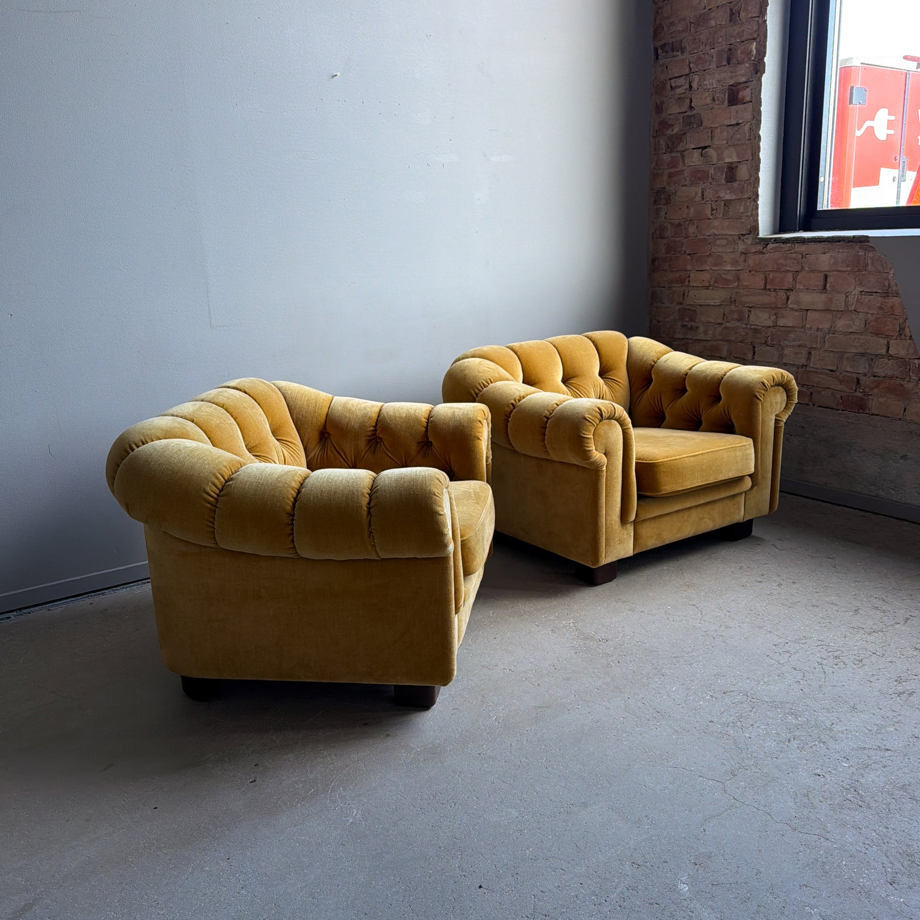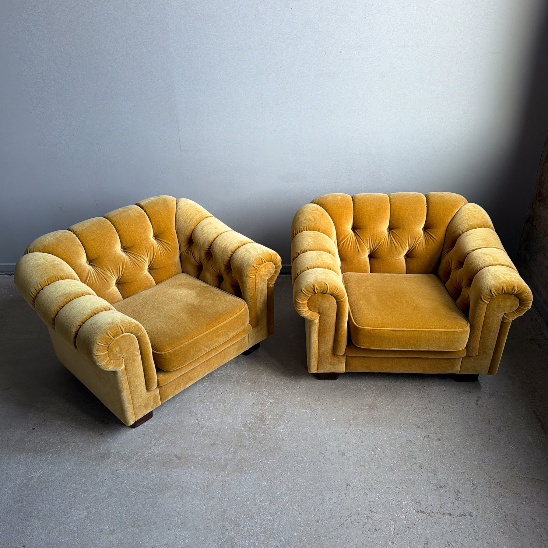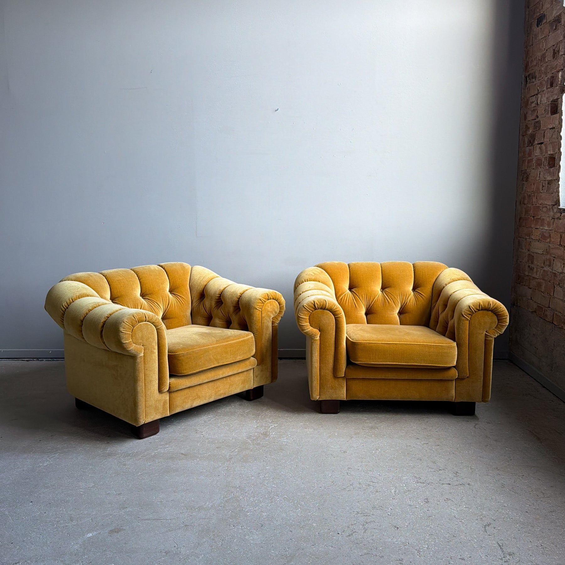 Fåtölj i chesterfieldmodell, 70-tal. Lejongul/senapsgul plysch. Fötter i brun plast.