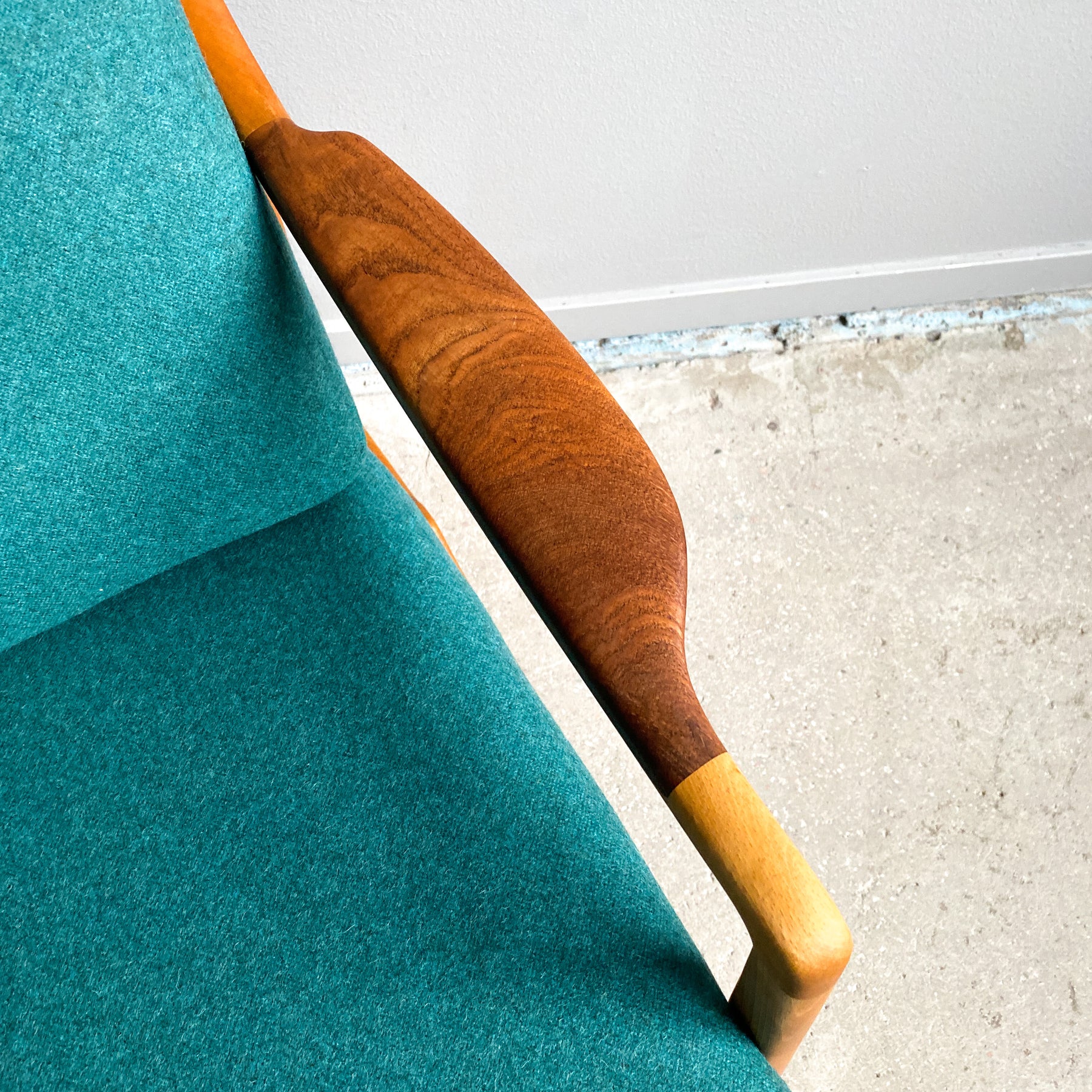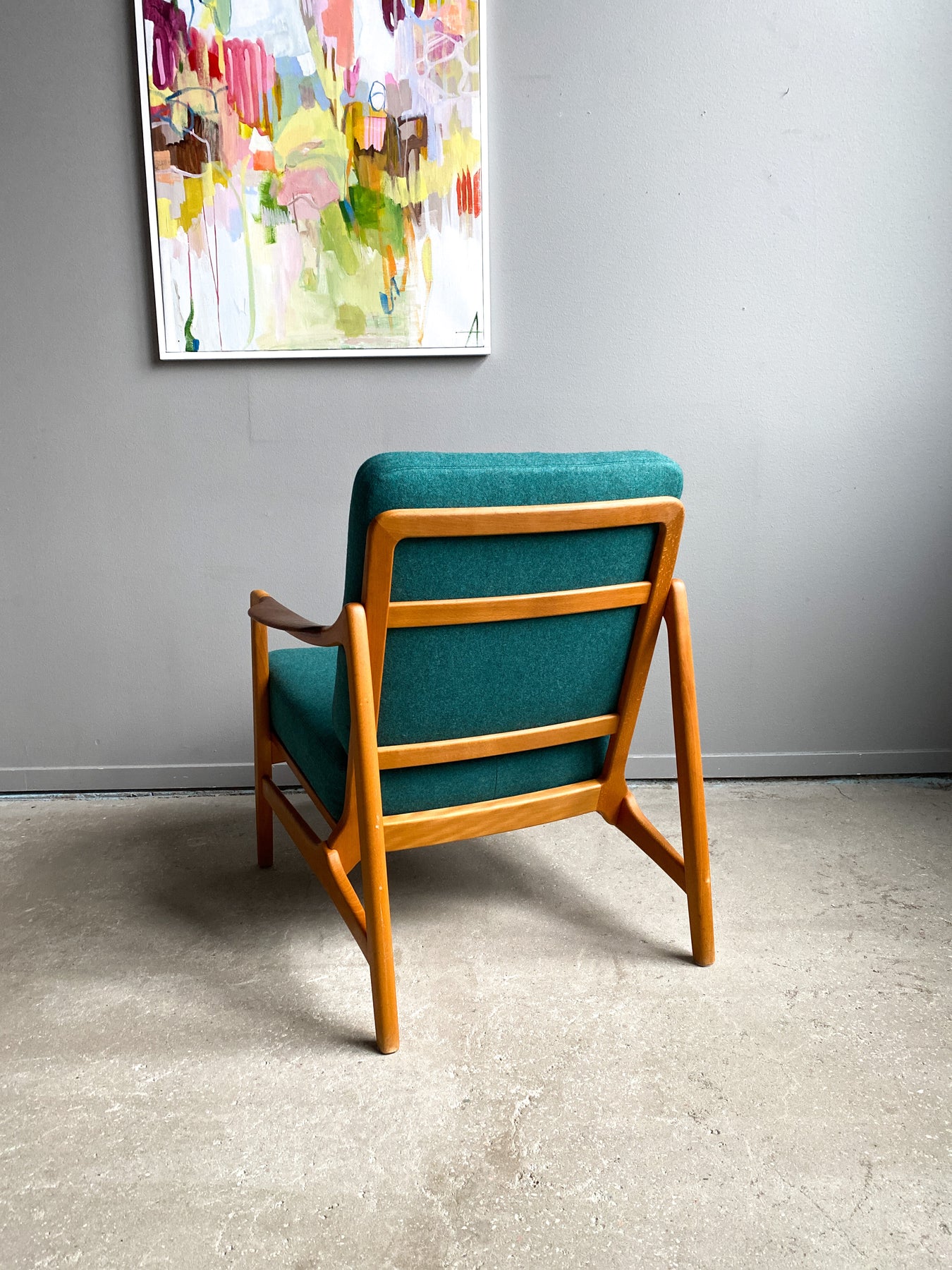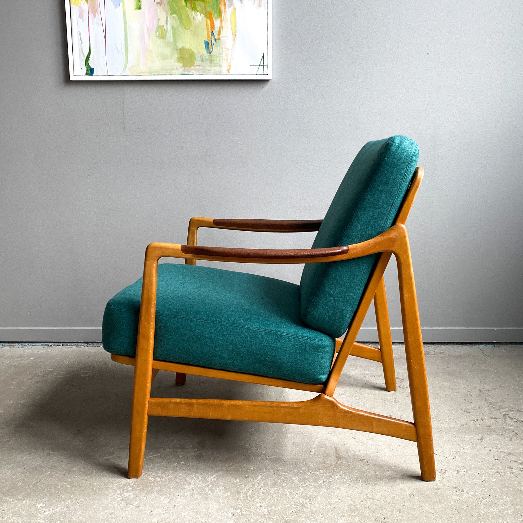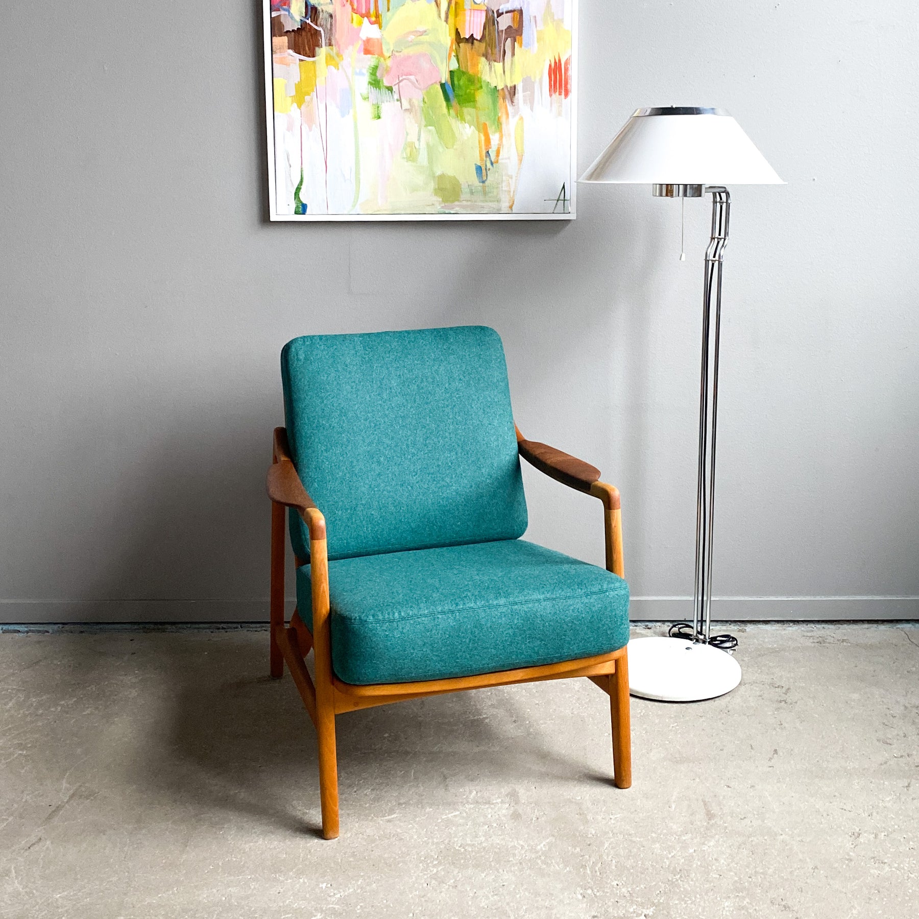 Fåtölj i modell 117, design Tove & Edvard Kindt Larsen för France & Daverkosen, Danmark. Formgiven 1956. Nytapetserade lösa plymåer i ett härligt grönturkost möbel ulltyg med 150 000 martindale.