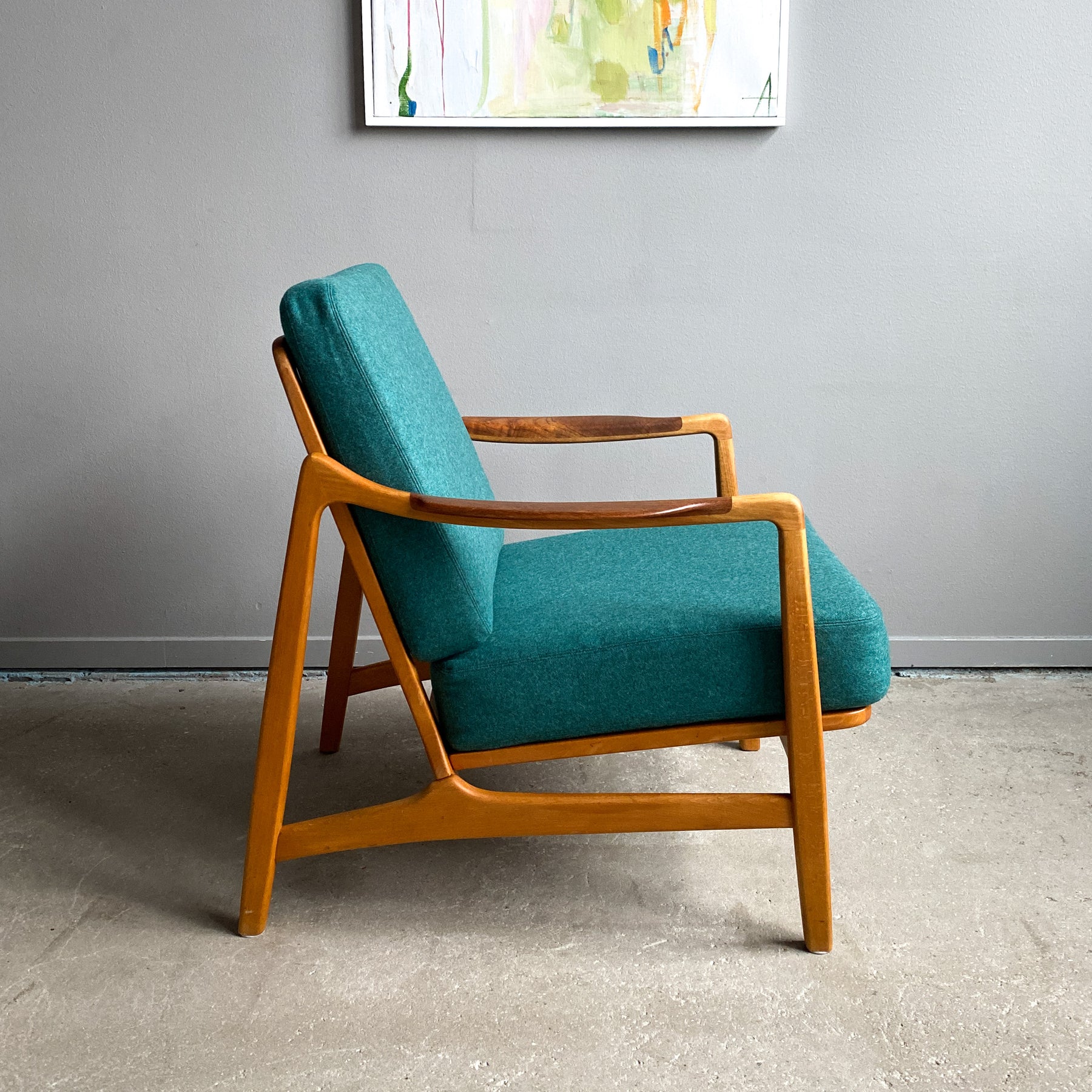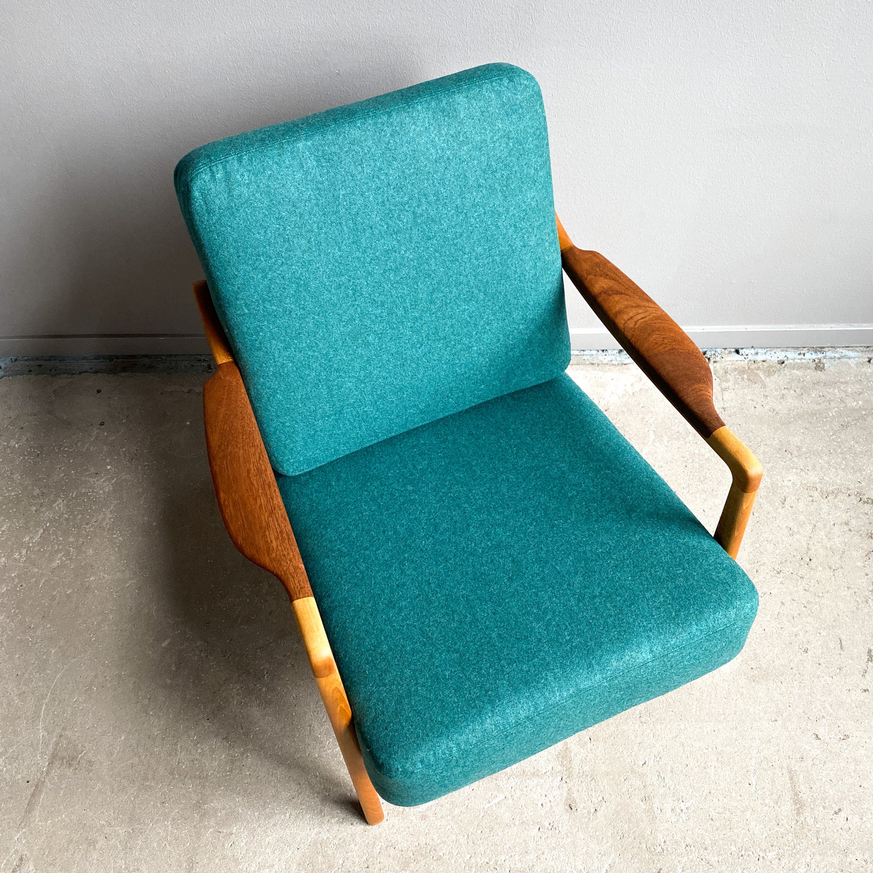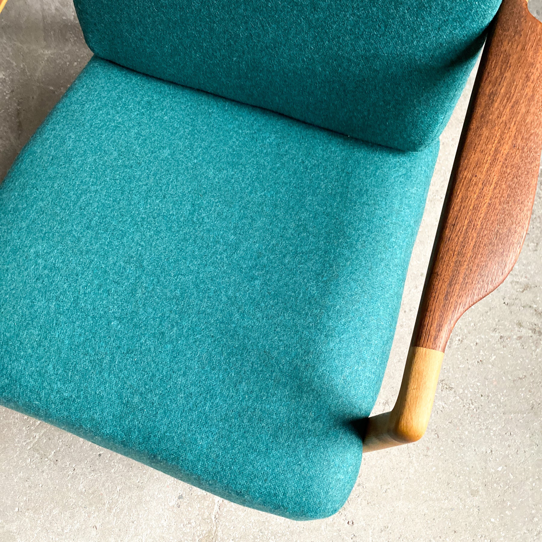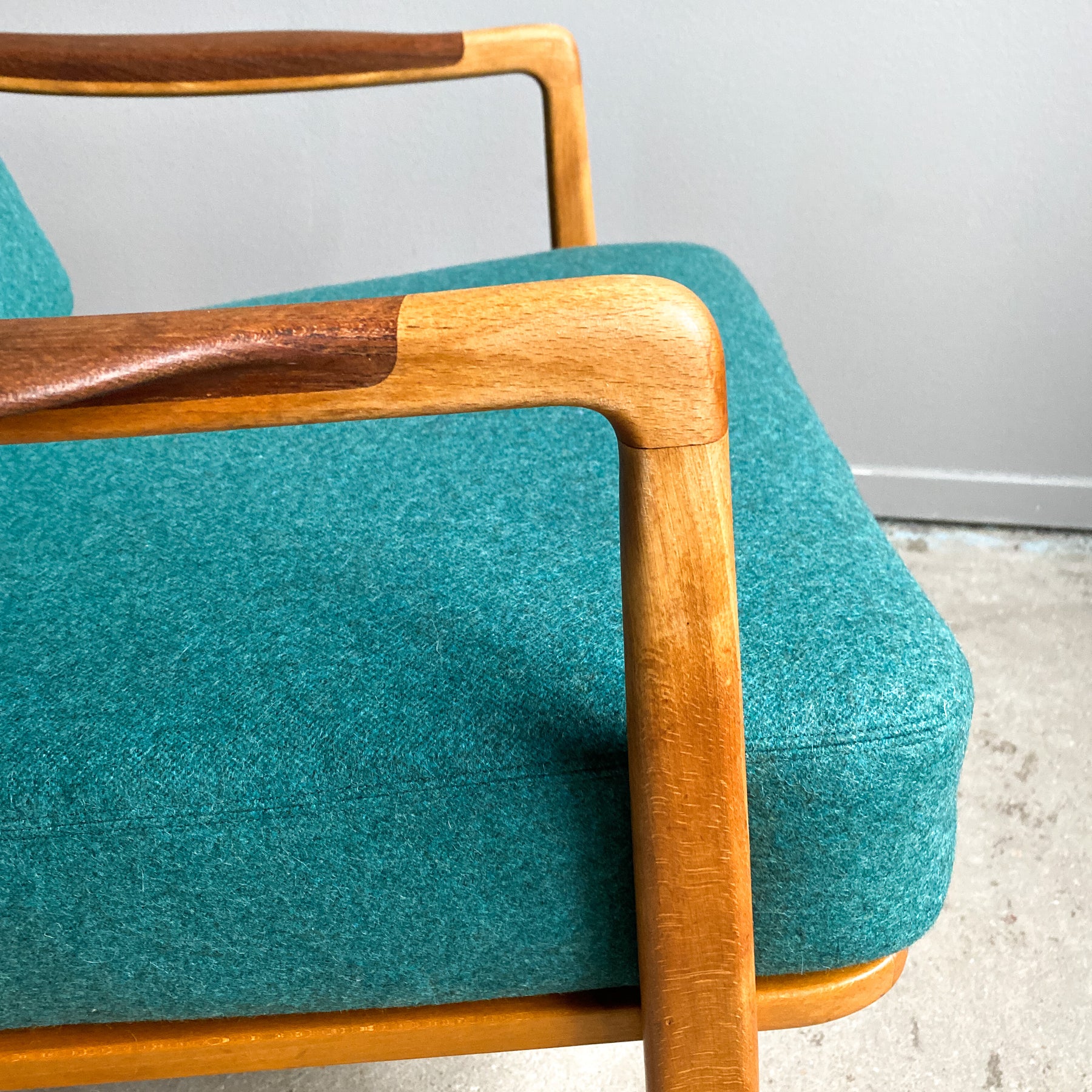 Fåtölj i modell 117, design Tove & Edvard Kindt Larsen för France & Daverkosen, Danmark. Formgiven 1956. Nytapetserade lösa plymåer i ett härligt grönturkost möbel ulltyg med 150 000 martindale.