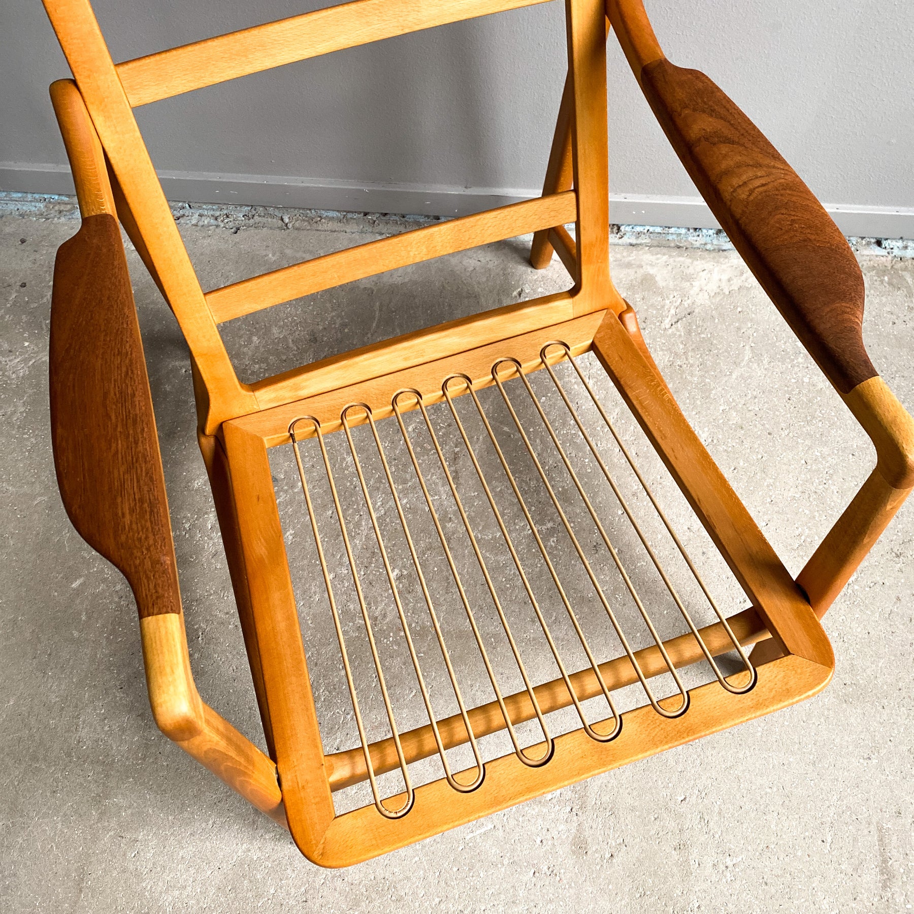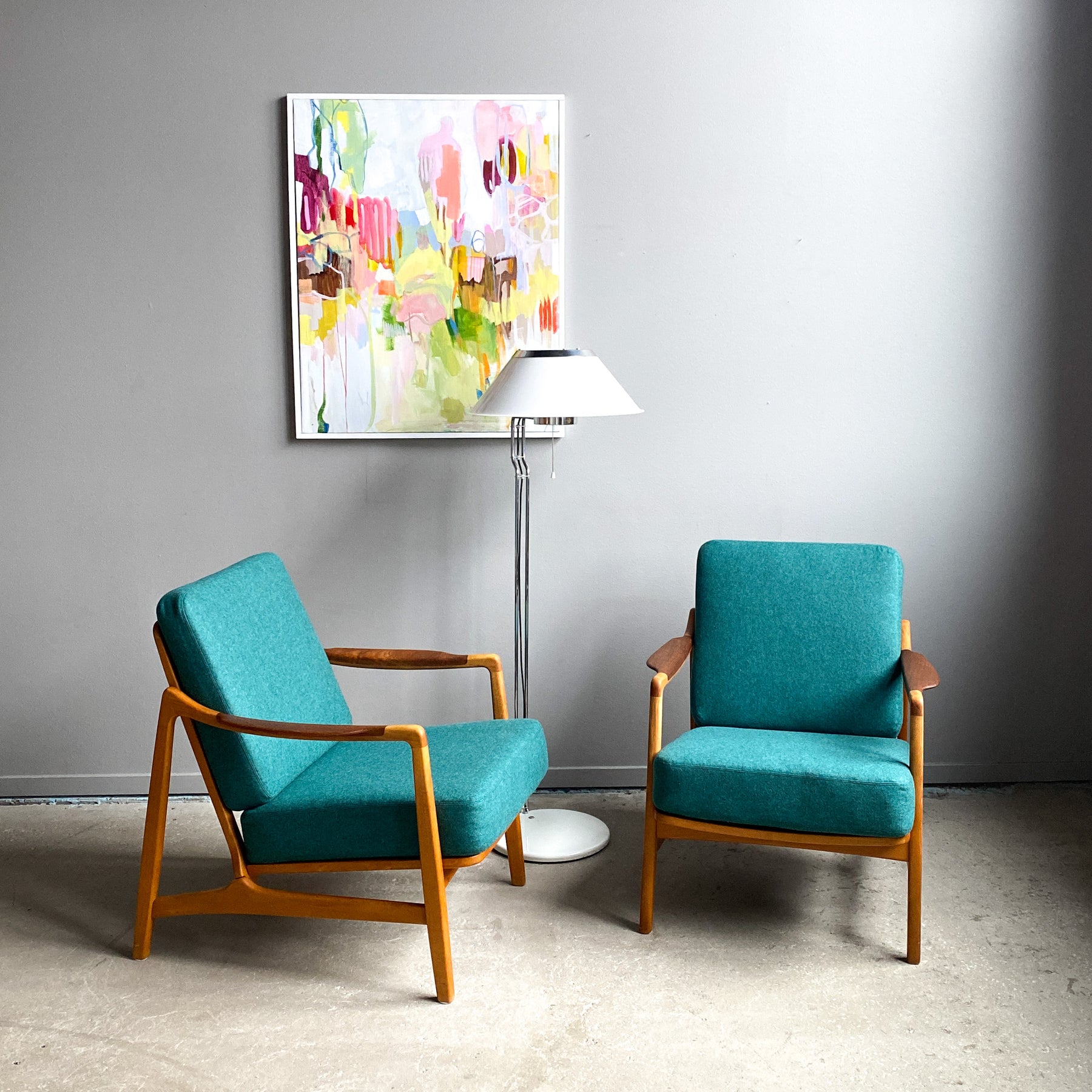 Material: bok, teak, originalplymåer i resår nytapetserade i 100% ull.