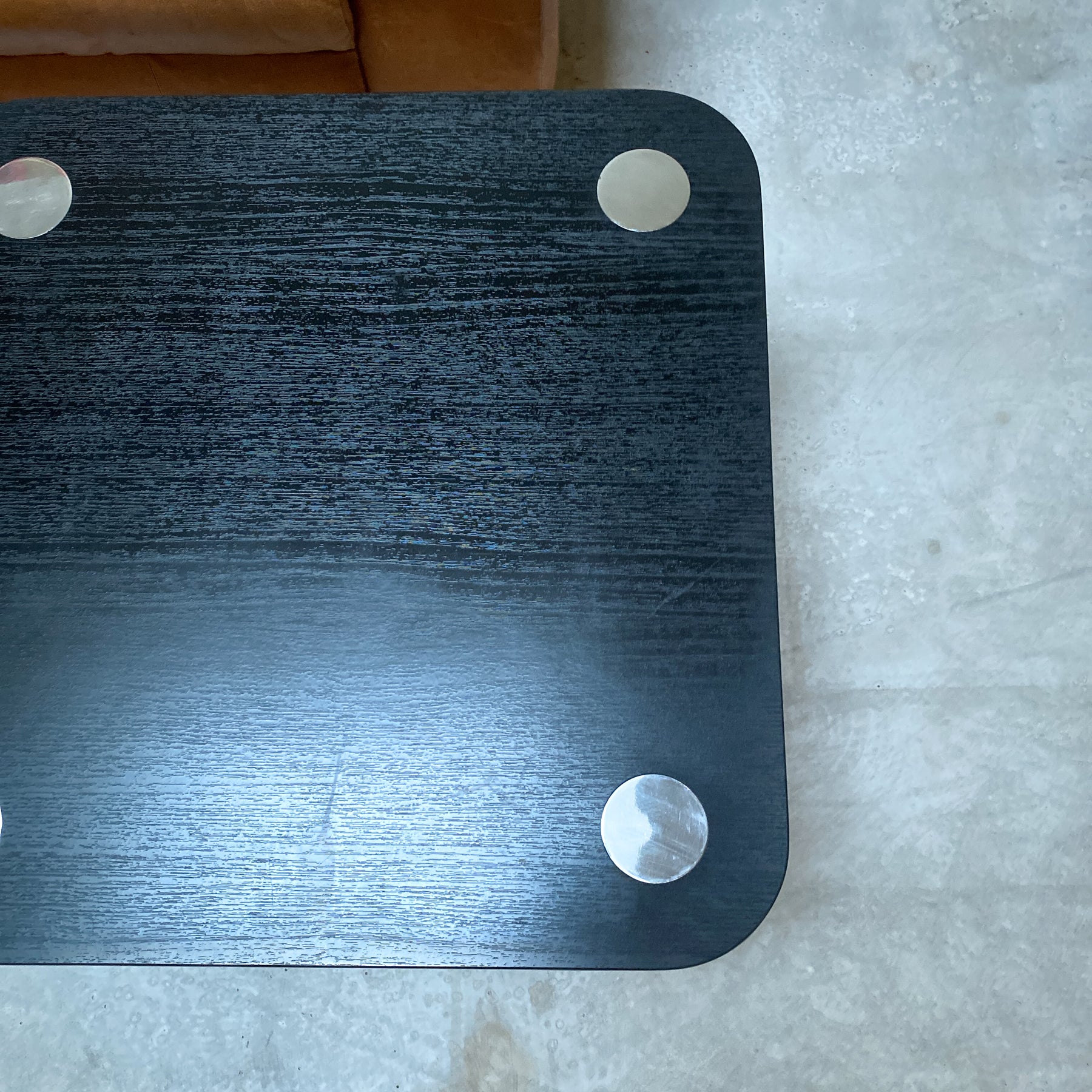 Soffbord/sidobord med svart skiva och runda ben i metall. Metall detaljer på ovansidan.