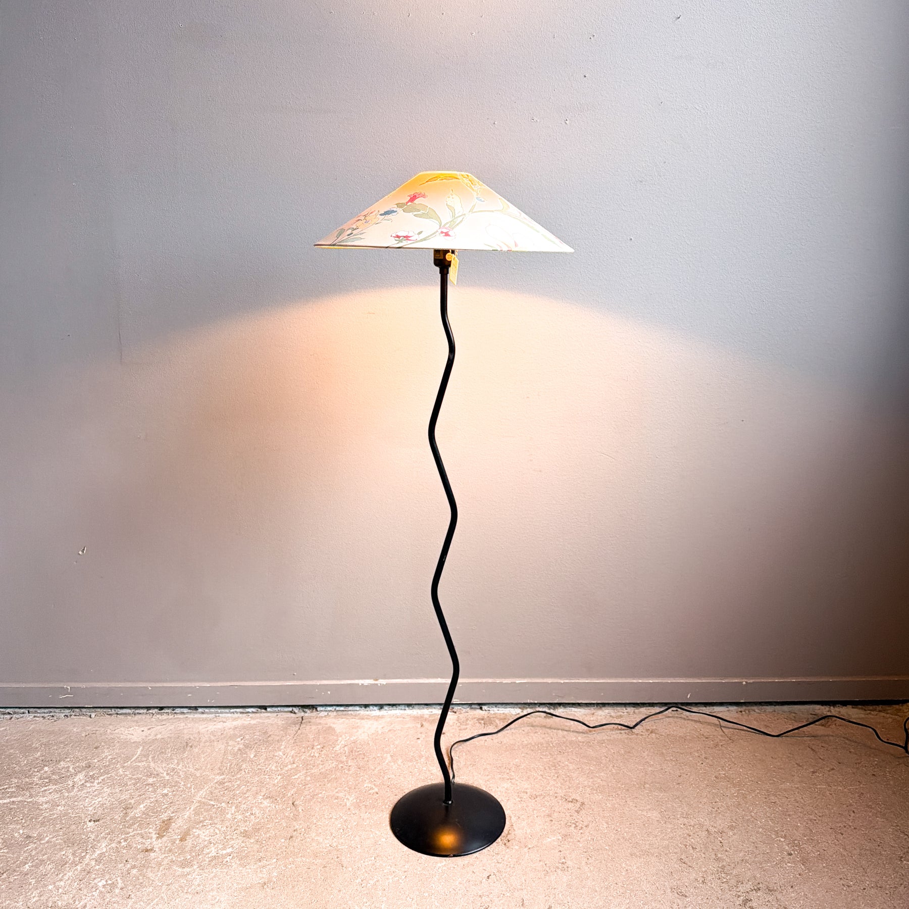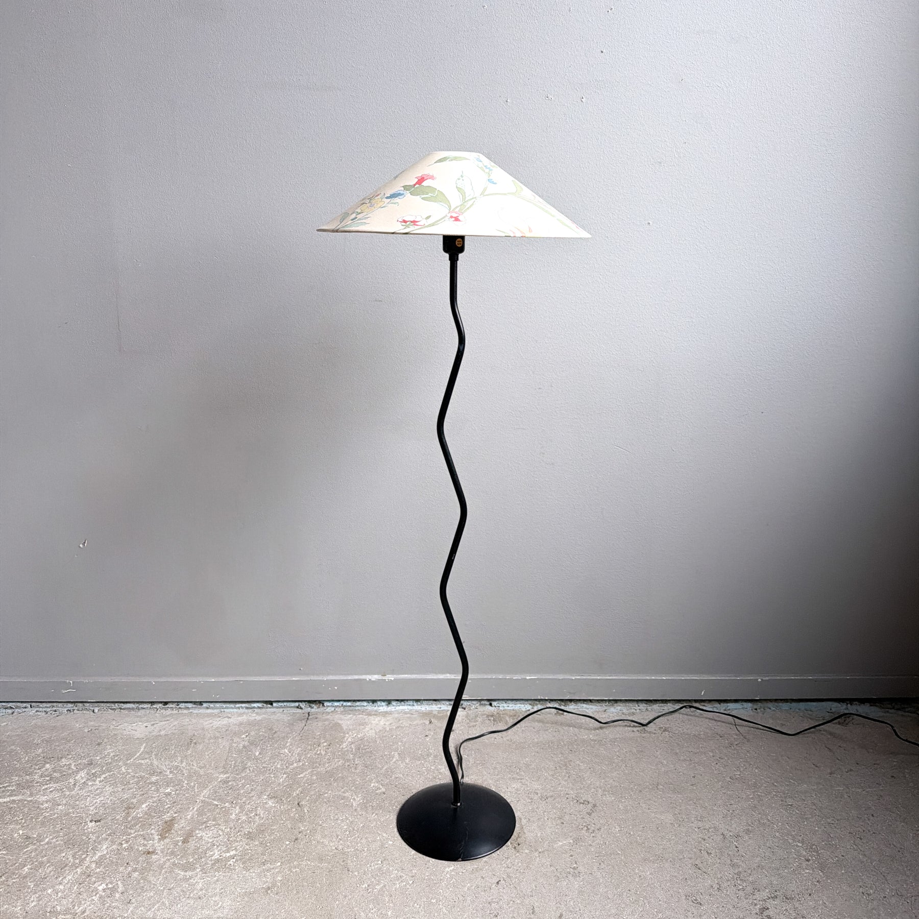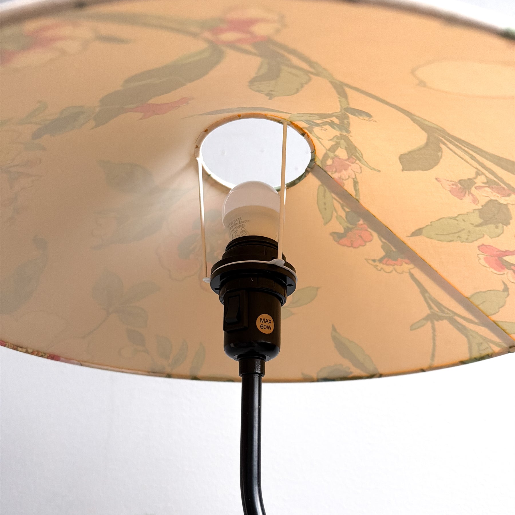 Golvlampa i svart metall. Blommig textil skärm. Svart sladd med platt euro kontakt. E27 glödlampa.