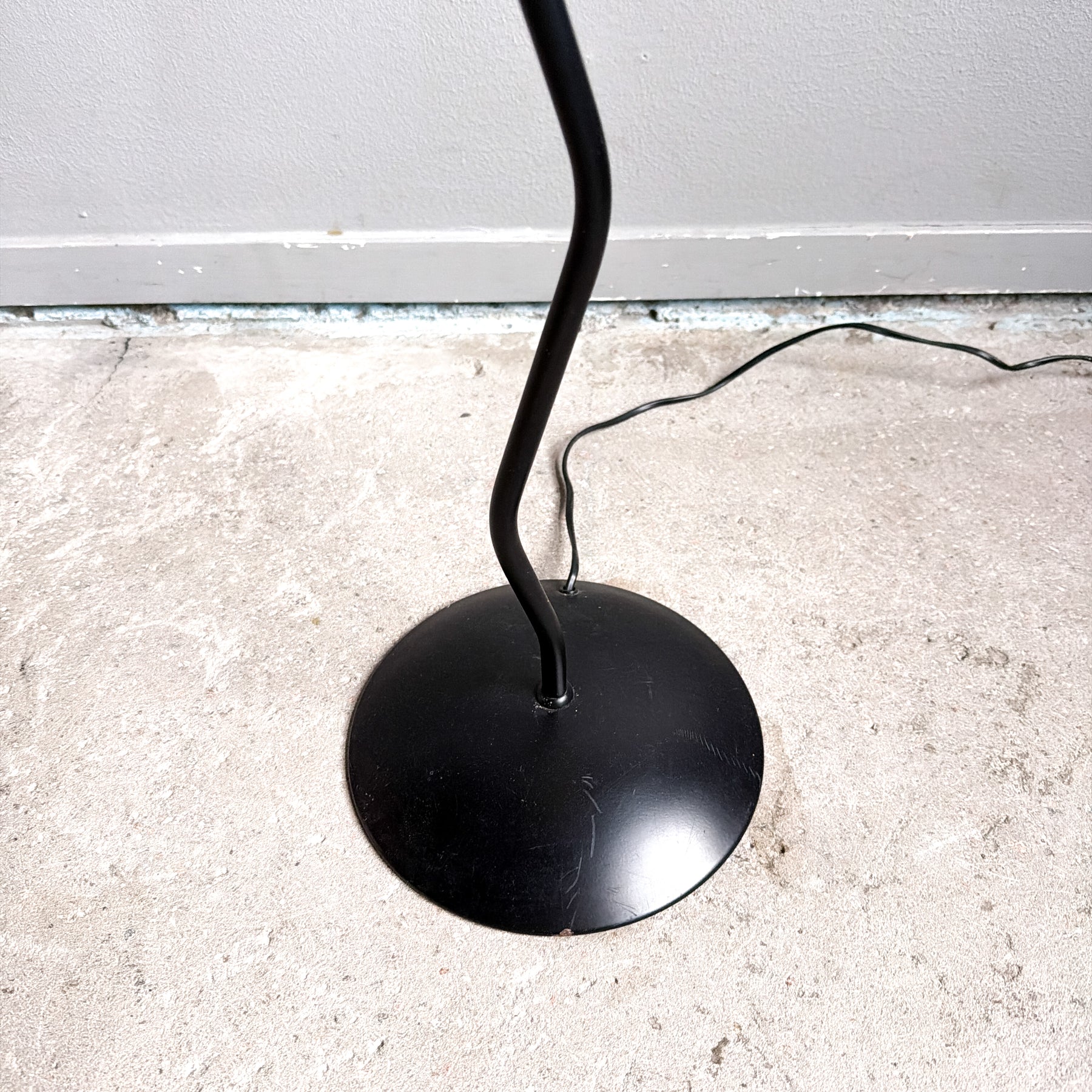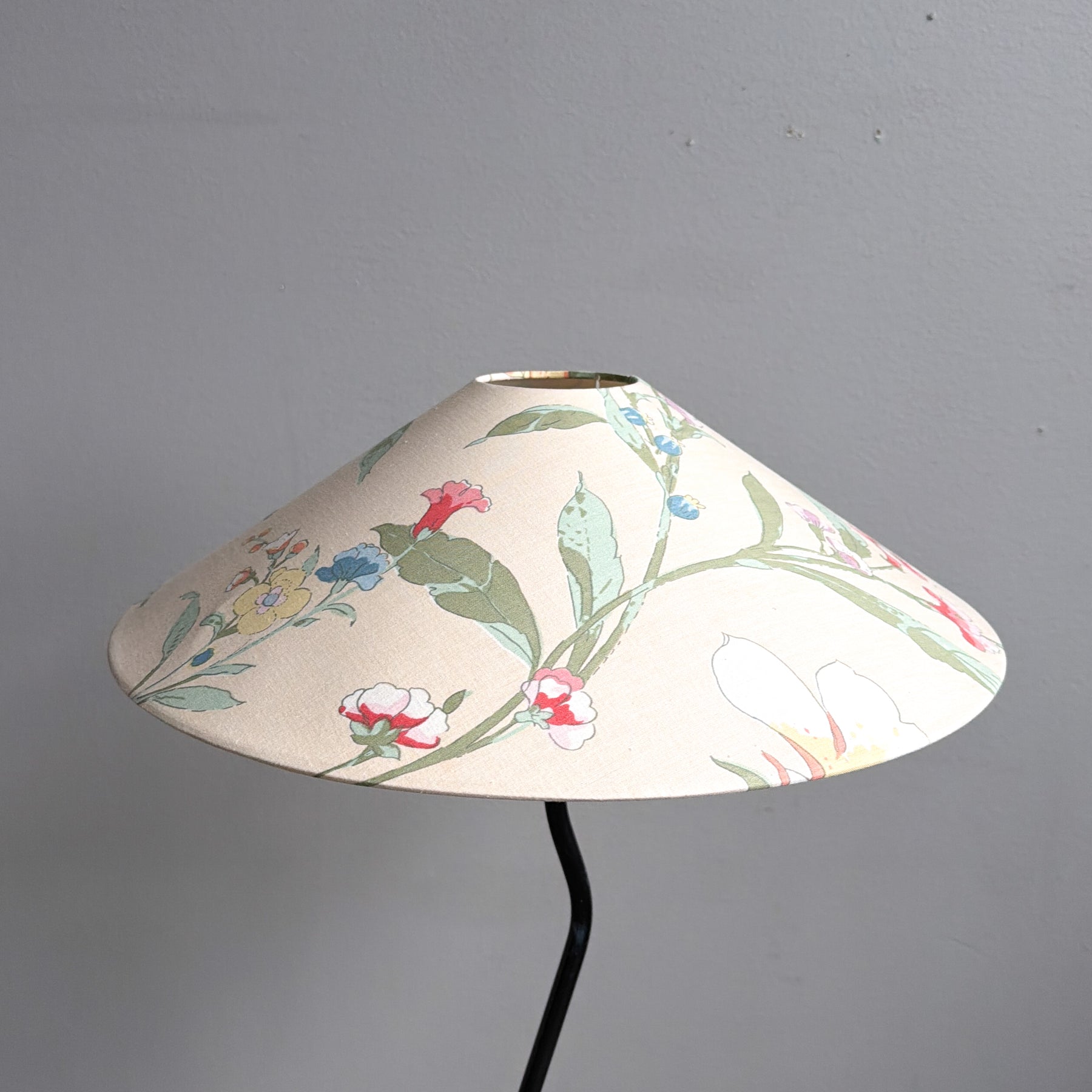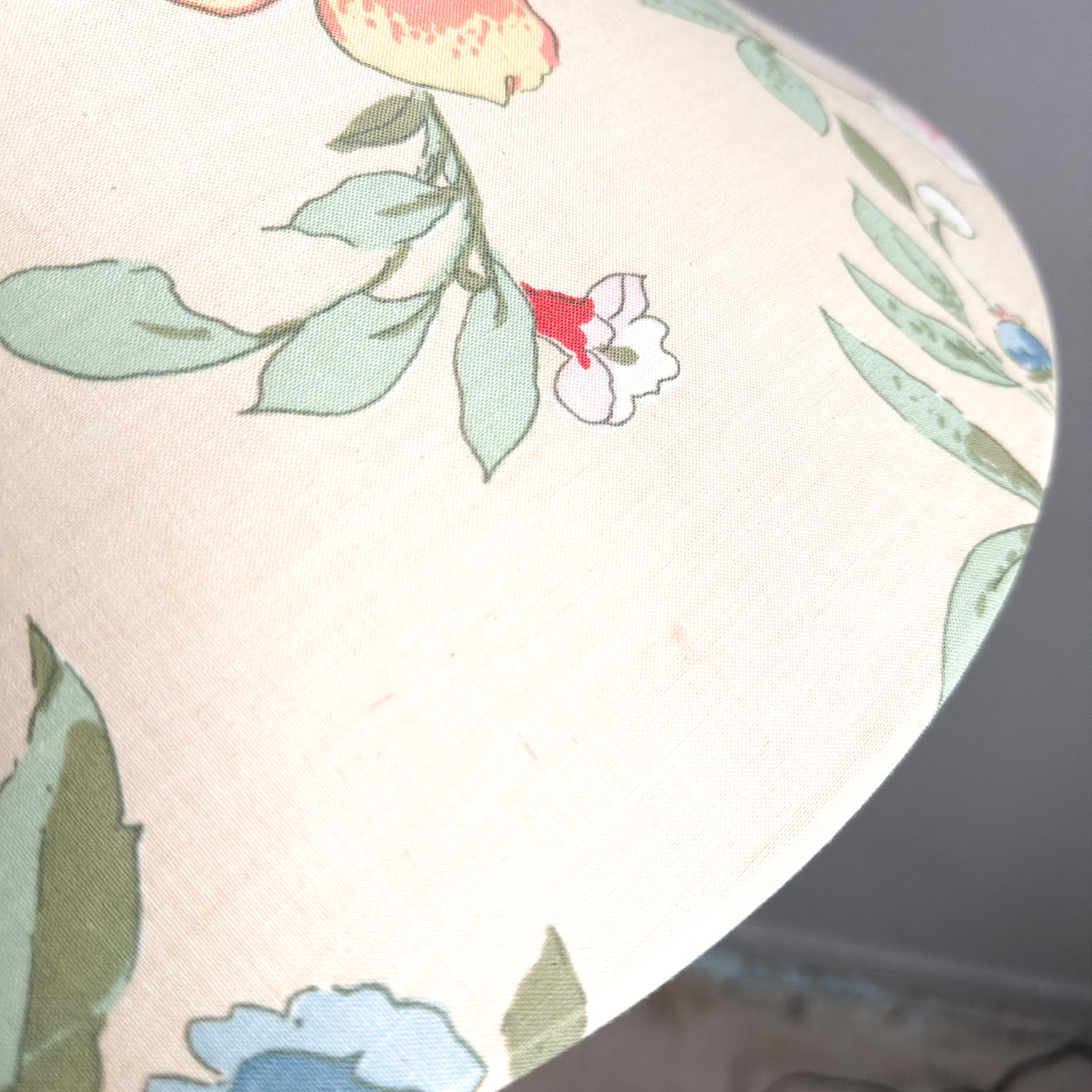 Golvlampa i svart metall. Blommig textil skärm. Svart sladd med platt euro kontakt. E27 glödlampa.