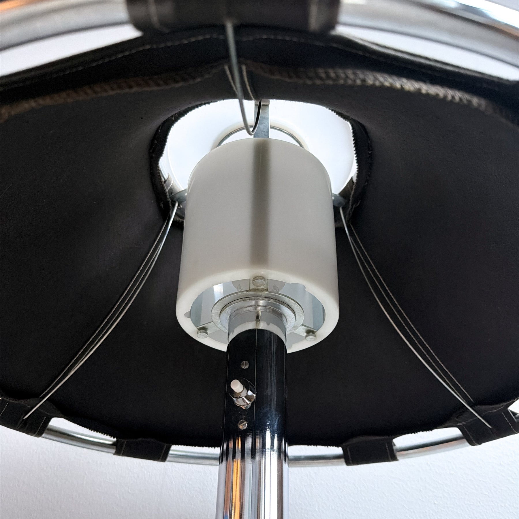 Taklampa i svart/brun textil och fot i krom designad av Anna Ehrner för Ateljé Lyktan AB. Den större modellen. Tänds i 2 steg/olika ljusstyrkor men nya led funkar bara i en ljusstyrka.