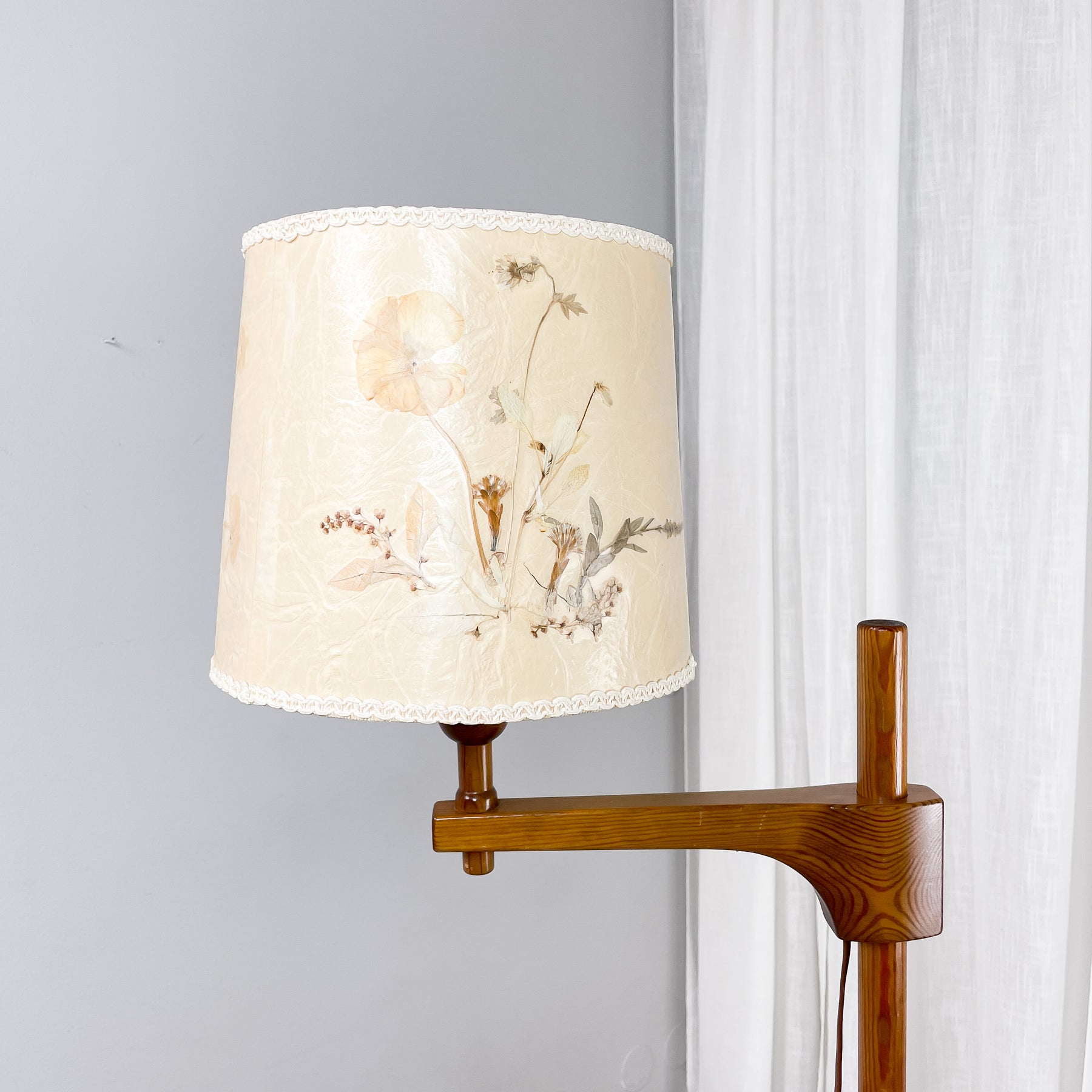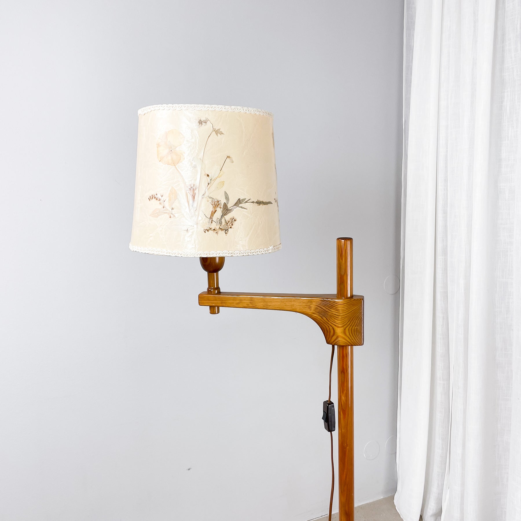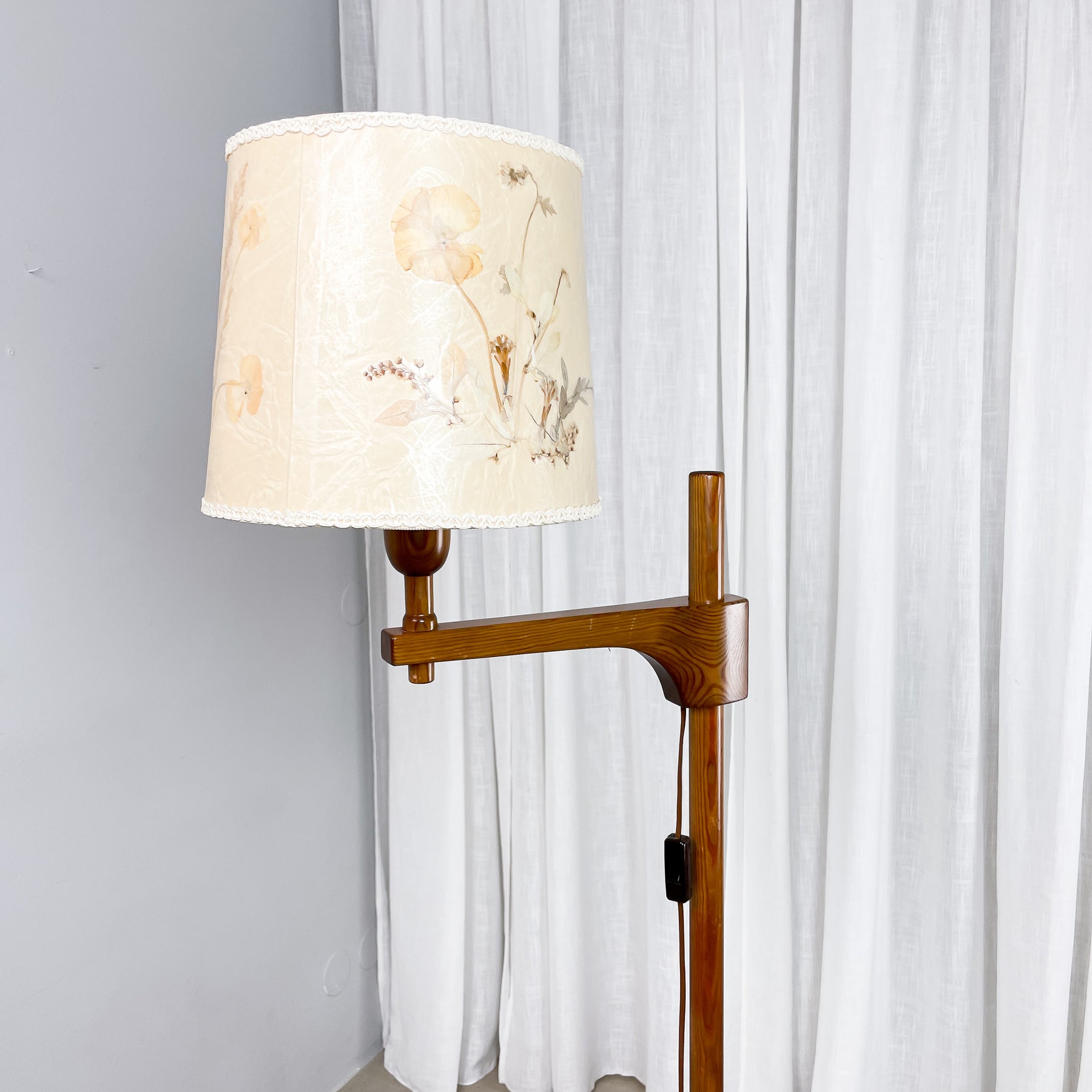 En golvlampa i trä med rund fot och tvärgående arm som håller lamphållaren. Lampskärm gjord av papper med torkade blommor. Strömbrytare på brun sladd med platt eurokontakt. Påminner om en lampa designad av Carl Malmsten.