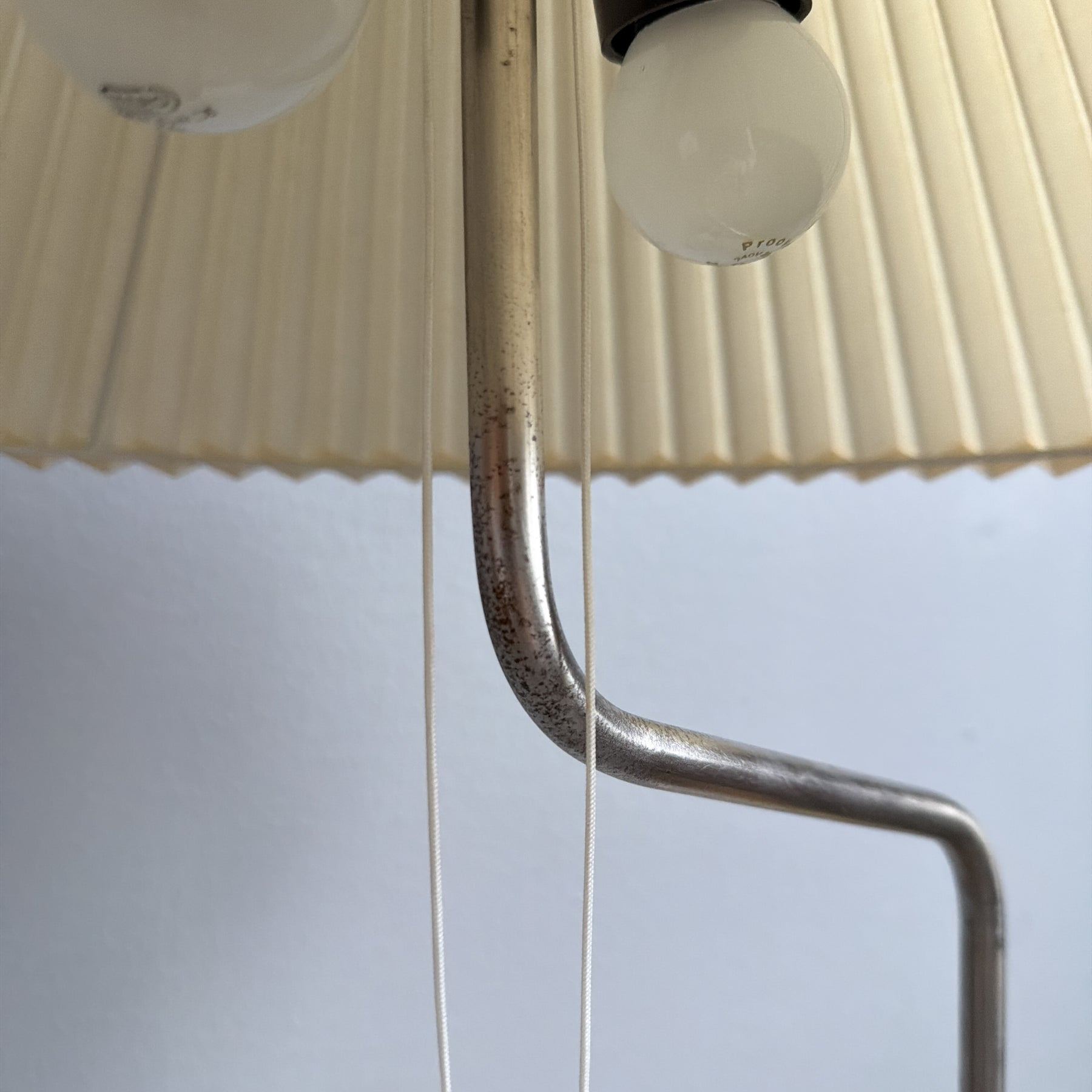 Skick: Spår av liv i form av lite rost på kromet och nån fläck i skärmen. Mindre bruksspår i träet. Överlag fint vintageskick.