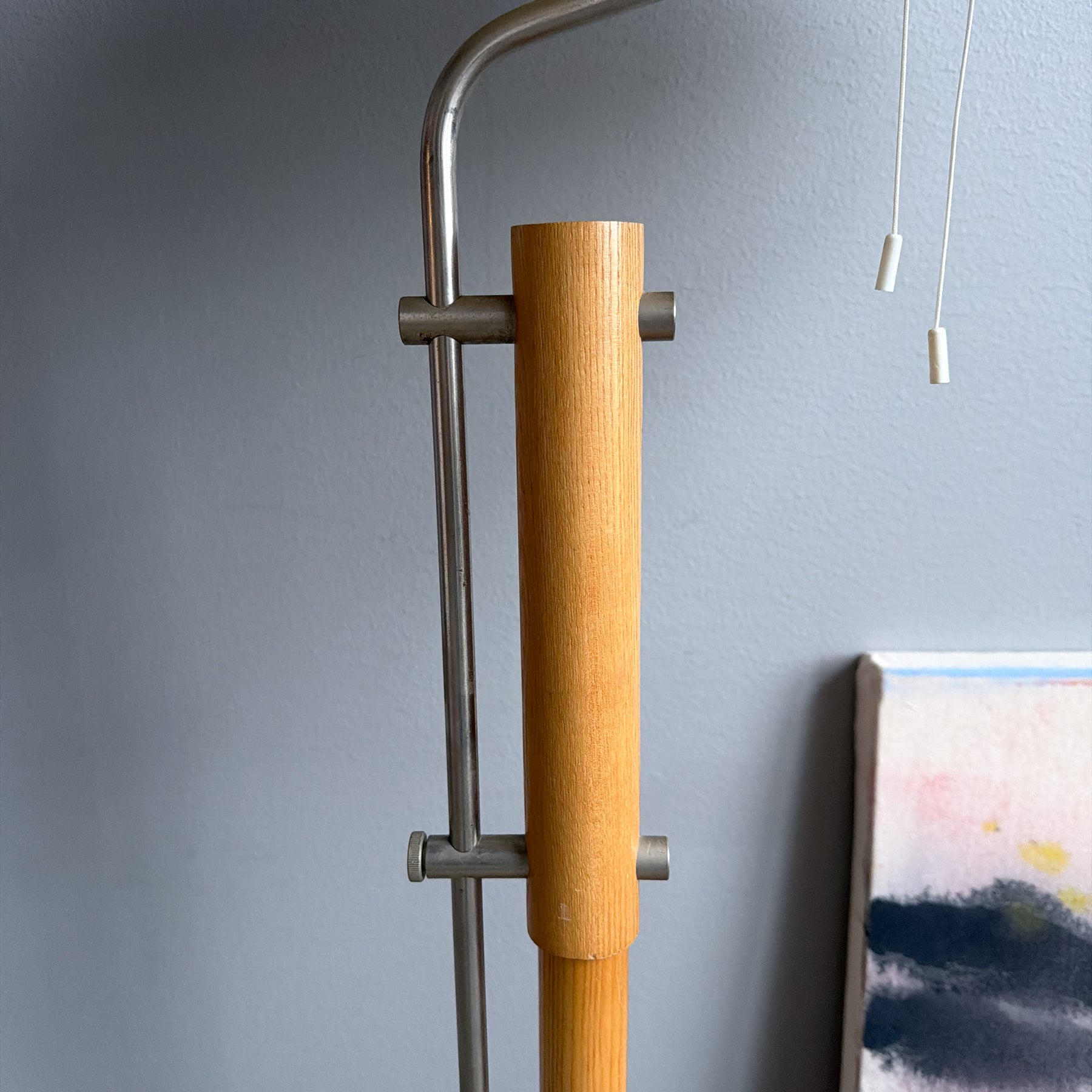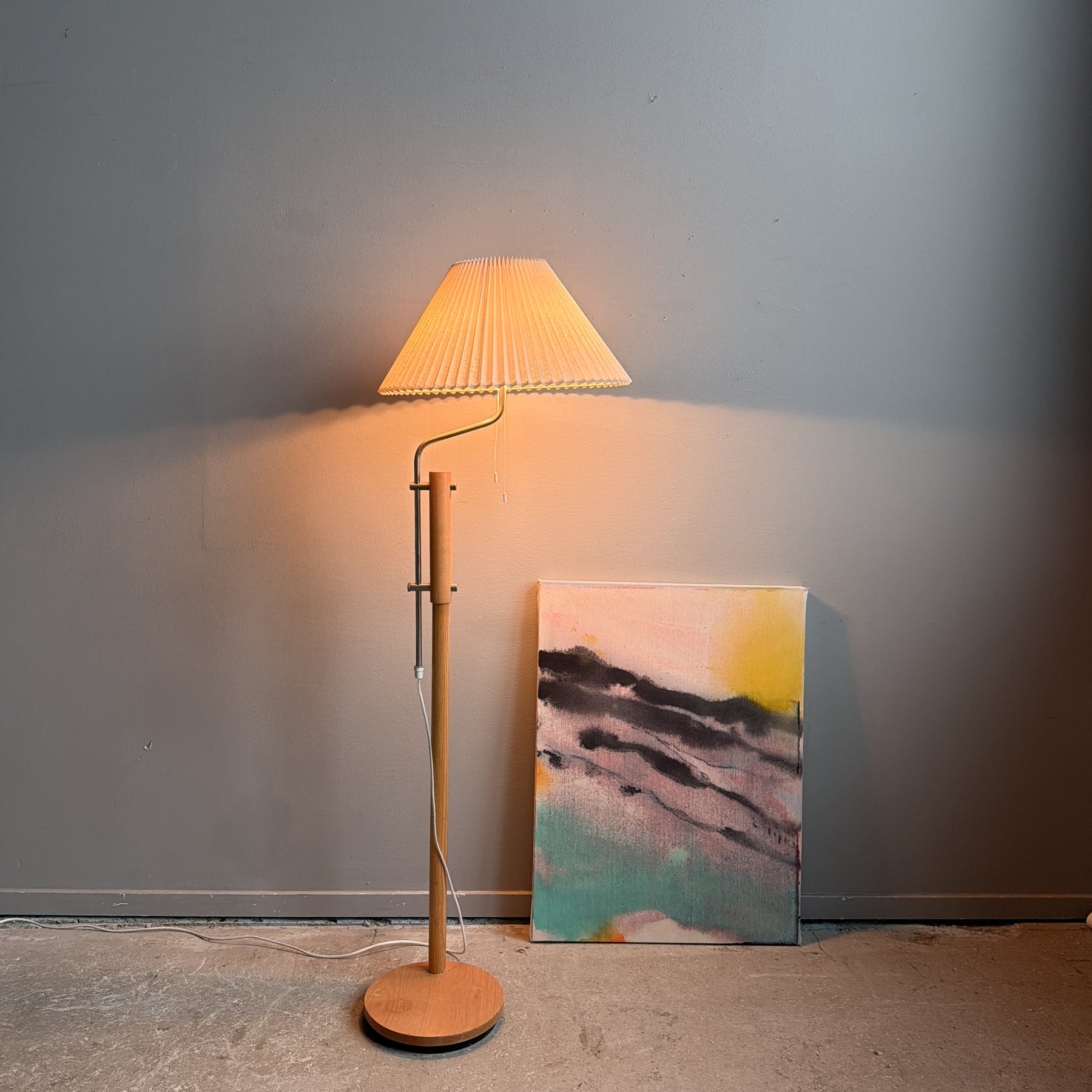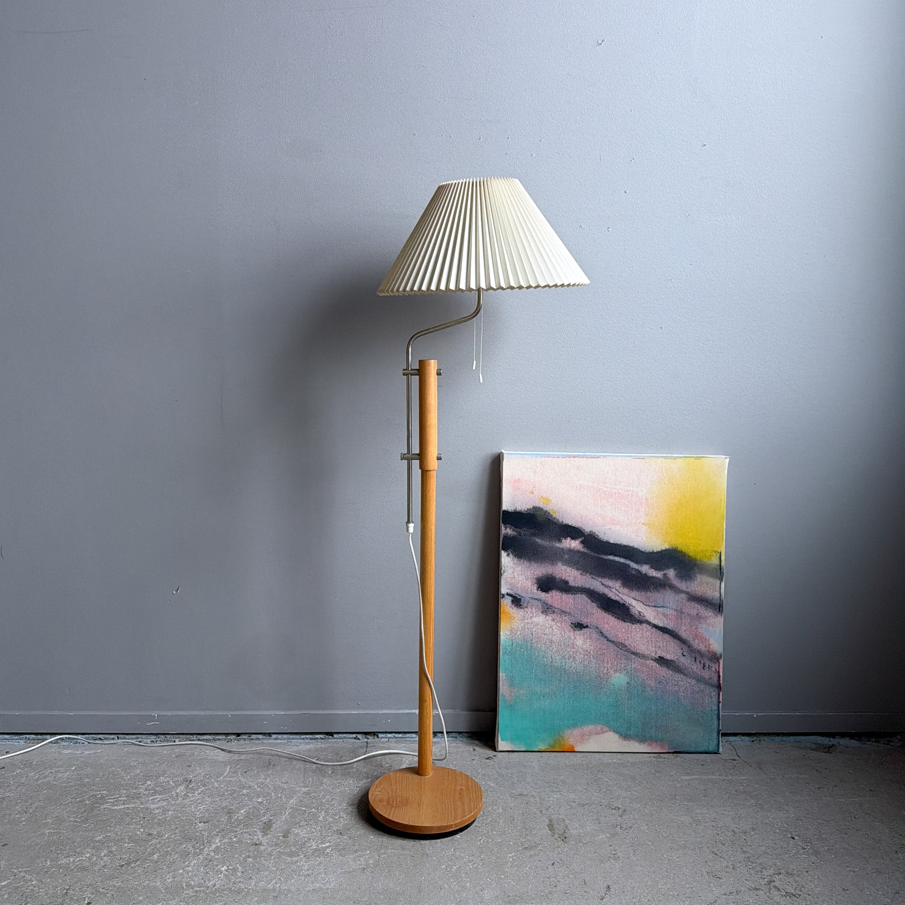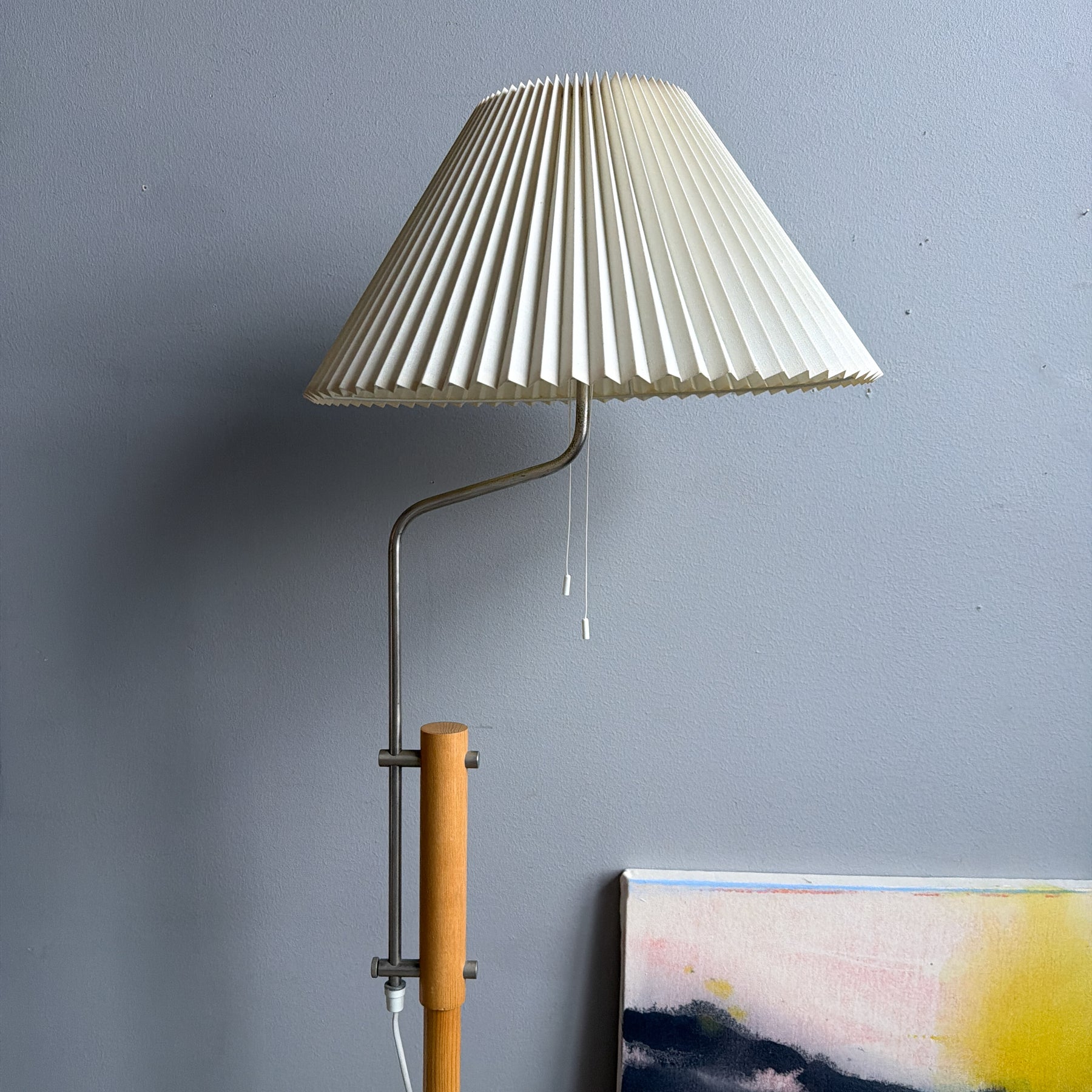 Golvlampa i ljust trä med detaljer i krom, Lyktan i Bankeryd. Plisserad skärm. Höj- och sänkbar. 2 E27 ljuskällor som tänds med snöre. Gjutjärns tyngd i foten.