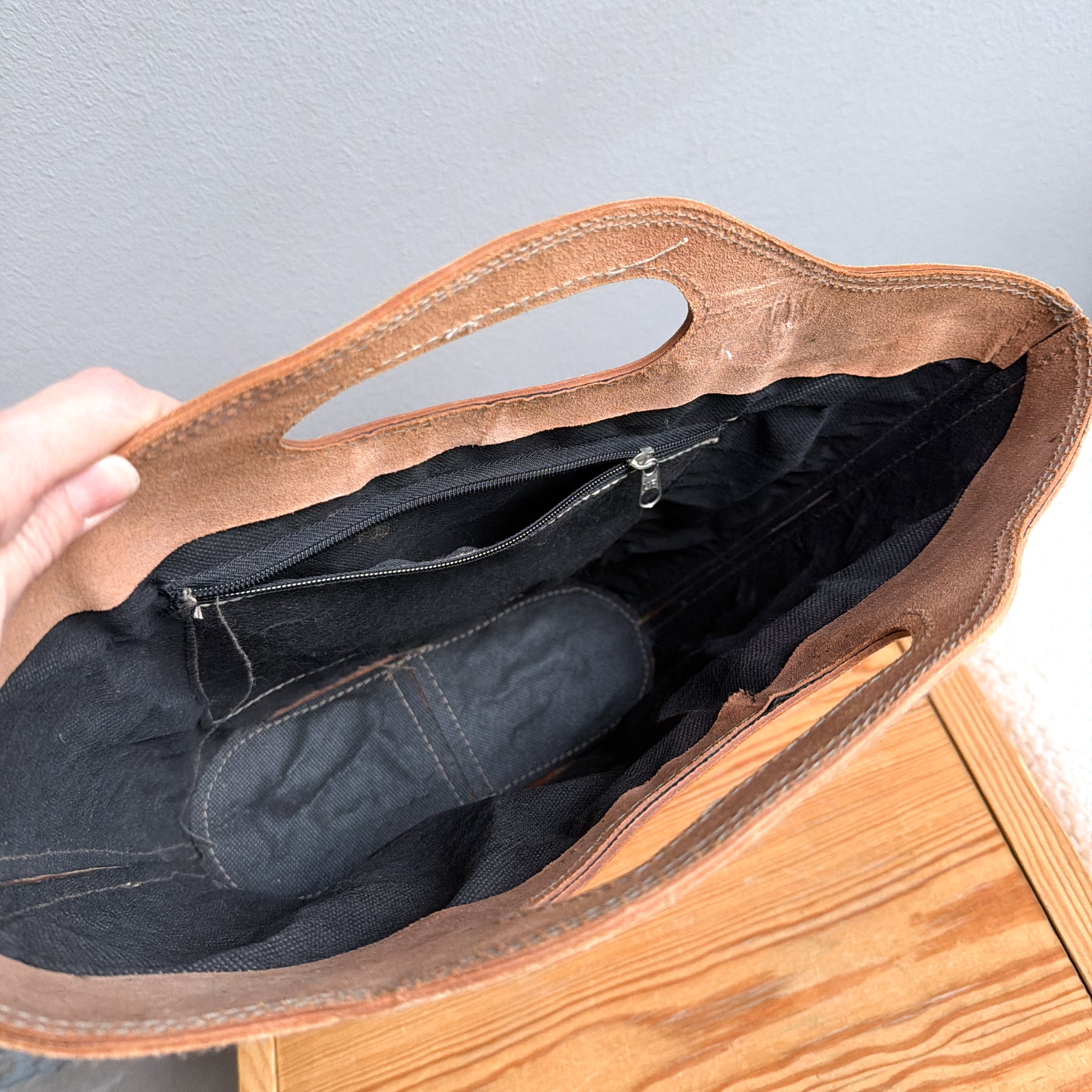 Handväska i ljust skinn/läder. Ett fack med dragkedja invändigt. Svart foder.