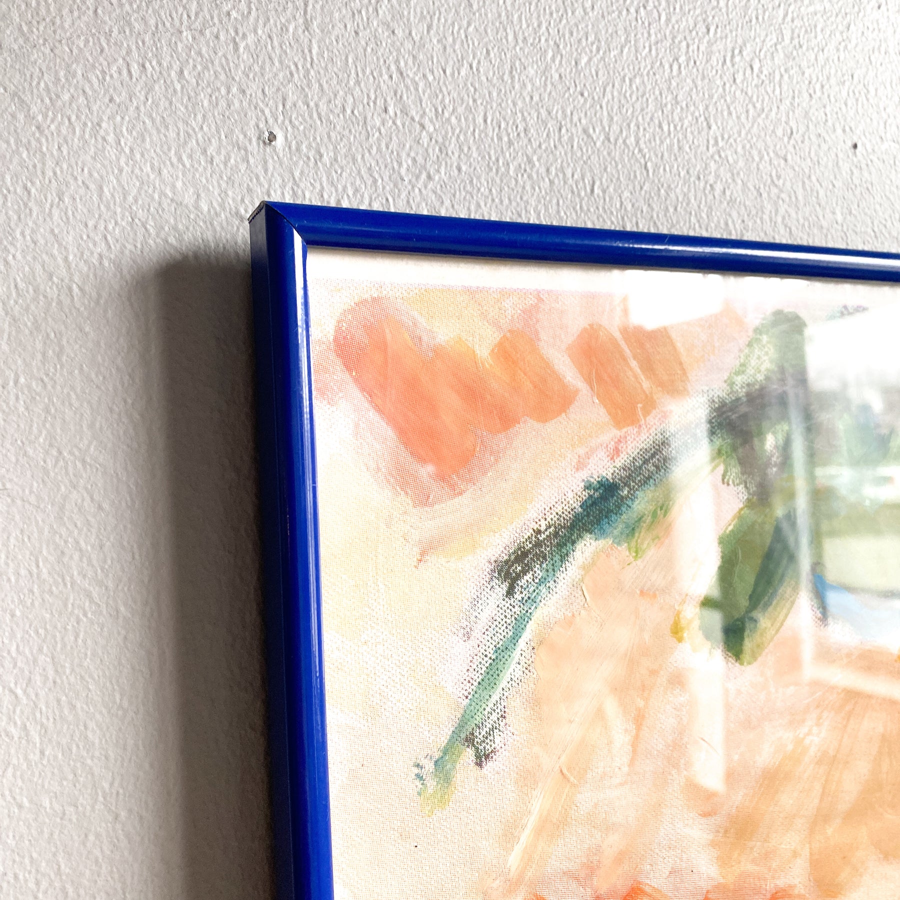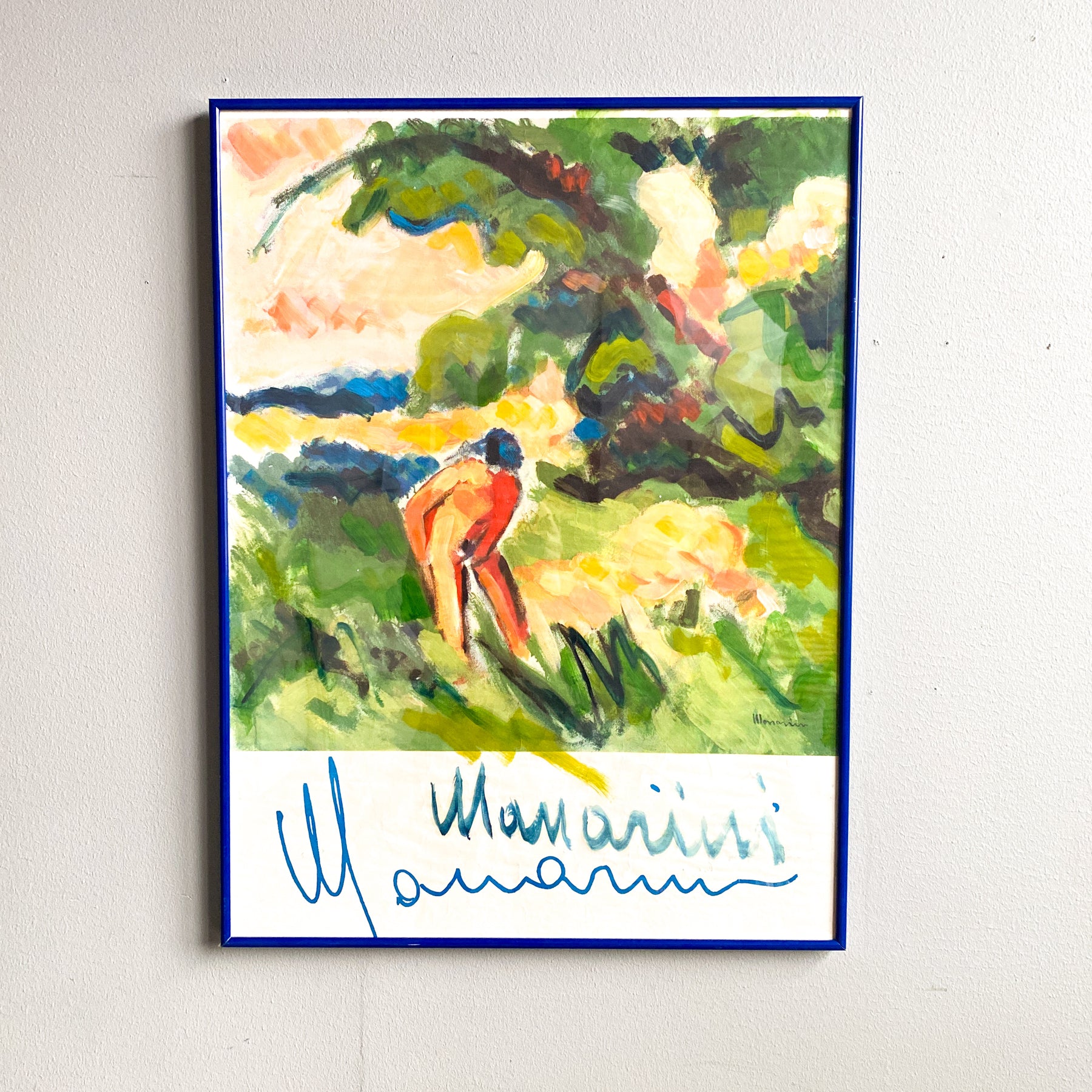 Inramad konst affisch i blå ram. Oidentifierad konstnär.