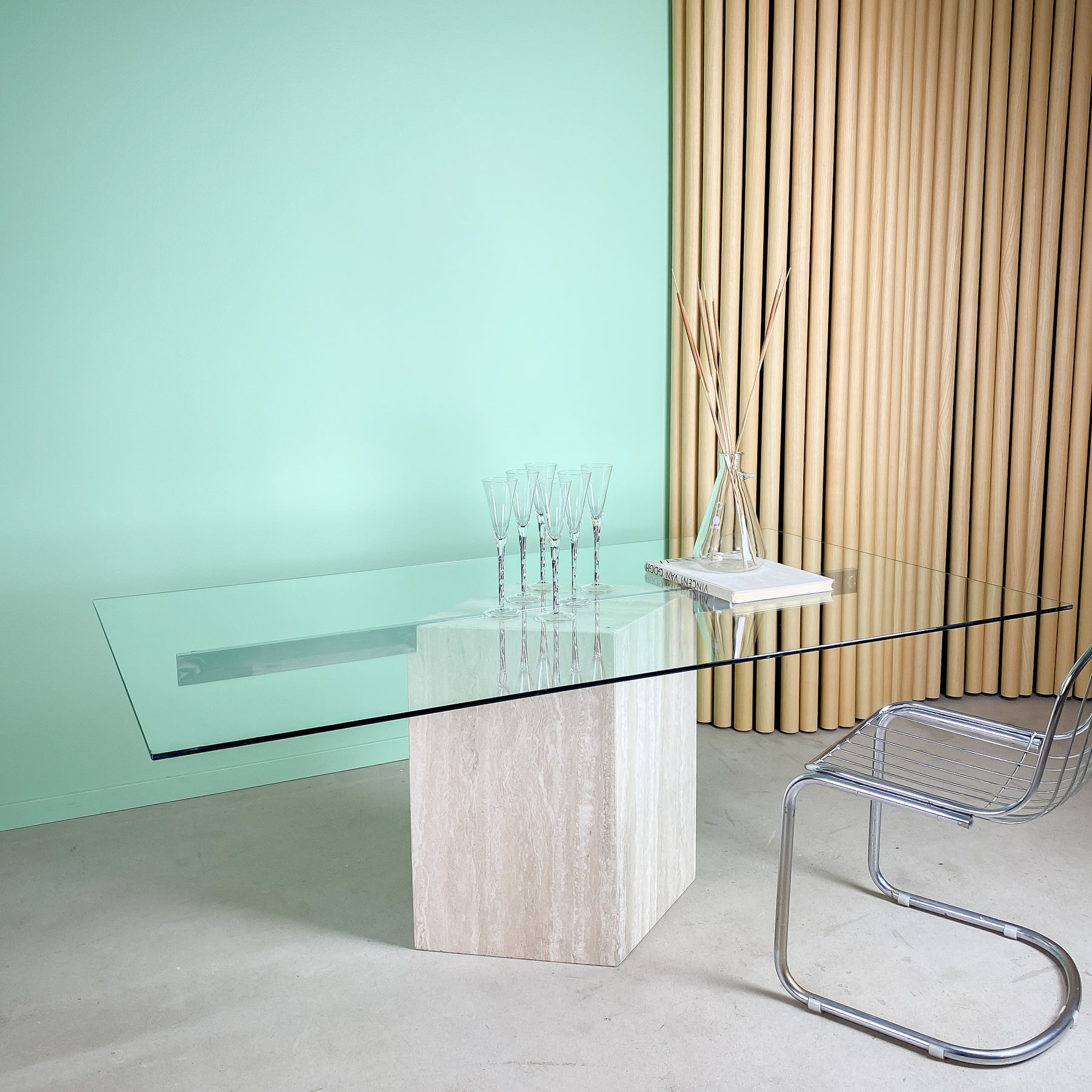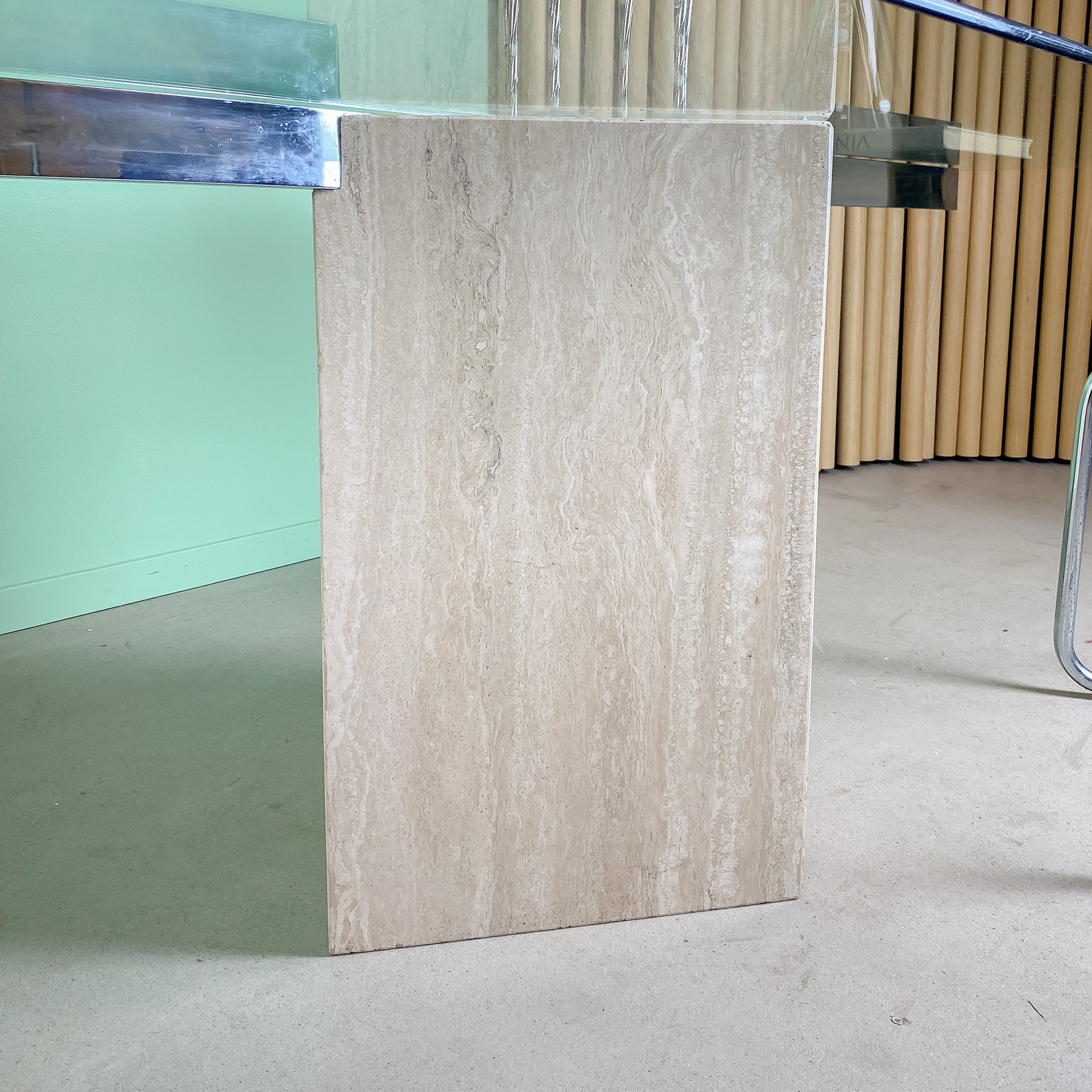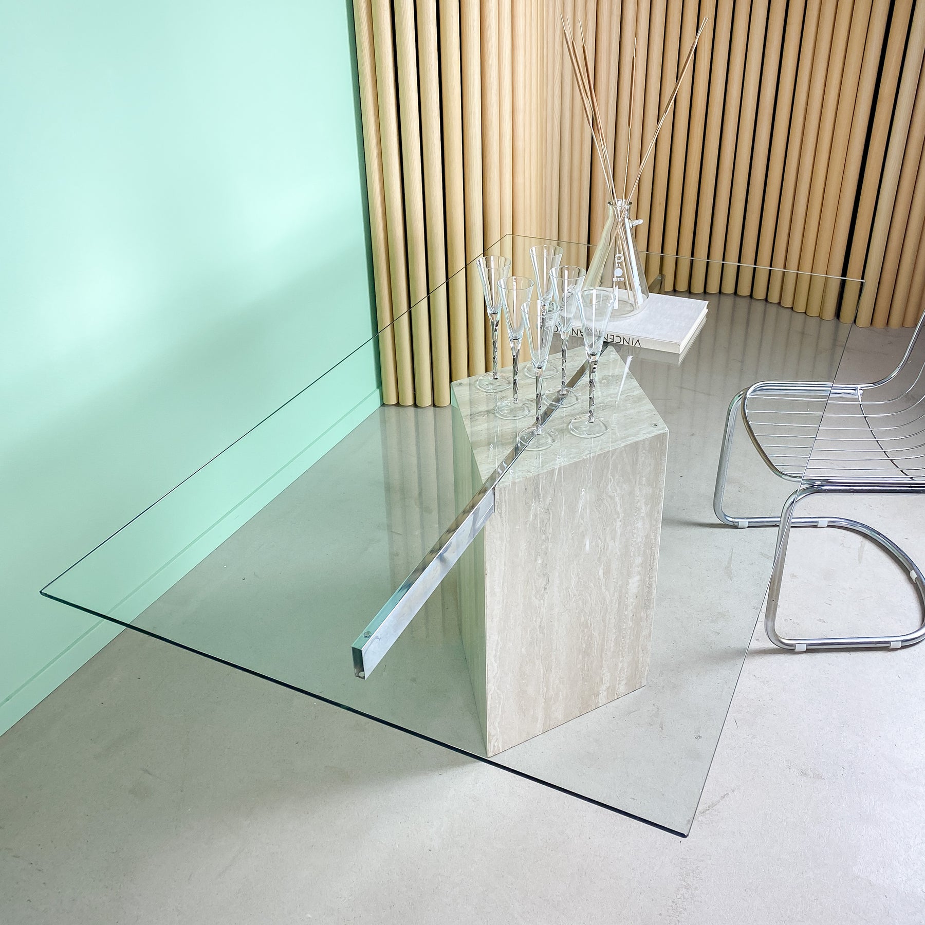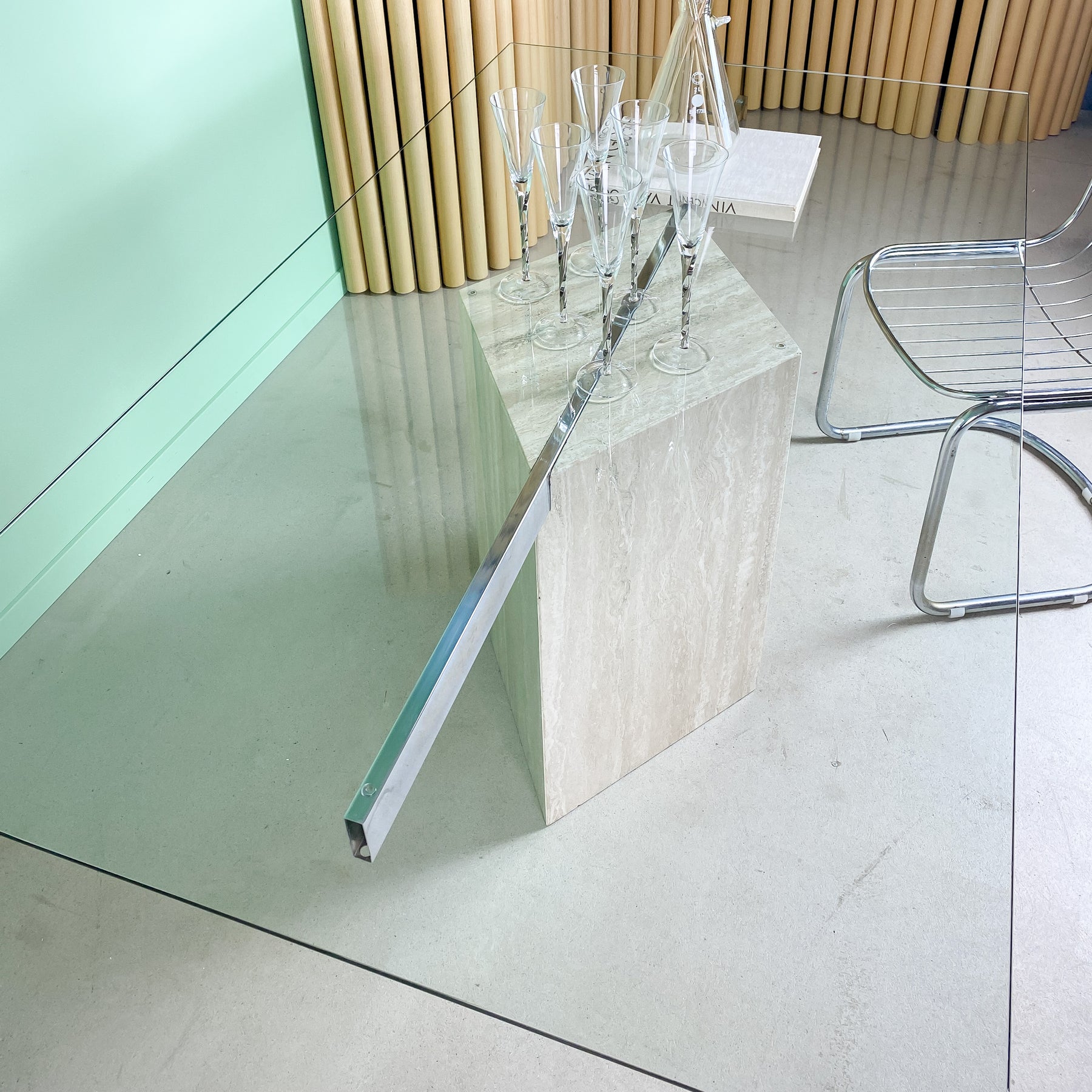 Rektangulär bordsskiva i glas med med underrede i Travertin och krom. Skivan vilar på stenen och metall staget.