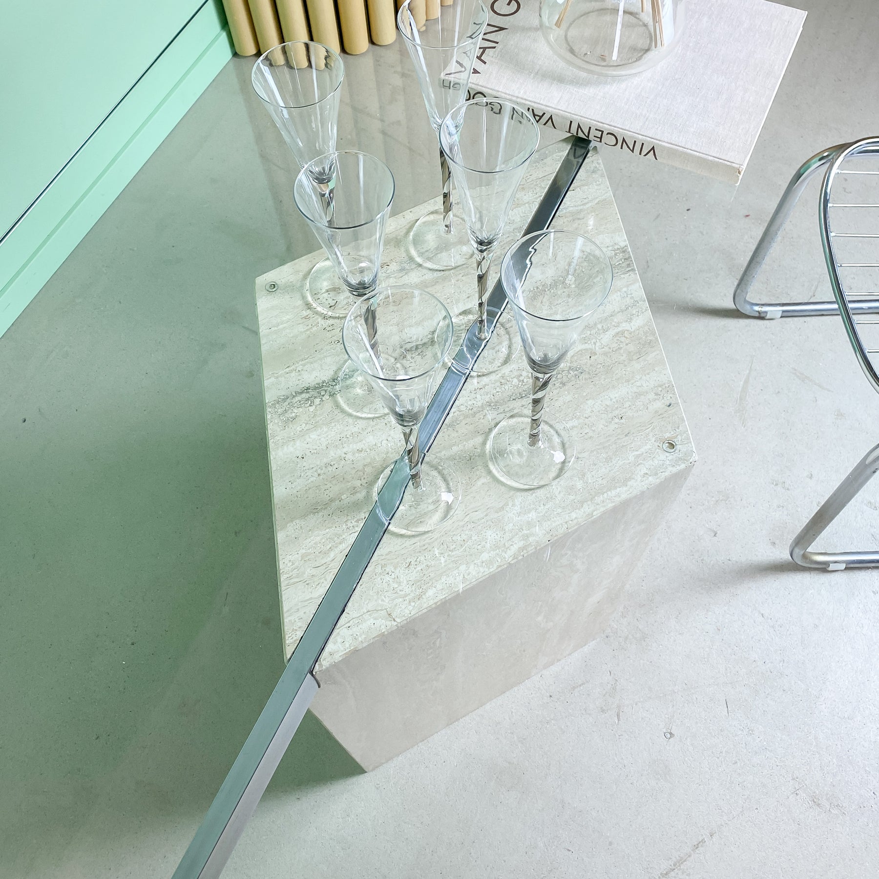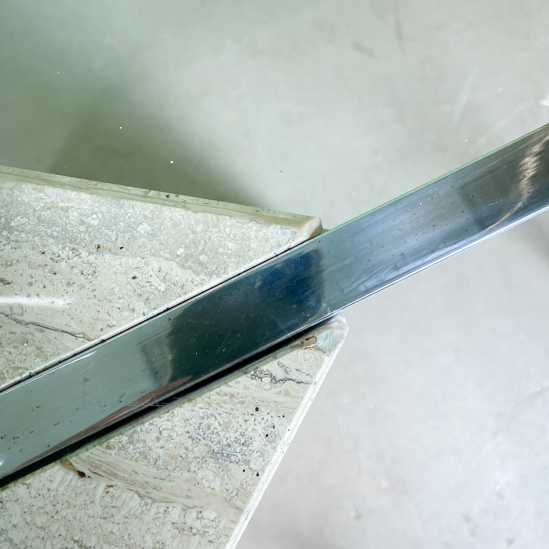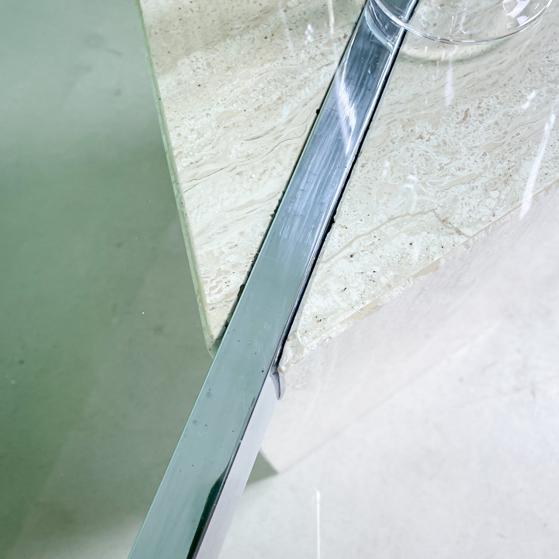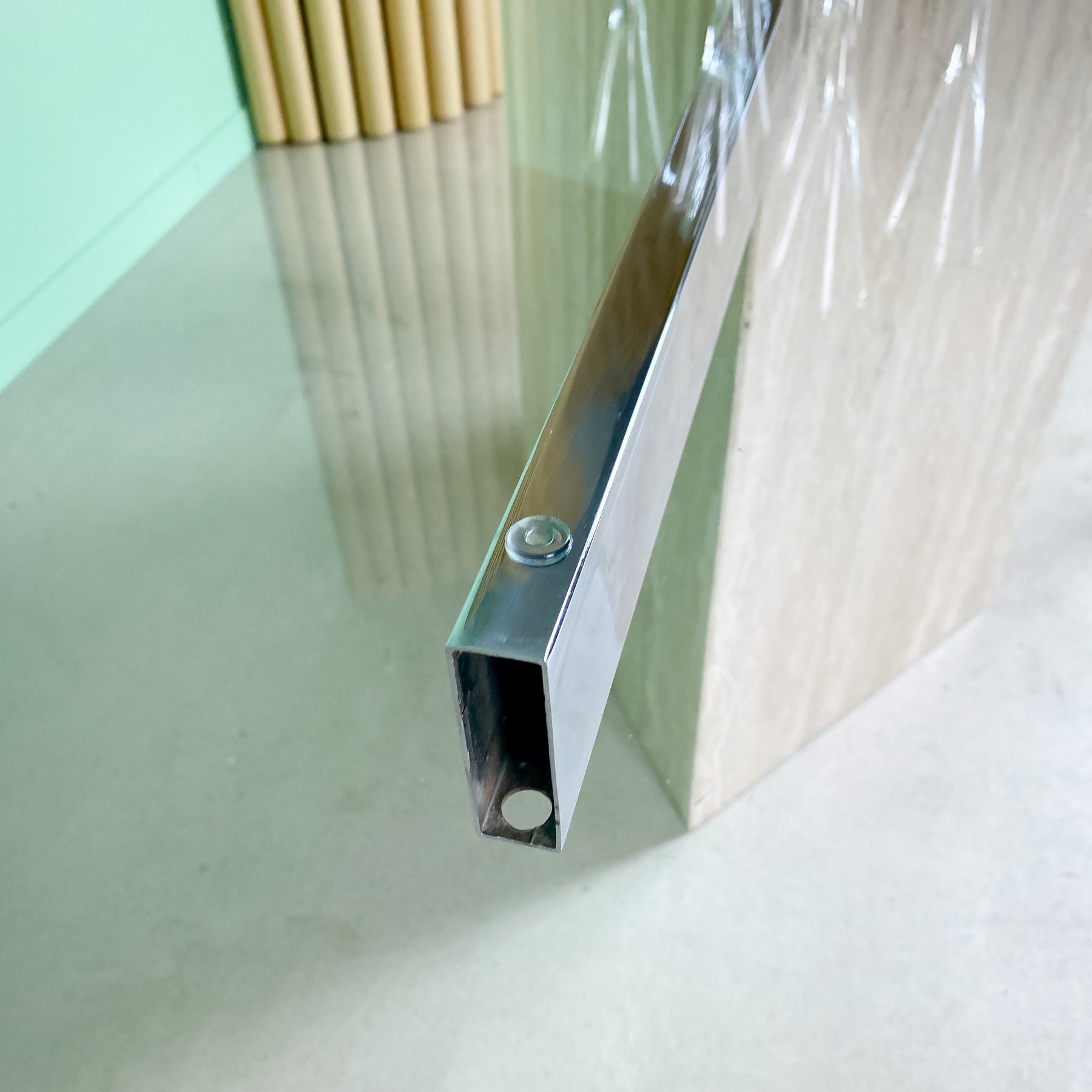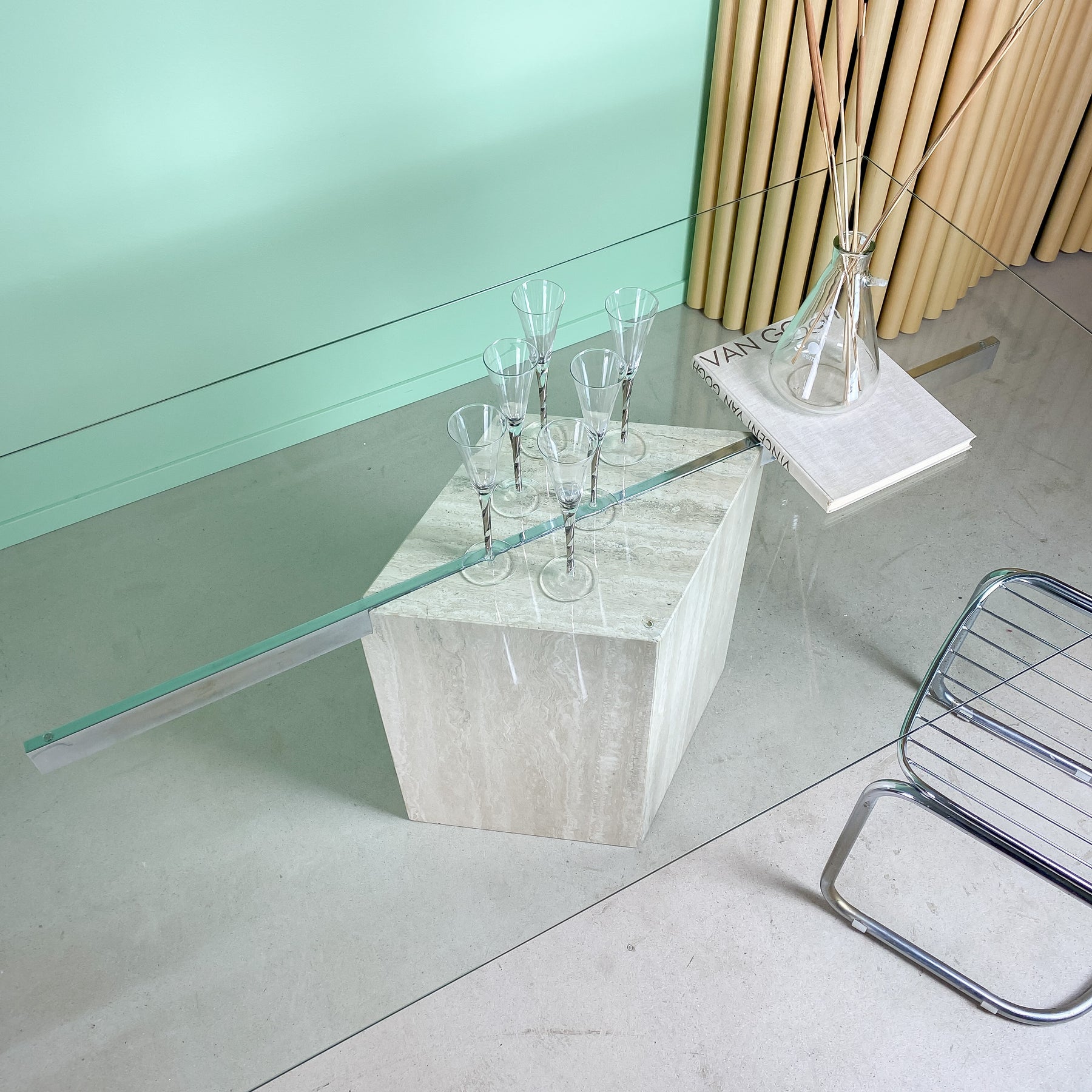 Rektangulär bordsskiva i glas med med underrede i Travertin och krom. Skivan vilar på stenen och metall staget.