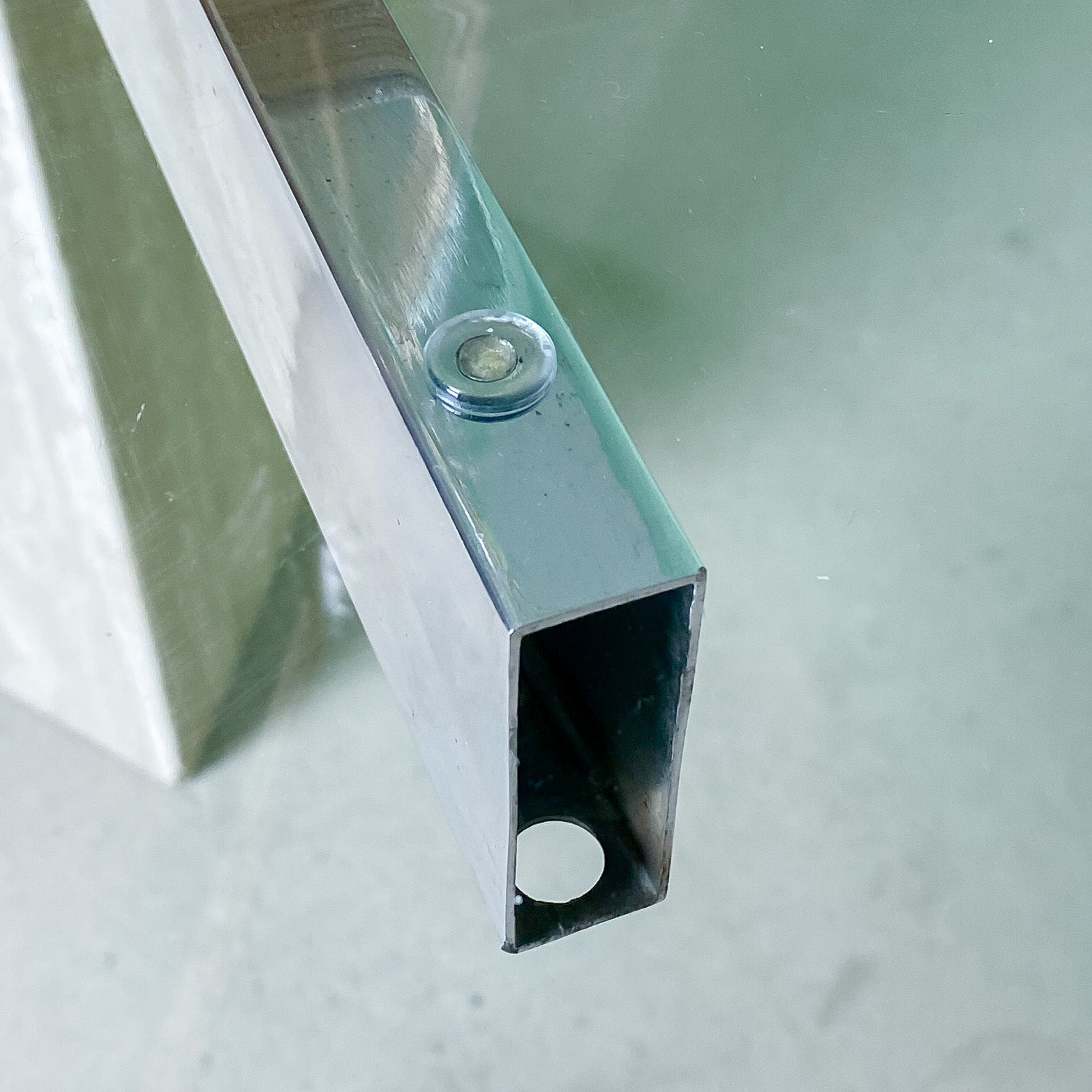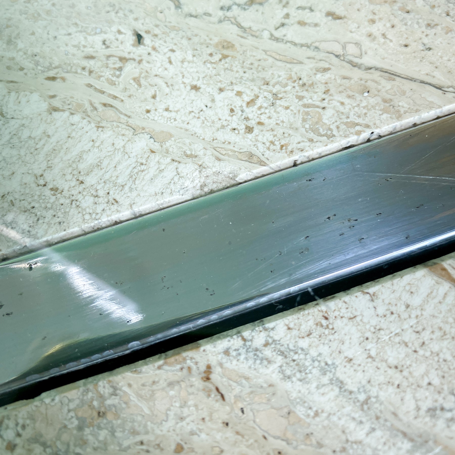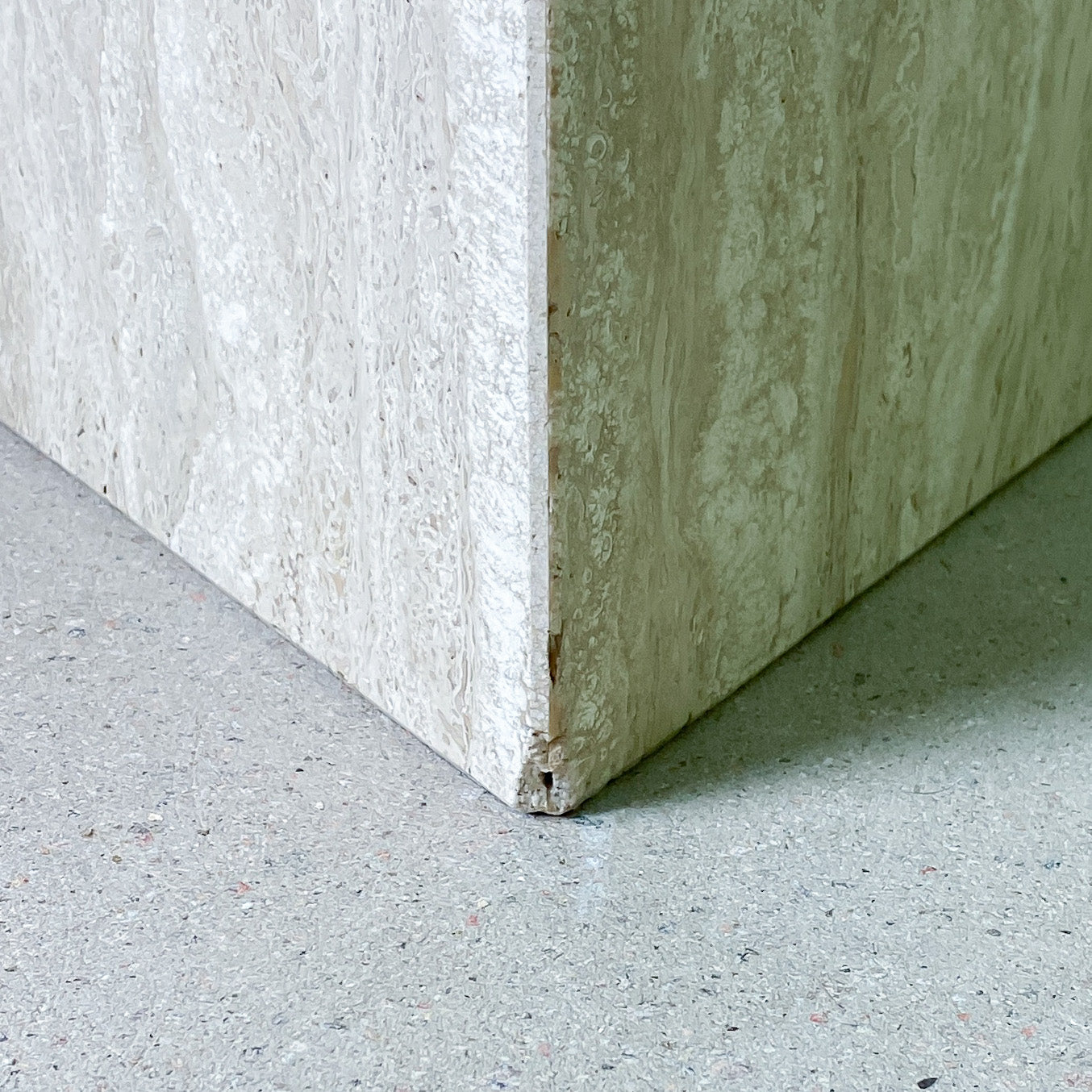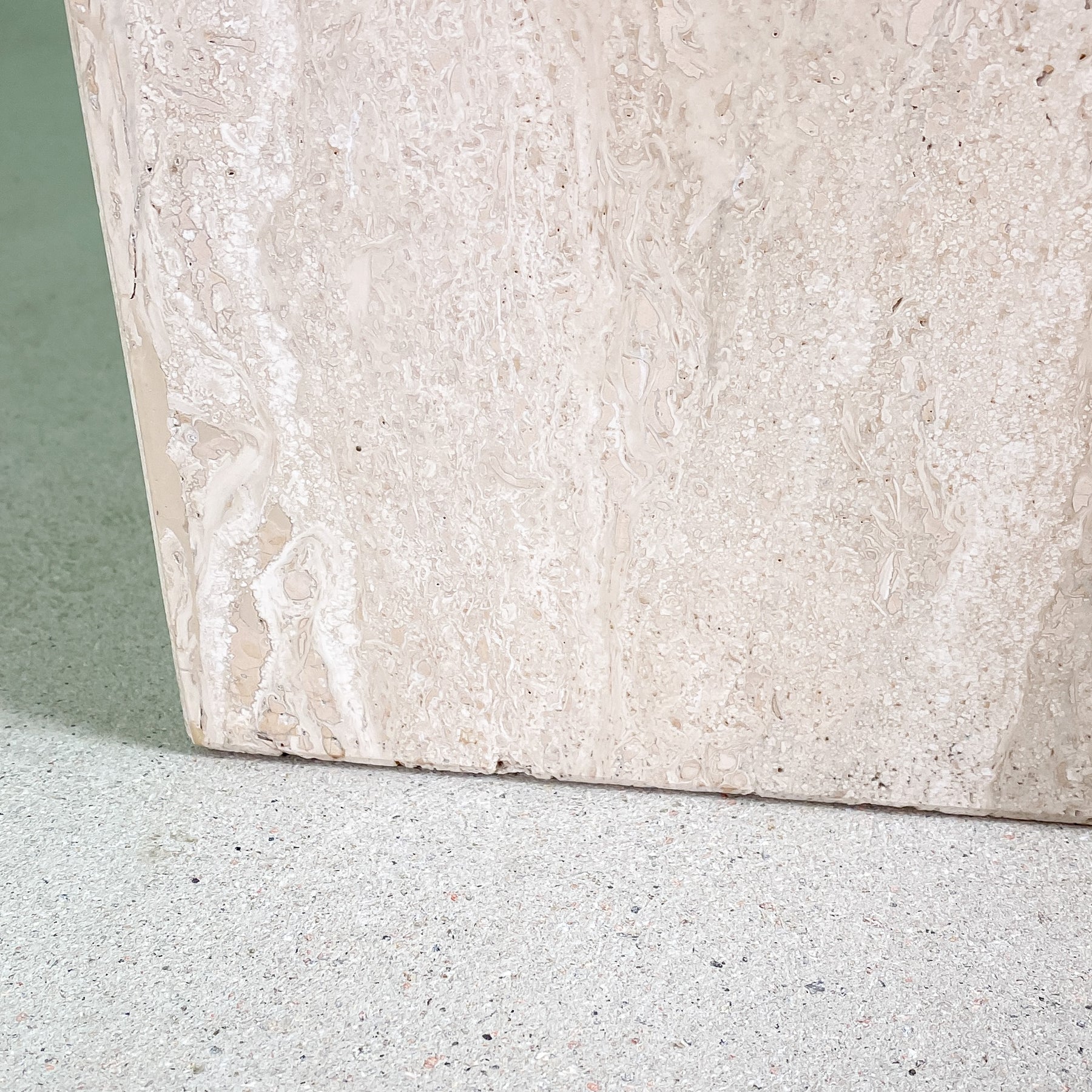 Rektangulär bordsskiva i glas med med underrede i Travertin och krom. Skivan vilar på stenen och metall staget.