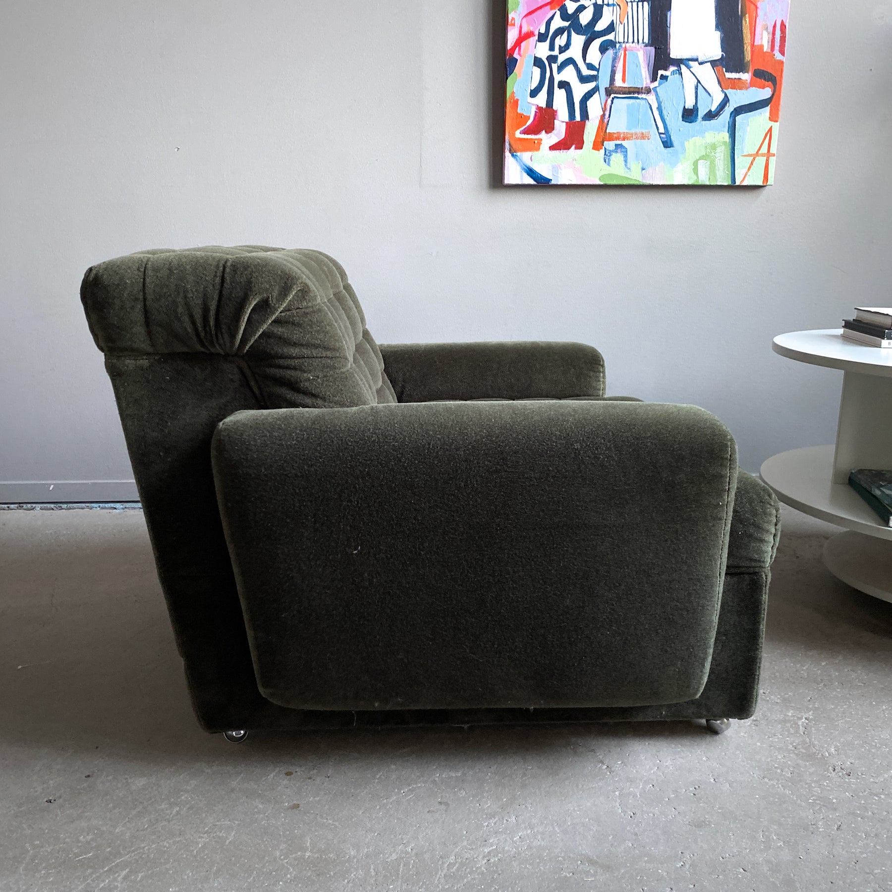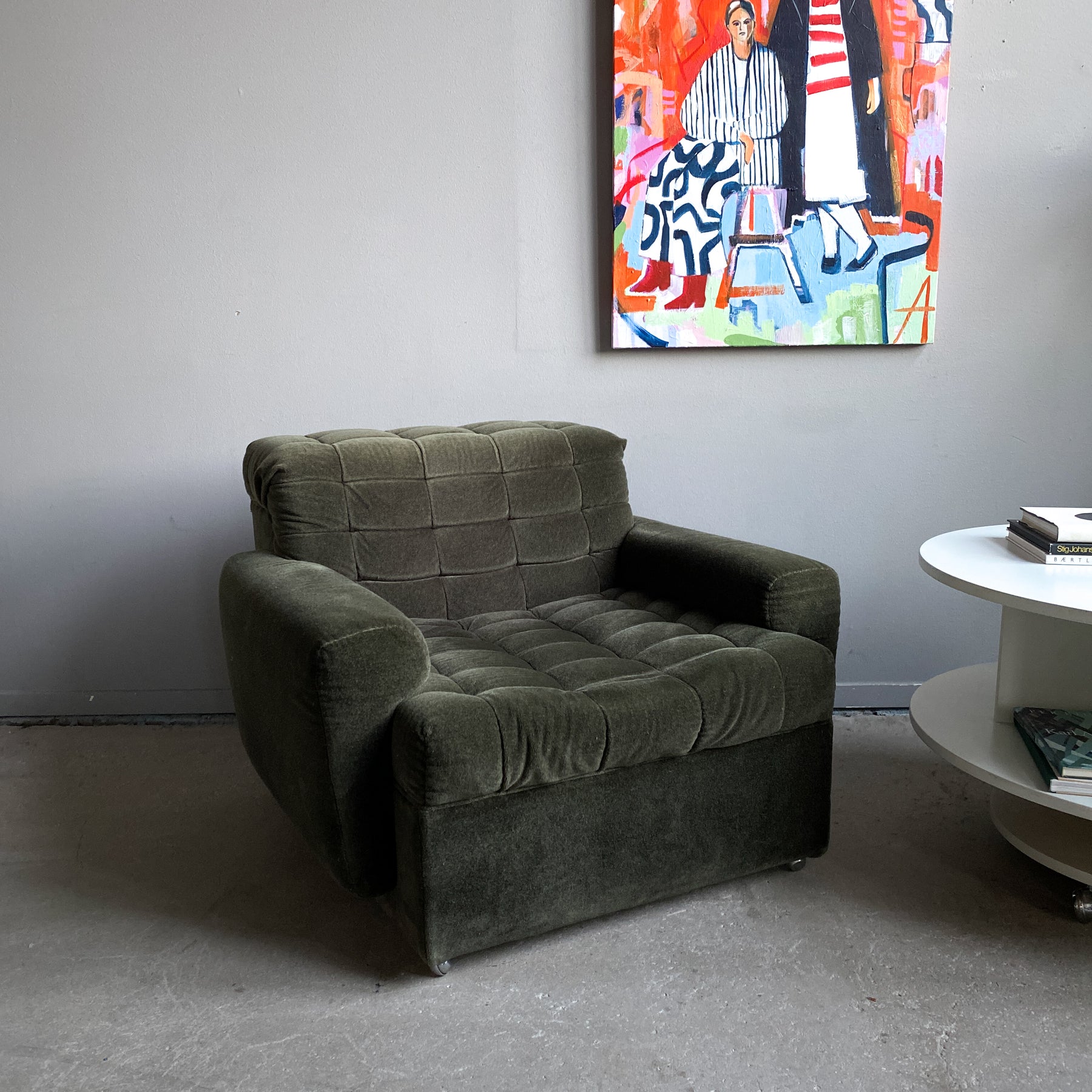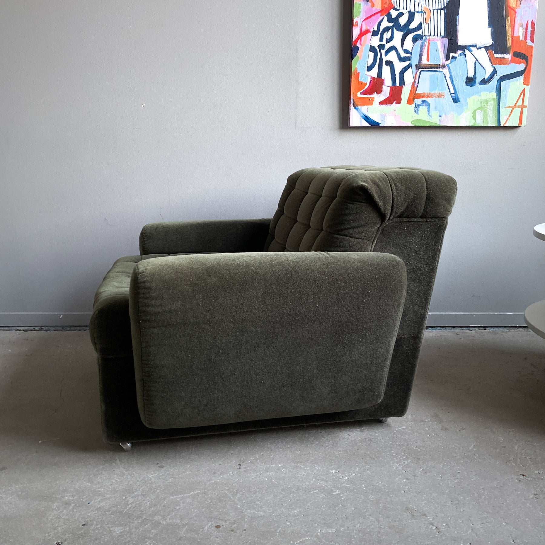 Fåtölj i mossgrön plysch, 70-tal. Hjul i metall.