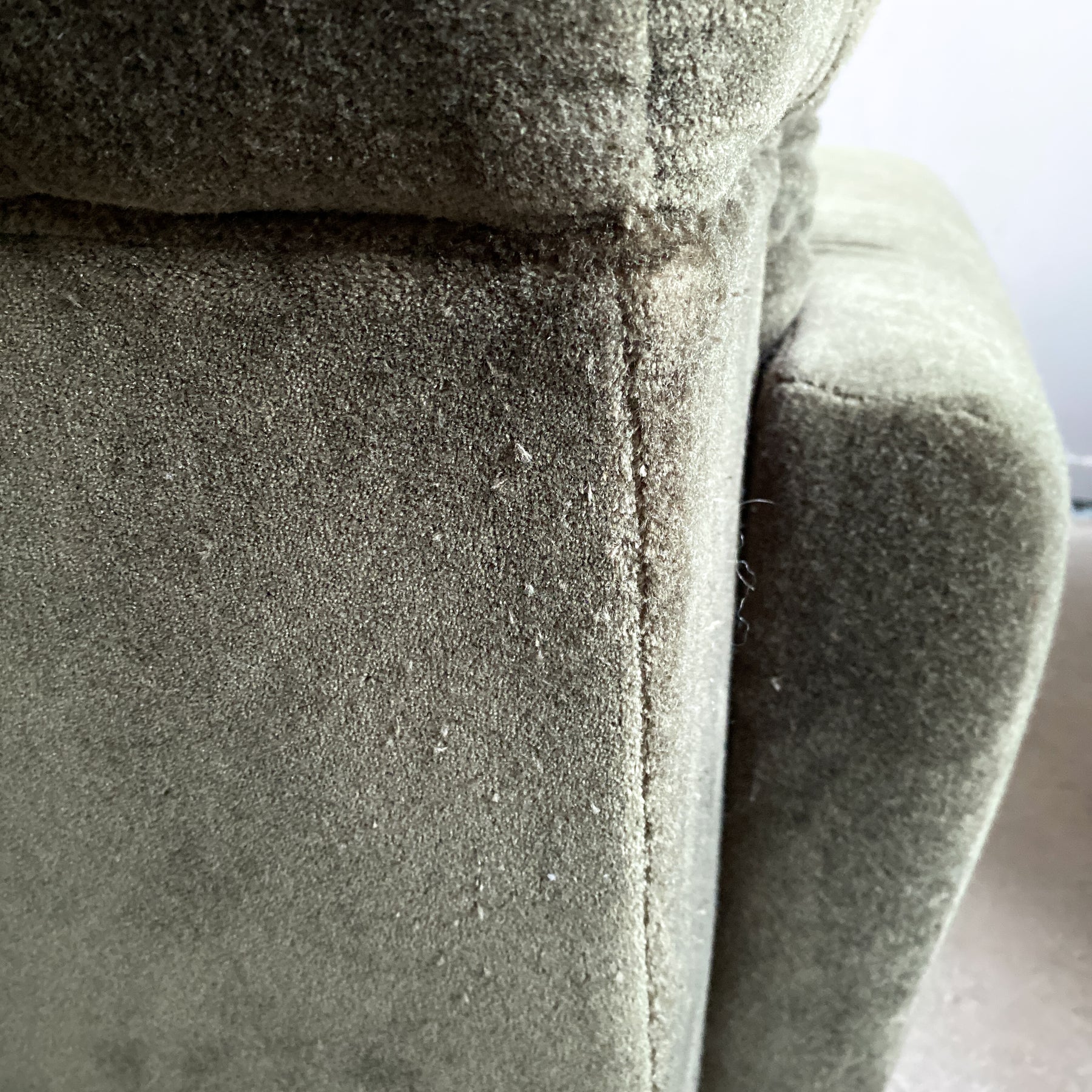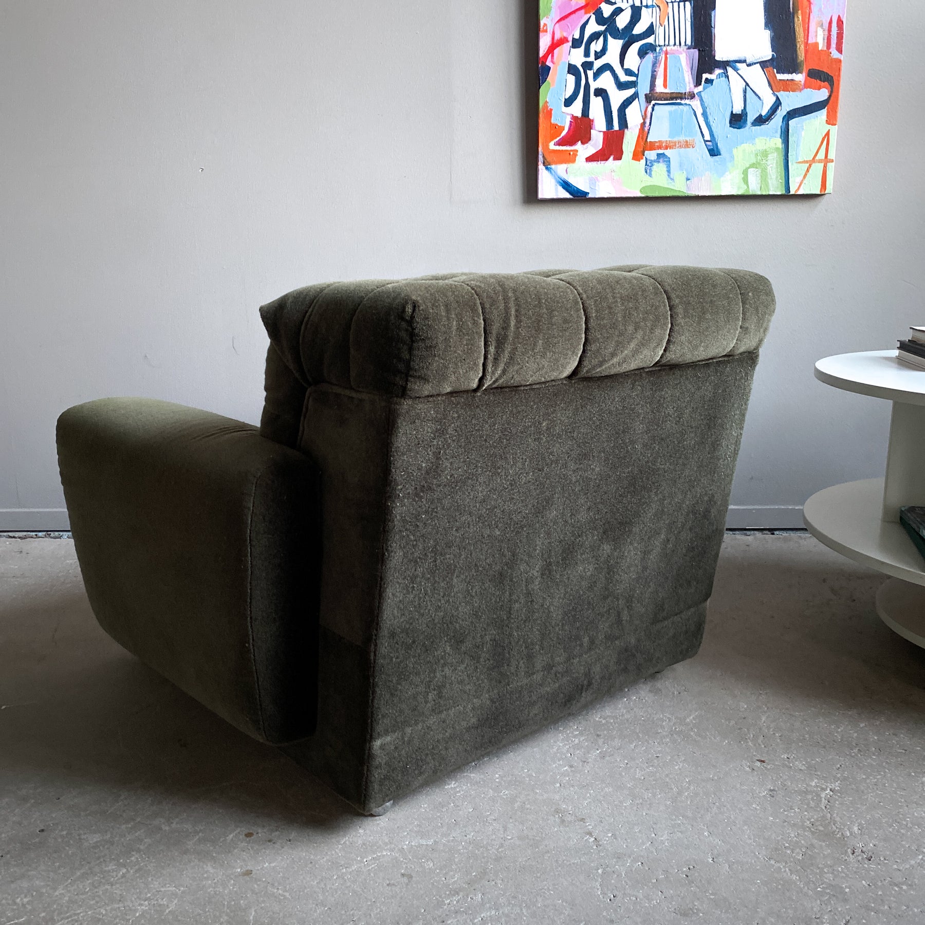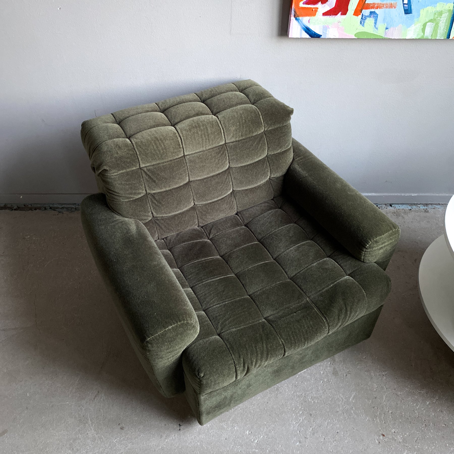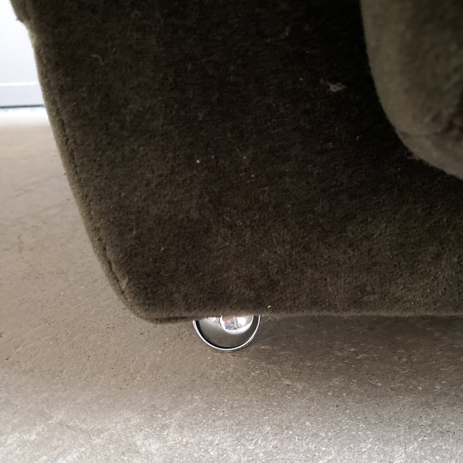 Fåtölj i mossgrön plysch, 70-tal. Hjul i metall.