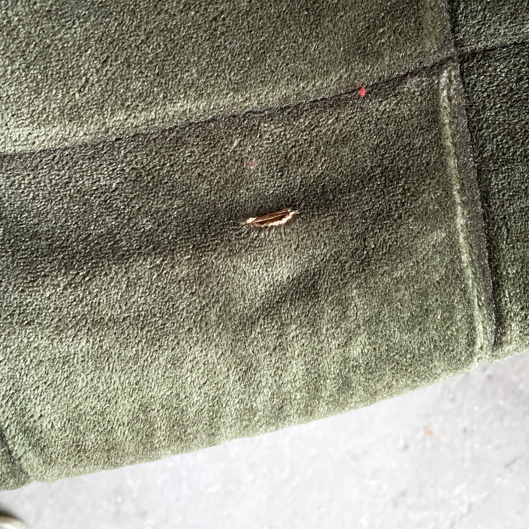 Skick: spår av liv i form av reva i tyget framtill på ovansida dyna.