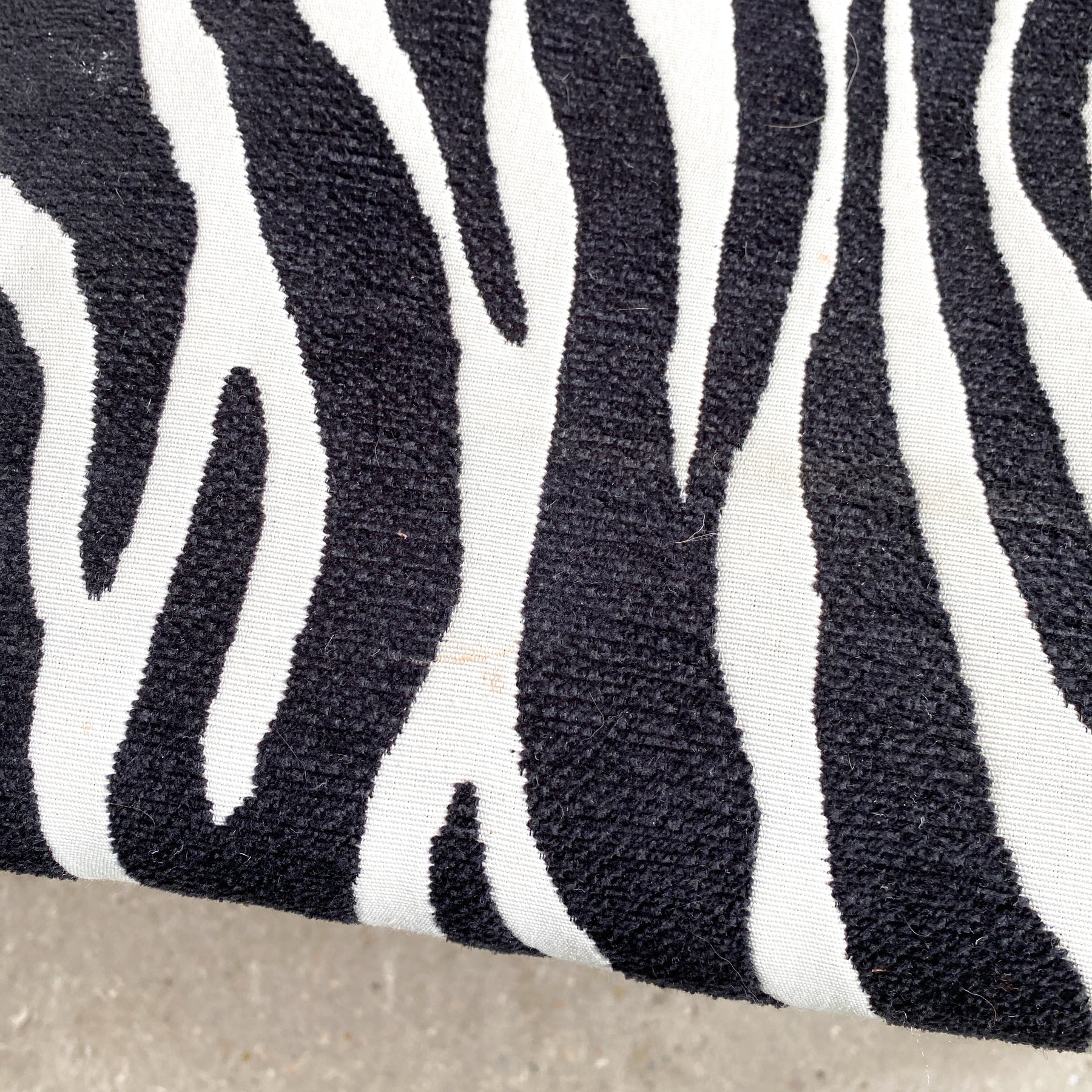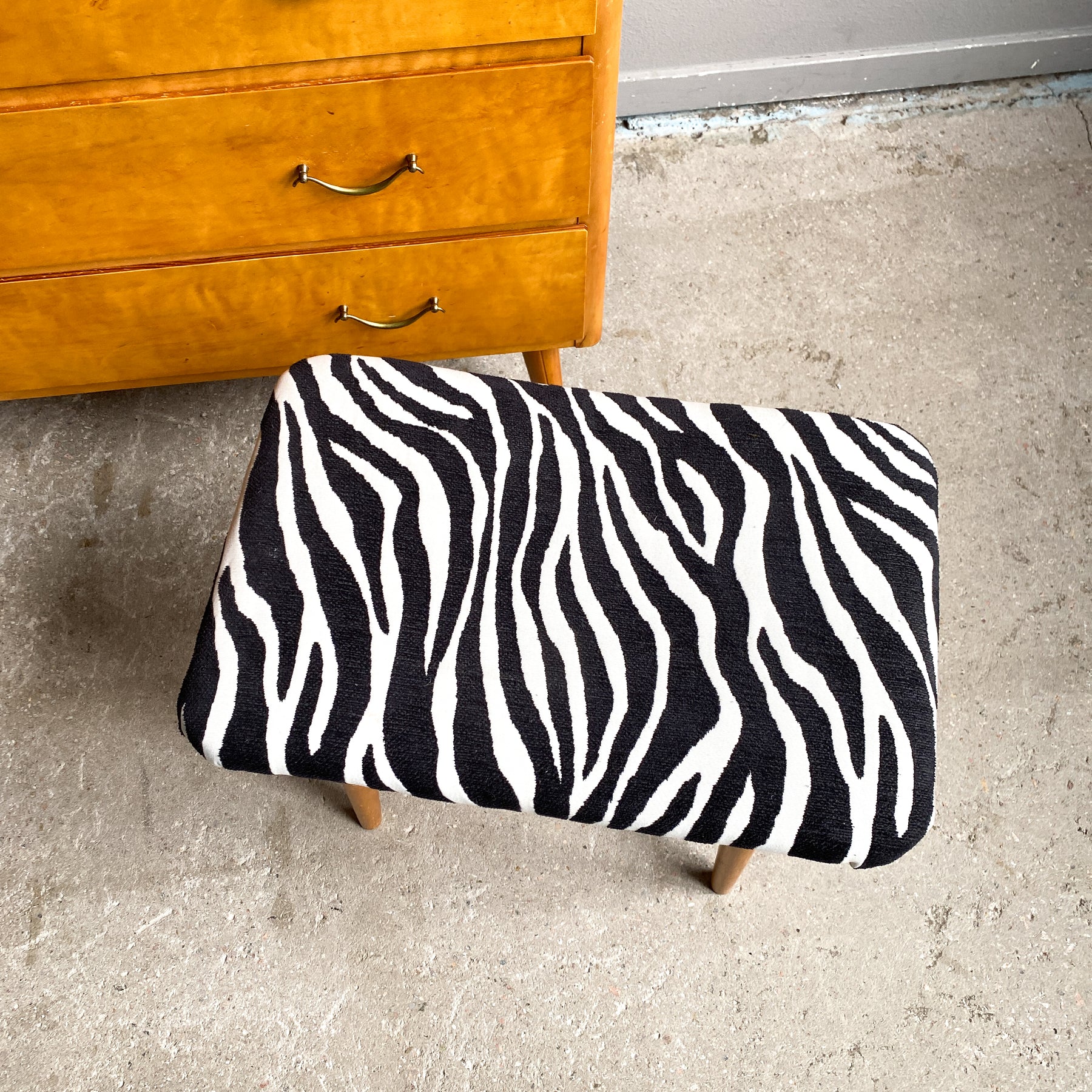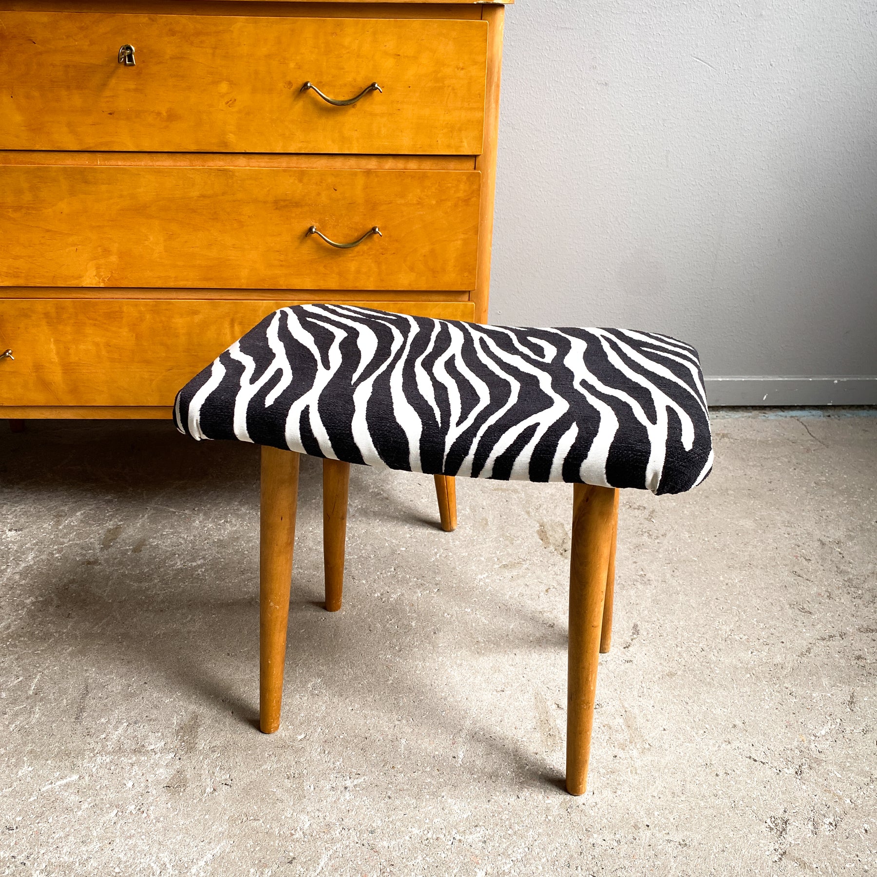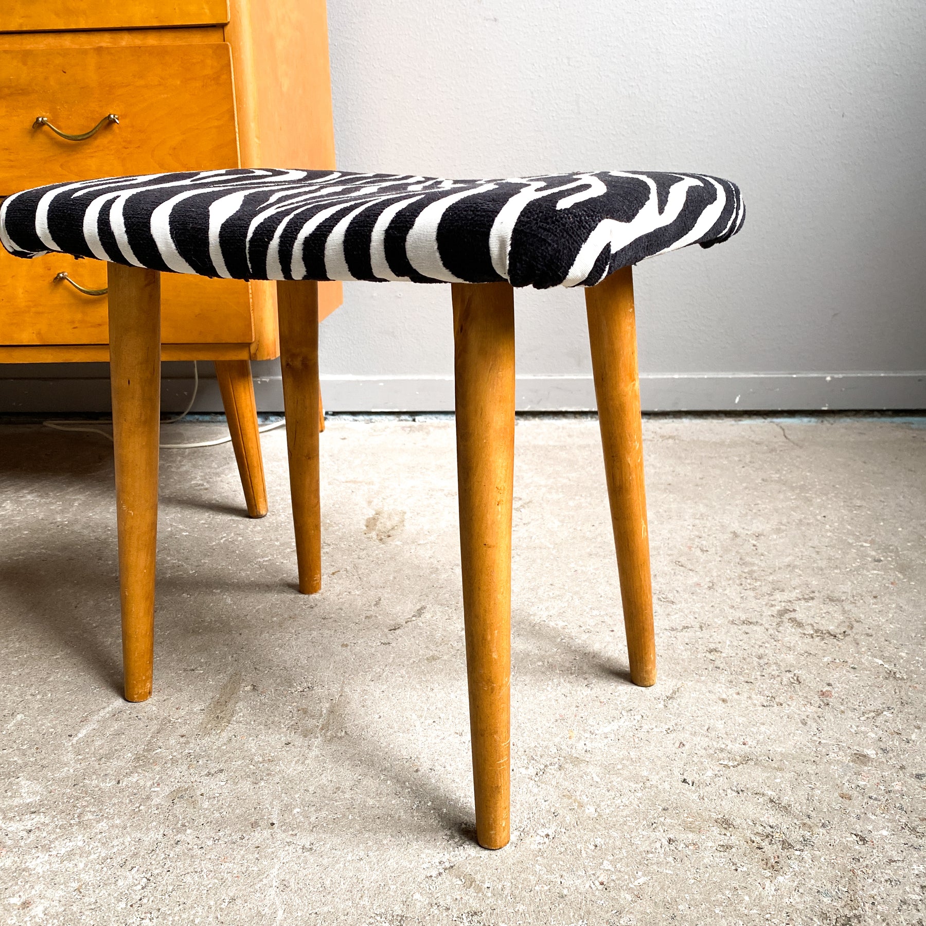 Nätt pall klädd i zebra tyg. Runda avsmalnande ben.