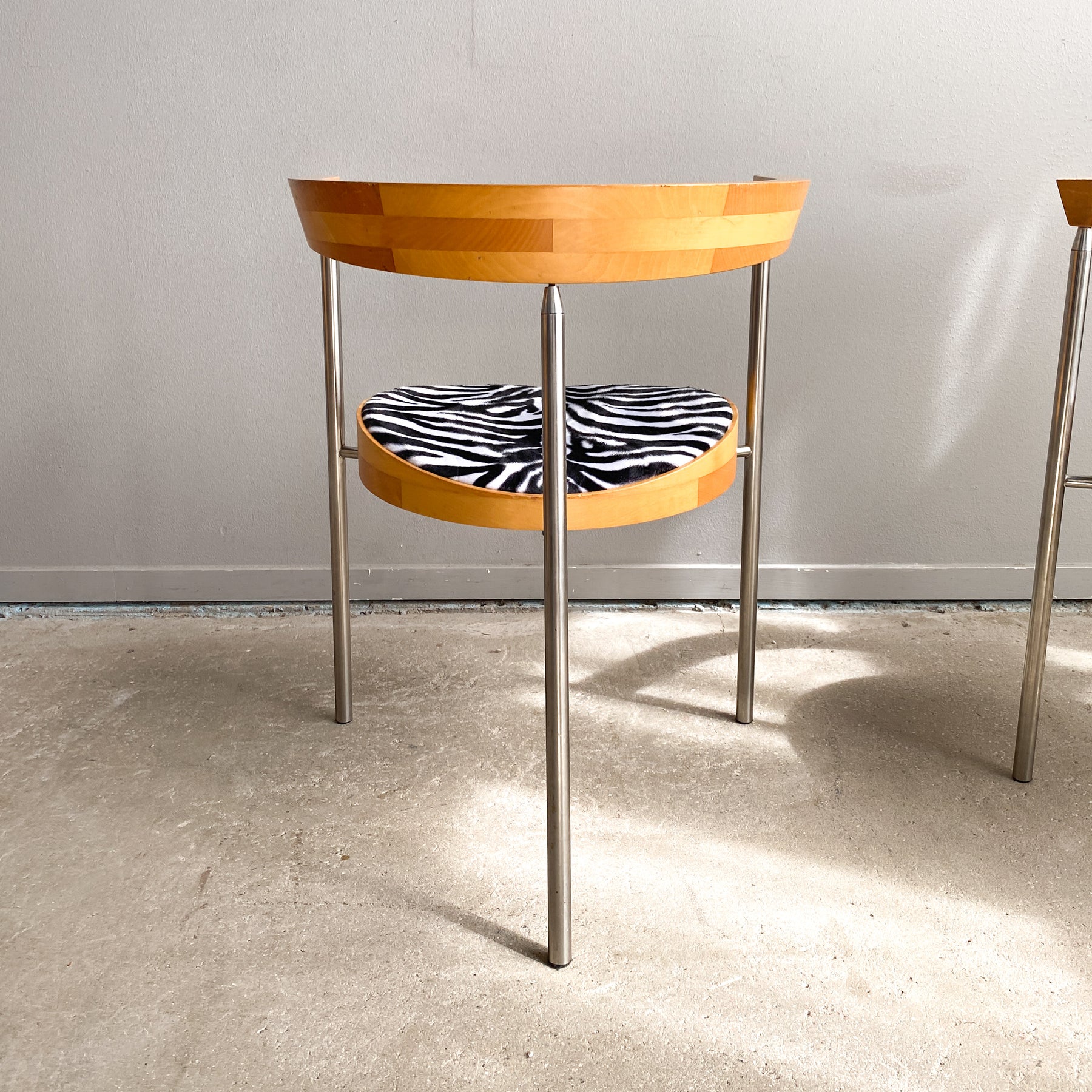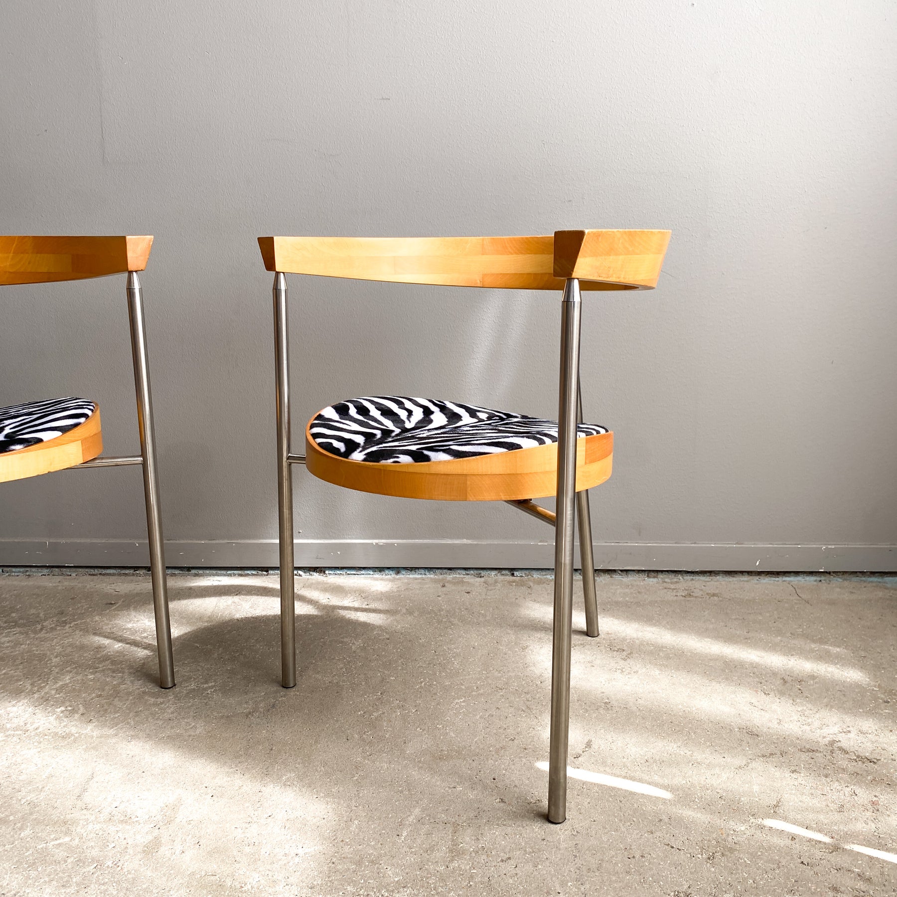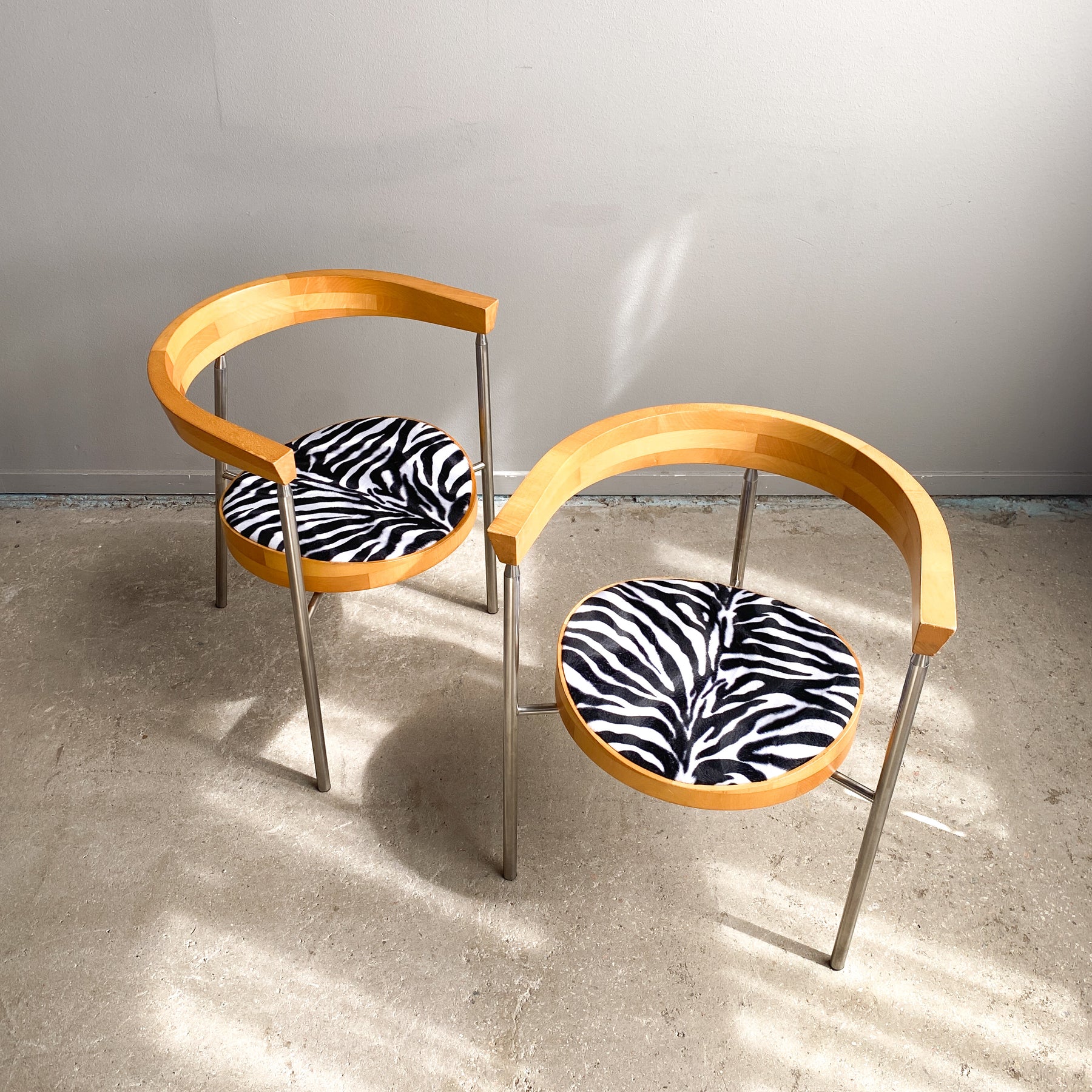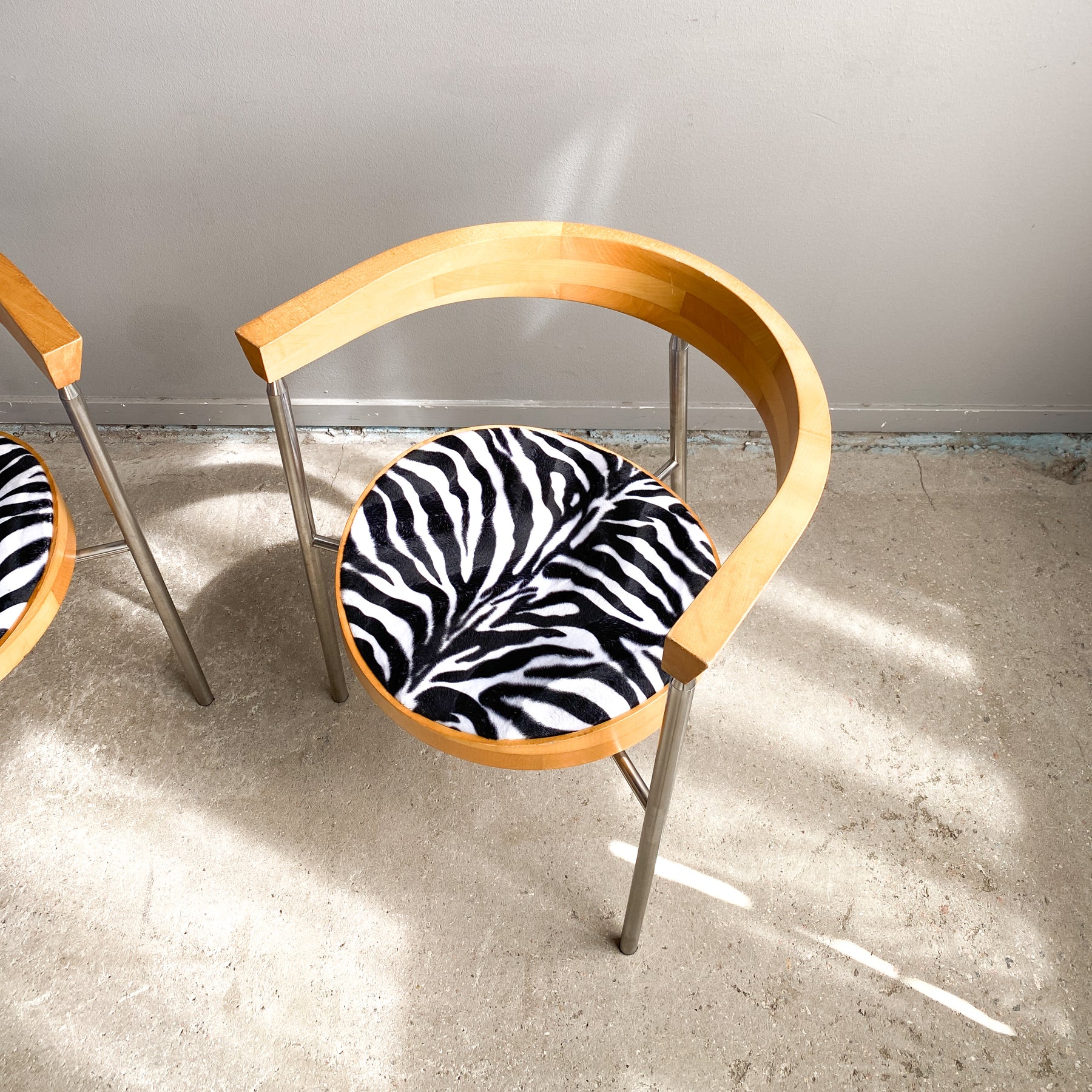 Paret karmstolar i borstad krom och björk, 80/90-tal. Nyklädda sitsar i zebra fuskpäls tyg. Märkta undertill Bodil W.